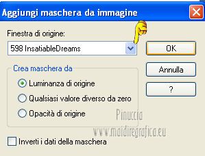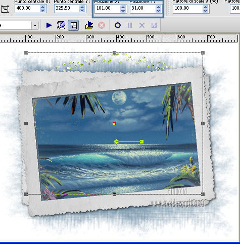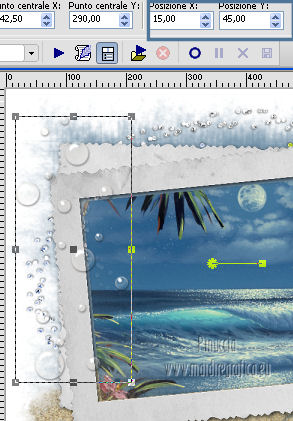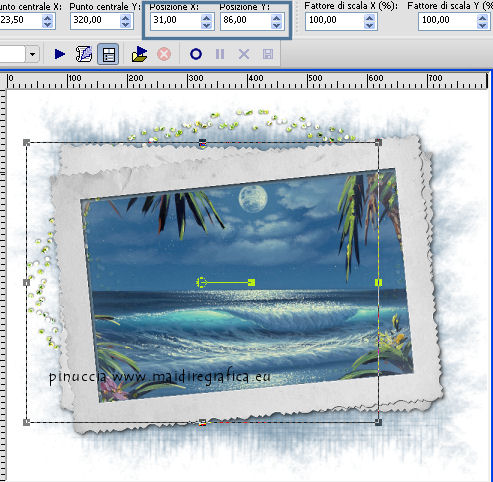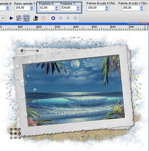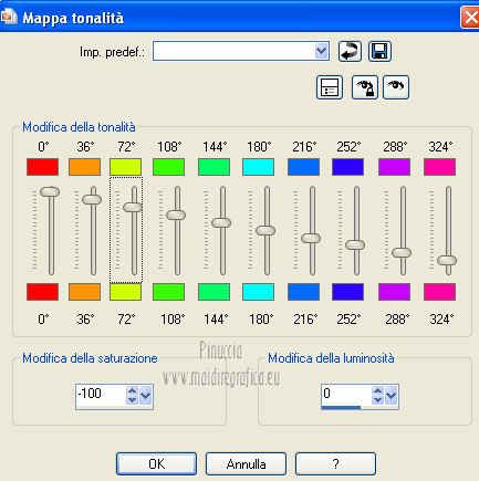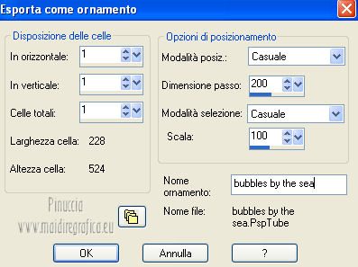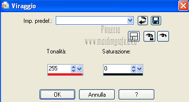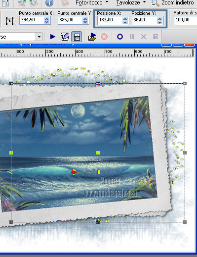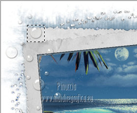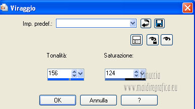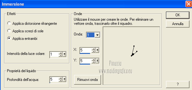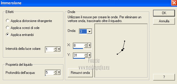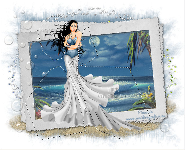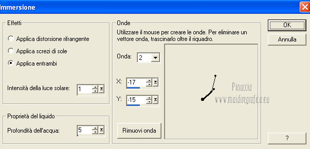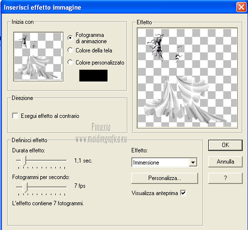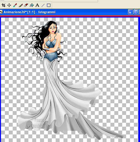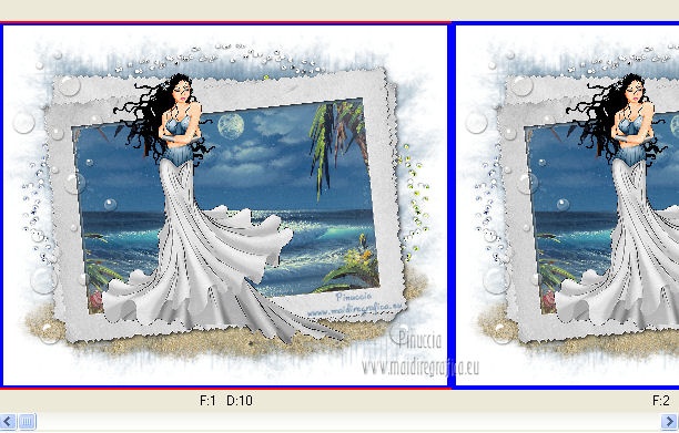 qui puoi trovare qualche risposta ai tuoi dubbi. Se l'argomento che ti interessa non è presente, ti prego di segnalarmelo. Questo tutorial è una creazione di ©Liliane e non può essere copiato su altri siti nè essere offerto per il download. Lo stesso vale per la mia traduzione. Il tutorial è stato elaborato con PSP X2 Ultimate, ma può essere eseguito anche con le altre versioni di PSP. Per tradurlo, ho usato PSP X. Occorrente: Materiale qui Animation Shop qui ![]() 1. Imposta il colore di primo piano con il colore bianco #ffffff. e il colore di sfondo con il colore #6f8fa6. Apri una nuova immagine trasparente 800 x 650 pixels, e riempila con il colore bianco.2. Livelli>Nuovo livello raster. Riempi con il colore di sfondo #6f8fa6.Apri la maschera 598 InsatiableDreams, e minimizzala. Torna al tuo lavoro. Livelli>Nuovo livello maschera>Da immagine. Apri il menu sotto la finestra di origine e vedrai la lista dei files aperti. Seleziona la maschera 598 InsatiableDreams, con i seguenti settaggi. ![]() Livelli>Elimina, e rispondi sì alla domanda Unire la maschera nel livello corrente. ![]() Livelli>Unisci>Unisci gruppo. 3. Apri cajoline_onthebeach_el65 e vai a Modifica>Copia. Torna al tuo lavoro e vai a Modifica>Incolla come nuovo livello. Non preoccuparti se non vedrai nulla, perchè la cornice è così grande che esce dall'immagine. Immagine>Ridimensiona, al 23%, tutti i livelli non selezionato. Regola>Messa a fuoco>Metti a fuoco. Effetti>Effetti 3D>Sfalsa ombra. ![]() Regola>Tonalità e saturazione>Mappa colori. ![]() 4. Attiva lo strumento Bacchetta magica ![]() e clicca al centro della cornice per selezionarla. Selezione>Modifica>Espandi - 5 pixels. Attiva il livello della maschera. Apri Stait_Dreams of Romance, e vai a Modifica>Copia. Torna al tuo lavoro e vai a Modifica>Incolla come nuovo livello. ![]() Selezione>Inverti. Premi sulla tastiera il tasto CANC. Selezione>Deseleziona. 5. Attiva nuovamente il livello della maschera. Apri NLD ISea You Doodle(8) e vai a Modifica>Copia. Torna al tuo lavoro e vai a Modifica>Incolla come nuovo livello. Immagine>Ridimensiona, al 25%, tutti i livelli non selezionato. Regola>Messa a fuoco>Accentua messa a fuoco. Rinomina questo livello D1. Attiva lo strumento Puntatore ![]() se stai usando PSP 9 lo strumento Deformazione ![]() e imposta manualmente la posizione nella barra superiore degli strumenti: posizione X: 101 - posizione Y:31. ![]() Effetti>Effetti 3D>Sfalsa ombra. ![]() Livelli>Duplica. Immagine>Capovolgi. Strumento Puntatore/Deformazione e imposta posizione X a 183 e posizione Y a 86. ![]() Rinomina questo livello D2. Livelli>Duplica. Immagine>Rifletti. Strumento Puntatore/Deformazione e imposta posizione X a 31 e posizione Y a 86. ![]() Rinomina questo livello D3. 6. Attiva il livello D1: Regola>Tonalità e saturazione>Viraggio. ![]() Attiva il livello D3. Regola>Tonalità e saturazione>Viraggio. ![]() 7. Apri sand(3) e vai a Modifica>Copia. Torna al tuo lavoro e vai a Modifica>Incolla come nuovo livello. Effetti>Effetti 3D>Sfalsa ombra. ![]() Strumento Puntatore/Deformazione e imposta posizione x a 96 e posizione Y a 401. Livelli>Duplica. Strumento Puntatore/Deformazione e imposta posizione x a 11 e posizione Y a 404. Livelli>Duplica. Strumento Puntatore/Deformazione e imposta posizione x a 162 e posizione Y a 331. 8. Attiva il livello della cornice. Livelli>Nuovo livello raster. Apri Bubble by the sea. File>Esporta>Ornamento - assegna un nome all'ornamento e ok. ![]() Attiva lo strumento Ornamento ![]() cerca e seleziona l'ornamento che hai appena esportato, imposta la dimensione a 85, e applica l'ornamento. Strumento Puntatore/Deformazione e imposta posizione x a 15 e posizione Y a 45. ![]() 9. Attiva lo strumento Selezione , rettangolo,e seleziona la bolla sulla cornice. ![]() Selezione>Innalza selezione a livello. Selezione>Deseleziona. Strumento Puntatore/Deformazione e imposta posizione x a 62 e posizione Y a 534. ![]() Livelli>Duplica. Immagine>Rifletti. 10. Aggiungi il tuo nome e/o il tuo watermark su un nuovo livello. 11. Apri il tube bm_Sarah_for_Dark_Endymion_by_Queen_Uriel e vai a Modifica>Copia. Torna al tuo lavoro e vai a Modifica>Incolla come nuovo livello. Immagine>Ridimensiona, al 70%, tutti i livelli non selezionato. Regola>Messa a fuoco>Metti a fuoco. Attiva lo strumento Selezione a mano libera , da punto a punto,![]() e seleziona il vestito e i capelli del tube, come nell'esempio. ![]() Modifica>Copia. Apri Animation Shop e vai a Modifica>Incolla>Incolla come nuova animazione. 12. Effetti>Inserisci effetto immagine - Immersione, imposta i settaggi e clicca su Personalizza. ![]() Nella finestra che si apre, dopo aver impostato i settaggi a sinistra, imposta le tre onde che ti servono per il lavoro, se ci sono altre onde da precedenti settaggi, seleziona il numero dell'onda e clicca su Rimuovi onda. Onda 1. ![]() Onda 2. ![]() Onda 3. ![]() 13. Avrai una animazione composta da 8 fotogrammi. Clicca sul primo fotogramma per selezionarlo e e vai a Modifica>Seleziona tutto. 14. Torna in PSP. Selezione>Modifica>Contrai - 4 pixels. Selezione>Inverti. Modifica>Copia. Torna in Animation Shop e vai a Modifica>Incolla>Incolla come nuova animazione. Modifica>Duplica e ripeti finchè non avrai 8 fotogrammi. Modifica>Seleziona tutto. Modifica>Copia. Attiva l'animazione che hai appena creato, e vai a Modifica>Incolla>Incolla nel fotogramma selezionato. Posiziona correttamente l'immagine in modo da completare il tube. ![]() Clicca sul primo fotogramma per selezionarlo e premi sulla tastiera il tasto CANC. Adesso la tua animazione è composta da 7 fotogrammi. Torna ancora in PSP. Selezione>Deseleziona. Chiudi il livello del tube e attiva il livello sottostante. Modifica>Copia Unione. Torna in Animation Shop e vai a Modifica>Incolla>Incolla come nuova animazione. Modifica>Duplica, e ripeti finchè non avrai 7 fotogrammi. Clicca sul primo fotogramma per selezionarlo e vai a Modifica>Seleziona tutto. Attiva l'animazione del tube: Mod
