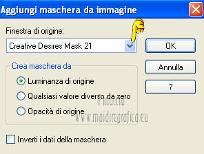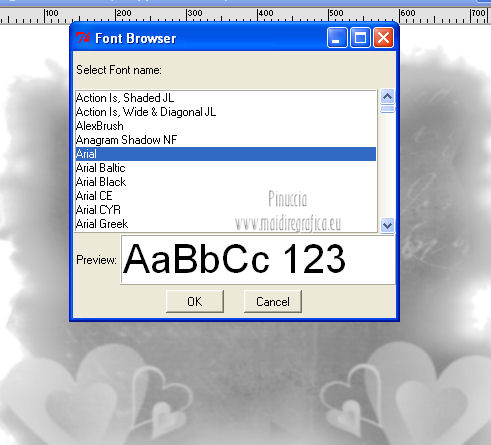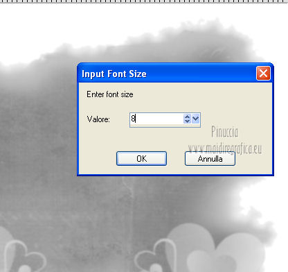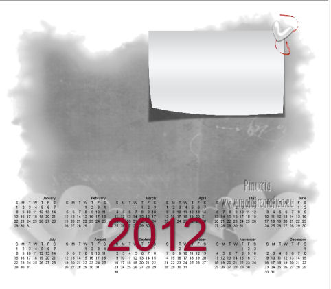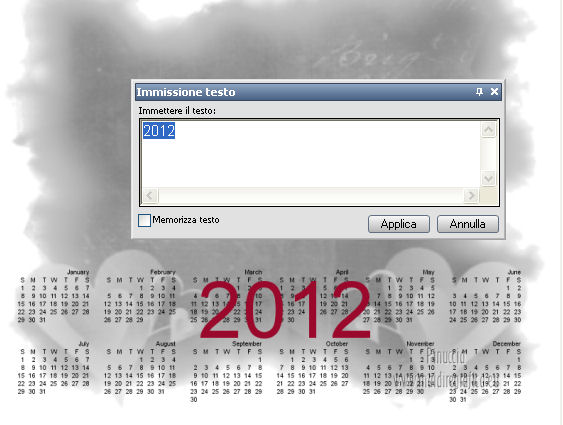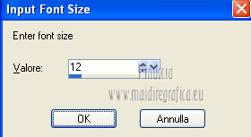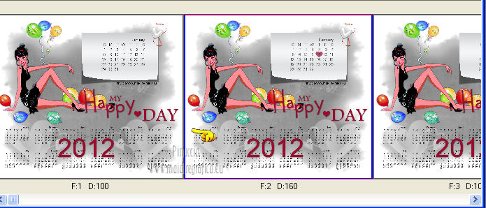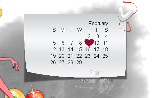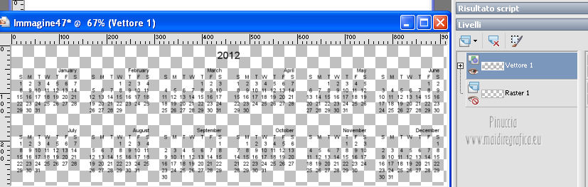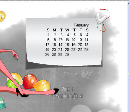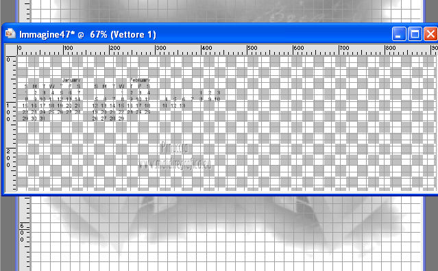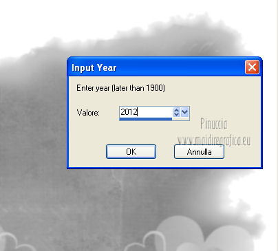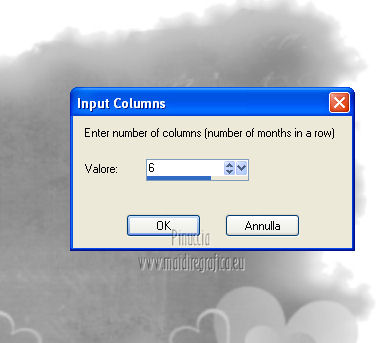 qui puoi trovare qualche risposta ai tuoi dubbi. Se l'argomento che ti interessa non è presente, ti prego di segnalarmelo. Questo tutorial è una creazione di ©Liliane e non può essere copiato su altri siti nè essere offerto per il download. Lo stesso vale per la mia traduzione. Il tutorial è stato elaborato con PSP X2 Ultimate, ma può essere eseguito anche con le altre versioni di PSP. Per tradurlo, ho usato PSP X. Un tube a scelta. Il resto del materiale qui Il tube che ho usato è di Lori Rhae. Lo script è di Jos Croeze. Animation Shop qui ![]() Metti lo script nella cartella Script Sicuri. 1. Imposta il colore di primo piano con il colore bianco #ffffff. e il colore di sfondo con il colore #808080. Apri una nuova immagine trasparente 800 x 700 pixels, e riempila con il colore bianco.2. Livelli>Nuovo livello raster. Riempi con il colore di sfondo #808080.Livelli>Nuovo livello maschera>Da immagine. Apri il menu sotto la finestra di origine e vedrai la lista dei files aperti. Seleziona la maschera Creative Mask 21, con i seguenti settaggi. ![]() Livelli>Elimina, e rispondi sì alla domanda Unire la maschera nel livello corrente. ![]() Livelli>Unisci>Unisci gruppo. 3. Se non visualizzi la barra dello script, vai a Visualizza>Barre degli strumenti>Script. Apri il menu e seleziona lo Script CalendarYear, e clicca sul triangolo nero per avviare lo script. ![]() Una volta avviato, lo script si fermerà per darti la possibilità di cambiare alcuni parametri. Il primo sarà l'anno del calendario che vuoi realizzare. Clicca 2012 e ok. ![]() La successiva richiesta riguarderà la dimensione del font. Imposta 8 e ok. ![]() Seleziona il font ![]() alla richiesta se vuoi riempire il testo rispondi sì. ![]() seleziona 6, per definire di quante colonne dovrà essere composto il calendario. ![]() Alla richiesta del colore di sfondo scelto, imposta il colore nero #000000. ![]() E lo script terminerà da solo il suo lavoro. ![]() Quando lo script avrà terminato il suo lavoro, in una immagine nuova, avrai questo. ![]() Livelli>Converti in livello raster. Attiva lo strumento Selezione , rettangolo,e seleziona il numero 2012. Premi sulla tastiera il tasto CANC. Selezione>Deseleziona. 4. Modifica>Copia. Torna al tuo lavoro e vai a Modifica>Incolla come nuovo livello. Immagine>Ridimensiona, all'80% tutti i livelli non selezionato. Posiziona il calendario in basso,come nel mio esempio. 5. Imposta il colore di sfondo con #9a0b2d. Attiva lo strumento Testo ![]() ![]() E scrivi l'anno al centro. Eventualmente, se vuoi cambiare qualche settaggio, seleziona il testo, e impostando nuovi settaggi controlla contemporaneamente il risultato. ![]() Livelli>Converti in livello raster. Effetti>Effetti 3D>Sfalsa ombra. ![]() 6. Apri ACDesign_elemento_nota e vai a Modifica>Copia. Torna al tuo lavoro e vai a Modifica>Incolla come nuovo livello. Immagine>Ridimensiona, al 20%, tutti i livelli non selezionato. Regola>Messa a fuoco>Metti a fuoco. Sposta l'elemento in alto a destra.![]() 7. Apri il tuo tube e vai a Modifica>Copia. Torna al tuo lavoro e vai a Modifica>Incolla come nuovo livello. Immagine>Ridimensiona, se e quanto necessario, tutti i livelli non selezionato. Spostalo a sinistra.Effetti>Effetti 3D>Sfalsa ombra. ![]() 8. Attiva la barra degli script e fai partire nuovamente lo script, come al punto 3, cambiando soltanto la dimensione del font con 12. ![]() 9. Sul nuovo calendario: attiva lo strumento Selezione , rettangolo,e seleziona il mese di gennaio. ![]() Modifica>Copia. Torna al tuo lavoro e vai a Modifica>Incolla come nuovo livello. Sposta il mese sul foglio in alto a destra.![]() Rinomina questo livello 1 (o gennaio, come preferisci). 10. Torna al calendario. Selezione>Deseleziona. Seleziona il mese di febbraio.Modifica>Copia. Torna al tuo lavoro e vai a Modifica>Incolla come nuovo livello. Posiziona il mese sopra gennaio.![]() Rinomina questo livello 2. 10. Ripeti il passo 9 per tutti gli altri mesi. Non dimenticare di deselezionare prima di selezionare il mese successivo. Quando hai finito, chiudi i livelli da 2 a 12. 11. Assicurati di essere posizionato sul livello superiore. Apri My HappyDay_WA by Lili. Attiva lo strumento Selezione a mano libera , da punto a punto,e seleziona il cuore. Modifica>Copia. Torna al tuo lavoro e vai a Modifica>Incolla come nuovo livello. Posiziona il cuore nel mese e sul numero che vuoi evidenziare (nel mio esempio 9 febbraio). Cambia la modalità di miscelatura di questo livello in Scurisci. ![]() Attiva nuovamente il wordart. Selezione>Deseleziona. Modifica>Copia. Torna al tuo lavoro e vai a Modifica>Incolla come nuovo livello. Posizionalo dove preferisci,o vedi il mio esempio. Effetti>Effetti 3D>Sfalsa ombra. ![]() 12. Aggiungi il tuo nome e/o il tuo watermark su un nuovo livello. 13. Animazione. Modifica>Copia Unione. Apri Animation Shop e vai a Modifica>Incolla>Incolla come nuova animazione. 14. Torna in PSP. Chiudi il livello 1 e apri il livello 2. Modifica>Copia Unione. Torna in Animation Shop e vai a Modifica>Incolla>Incolla dopo il fotogramma corrente. 17. Di nuovo in PSP. Chiudi il livello 2 e apri il livello 3. Modifica>Copia Unione. In Animation Shop: Modifica>Incolla>Incolla dopo il fotogramma corrente. In PSP. Chiudi il livello 3 e apri il livello 4. Modifica>Copia Unione. In Animation Shop: Modifica>Incolla>Incolla dopo il fotogramma corrente. Chiudi il livello 4 e apri il livello 5. Modifica>Copia Unione. In Animation Shop: Modifica>Incolla>Incolla dopo il fotogramma corrente. E continua così, finchè non avrai copiato tutti i livelli del calendario. Alla fine avrai una animazione composta da 12 fotogrammi. 18. Modifica>Seleziona tutto. Animazione>Proprietà fotogramma e imposta la velocità a 100. ![]() Clicca sul fotogramma con il cuoricino rosso per selezionarlo. Soltanto questo deve essere selezionato e avere la cornice blu. Animazione>Proprietà fotogramma e imposta la velocità a 160. ![]() Controlla il risultato cliccando su Visualizza ![]() e 