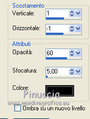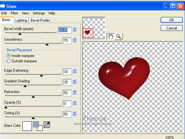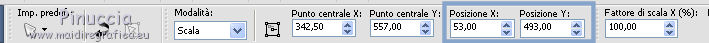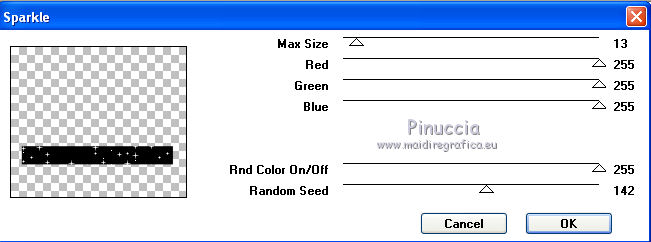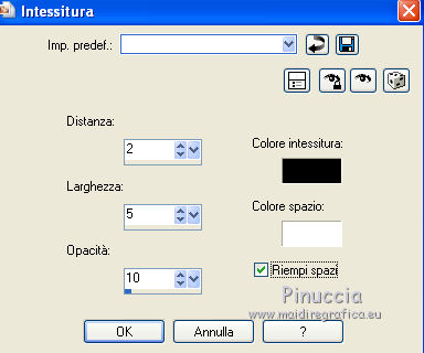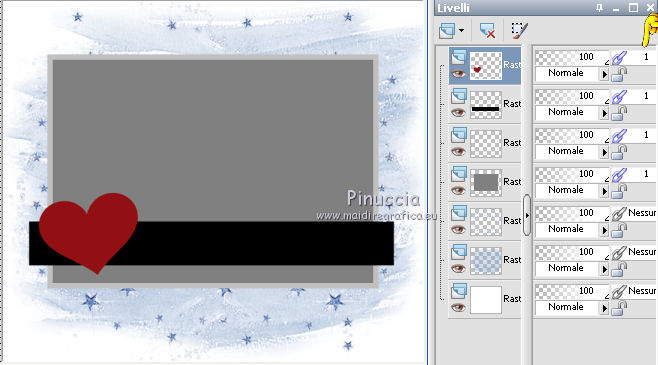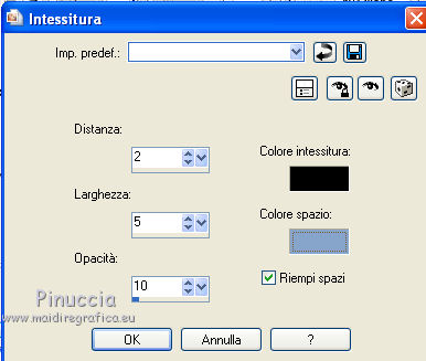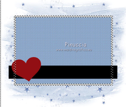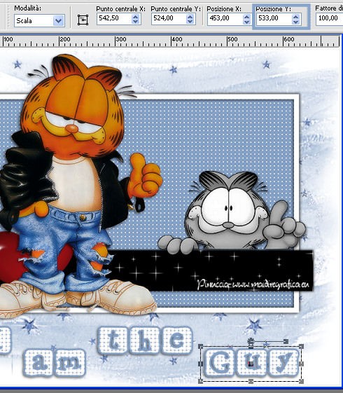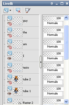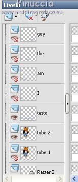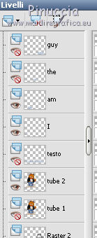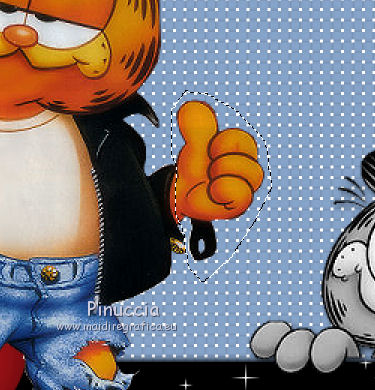 qui puoi trovare qualche risposta ai tuoi dubbi. Se l'argomento che ti interessa non è presente, ti prego di segnalarmelo. Questo tutorial è stato creato con PSP X2 Ultimate, ma può essere eseguito con qualsiasi versione. Per tradurlo, ho usato PSP X. Questo tutorial è una creazione di ©Liliane e non può essere copiato su altri siti nè essere offerto per il download. Lo stesso vale per la mia traduzione. Materiale qui Filtri: consulta, se necessario, la mia sezione filtri qui VM Natural - Sparkle qui Eye Candy 4000 - Glass qui Animation Shop qui ![]() Apri il font e minimizzalo. Lo troverai nella lista dei font disponibili quando ti servirà. Apri il pennello in PSP ed esportalo come pennello personalizzato. Vedi gli appunti sui pennelli qui 1. Imposta il colore di primo piano con il colore bianco, e il colore di sfondo con #87a4ca. Apri il template Ali Valentine Template 1. Elimina il livello con il testo Raster 5. 2. Livelli>Nuovo livello raster. Livelli>Disponi>Porta sotto. Immagine>Dimensioni tela - 700 x 600 pixels. ![]() Riempi il livello con il colore bianco.3. Livelli>Nuovo livello raster. Attiva lo strumento Pennello ![]() Cerca e seleziona il pennello esportato agiBrush72_texture, e applicalo cliccando con il tasto destro del mouse per usare il colore di sfondo #87a4ca. Attiva lo strumento Puntatore ![]() deformazione se stai usando PSP 9,e allarga il pennello per tutta l'ampiezza della tela. ![]() 4. Apri starglitterbg_pastelchristmas e vai a Modifica>Copia. Torna al tuo lavoro e vai a Modifica>Incolla come nuovo livello. Strumento Puntatore o deformazione ![]() e allarga l'elemento per tutta l'ampiezza della tela. ![]() Nella paletta dei livelli assegna lo stesso numero ai quattro livelli superiori, in questo modo saranno tutti collegati per poterli spostare contemporaneamente. Attiva il livello superiore e sposta i quattro livelli in alto, in modo da lasciare più spazio nella parte inferiore. ![]() 5. Attiva il livello Raster 4. Selezione>Seleziona tutto. Selezione>Mobile. Selezione>Immobilizza. Livelli>Nuovo livello raster. Riempi con il colore di sfondo #87a4ca.Selezione>Deseleziona. Effetti>Effetti di trama>Intessitura. colore intessitura nero; colore spazio bianco. ![]() Elimina il livello Raster 4. 6. Attiva il livello Raster 2. Attiva lo strumento Bacchetta magica ![]() e clicca nel bordo per selezionarlo. ![]() Livelli>Nuovo livello raster. Riempi la selezione con il colore bianco.Selezione>Deseleziona. 7. Effetti>Effetti 3D>Sfalsa ombra. ![]() Ripeti l'Effetto Sfalsa ombra, cambiando verticale e orizzontale con -2/2. ![]() Elimina il livello Raster 2. 8. Attiva il livello Raster 3. Effetti>Plugins>VM Natural - Sparkle. ricorda che "Random" significa casuale, per questo motivo le stelle potrebbero apparire diverse e in posizioni diverse del mio esempio ![]() 9. Effetti>Effetti 3D>Sfalsa ombra. ![]() Ripeti l'Effetto Sfalsa ombra, cambiando verticale e orizzontale con 1. ![]() 10. Attiva il livello Raster 1. Effetti>Plugins>Eye Candy 4000 - Glass. ![]() 11. Effetti>Effetti 3D>Sfalsa ombra. ![]() Ripeti l'Effetto Sfalsa ombra, cambiando verticale e orizzontale con 1. ![]() 12. Apri il tube AR-00-0285 e vai a Modifica>Copia. Torna al tuo lavoro e vai a Modifica>Incolla come nuovo livello. Immagine>Ridimensiona, all'80%, tutti i livelli non selezionato. Regola>Messa a fuoco>Metti a fuoco. Regola>Tonalità e saturazione>Viraggio. ![]() Effetti>Effetti 3D>Sfalsa ombra. ![]() Posiziona il tube come nel mio esempio.13. Apri il tube SWDGarfieldFonz e vai a Modifica>Copia. Torna al tuo lavoro e vai a Modifica>Incolla come nuovo livello. Immagine>Ridimensiona, al 70%, tutti i livelli non selezionato. Regola>Messa a fuoco>Metti a fuoco. Posiziona il tube a sinistra, come nel mio esempio.Livelli>Duplica, e rinomina questi livelli "tube 1" e "tube 2". 14. Attiva il livello "tube 2". Ingrandisci l'immagine per vedere meglio attivando lo strumento Zoom ![]() o usando la rotellina del mouse. Attiva lo strumento Selezione a mano libera , da punto a punto,e seleziona la mano del tube, facendo attenzione a non selezionare la manica della giacchetta. ![]() Selezione>Innalza selezione a livello. Attiva il livello sottostante del tube e premi sulla tastiera il tasto CANC. Selezione>Deseleziona. 15. Chiudi il livello "tube 1". Attiva il livello Selezione innalzata. Immagine>Ruota per gradi - 8 gradi a sinistra. ![]() Posiziona correttamente la mano, unendola al braccio.Aprendo il livello "tube 1" dovresti vedere questo. ![]() Livelli>Unisci>Unisci giù. 16. Effetti>Effetti 3D>Sfalsa ombra. ![]() Attiva il livello "tube 1". Ripeti l'Effetto Sfalsa ombra, con gli stessi settaggi. 17. Imposta il colore di primo piano con #87a4ca, e il colore di sfondo con il colore bianco #ffffff. Attiva lo strumento Testo ![]() ![]() Scrivi "I am the Guy (g maiuscolo). Livelli>Converti in livello raster. 18. Effetti>Effetti di trama>Intessitura. colore intessitura nero - colore spazio #87a4ca. ![]() 19. Effetti>Effetti 3D>Sfalsa ombra. ![]() 20. Strumento Puntatore o deformazione ![]() e, nella barra superiore degli strumenti, imposta manualmente la posizione del testo: posizione X: 53; posizione Y: 493. ![]() Rinomina questo livello "testo". 21. Attiva lo strumento Selezione , rettangolo,e seleziona la parola "Guy". ![]() Selezione>Innalza selezione a livello. Selezione>Deseleziona. Rinomina questo livello "guy". 22. Attiva nuovamente il livello "testo". Seleziona la parola "the".Selezione>Innalza selezione a livello. Selezione>Deseleziona. Rinomina questo livello "the". 23. Ripeti il punto 22 (non dimenticare di riposizionarti sul livello "testo"), per le parole "am" e "I". 24. Aggiungi il tuo nome e/o il tuo watermark su un nuovo livello. 25. Attiva il livello "am". Strumento Puntatore o deformazione ![]() e imposta la posizione Y a 533. ![]() Attiva il livello "Guy" e imposta lo stesso valore. ![]() 26. Chiudi il livello "tube 2", e tutti i livelli di testo tranne il livello "I". ![]() Modifica>Cop