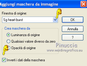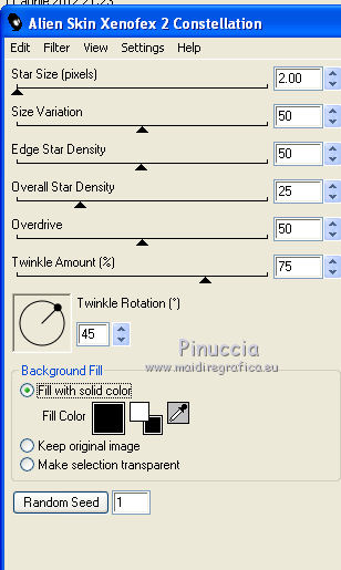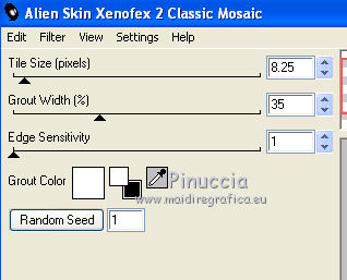 qui puoi trovare qualche risposta ai tuoi dubbi. Se l'argomento che ti interessa non è presente, ti prego di segnalarmelo. Questo tutorial è stato creato con PSP X2 Ultimate, ma può essere eseguito con qualsiasi versione. Per tradurlo, ho usato PSP X. Questo tutorial è una creazione di ©Liliane e non può essere copiato su altri siti nè essere offerto per il download. Lo stesso vale per la mia traduzione. Materiale qui Filtri: consulta, se necessario, la mia sezione filtri qui Alien Skin Xenofex 2.0 qui FM Tile Tools qui Animation Shop qui ![]() Apri il pennello agiBrush-2009-003 in PSP ed esportalo come Pennello personalizzato. Vedi gli appunti sui pennelli qui Apri la maschera sg_heart-burst in PSP e minimizzala con il resto del materiale. 1. Imposta il colore di primo piano con il colore bianco, e il colore di sfondo con il colore nero. Apri una nuova immagine trasparente 600 x 600 pixels, e riempila con il colore bianco.2. Livelli>Nuovo livello raster. Riempi con il colore nero.3. Effetti>Plugins>Alien skin Xenofex 2.0 - Constellation. ![]() 4. Effetti>Plugins>FM Tile Tools - Blend Emboss, con i settaggi standard. ![]() Regola>Messa a fuoco>Metti a fuoco. 5. Livelli>Nuovo livello maschera>Da immagine. Apri il menu sotto la finestra di origine e vedrai la lista dei files aperti. Seleziona la maschera sg heart-burst. ![]() Livelli>Elimina, e rispondi sì alla domanda Unire la maschera nel livello corrente. ![]() Livelli>Unisci>Unisci gruppo. 6. Apri Heartframe 5 e vai a Modifica>Copia. Torna al tuo lavoro e vai a Modifica>Incolla come nuovo livello. 7. Attiva lo strumento Selezione , rettangolo,e traccia una selezione intorno alla cornice. ![]() 8. Livelli>Nuovo livello raster. Riempi con il colore nero.Effetti>Plugins>Alien skin Xenofex 2.0 - Constellation, con i settaggi precedenti. Effetti>Plugins>FM Tile Tools - Blend Emboss, con i settaggi standard. Regola>Messa a fuoco>Metti a fuoco. Selezione>Deseleziona. Nella paletta dei livelli porta questo livello sotto il livello della cornice. Se necessario: aggiusta il livello con lo Strumento Deformazione ![]() (per tutte le versioni tasto D sulla tastiera). ![]() 9. Effetti>Plugins>Alien Skin Xenofex 2.0 - Classic Mosaic. Settings: Organized, con i seguenti settaggi. ![]() 10. Effetti>Plugins>FM Tile Tools - Blend Emboss, con i settaggi standard. Regola>Messa a fuoco>Metti a fuoco. 11. Livelli>Duplica. Rinomina i due livelli "mosaico 1" e "mosaico 2". 12. Cambia la modalità di miscelatura del livello "mosaico 1" in Differenza, e del livello "mosaico 2" in Esclusione. ![]() 13. Attiva il livello della cornice. Apri il tube della donna e vai a Modifica>Copia. Torna al tuo lavoro e vai a Modifica>Incolla come nuovo livello. Immagine>Rifletti. Immagine>Ridimensiona, all'80%, tutti i livelli non selezionato. Con lo strumento Deformazione (tasto D),ruota leggermente il tube in modo che sembri appoggiato al bordo. ![]() 14. Regola>Tonalità e saturazione>Viraggio. ![]() Effetti>Effetti 3D>Sfalsa ombra. ![]() Regola>Messa a fuoco>Metti a fuoco. Imposta il colore di primo piano con il colore #dc0000. Attiva lo strumento Trasforma in destinazione ,imposta la dimensione a 4-5 pixels, e passa il mouse sulle piccole parti grigie per colorarle di rosso. ![]() 15. Attiva il livello Raster 1. Immagine>Dimensioni tela. ![]() Riempi con il colore bianco.16. Livelli>Nuovo livello raster. Attiva lo strumento Pennello , cerca e seleziona il pennello agiBrush-2009-003, dimensioni 170, e applicalo con il colore nero in alto a destra, cliccando tre volte sullo stesso punto. Effetti>Effetti 3D>Sfalsa ombra, con il colore #9c0000. ![]() 17. Attiva lo strumento Testo ![]() scegli un font e scrivi un testo con il colore nero. Converti in livello raster. Scrivi nuovamente il testo, questa volta con il colore #dc0000. Livelli>Converti in livello raster. Sposta leggermente questo testo,in modo che quello sottostante di colore nero crei un'ombra sul testo rosso. 18. Aggiungi il tuo nome e/o il tuo watermark su un nuovo livello. 19. Chiudi il livello "mosaico 2". Modifica>Copia Unione. Apri Animation Shop e vai a Modifica>Incolla>Incolla come nuova animazione. 20. Torna in PSP. Chiudi il livello "mosaico 1" e apri il livello "mosaico 2". Modifica>Copia Unione. Torna in Animation Shop e vai a Modifica>Incolla>Incolla dopo il fotogramma corrente. Controlla il risultato cliccando su Visualizza ![]() e salva in formato gif. ![]() Se hai problemi o dubbi, o trovi un link non funzionante, o anche soltanto per un saluto, scrivimi 18 Giugno 2012 |