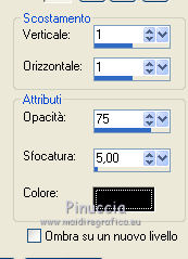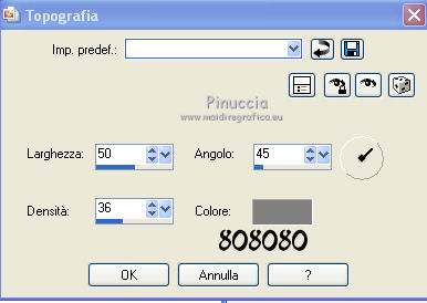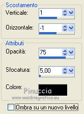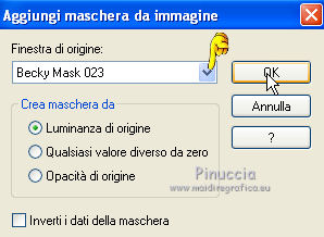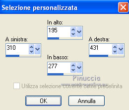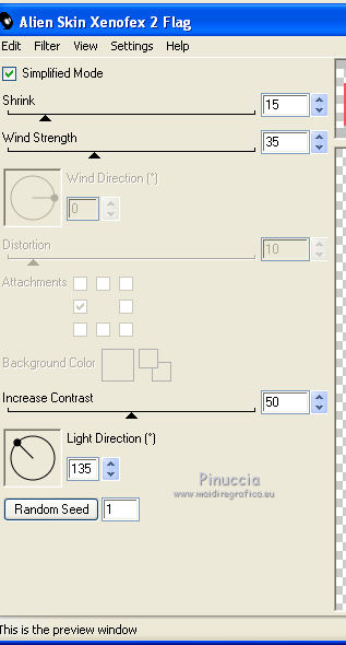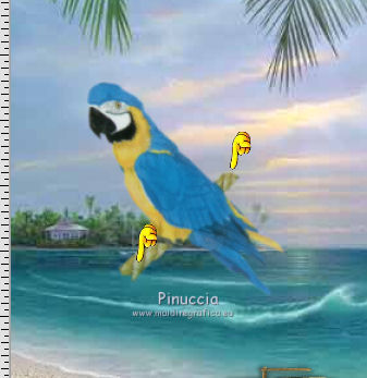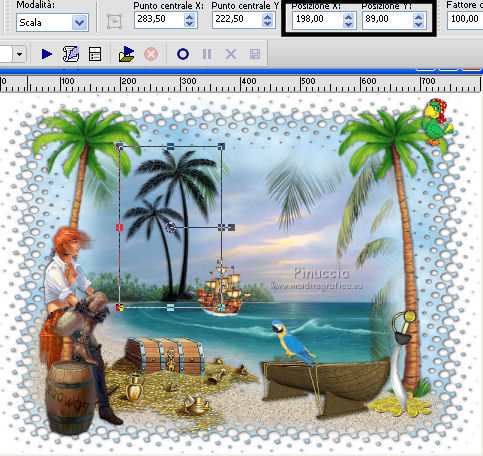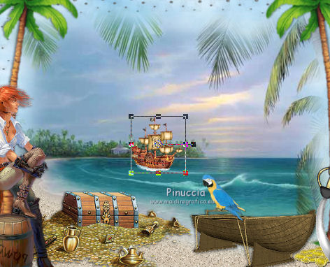 qui puoi trovare qualche risposta ai tuoi dubbi. Se l'argomento che ti interessa non è presente, ti prego di segnalarmelo. Questo tutorial è stato creato con PSP X2 Ultimate, ma può essere eseguito con qualsiasi versione. Per tradurlo, ho usato PSP X. Questo tutorial è una creazione di ©Liliane e non può essere copiato su altri siti nè essere offerto per il download. Lo stesso vale per la mia traduzione. Materiale qui Filtri: consulta, se necessario, la mia sezione filtri qui Alien Skin Xenofex 2.0 - Flag qui Transparency - Eliminate Black qui Animation Shop qui ![]() Apri la maschera in PSP e minimizzala con il resto del materiale. 1. Apri una nuova immagine trasparente 800 x 600 pixels, e riempila con il colore bianco.2. Livelli>Nuovo livello raster. Apri "Paper Sky" e vai a Modifica>Copia. Torna al tuo lavoro e vai a Modifica>Incolla nella selezione. Selezione>Deseleziona. Livelli>Nuovo livello maschera>Da immagine. Apri il menu sotto la finestra di origine e vedrai la lista dei files aperti. Seleziona la maschera Becky mask 023. ![]() Livelli>Elimina e rispondi sì alla domanda Unire la maschera nel livello corrente. ![]() Livelli>Unisci>Unisci gruppo. 3. Livelli>Nuovo livello raster. Selezione>Seleziona tutto. Modifica>Incolla nella selezione (Paper sky è ancora in memoria). Selezione>Deseleziona. Effetti>Plugins>Filters Unlimited 2.0 - Edges Square - Square Edge 16. ![]() 4. Effetti>Effetti 3D>Sfalsa ombra. ![]() 5. Apri DaisyWeb_BeachHouseRendezvous e vai a Modifica>Copia. Torna al tuo lavoro e vai a Modifica>Incolla come nuovo livello. Immagine>Rifletti. 6. Imposta il colore di primo piano con #d6cab4. Attiva lo strumento Aerografo ![]() ![]() Livelli>Nuovo livello raster. Dipingi una forma irregola nella parte inferiore dell'immagine, come nell'esempio. ![]() 7. Effetti>Effetti artistici>Topografia. ![]() 8. Regola>Aggiungi/Rimuovi disturbo>Aggiungi disturbo. ![]() 9. Apri il tube ccd-luau15 e vai a Modifica>Copia. Torna al tuo lavoro e vai a Modifica>Incolla come nuovo livello. Sposta la palma a sinistra.Effetti>Effetti 3D>Sfalsa ombra. ![]() Livelli>Duplica. Immagine>Rifletti. 10. Apri k-s boat, e vai a Modifica>Copia. Torna al tuo lavoro e vai a Modifica>Incolla come nuovo livello. Immagine>Ridimensiona, al 45%, tutti i livelli non selezionato. Regola>Messa a fuoco>Metti a fuoco. Effetti>Effetti 3D>Sfalsa ombra, con settaggi a scelta. Sposta la barca sulla spiaggia,come nel mio esempio. 11. Apri pirate-bird e vai a Modifica>Copia. Torna al tuo lavoro e vai a Modifica>Incolla come nuovo livello. Immagine>Rifletti. Immagine>Ridimensiona, al 30%, tutti i livelli non selezionato. Regola>Messa a fuoco>Metti a fuoco. Effetti>Effetti 3D>Sfalsa ombra, con settaggi a scelta. Sposta il pappagallo sulla palma a destra,come nel mio esempio. 12. Apri piratestuffShirl2. Attiva lo strumento Selezione a mano libera ![]() e seleziona il pappagallo azzurro. Modifica>Copia. Torna al tuo lavoro e vai a Modifica>Incolla come nuovo livello. Attiva lo strumento Gomma ![]() e cancella i due pezzetti di corda. ![]() Immagine>Ridimensiona, al 50%, tutti i livelli non selezionato. Regola>Correzione fotografica in un passaggio. Effetti>Effetti 3D>Sfalsa ombra. ![]() Sposta il pappagallo sulla barca.13. Apri "SD treasure", e vai a Modifica>Copia. Torna al tuo lavoro e vai a Modifica>Incolla come nuovo livello. Immagine>Ridimensiona, all'80%, tutti i livelli non selezionato. Regola>Messa a fuoco>Metti a fuoco. Effetti>Effetti 3D>Sfalsa ombra. ![]() Sposta il tube come nel mio esempio.14. Apri il tube AnnaIgnatieva_beatrice_Moonstar e vai a Modifica>Copia. Torna al tuo lavoro e vai a Modifica>Incolla come nuovo livello. Immagine>Rifletti. Immagine>Ridimensiona, al 50%, tutti i livelli non selezionato. Regola>Correzione fotografica in un passaggio. Effetti>Effetti 3D>Sfalsa ombra. ![]() Sposta il tube a sinistra,come nel mio esempio. 15. Apri "Monti - PL Gold Coins" e vai a Modifica>Copia. Torna al tuo lavoro e vai a Modifica>Incolla come nuovo livello. Immagine>Ridimensiona, al 25%, tutti i livelli non selezionato. Regola>Messa a fuoco>Metti a fuoco. Effetti>Effetti 3D>Sfalsa ombra, con settaggi a scelta. Sposta il tube come nel mio esempio.16. Apri "Monti-PL Cutlass" e vai a Modifica>Copia. Torna al tuo lavoro e vai a Modifica>Incolla come nuovo livello. Immagine>Ridimensiona, al 35%, tutti i livelli non selezionato. Regola>Messa a fuoco>Metti a fuoco. Sposta il tube come nel mio esempio.17. Apri "pirateship" e vai a Modifica>Copia. Torna al tuo lavoro e vai a Modifica>Incolla come nuovo livello. Immagine>Rifletti. Immagine>Ridimensiona, al 25%, tutti i livelli non selezionato. Regola>Messa a fuoco>Metti a fuoco. Effetti>Effetti 3D>Sfalsa ombra, con settaggi a scelta. Posiziona la barca, in modo da coprire quella esistente nello sfondo.![]() Regola>Correzione fotografica in un passaggio. 18. Apri il tube "Palmeira" e vai a Modifica>Copia. Torna al tuo lavoro e vai a Modifica>Incolla come nuovo livello. Premi il tasto D (valido per tutte le versioni) per attivare lo strumento Deformazione ![]() e imposta manualmente la posizione sulla barra dello strumento. ![]() Effetti>Effetti 3D>Sfalsa ombra. ![]() 19. Livelli>Nuovo livello raster. Attiva lo strumento Selezione ,clicca sull'icona Selezione personalizzata ![]() e imposta i seguenti settaggi: ![]() Riempi la selezione con il colore nero.Selezione>Deseleziona. Rinomina questo livello "bandiera". 20. Apri pirata_paper. Livelli>Innalza livello di sfondo. Effetti>Plugins>Transparency - Eliminate Black Modifica>Copia. Torna al tuo lavoro e vai a Modifica>Incolla come nuovo livello. Immagine>Ridimensiona, al 23%, tutti i livelli non selezionato. Posiziona il teschio al centro sulla bandiera.![]() Livelli>Unisci>Unisci giù. Effetti>Effetti 3D>Sfalsa ombra, con settaggi a scelta. 21. Livelli>Duplica - 3 volte, e rinomina i livelli "bandiera 1", "bandiera 2", "bandiera 3", "bandiera 4". 22. Attiva il livello "bandiera 1". Effetti>Plugins>Alien Skin Xenofe