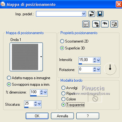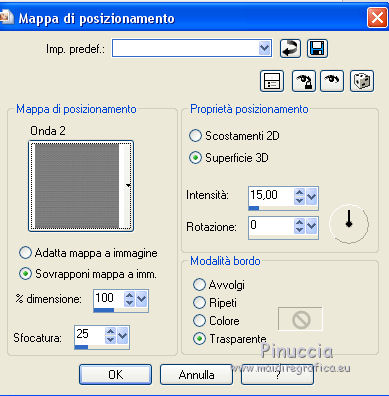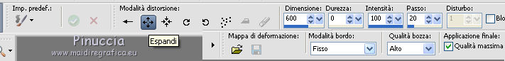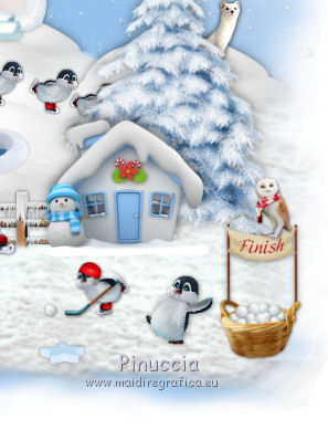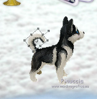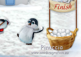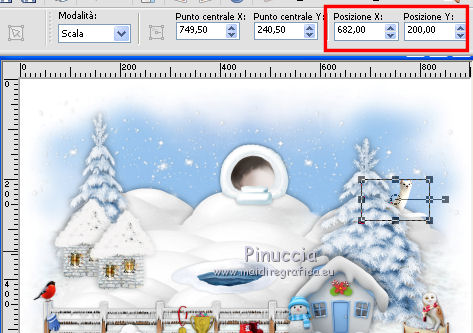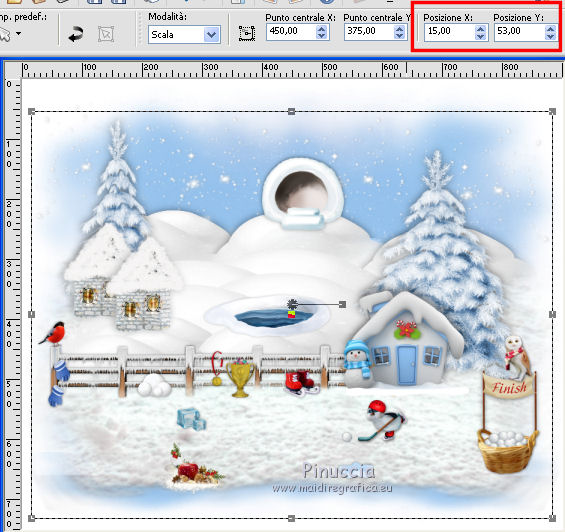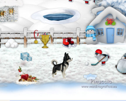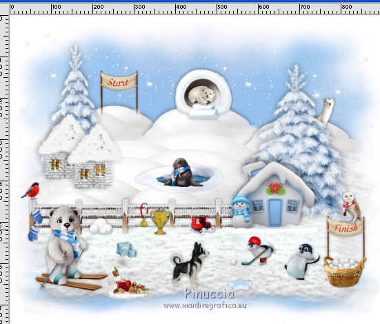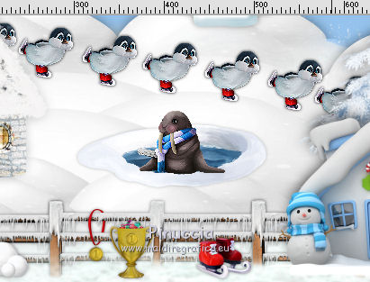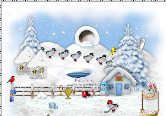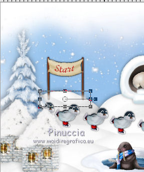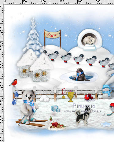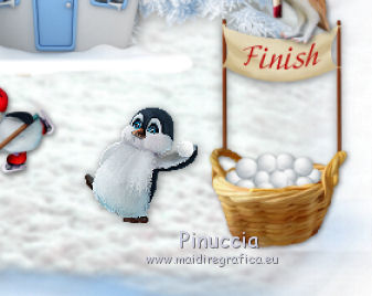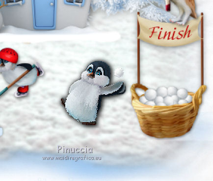 qui puoi trovare qualche risposta ai tuoi dubbi. Se l'argomento che ti interessa non è presente, ti prego di segnalarmelo. Questo tutorial è una creazione di ©Liliane e non può essere copiato su altri siti nè essere offerto per il download. Lo stesso vale per la mia traduzione. Il tutorial è stato elaborato e tradotto con PSP X, ma può essere eseguito anche con le altre versioni di PSP. Occorrente: Materiale qui Animation Shop qui ![]() Metti le trame della cartella Ondas nella cartella Mappe di Deformazione. 1. Apri il Template Winter Games. Questa immagine sarà la base del tuo lavoro. 2. Apri il Cluster Winter Games e vai a Modifica>Copia. Torna al tuo lavoro e vai a Modifica>Incolla come nuovo livello. Attiva lo strumento Puntatore ![]() e imposta Posizione X: 15,00 e Posizion Y: 53,00. ![]() 3. Attiva il livello del Template. Apri il tube Hermine_blanche_CibiBijoux e vai a Modifica>Copia. Torna al tuo lavoro e vai a Modifica>Incolla come nuovo livello. Immagine>Rifletti. Immagine>Ridimensiona, al 25%, tutti i livelli non selezionato. Regola>Messa a fuoco>Metti a fuoco. Attiva lo strumento Puntatore ![]() e imposta Posizione X: 682,00 e Posizion Y: 200,00. ![]() Attiva lo strumento Selezione a mano libera ![]() e seleziona la neve sotto il tube. ![]() Premi sulla tastiera il tasto CANC ![]() Selezione>Deseleziona. Effetti>Effetti 3D>Sfalsa ombra. ![]() Livelli>Duplica. Rinomina questi livelli R1 e R2. 4. Attiva il livello Raster R1. Attiva lo strumento Pennello Stendi ![]() e spingi delicatamente il bianco della testa per chiudere gli occhi del tube ![]() (per vedere il risultato, devi chiudere momentaneamente il livello R2; quando hai fatto, attiva il livello R2 per continuare) 5. Apri il tube Winter Games at the Nort Pole (12) e vai a Modifica>Copia. Torna al tuo lavoro e vai a Modifica>Incolla come nuovo livello. Immagine>Ridimensiona, al 5%, tutti i livelli non selezionato. Regola>Messa a fuoco>Metti a fuoco Immagine>Rifletti. Effetti>Effetti 3D>Sfalsa ombra ![]() Posiziona questo tube dietro gli alberi e le case![]() Livelli>Duplica - 6 volte, e rinomina i livelli PP1, PP2, PP3, PP4, PP5, PP6 e PP7. Posiziona i livelli come nell'esempio;l'ultimo pinguino nascosto dietro l'albero. ![]() 6. Attiva il livello del Cluster. Apri il tube Winter Games at the Nort Pole (17) e vai a Modifica>Copia. Torna al tuo lavoro e vai a Modifica>Incolla come nuovo livello. Immagine>Ridimensiona, all'8%, tutti i livelli non selezionato. Regola>Messa a fuoco>Metti a fuoco. Effetti>Effetti 3D>Sfalsa ombra ![]() Sposta il pinguino a sinistra del cesto.![]() Livelli>Duplica - 3 volte. Rinomina questo livello P1, P2, P3 e P4. 7. Attiva il livello P3. Attiva lo strumento Pennello distorsione con i seguenti settaggi:![]() Chiudi momentaneamente il livello P4 per vedere meglio quello che stai facendo, e tira leggermente l'ala del pinguino; non aumentare la dimensione, basta allungarla un po' verso il basso e a destra, Se non ti piace il risultato, vai a Modifica>Annulla Pennello distorsione o clicca sull'icona corrispondente sulla barra degli strumenti, e ripeti finchè non sei soddisfatto. ![]() 8. Apri Winter Games at the Nort Pole (123) e vai a Modifica>Copia. Torna al tuo lavoro e vai a Modifica>Incolla come nuovo livello. Immagine>Ridimensiona, al 2%, tutti i livelli non selezionato. Regola>Messa a fuoco>Metti a fuoco. Effetti>Effetti 3D>Sfalsa ombra, colore #808080 ![]() Porta questo livello sopra il livello del pinguino 1 e sposta la pallina sopra la pinna del pinguino![]() Livelli>Duplica. Immagine>Rifletti. Sposta il livello sopra il livello del pinguino 2, e sposta la pallina sopra la pinna del pinguino.![]() Livelli>Duplica. Porta questo livello sopra il livello del pinguino 3 e sposta la pallina sulla pinna.![]() Livelli>Duplica. Porta questo livello sopra il livello del pinguino 4 e sposta la pallina leggermente più su della pinna del pinguino 4.![]() Attiva uno alla volta i livelli delle palline e unisci il livello con il livello del pinguino sottostante . 9. Attiva il livello superiore. Apri Winter Games at the Nort Pole (34) e vai a Modifica>Copia. Torna al tuo lavoro e vai a Modifica>Incolla come nuovo livello. Immagine>Rifletti. Immagine>Ridimensiona, al 10%, tutti i livelli non selezionato. Regola>Messa a fuoco>Metti a fuoco. Sposta il cagnolino sulla neve, come nel mio esempio.![]() Livelli>Duplica. Rinomina questi livelli C1 e C2. 10. Attiva il livello C2. Attiva lo strumento Selezione a mano libera , punto a punto,e seleziona la coda del cagnolino. ![]() Selezione>Innalza selezione a livello. Attiva il livello C2 e premi sulla tastiera il tasto CANC. Selezione>Deseleziona. Ritorna sul livello della Selezione innalzata (chiudi momentaneamente il livello C1 per vedere meglio quello che stai facendo). Con lo strumento Pennello Deformazione ruota la codina.![]() Con lo strumento Spostamento posiziona correttamente la coda.![]() Con lo strumento Clonazione clona dal livello C1 il piccolo pezzo mancante della coda![]() Livelli>Unisci>Unisci giù (selezione innalzata e livello C2) 11. Sui livelli C1 e C2: Effetti>Effetti 3D>Sfalsa ombra. ![]() 12. Attiva il livello del Cluster. Attiva lo strumento Bacchetta magica ![]() e clicca nell'acqua del lago per selezionarla. ![]() Selezione>Innalza selezione a livello. Selezione>Deseleziona. Livelli>Duplica - 3 volte. Rinomina questi livelli L1, L2, L3 e L4. 13. Attiva il livello L1. Effetti>Effetti di distorsione>Mappa di posizionamento - seleziona Onda 1 con i seguenti settaggi. ![]() 14. Attiva il livello L2. Effetti>Effetti di distorsione>Mappa di posizionamento - seleziona Onda 2, con gli stessi settaggi. ![]() 15. Attiva il livello L3. Effetti>Effetti di distorsione>Mappa di posizionamento - seleziona Onda 3 e ok. 16. Attiva il livello L4. Effetti>Effetti di distorsione>Mappa di posizionamento - seleziona Onda 4 e ok. 17. Apri Winter Games at the Nort Pole (23) e vai a Modifica>Copia. Torna al tuo lavoro e vai a Modifica>Incolla come nuo