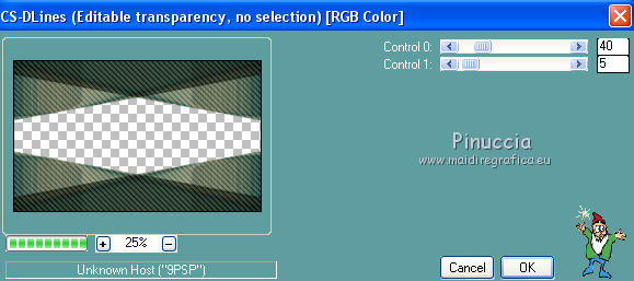 qui puoi trovare qualche risposta ai tuoi dubbi. Se l'argomento che ti interessa non è presente, ti prego di segnalarmelo. Questo tutorial è stato creato con CorelX6, ma può essere realizzato anche con le altre versioni di PSP. Dalla versione X4, il comando Immagine>Rifletti è stato sostituito con Immagine>Capovolgi in orizzontale, e il comando Immagine>Capovolgi con Immagine>Capovolgi in verticale. Nelle versioni X5 e X6, le funzioni sono state migliorate rendendo disponibile il menu Oggetti. Vedi la scheda sull'argomento qui Per tradurre questo tutorial ho usato PSP X. Occorrente: Materiale qui Per il tube utilizzatograzie K@rine, per la maschera grazie Narah. Filtri: se hai problemi con i filtri, consulta la mia sezione filtri qui Filters Unlimited 2.0 qui &<Bkg Designer sf10I> (da importare in Unlimited) qui Mura's Meister - Perspective Tiling 1.1 qui Carolaine and Sensibility - CS-DLines qui Andrew's Filters 56 - A Bit Left Over Gradient qui Toadies - What are you qui I filtri Andrew's e Toadies si possono usare da soli o importati in Filters Unlimited. come fare vedi qui) Se un filtro fornito appare con questa icona ![]() se stai usando altri colori, sei libero di sperimentare le modalità di miscelatura più adatte La cornice-immagine Corel_09_019 è standard nelle versioni più recenti di PSP e corrisponde alla trama standard Trasparente02 delle versioni precedenti. Se non la trovi nel tuo PSP, metti quella fornita nella cartella Cornici-immagine. La trama Corel_15_010 è standard nelle versioni più recenti di PSP, e corrisponde alla trama standard Pallini delle versioni precedenti. Se non la trovi nel tuo PSP, metti quella fornita nella cartelle Trama. Apri la maschera in PSP e minimizzala con il resto del materiale. 1. Imposta il colore di primo piano con #d9b188, e il colore di sfondo con #1c4d44. ![]() Passa il colore di primo piano a Gradiente di primo piano/sfondo, stile Sprazzo di luce. ![]() 2. Apri Alpha sélections_alanis. Finestra>Duplica o, sulla tastiera, maiuscola+D, per fare una copia. Chiudi l'originale e lavora sulla copia. L'immagine non è vuota, ma contiene le selezioni salvate sul canale alfa. Riempi l'immagine trasparente con il gradiente.3. Livelli>Duplica. Immagine>Ruota per gradi - 90 gradi a destra. ![]() 4. Effetti>Plugins>Filters Unlimited 2.0 - &Bkg Designer sf10I> - Crosstitch. ![]() Cambia la modalità di miscelatura di questo livello in Moltiplica, e abbassa l'opacità al 75%. ![]() 5. Effetti>Effetti geometrici>Inclina. ![]() Regola>Messa a fuoco>Metti a fuoco. 6. Effetti>Effetti 3D>Sfalsa ombra, colore nero. ![]() Livelli>Unisci>Unisci giù. 8. Selezione>Carica/Salva selezione>Carica Selezione da disco. La selezione Sélection#1 è subito disponibile. Devi soltanto cliccare Carica. ![]() Selezione>Innalza selezione a livello. 9. Effetti>Plugins>Mura's Meister - Perspective Tilling, con i settaggi standard. ![]() Selezione>Deseleziona. Cambia la modalità di miscelatura di questo livello in Luminanza (esistente). ![]() 10. Livelli>Duplica. Immagine>Capovolgi. Livelli>Unisci>Unisci giù. 11. Effetti>Effetti geometrici>Prospettiva orizzontale. ![]() 12. Regola>Sfocatura>Sfocatura gaussiana - raggio 1. ![]() Cambia la modalità di miscelatura di questo livello in Moltiplica. ![]() Livelli>Duplica. Immagine>Rifletti. Livelli>Unisci>Unisci giù. 13. Effetti>Plugins>Carolaine and Sensibility - CS-DLines, con i settaggi standard. ![]() Effetti>Effetti 3D>Sfalsa ombra, colore nero. ![]() Cambia la modalità di miscelatura di questo livello in Luminanza. ![]() 14. Selezione>Carica/Salva selezione>Carica Selezione da disco. Apri il menu delle selezioni e carica Sélection#2. ![]() Livelli>Nuovo livello raster. Riporta il colore di primo piano a Colore, e riempi con il colore chiaro di primo piano #d9b188.Selezione>Deseleziona. 15. Effetti>Plugins>Filters Unlimited 2.0 - Andrew's Filter 56 - A Bit Left Over Gradient. regola i settaggi in base ai tuoi colori ![]() Livelli>Duplica. Immagine>Rifletti. Ripeti Effetti>Plugins>Filters Unlimited 2.0 - Andrew's Filter 56 - A Bit Left Over Gradient, con i settaggi precedenti. ![]() Livelli>Unisci>Unisci giù. Abbassa l'opacità di questo livello all'80%. 16 Attiva il livello raster 1. ![]() Selezione>Carica/Salva selezione>Carica Selezione da disco. Apri il menu delle selezioni e carica Sélection#3. ![]() Selezione>Innalza selezione a livello. Selezione>Deseleziona. 17. Effetti>Effetti di distorsione>Coordinate polari. ![]() Livelli>Disponi>Porta in alto. 18. Finestra>Duplica, o maiuscola+D. Metti da parte l'originale, e lavora sulla copia. Livelli>Unisci>Unisci tutto. 19. Immagine>Cornice-immagine - seleziona la cornice-immagine Trasparente (nelle versioni più recenti Corel_09_019). ![]() Livelli>Unisci>Unisci tutto. Immagine>Ridimensiona, al 26%, tutti i livelli selezionato. ![]() Minimizza questa immagine e torna al tuo lavoro originale. 20. Rimani posizionato sul livello superiore. ![]() Livelli>Nuovo livello raster. Selezione>Carica/Salva selezione>Carica Selezione da disco. Apri il menu delle selezioni e carica Sélection#4. ![]() Riempi la selezione con il colore scuro di sfondo #1c4d44.21. Effetti>Effetti di trama>Trama - seleziona la trama Pallini (nelle versioni più recenti Corel_15_010), colore bianco. ![]() Cambia la modalità di miscelatura di questo livello in Moltiplica, e abbassa l'opacità al 60%. ![]() Regola>Messa a fuoco>Metti a fuoco. Selezione>Deseleziona. Dovresti avere questo. ![]() 22. Imposta il colore di primo piano con il colore bianco. ![]() Livelli>Nuovo livello raster. Riempi con il colore bianco.Livelli>Nuovo livello maschera>Da immagine. Apri il menu sotto la finestra di origine e vedrai la lista dei files aperti. Seleziona la maschera Narah_mask_0610, con i seguenti settaggi. ![]() Livelli>Unisci>Unisci gruppo. Regola>Messa a fuoco>Accentua messa a fuoco. 23. Attiva l'immagine del quadro, che hai minimizzato al punto 19. ![]() Modifica>Copia. Torna al tuo lavoro e vai a Modif