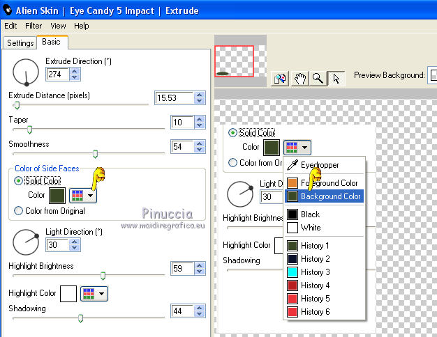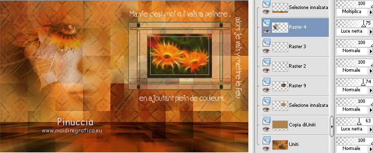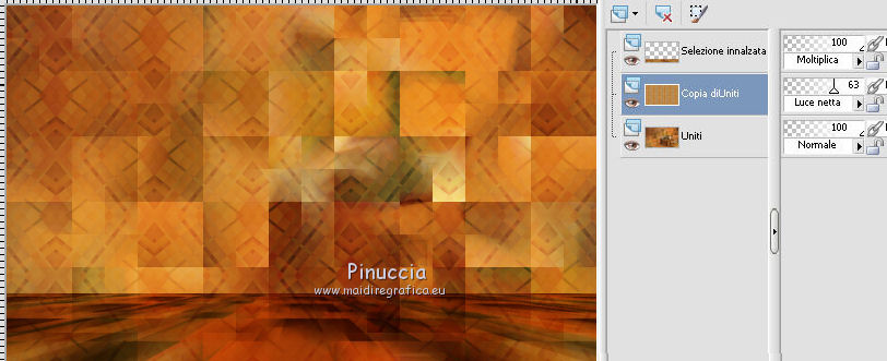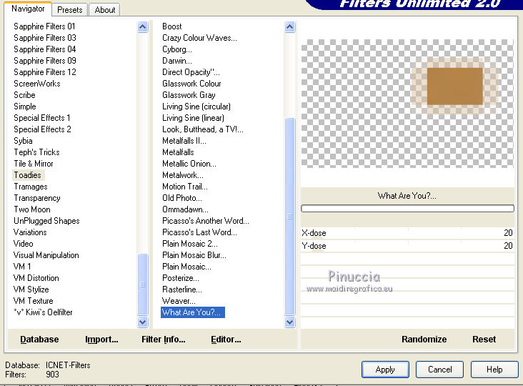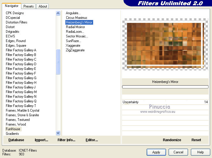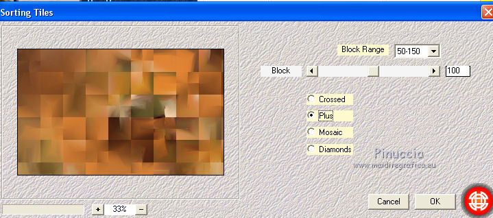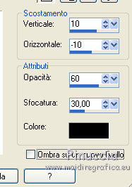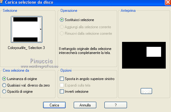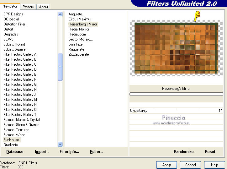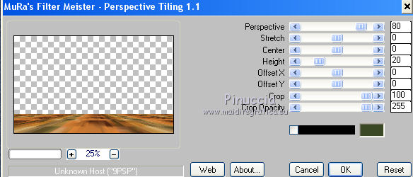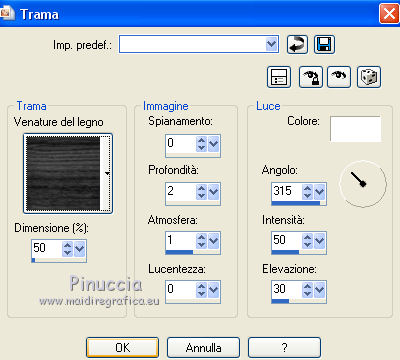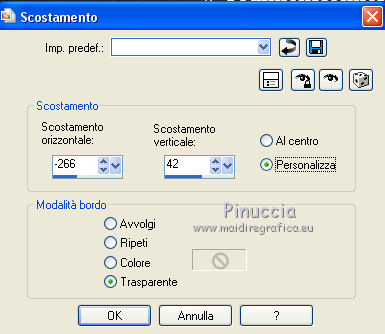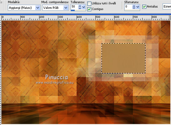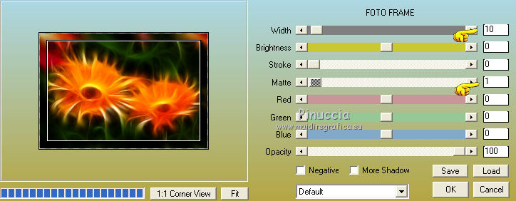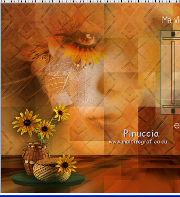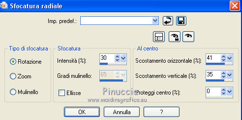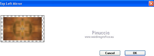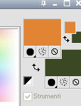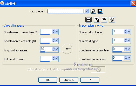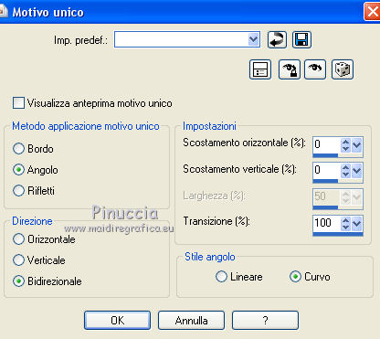 qui puoi trovare qualche risposta ai tuoi dubbi. Se l'argomento che ti interessa non è presente, ti prego di segnalarmelo. Per tradurre questo tutorial ho usato PSP X. Occorrente: Materiale qui Filtri: se hai problemi con i filtri, consulta la mia sezione filtri qui Filters Unlimited 2.0 qui Simple - Top Left Mirror qui Mura's Meister - Perspective Tiling qui Alien Skin Eye Candy 5 Impact - Extrude qui Funhouse - Heizenberg's Mirror qui Toadies - What are you qui AAA Frames - Foto Frame qui I filtri Simple, Toadies e Funhouse si possono usare da soli o importati in Filters Unlimited. come fare vedi qui) Se un filtro fornito appare con questa icona ![]() se stai usando altri colori, sei libero di sperimentare le modalità di miscelatura più adatte La trama Corel_15_049 è standard nelle versioni più recenti di PSP, e corrisponde alla trama standard delle versioni precedenti Venature del legno. Se non la trovi nel tuo PSP, metti quella fornita nella cartella Trame. Metti le selezioni nella cartella Selezioni. 1. Imposta il colore di primo piano con il colore chiaro #e18434, e il colore di sfondo con il colore scuro #3a4825. ![]() 2. Apri una nuova immagine trasparente 900 x 550 pixels, ![]() e riempila con il colore chiaro di primo piano #e18434.Livelli>Nuovo livello raster. Selezione>Seleziona tutto. Apri il tube VerlaineC52, e vai a Modifica>Copia. non chiuderlo perchè ti servirà ancora Torna al tuo lavoro e vai a Modifica>Incolla nella selezione. Selezione>Deseleziona. 3. Effetti>Effetti di immagine>Motivo unico. ![]() 4. Regola>Sfocatura>Sfocatura radiale. ![]() Livelli>Unisci>Unisci visibile. 5. Effetti>Plugins>Mehdi - Sorting Tiles. ![]() 6. Selezione>Carica/Salva selezione>Carica selezione da disco. Cerca e carica la selezione Coloryourlife-sélection 1. ![]() Selezione>Innalza selezione a livello. Selezione>Deseleziona. 7. Effetti>Plugins>Mura's Meister - Perspective Tiling. ![]() Cambia la modalità di miscelatura di questo livello in Moltiplica. Attiva il livello inferiori Uniti. Livelli>Duplica. Immagine>Ridimensiona, al 90%, tutti i livelli non selezionato. ![]() 8. Effetti>Plugins>Filters Unlimited 2.0 - Funhouse - Heizenberg's Mirror, con i settaggi standard. ![]() Attenzione, a seconda delle proprie impostazioni, il filtro è influenzato dal colore di sfondo. Pertanto, se nella finestra di anteprima del filtro ti appare la cornice scura, come nella schermata sotto ![]() prima di applicarlo, imposta il colore di sfondo con il colore bianco Effetti>Plugins>Simple - Top Left Mirror. ![]() 9. Effetti>Effetti di riflesso>Motivi. ![]() Cambia la modalità di miscelatura di questo livello in Luce netta, e abbassa l'opacità al 63% ![]() 10. Selezione>Carica/Salva selezione>Carica selezione da disco. Cerca e carica la selezione Coloryourlife-sélection 2. ![]() Premi sulla tastiera il tasto CANC ![]() Selezione>Deseleziona. 11. Effetti>Plugins>FM Tile Tools - Blend Emboss, con i settaggi standard. ![]() 12. Selezione>Carica/Salva selezione>Carica selezione da disco. Cerca e carica la selezione Coloryourlife-sélection 3. ![]() Selezione>Innalza selezione a livello. Regola>Sfocatura>Sfocatura gaussiana - raggio 30. ![]() Selezione>Deseleziona. 13. Effetti>Plugins>Filters Unlimited 2.0 - Toadies - What are you. ![]() Effetti>Effetti di bordo>Aumenta di più. 14. Attiva lo strumento Bacchetta magica ![]() tolleranza 50, o da regolare in funzione del colore utilizzato, e clicca nel riquadro al centro per selezionarlo. ![]() Selezione>Modifica>Espandi - 1 pixels. Livelli>Nuovo livello raster. Apri "image fractale" e vai a Modifica>Copia. Torna al tuo lavoro e vai a Modifica>Incolla nella selezione. Mantieni selezionato. 15. Effetti>Plugins>AAA Frames - Foto Frame. ![]() Abbassa l'opacità di questo livello al 74%. Selezione>Deseleziona. 16. Apri "déco cadre" e vai a Modifica>Copia. Torna al tuo lavoro e vai a Modifica>Incolla come nuovo livello. Effetti>Effetti di immagine>Scostamento. ![]() 17. Apri "déco texte" e vai a Modifica>Copia. Torna al tuo lavoro e vai a Modifica>Incolla come nuovo livello. Effetti>Effetti di immagine>Scostamento. ![]() 18. Apri il tube VerlaineC50 e vai a Modifica>Copia. Torna al tuo lavoro e vai a Modifica>Incolla come nuovo livello. Immagine>Ridimensiona, all'80%, tutti i livelli non selezionato. Effetti>Effetti di immagine>Scostamento. ![]() Cambia la modalità di miscelatura di questo livello in Luce netta, e abbassa l'opacità al 75%. ![]() Regola>Messa a fuoco>Metti a fuoco. 19. Chiudi il colore di primo. Se hai cambiato il colore di sfondo per il filtro Funhouse, riporta a colore di sfondo il colore scuro #3a4825. Attiva il livello superiore. Attiva lo strumento Forme-ellisse ![]() stile di linea pieno, ![]() e traccia un'ovale in basso a sinistra, come nell'esempio. ![]() Livelli>Converti in livello raster. 20. Effetti>Plugins>Alien Skin Eye Candy 5 Impact - Extrude, con i seguenti settaggi per impostare il colore di sfondo, apri il menu Color e seleziona il colore di sfondo #3a4825. ![]() 21. Effetti>Effetti di trama>Trama - seleziona la trama Venature del legno (Corel_15_049), con i seguenti settaggi. ![]() Effetti>Effetti 3D>Sfalsa ombra, colore nero. ![]() 22. Apri "tube marguerite" e vai a Modifica>Copia. Torna al tuo lavoro e vai a Modifica>Incolla come nuovo livello. Immagine>Ridimensiona, al 50%, tutti i livelli non selezionato. Regola>Messa a fuoco>Metti a fuoco. Effetti>Effetti di immagine>Scostamento. ![]() il tube dovrebbe trovarsi correttamente posizionato sulla forma; eventualmente, se necessario, correggi la posizione ![]() Effetti>Effetti 3D>Sfalsa ombra, colore nero. ![]() 23. Attiva nuovamente il tube VerlaineC52 e vai a Modifica>Copia. Torna al tuo lavoro e vai a Modifica>Incolla come nuovo livello. Immagine>Ridimensiona, al 50%, tutti i livelli non selezionato. Effetti>Effetti di immagine>Scostamento. ![]() Effetti>Effetti 3D>Sfalsa ombra, colore nero. ![]() Regola>Messa a fuoco>Metti a fuoco. 24. Attiva il livello inferiore 