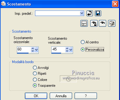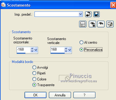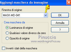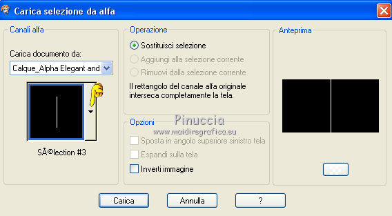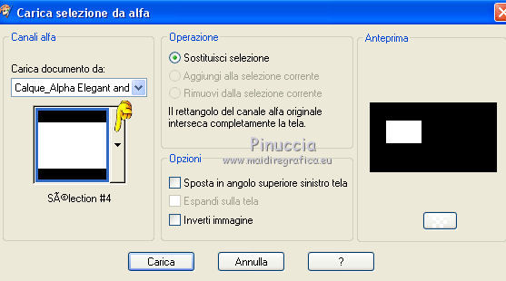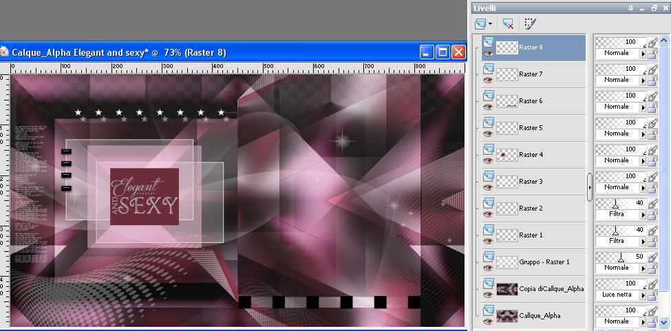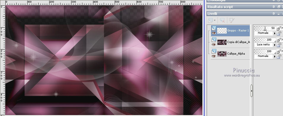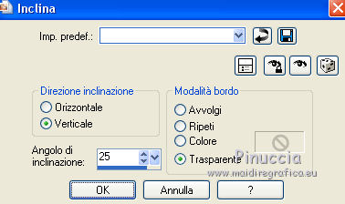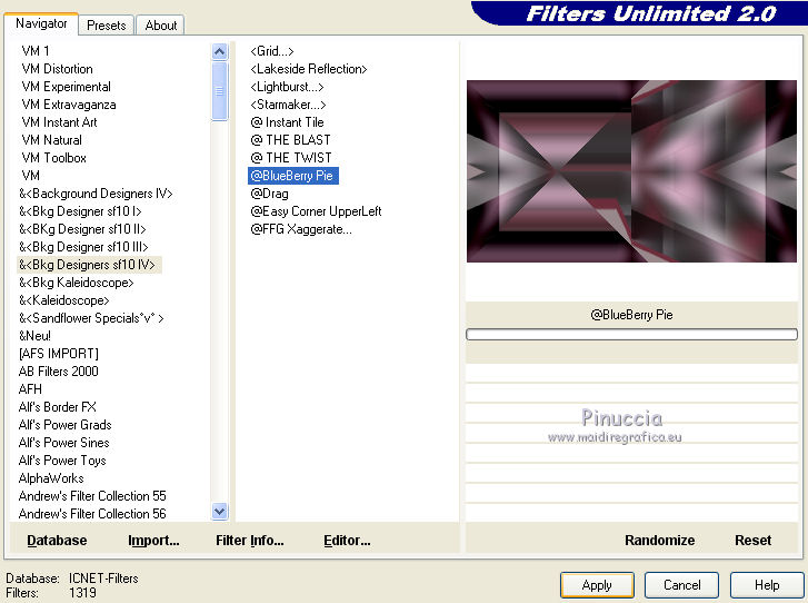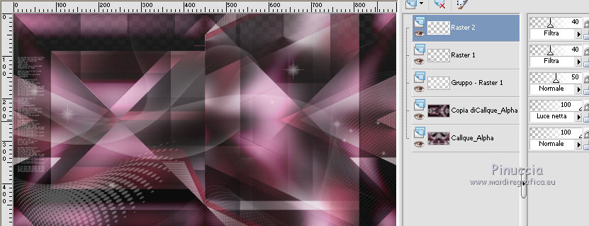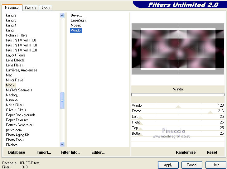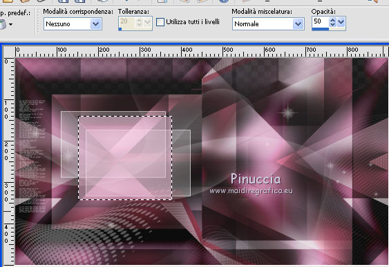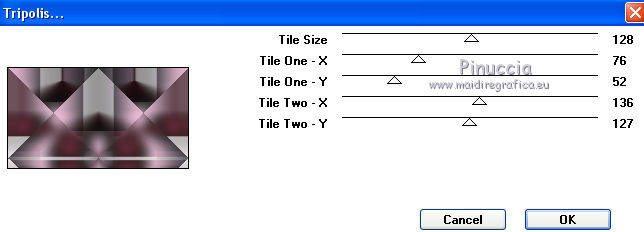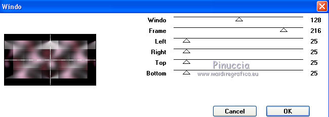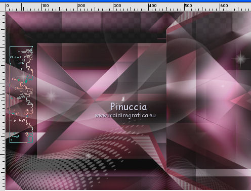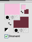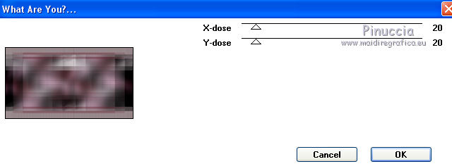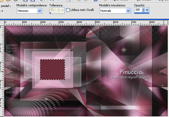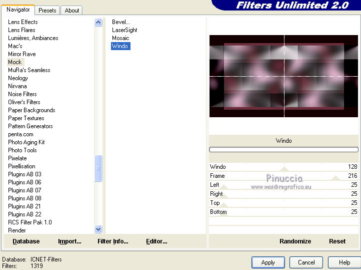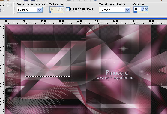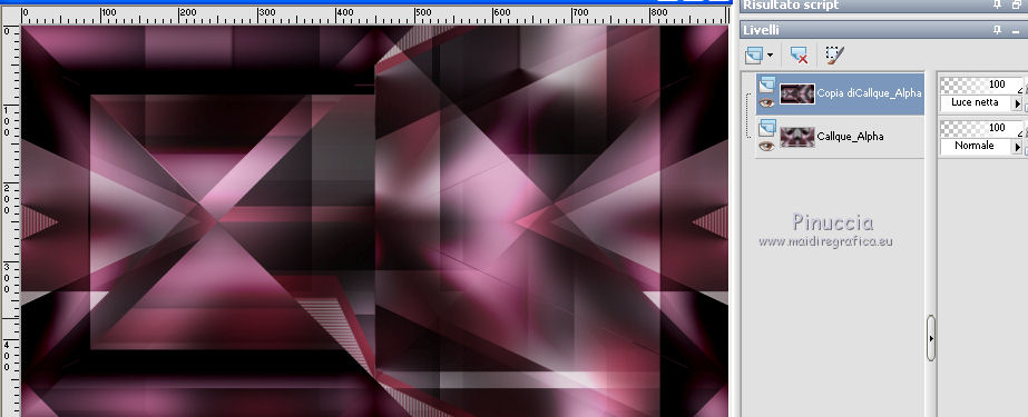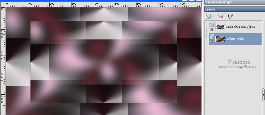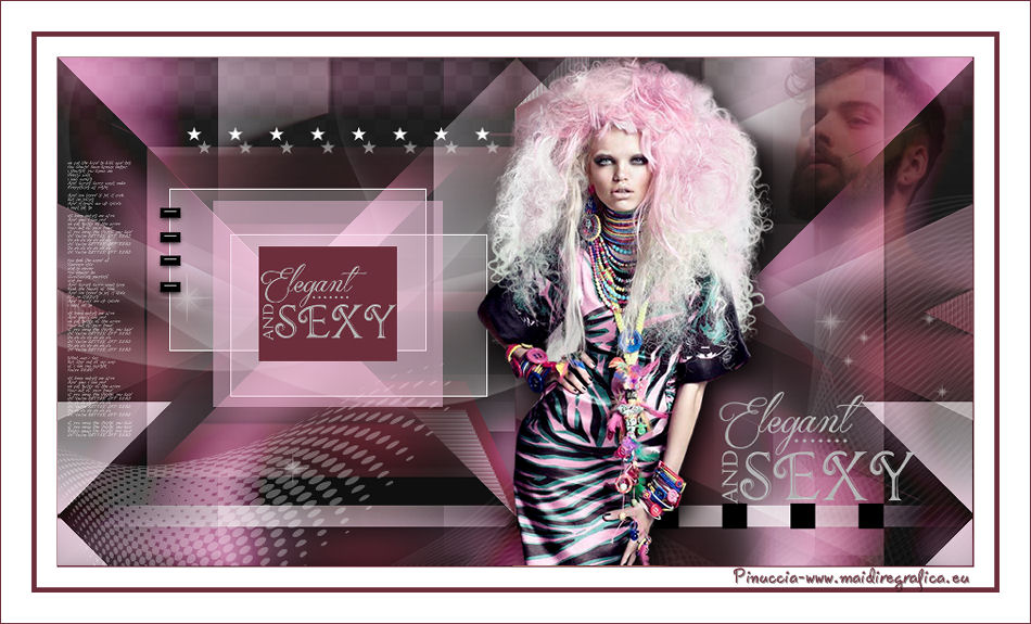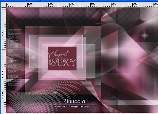 qui puoi trovare qualche risposta ai tuoi dubbi. Se l'argomento che ti interessa non è presente, ti prego di segnalarmelo. Questo tutorial è stato creato con CorelX9 e tradotto con PSPX, ma può essere realizzato anche con le altre versioni di PSP. Dalla versione X4, il comando Immagine>Rifletti è stato sostituito con Immagine>Capovolgi in orizzontale, e il comando Immagine>Capovolgi con Immagine>Capovolgi in verticale. Nelle versioni X5 e X6, le funzioni sono state migliorate rendendo disponibile il menu Oggetti. Con la nuova versione X7 sono tornati i comandi Rifletti e Capovolgi, ma con nuove differenze. Vedi la scheda sull'argomento qui Le vostre versioni qui Occorrente: Materiale qui Filtri: se hai problemi con i filtri, consulta la mia sezione filtri qui Filters Unlimited 2.0 qui Mehdi- Wavy Lab qui Toadies - Sucking Toad Bevel II.2, What are you qui VM Instant Art - Tripolis qui &<Bkg Designer sf10IV> - @BlueBerry Pie (da importare in Unlimited) qui Mock - Windo qui I filtri VM Instant Art, Toadies e Mock si possono usare da soli o importati in Filters Unlimited. come fare vedi qui) Se un filtro fornito appare con questa icona ![]() Se stai usando altri colori, non esitare a sperimentare le modalità di miscelatura e le opacità dei livelli più adatte. Apri i pennelli in PSP ed esportali. Come fare vedi qui Apri la maschera in PSP e minimizzala con il resto del materiale. Colori utilizzati ![]() 1. Imposta il colore di primo piano con #f4c1dc, e il colore di sfondo con #6c2e3b. ![]() Apri Calque_Alpha_Elegant_and_Sexy. Finestra>Duplica, o sulla tastiera maiuscola+D, per fare una copia. ![]() Chiudi l'originale. La copia, che sarà la base del tuo lavoro, non è vuota, ma contiene le selezioni salvate sul canale alfa. 2. Effetti>Plugins>Mehdi - Wavy Lab Questo filtro lavora con i colori della paletta: il primo è il colore di sfondo, il secondo quello di primo piano; cambia il terzo colore con #2f2f2f. ![]() 3. Regola>Sfocatura>Sfocatura gaussiana - raggio 25. ![]() 4. Effetti>Plugins>Toadies - Sucking Toad Bevel II.2, con i settaggi standard. ![]() 5. Effetti>Effetti di immagine>Motivo unico, con i settaggi standard. ![]() 6. Livelli>Duplica. 7. Immagine>Ridimensiona, al 75%, tutti i livelli non selezionato. ![]() 8. Attiva il livello inferiore. ![]() 9. Effetti>Plugins>VM Instant Art - Tripolis, con i settaggi standard. ![]() 10. Attiva nuovamente il livello superiore della copia. 11. Effetti>Effetti di immagine>Motivo unico. ![]() 12. Effetti>Plugins>Filters Unlimited 2.0 - Mocks - Windo, con i settaggi standard. ![]() **** attenzione, il risultato di questo filtro sarà diverso se usato da solo ![]() o se importato nella versione software del filtro Unlimited ![]() Per ottenere il risultato corretto, ho usato la versione del filtro Unlimited che non si installa, ma è composto da files in formato 8bf, che trovi qui Vedi la scheda del filtro qui attenzione, per ottenere il corretto risultato del tutorial originale, attenzione, usando il filtro da solo, si ottiene un risultato differente. ![]() ***** Questo il risultato corretto: ![]() 13. Selezione>Carica/Salva selezione>Carica selezione da canale alfa. La selezione sélection#1 è subito disponibile. Devi soltanto cliccare Carica. ![]() Se hai usato la versione di Unlimited che non si installa avrai questo: ![]() 14. Effetti>Effetti di trama> Veneziana, colore di sfondo #6c2e3b. ![]() Selezione>Deseleziona. 15. Selezione>Carica/Salva selezione>Carica selezione da canale alfa. Apri il menu delle selezioni e carica Sélection #2. ![]() ![]() 16. Riempi la selezione con il colore di sfondo #6c2e3b.Selezione>Deseleziona. 18. Selezione>Carica/Salva selezione>Carica selezione da canale alfa. Apri il menu delle selezioni e carica Sélection #3. ![]() 19. Cambia il colore di sfondo con #2f2f2f, ![]() e riempi la selezione con il nuovo colore di sfondo #2f2f2f(ingrandisci 20. Effetti>Plugins>Toadies - What are you, con i settaggi standard. ![]() Selezione>Deseleziona. 21. Effetti>Effetti geometrici>Inclina. ![]() 22. Effetti>Plugins>Filters Unlimited 2.0 - &<Bkg Designers sf10IV> - @BlueBerry Pie. ![]() Cambia la modalità di miscelatura di questo livello in Luce netta. ![]() 23. Imposta il colore di primo piano con il colore bianco #ffffff. ![]() 24. Livelli>Nuovo livello raster - Raster 1. Riempi il livello con il colore bianco #ffffff.25. Livelli>Nuovo livello maschera>Da immagine. Apri il menu sotto la finestra di origine e vedrai la lista dei files aperti. Seleziona la maschera MASK-MD-041. ![]() Livelli>Unisci>Unisci gruppo. Abbassa l'opacità di questo livello al 50%. ![]() 26. Livelli>Nuovo livello raster - Raster 1. Attiva lo strumento Pennello ![]() cerca e seleziona il pennello Brush_halftone_Lily ![]() Applica il pennello in basso a sinistra, un po' fuori dal bordo, cliccando con il tasto sinistro del mouse, per usare il colore bianco di primo piano. ![]() 27. Cambia la modalità di miscelatura di questo livello in Filtra, e abbassa l'opacità al 40%. 28. Livelli>Nuovo livello raster - Raster 2. Attiva lo strumento Pennello ![]() cerca e seleziona il pennello Brush_tiny text_Lily ![]() Applica il pennello come nell'esempio, sempre cliccando con il tasto sinistro del mouse, per usare il colore bianco di primo piano. ![]() 29. Regola>Messa a fuoco>Metti a fuoco. Cambia la modalità di miscelatura di questo livello in Filtra, e abbassa l'opacità al 40%. ![]() Se hai problemi con i pennelli, nel materiale ho aggiunto nella cartella "pennelli in psp" i pennelli in formato appunto psp, da copiare e incollare come nuovo livello. 30. Livelli>Nuovo livello raster - Raster 3. Selezione>Carica/Salva selezione>Carica selezione da canale alfa. Apri il menu delle selezioni e carica Sélection #4. ![]() 31. Riempi la selezione con il colore bianco di primo piano #ffffff.32. Selezione>Modifica>Contrai - 1 pixel. ![]() Premi sulla tastiera il tasto CANC ![]() 33. Abbassa l'opacità dello strumento Riempimento al 25%. Riempi con il color