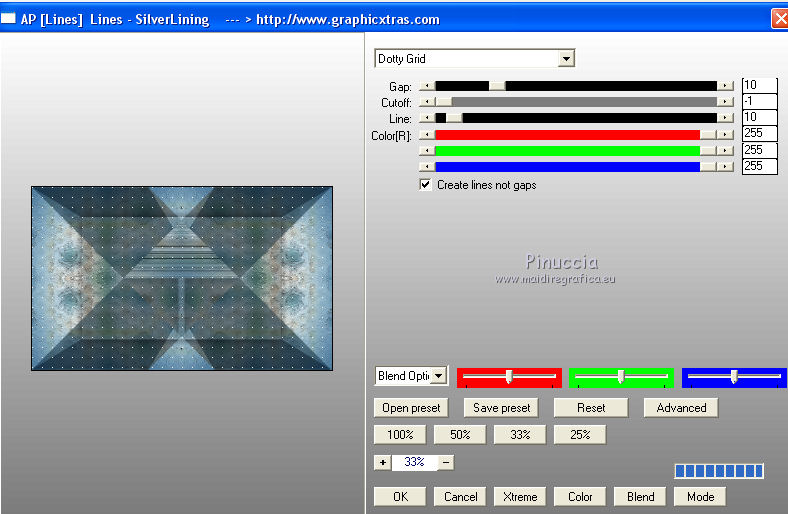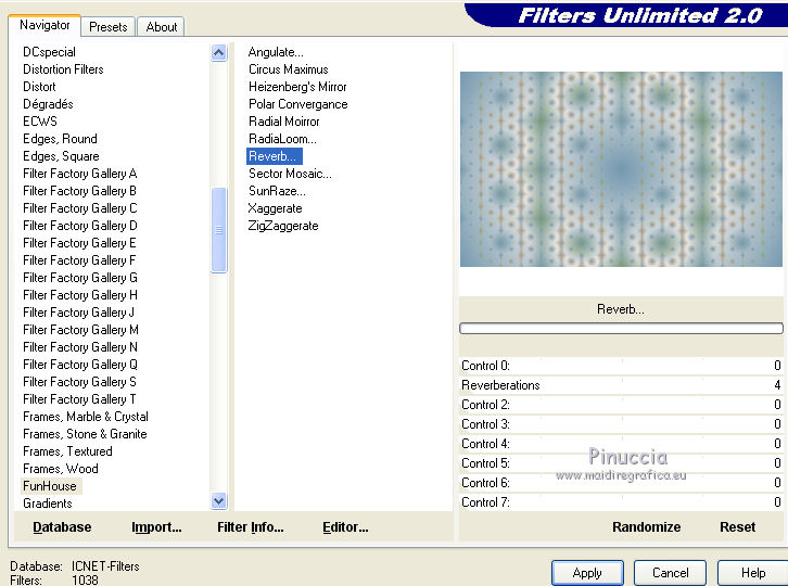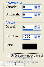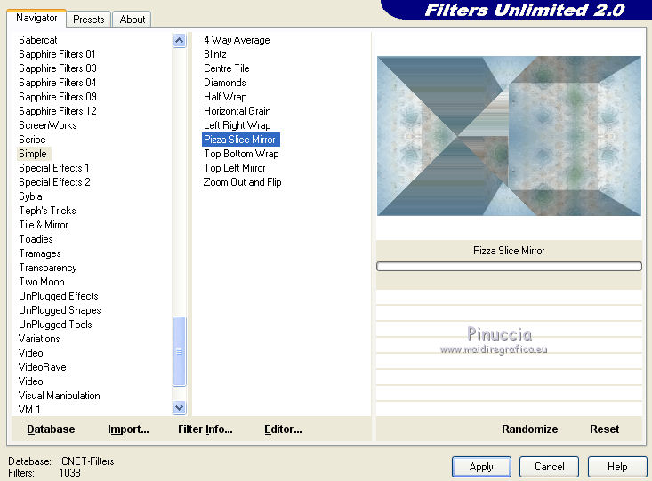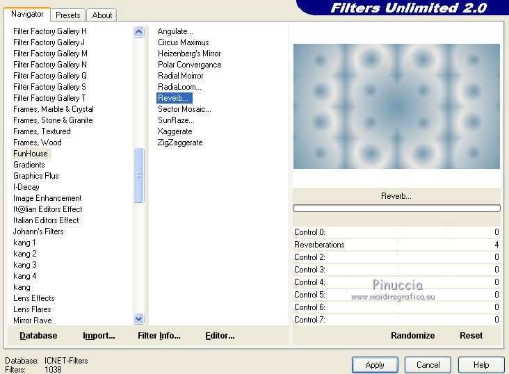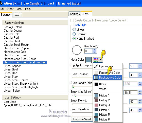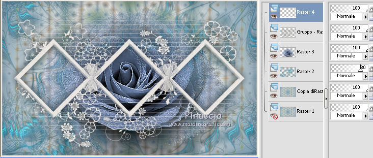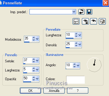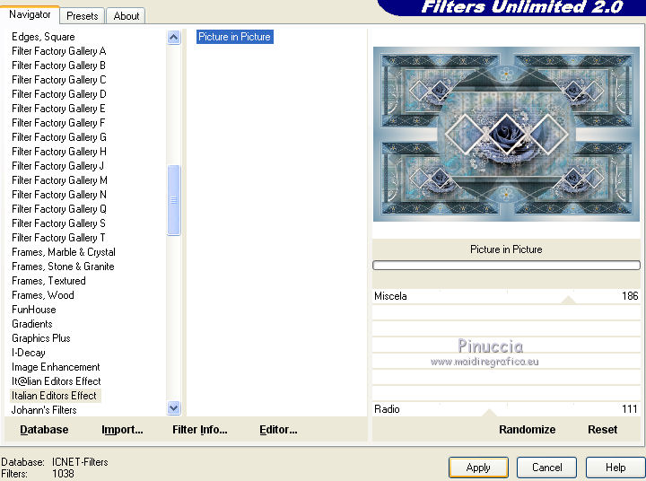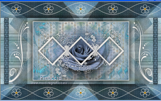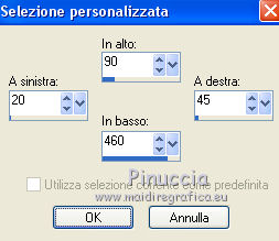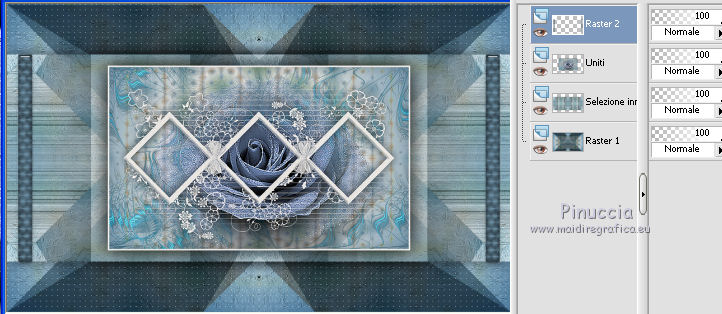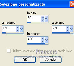 qui puoi trovare qualche risposta ai tuoi dubbi. Se l'argomento che ti interessa non è presente, ti prego di segnalarmelo. Questo tutorial è stato creato con CorelX5, ma può essere realizzato anche con le altre versioni di PSP. Dalla versione X4, il comando Immagine>Rifletti è stato sostituito con Immagine>Capovolgi in orizzontale, e il comando Immagine>Capovolgi con Immagine>Capovolgi in verticale. Nelle versioni X5 e X6, le funzioni sono state migliorate rendendo disponibile il menu Oggetti. Vedi la scheda sull'argomento qui Per tradurre questo tutorial ho usato PSP X. Occorrente: Il mist di un fiore a scelta. Il resto del materiale qui Filtri: se hai problemi con i filtri, consulta la mia sezione filtri qui Filters Unlimited 2.0 qui Funhouse - Reverb qui Toadies - Sucking Toad Bevel I qui Simple - Pizza Slice Mirror qui Alien Skin Eye Candy 5 Impact - Brushed Metal, Glass qui AP Lines - Lines SilverLining qui Italian Editors Effect - Picture in Picture qui AAA Frames - Foto Frame qui I filtri Simple, Toadies, Italian Editors e Toadies si possono usare da soli o importati in Filters Unlimited. come fare vedi qui) Se un filtro fornito appare con questa icona ![]() se stai usando altri colori, sei libero di sperimentare le modalità di miscelatura più adatte Apri la maschera in PSP e minimizzala con il resto del materiale. 1. Imposta il colore di primo piano con #eeeae5, e il colore di sfondo con #759ab0. ![]() Passa il colore di primo piano a Gradiente di primo piano/sfondo, stile Sprazzo di luce. ![]() 2. Apri una nuova immagine trasparente 900 x 550 pixels ![]() Riempi l'immagine trasparente con il gradiente.3. Livelli>Duplica. Effetti>Plugins>Filters Unlimited 2.0 - Funhouse - Reverb, con i settaggi standard. ![]() Cambia la modalità di miscelatura di questo livello in Luminanza. Livelli>Unisci>Unisci giù. 4. Di nuovo Effetti>Plugins>Filters Unlimited 2.0 - Funhouse - Reverb, con i settaggi standard. ![]() Livelli>Duplica. Regola>Messa a fuoco>Accentua messa a fuoco. 5. Apri il frattale apophysis-15-bd-5-12-13, e vai a Modifica>Copia. Torna al tuo lavoro e vai a Modifica>Incolla come nuovo livello. Se stai usando altri colori, colorizza il frattale in base a questi colori (sul Viraggio vedi qui). 6. Effetti>Effetti di immagine>Motivo unico. ![]() Abbassa l'opacità di questo livello all'80%. 7. Apri il tuo tube del fiore, e vai a Modifica>Copia. Torna al tuo lavoro e vai a Modifica>Incolla come nuovo livello. Immagine>Ridimensiona, se e quanto necessario, tutti i livelli non selezionato. Posiziona il tube al centro.Regola>Messa a fuoco>Accentua messa a fuoco. 8. Livelli>Nuovo livello raster. Riporta il colore di primo piano a Colore, e riempi il livello con il colore di primo piano #eeeae5.9. Livelli>Nuovo livello maschera>Da immagine. Apri il menu sotto la finestra di origine e vedrai la lista dei files aperti. Seleziona la maschera masque Flora, con i seguenti settaggi. ![]() Regola>Messa a fuoco>Accentua messa a fuoco. Livelli>Unisci>Unisci gruppo. 10. Immagine>Ridimensiona, al 90%, tutti i livelli non selezionato. Effetti>Effetti 3D>Sfalsa ombra, colore nero. ![]() 11. Livelli>Nuovo livello raster - Raster 4. Selezione>Seleziona tutto. Selezione>Modifica>Contrai - 4 pixels. Selezione>Inverti. Riempi con il colore di primo piano #eeeae5 (se necessario, per vedere meglio, attiva lo zoom .Effetti>Effetti 3D>Sfalsa ombra, colore nero. ![]() Selezione>Deseleziona. 12. Chiudi il livello di sfondo (raster 1), rimanendo posizionato sul livello superiore. ![]() Livelli>Unisci>Unisci visibile. 13. Chiudi questo livello Uniti. Riapri e attiva il livello inferiore Raster 1. ![]() Effetti>Effetti tecniche di disegno>Pennellate - colore bianco. ![]() Regola>Messa a fuoco>Metti a fuoco. 14. Effetti>Plugins>Filters Unlimited 2.0 - Toadies - Sucking Toad Bevel I. ![]() 15. Effetti>Plugins>Filters Unlimited 2.0 - Simple - Pizza Slice Mirror. ![]() Livelli>Duplica. Immagine>Rifletti. Cambia la modalità di miscelatura di questo livello in Moltiplica. Livelli>Unisci>Unisci giù. 16. Attiva lo strumento Selezione ![]() clicca sull'icona Selezione personalizzata ![]() e imposta i seguenti settaggi. ![]() Effetti>Effetti 3D>Sfalsa ombra, colore nero. ![]() Selezione>Innalza selezione a livello. Selezione>Deseleziona. 17. Effetti>Effetti di immagine>Motivo unico, preset Fianco a fianco (o copia i settaggi che vedi nella schermata). ![]() Cambia la modalità di miscelatura di questo livello in Moltiplica. Livelli>Duplica. Immagine>Capovolgi. Cambia la modalità di miscelatura di questo livello in Filtra. Livelli>Unisci>Unisci giù. Riporta la modalità di miscelatura di questo livello a Normale. 18. Effetti>Plugins>Filters Unlimited 2.0 - Tile & Mirror - Mirror (horizontal). ![]() Effetti>Effetti 3D>Sfalsa ombra, colore nero. ![]() 19. Attiva il livello sottostante - raster 1. Effetti>Plugins>AP [Lines] - Lines SilverLining. ![]() 20. Riapri e attiva il livello superiore Uniti. Immagine>Ridimensiona, al 60%, tutti i livelli non selezionato. Regola>Messa a fuoco>Metti a fuoco. Effetti>Effetti 3D>Sfalsa ombra, colore nero. ![]() 21. Livelli>Nuovo livello raster - Raster 2. Selezione personalizzata ![]() ![]() Riempi la selezione con il colore di sfondo #759ab0.22. Effetti>Plugins>Alien Skin Eye Candy 5 Impact - Brushed Metal. Settings: Handbrushed Steel, Small Brushes Basic: imposta Metal Color con il tuo colore di sfondo. ![]() 23. Effetti>Plugins>Alien Skin Eye Candy 5 Impact - Glass. Seleziona il preset Clear e ok. ![]() Selezione>Deseleziona. Livelli>Duplica. Immagine>Rifletti. Livelli>Unisci>Unisci giù. Dovresti avere questo. ![]() 24. Apri déco 1, e vai a Modifica>Copia. Torna al tuo lavoro e vai a Modifica>Incolla come nuovo livello. Se stai usando altri colori, colorizza l'elemento con il tuo colore chiaro. 25. Apri déco 2, e vai a Modifica>Copia. Torna al tuo lavoro e vai a Modifica>Incolla come nuovo livello. Effetti>Effetti di immagine>Scostamento. ![]() Livelli>Duplica. Immagine>Capov