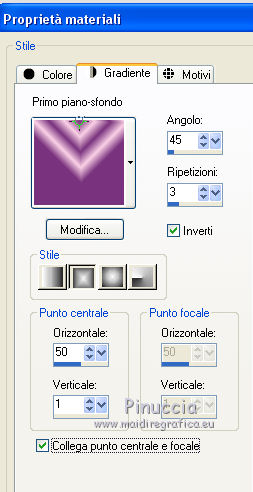 qui puoi trovare qualche risposta ai tuoi dubbi. Se l'argomento che ti interessa non è presente, ti prego di segnalarmelo. Questo tutorial è stato creato con CorelX5, ma può essere realizzato anche con le altre versioni di PSP. Dalla versione X4, il comando Immagine>Rifletti è stato sostituito con Immagine>Capovolgi in orizzontale, e il comando Immagine>Capovolgi con Immagine>Capovolgi in verticale. Nelle versioni X5 e X6, le funzioni sono state migliorate rendendo disponibile il menu Oggetti. Vedi la scheda sull'argomento qui Per tradurre questo tutorial ho usato PSP X. Occorrente: Materiale qui Filtri: se hai problemi con i filtri, consulta la mia sezione filtri qui Filters Unlimited 2.0 qui VM Natural - Sparkle qui Filter Factory Gallery A - Kaleidoscope II qui Simple - Centre Tile qui &<Bkg Designer sf10I - Balloons (da importare in Unlimited) qui Alien Skin Eye Candy 5 Impact - Glass qui I filtri Simple, Factory Gallery e VM Natural si possono usare da soli o importati in Filters Unlimited. come fare vedi qui) Se un filtro fornito appare con questa icona ![]() se stai usando altri colori, sei libero di sperimentare le modalità di miscelatura più adatte Metti il pennello nella cartella Pennelli. Attenzione, il pennello è composto da due files che non devono essere separati. Vedi gli appunti sui pennelli qui Metti la forma "Forme 1 Lily" nella cartella Forme predefinite. Metti le selezioni nella cartella Selezioni. Apri la maschera in PSP e minimizzala con il resto del materiale. 1. Imposta il colore di primo piano con #fad0e6, e il colore di sfondo con #79337d. ![]() Passa il colore di primo piano a Gradiente di primo piano/sfondo, stile Rettangolare. ![]() 2. Apri una nuova immagine trasparente 900 x 550 pixels, ![]() e riempila con il gradiente.3. Livelli>Duplica. Immagine>Rifletti. Immagine>Capovolgi. Abbassa l'opacità di questo livello al 50%. Livelli>Unisci>Unisci giù. 4. Effetti>Plugins>Filter Factory Gallery A - Kaleidoscope II. ![]() 5. Effetti>Effetti di riflesso>Fuga di specchi. ![]() 6. Livelli>Duplica. Immagine>Rifletti. Abbassa l'opacità di questo livello al 50%. Livelli>Unisci>Unisci giù. 7. Effetti>Plugins>Filters Unlimited 2.0 - Simple - Centre Tile. ![]() Livelli>Duplica. Effetti>Plugins>Filters Unlimited 2.0 - &<Background Designers sf10I> - Balloons. ![]() Cambia la modalità di miscelatura di questo livello in Luce diffusa, e abbassa l'opacità al 60%. ![]() 8. Livelli>Nuovo livello raster. Riporta il colore di primo piano al colore chiaro #fad0e6. ![]() Abbassa l'opacità dello strumento Riempimento a 50 ![]() Riempi il livello con il colore di primo piano.9. Livelli>Nuovo livello maschera>Da immagine. Apri il menu sotto la finestra di origine e vedrai la lista dei files aperti. Seleziona la maschera Narah_mask_0578, con i seguenti settaggi. ![]() Livelli>Unisci>Unisci gruppo. 10. Attiva il livello inferiore Raster 1. ![]() Selezione>Carica/Salva selezione>Carica selezione da disco. Cerca e Carica la selezione justine_sélection 1. ![]() Selezione>Innalza selezione a livello. Livelli>Disponi>Porta in alto. Effetti>Effetti 3D>Sfalsa ombra, colore nero. ![]() Selezione>Deseleziona. 11. Attiva nuovamente il livello Raster 1. Effetti>Plugins>VM Natural - Sparkle. ![]() 12. Attiva il livello soprastante (copia di raster 1). ![]() Livelli>Nuovo livello raster. Selezione>Carica/Salva selezione>Carica selezione da disco. Cerca e Carica la selezione justine_sélection 2. ![]() Riporta l'opacità dello strumento Riempimento a 100 ![]() e riempi la selezione con il colore chiaro #fad0e6.13. Effetti>Effetti di trama>Intessitura - colore di sfondo #79337d. ![]() Abbassa l'opacità di questo livello al 70%. ![]() Selezione>Deseleziona. 14. Sempre posizionato sul ivello Raster 2: Selezione>Carica/Salva selezione>Carica selezione da disco. Cerca e Carica la selezione justine_sélection 3. ![]() Premi sulla tastiera il tasto CANC ![]() Mantieni selezionato. ![]() 15. Livelli>Nuovo livello raster (raster 3) Effetti>Effetti 3D>Ritaglio, colore nero. ![]() Livelli>Nuovo livello raster (raster 4) Ripeti l'Effetto Ritaglio, cambiando verticale e orizzontale con -5. ![]() Livelli>Unisci>Unisci giù. Livelli>Disponi>Sposta giù. Selezione>Deseleziona. 16. Attiva il livello soprastante (raster 2). ![]() Effetti>Effetti 3D>Sfalsa ombra, colore nero. ![]() 17. Attiva il livello superiore. Imposta il colore di primo piano con il colore bianco #ffffff. ![]() Livelli>Nuovo livello raster (raster 4). Selezione>Carica/Salva selezione>Carica selezione da disco. Cerca e Carica la selezione justine_sélection 4. ![]() Riempi la selezione con il colore bianco.18. Selezione>Modifica>Contrai - 15 pixels. ![]() Premi sulla tastiera il tasto CANC. Mantieni selezionato. 19. Livelli>Nuovo livello raster (raster 5). Attiva lo strumento Pennello ![]() cerca e seleziona il pennello brush flower, larghezza 170 ![]() Applicalo sulle due selezioni cliccando con il tasto sinistro del mouse, per usare il colore bianco di primo piano. ![]() ![]() Regola>Messa a fuoco>Accentua messa a fuoco. Mantieni ancora selezionato. 20. Effetti>Plugins>Alien Skin Eye Candy 5 Impact - Glass. Seleziona il preset Clear e ok. ![]() Effetti>Effetti 3D>Sfalsa ombra, colore nero. ![]() Livelli>Unisci>Unisci giù. Selezione>Deseleziona. Effetti>Effetti 3D>Sfalsa ombra, colore nero. ![]() Dovresti avere questo. ![]() Livelli>Unisci>Unisci visibile. 21. Apri il tube déco oiseaux e vai a Modifica>Copia. Torna al tuo lavoro e vai a Modifica>Incolla come nuovo livello. Effetti>Effetti di immagine>Scostamento. ![]() Cambia la modalità di miscelatura di questo livello in Luminanza (Esistente). ![]() 22. Attiva lo strumento Forme predefinite ![]() Cerca e seleziona la forma Trinkets JL questo è il nome che assumerà la forma una volta inserita nei Percorsi Files. Per facilitare l'identificazione della forma, l'ho lasciata nella cartella del materiale, inserendo questa cartella nei Percorsi (che toglierò quando non mi servirà p