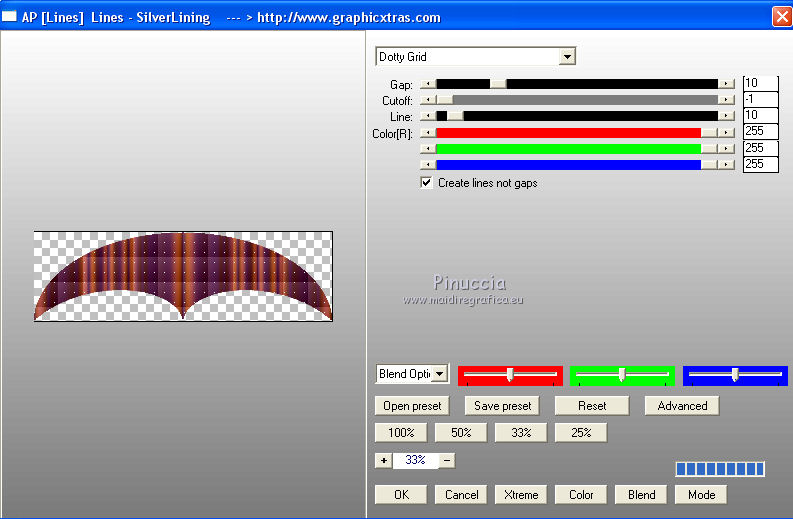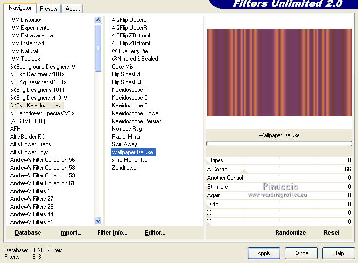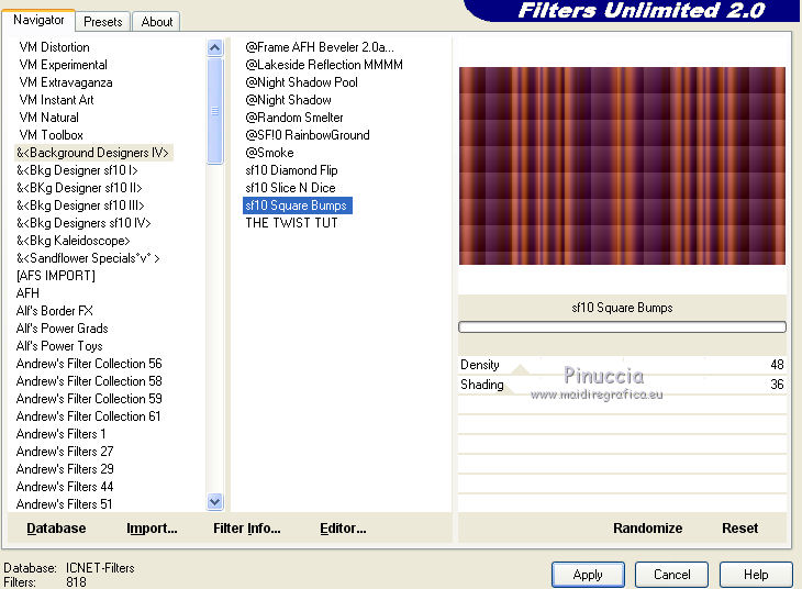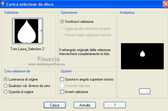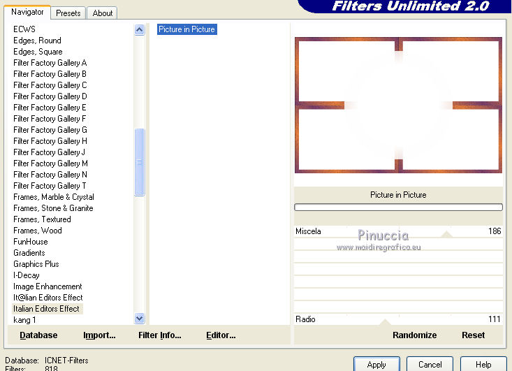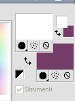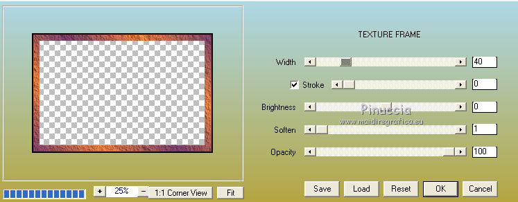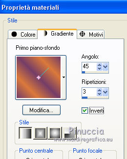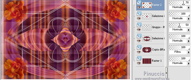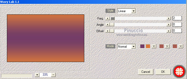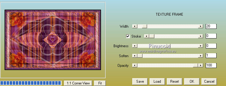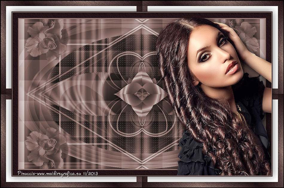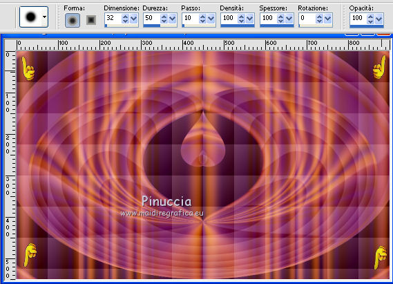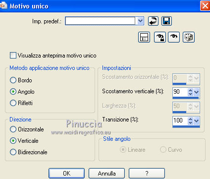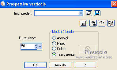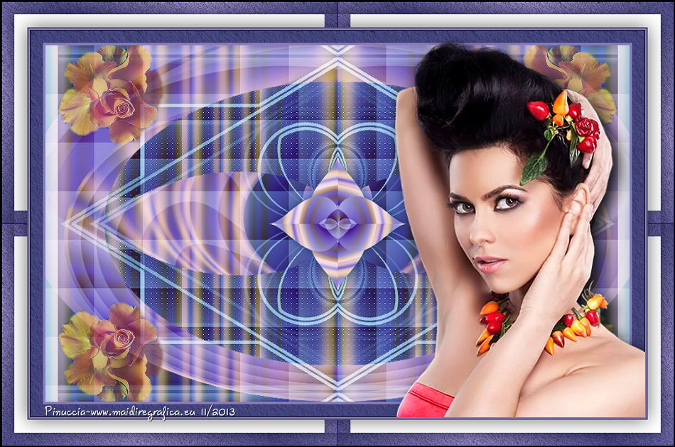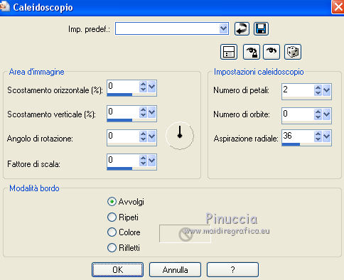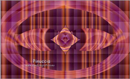qui puoi trovare qualche risposta ai tuoi dubbi. Se l'argomento che ti interessa non è presente, ti prego di segnalarmelo. Per tradurre questo tutorial ho usato PSP X. Occorrente: Materiale qui Filtri: se hai problemi con i filtri, consulta la mia sezione filtri qui Filters Unlimited 2.0 qui Italian Editors - Picture in Picture qui AAA Frames - Texture Frame qui &<Bkg Kaleidoscope - Wallpaper Deluxe (da importare in Unlimited) qui &<Background Designers IV - sf10 Square Bumps (da importare in Unlimited) qui Mehdi - Wavy lab 1.1 qui AP Lines - Lines SilverLining qui Alien Skin Eye Candy 5 Impact - Perspective Shadow qui I filtri Italian Editors si possono usare da soli o importati in Filters Unlimited. come fare vedi qui) Se un filtro fornito appare con questa icona ![]() se stai usando altri colori, sei libero di sperimentare le modalità di miscelatura più adatte Metti le selezioni nella cartella Selezioni. Apri la maschera in PSP e minimizzala con il resto del materiale. Per realizzare questo tutorial servono 2 colori, non troppo chiari, perchè altrimenti il risultato degli effetti potrebbe non riuscire. 1. Imposta il colore di primo piano con il colore db793b, e il colore di sfondo con il colore #743d67. ![]() 1. Apri una nuova immagine trasparente 900 x 550 pixels ![]() Effetti>Plugins>Mehdi - Wavy lab 1.1 questo filtro lavora con i colori impostati nella paletta dei materiali. Il primo è il colore di sfondo, il secondo quello di primo piano. Mantieni gli ultimi due colori creati dal filtro. ![]() 2. Effetti>Plugins>Filters Unlimited 2.0 - &<Bkg Kaleidoscope> - Wallpaper Deluxe, con i settaggi standard. ![]() 3. Effetti>Plugins>Filters Unlimited 2.0 - &<Background Designers> - sf10 Square Bumps, con i settaggi standard. ![]() 4. Livelli>Duplica. Effetti>Effetti geometrici>Prospettiva verticale. ![]() Cambia la modalità di miscelatura di questo livello in Filtra. 5. Effetti>Effetti di distorsione>Coordinate polari. ![]() Modifica>Ripeti Coordinate polari. 6. Attiva lo strumento Gomma , con i seguenti settaggie cancella le tracce dell'effetto sugli angoli dell'immagine. ![]() 7. Attiva nuovamente il livello inferiore - Raster 1. Selezione>Carica/Salva selezione>Carica selezione da disco. Cerca e carica la selezione Tuto Laura_Selection 1. ![]() Selezione>Innalza selezione a livello. Livelli>Disponi>Porta in alto. 8. Effetti>Plugins>AP [Lines] - Lines SilverLining. ![]() Selezione>Deseleziona. Livelli>Duplica. Immagine>Capovolgi. Livelli>Unisci>Unisci giù. Immagine>Ridimensiona, all'80%, tutti i livelli non selezionato. 9. Attiva il livello copia di Raster 1. Selezione>Carica/Salva selezione>Carica selezione da disco. Cerca e carica la selezione Tuto Laura_Selection 2. ![]() Selezione>Innalza selezione a livello. Livelli>Disponi>Porta in alto. Selezione>Deseleziona. 10. Livelli>Duplica. Immagine>Capovolgi. Livelli>Unisci>Unisci giù. Ancora Livelli>Duplica. Immagine>Ruota per gradi - 90 gradi a destra. ![]() Livelli>Unisci>Unisci giù. Immagine>Ridimensiona, all'80%, tutti i livelli non selezionato. Livelli>Duplica, e cambia la modalità di miscelatura di questo livello in Filtra. Livelli>Unisci>Unisci giù. Effetti>Effetti 3D>Sfalsa ombra, colore nero. ![]() In questo momento dovresti avere questo. ![]() 11. Imposta il colore di primo piano con il colore bianco. ![]() Livelli>Nuovo livello raster. Riempi il livello con il colore bianco.Livelli>Nuovo livello maschera>Da immagine. Apri il menu sotto la finestra di origine e vedrai la lista dei files aperti. Seleziona la maschera mask_narah_55, con i seguenti settaggi. ![]() Livelli>Unisci>Unisci gruppo. Regola>Messa a fuoco>Metti a fuoco. 12. Effetti>Effetti di immagine>Motivo unico. ![]() 13. Effetti>Effetti di riflesso>Caleidoscopio. ![]() Abbassa l'opacità di questo livello al 50%. Regola>Messa a fuoco>Metti a fuoco. Effetti>Effetti 3D>Sfalsa ombra, con i settaggi precedenti. ![]() Livelli>Disponi>Sposta giù. 14. Attiva il livello superiore. Apri il tube del fiore e vai a Modifica>Copia. Torna al tuo lavoro e vai a Modifica>Incolla come nuovo livello. Immagine>Ridimensiona, al 50%, tutti i livelli non selezionato. Spostalo nell'angolo in basso a destra.Livelli>Duplica. Immagine>Rifletti. Livelli>Unisci>Unisci giù. Livelli>Duplica. Immagine>Capovolgi. Livelli>Unisci>Unisci giù. Regola>Messa a fuoco>Metti a fuoco. Abbassa l'opacità di questo livello al 70%. ![]() Livelli>Unisci>Unisci tutto. 15. Immagine>Aggiungi bordatura, 4 pixels, simmetriche, con il colore di primo piano #db793b. Immagine>Aggiungi bordatura, 20 pixels, simmetriche, con il colore di sfondo #743d67 Attiva lo strumento Bacchetta magica ![]() ![]() e clicca nel bordo da 20 pixels per selezionarlo. 16. Effetti>Plugins>AAA Frames - Texture Frame, width a 20 ![]() Selezione>Deseleziona. 17. Apri il tube della donna e vai a Modifica>Copia. Torna al tuo lavoro e vai a Modifica>Incolla come nuovo livello. Immagine>Ridimensiona, al 95%, tutti i livelli non selezionato. Spostalo a destra.Regola>Messa a fuoco>Metti a fuoco. Effetti>Plugins>Alien Skin Eye Candy 5 Impact - Perspective Shadow, seleziona il preset Drop Shadow Blurry e ok. ![]() 18. Riporta il colore di primo piano al colore iniziale #db793b. Passa il colore di primo piano a Gradiente, stile Lineare. ![]() Immagine>Aggiungi bordatura, 2 pixels, simmetriche, con il colore di primo piano #db793b. Immagine>Aggiungi bordatura, 2 pixels, simmetriche, con il colore di sfondo #743d67 Selezione>Seleziona tutto. Immagine>Aggiungi bordatura, 40 pixels, simmetriche, con il colore bianco #ffffff. Selezione>Inverti. Livelli>Nuovo livello raster. Riempi con il gradiente.19. Effetti>Plugins>AAA Frames - Texture Frame, width a 40. ![]() 20. Per usare il prossimo Filtro, il cui risultato è influenzato dal colore di sfondo, imposta il colore di sfondo con il colore bianco. Effetti>Plugins>Filters Unlimited 2.0 - Italian Editors Effect - Picture in Picture, con i settaggi standard. ![]() 21. Selezione>Inverti. Effetti>Effet