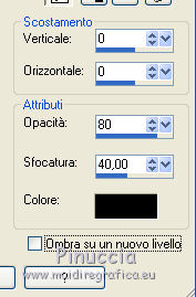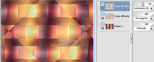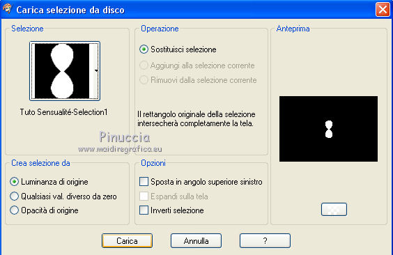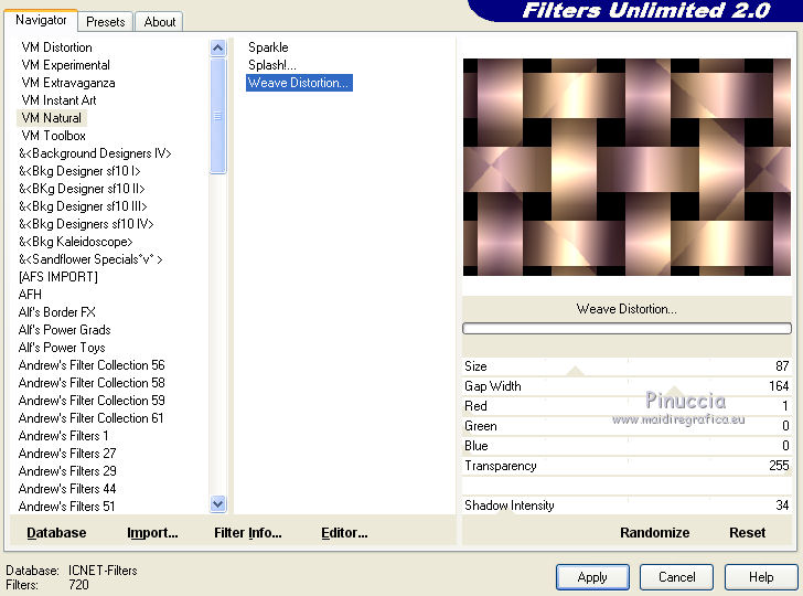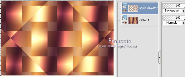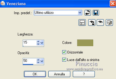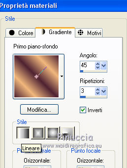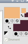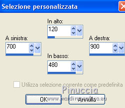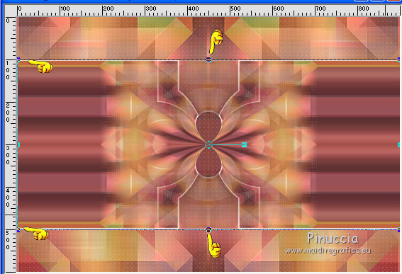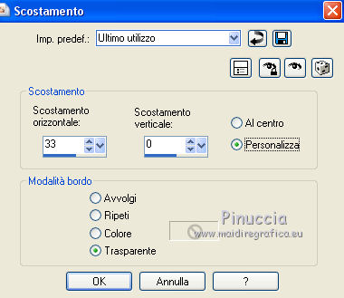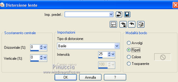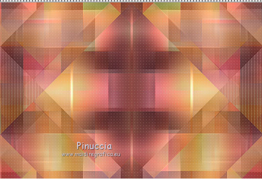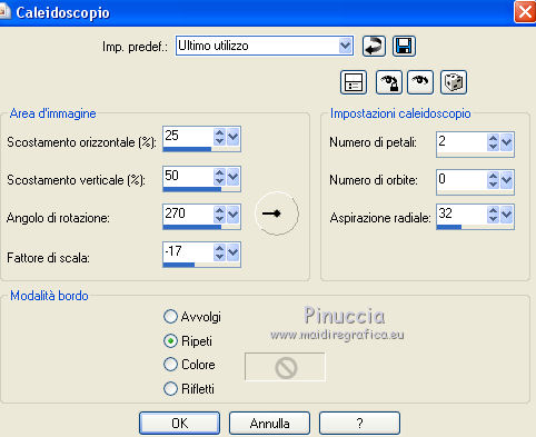 qui puoi trovare qualche risposta ai tuoi dubbi. Se l'argomento che ti interessa non è presente, ti prego di segnalarmelo. Per tradurre questo tutorial ho usato PSP X. Occorrente: Materiale qui Filtri: se hai problemi con i filtri, consulta la mia sezione filtri qui Filters Unlimited 2.0 qui Simple - Diamonds, Blintz, Half Wrap qui Transparency - Eliminate Black qui AP Lines - Lines SilverLining qui AAA Frames - Foto Frame qui VM Natural qui Two Moon qui Alien Skin Eye Candy 5 Impact - Glass qui I filtri Simple, VM Natural, Transparency e Two Moon si possono usare da soli o importati in Filters Unlimited. come fare vedi qui) Se un filtro fornito appare con questa icona ![]() se stai usando altri colori, sei libero di sperimentare le modalità di miscelatura più adatte Metti le selezioni nella cartella Selezioni. Per realizzare questo tutorial servono un colore chiaro, un colore scuro e un colore medio. 1. Imposta il colore di primo piano con il colore chiaro #f1b77c, e il colore di sfondo con il colore scuro #4e2233. ![]() Passa il colore di primo piano a Gradiente, stile Lineare. ![]() Apri una nuova immagine trasparente 900 x 600 pixels, e riempila con il gradiente.3. Regola>Sfocatura>Sfocatura gaussiana - raggio 15. ![]() 4. Effetti>Plugins>Simple - Diamonds. 5. Livelli>Duplica. Effetti>Plugins>Filters Unlimited 2.0 - VM Natural - Weave Distorsion, con i settaggi standard. ![]() 6. Effetti>Plugins>Transparency - Eliminate Black. Cambia la modalità di miscelatura di questo livello in Sovrapponi. ![]() 7. Livelli>Duplica. Effetti>Effetti di distorsione>Distorsione lente. ![]() Immagine>Rifletti. Cambia la modalità di miscelatura di questo livello in Luminanza (Esistente), e abbassa l'opacità al 50%. ![]() 8. Attiva il livello inferiore - Raster 1. Effetti>Plugins>Simple - Half Wrap. Effetti>Plugins>AP Lines - Lines SilverLining. ![]() 9. Livelli>Unisci>Unisci visibile. Effetti>Plugins>Simple - Blintz. Livelli>Duplica. Immagine>Rifletti. Abbassa l'opacità di questo livello al 50%. 10. Livelli>Unisci>Unisci visibile. Livelli>Duplica. Immagine>Capovolgi. Cambia la modalità di miscelatura di questo livello in Luminanza (esistente), e abbassa l'opacità al 50%. Livelli>Unisci>Unisci visibile. Regola>Messa a fuoco>Accentua messa a fuoco. Dovresti avere questo: ![]() 11. Livelli>Duplica. Immagine>Ridimensiona, al 60%, tutti i livelli non selezionato. Selezione>Seleziona tutto. Selezione>Mobile. Selezione>Immobilizza. Selezione>Modifica>Seleziona bordature selezione. ![]() Imposta il colore di primo piano con il colore bianco #ffffff. ![]() Imposta la modalità di corrispondenza dello strumento Riempimento in Nessuno ![]() Riempi la selezione con il colore bianco.Selezione>Deseleziona. 12. Effetti>Effetti di immagine>Motivo unico - preset Fianco a fianco, (è lo stesso se trascrivi i settaggi che vedi nella schermata). ![]() 13. Effetti>Effetti di riflesso>Caleidoscopio. ![]() 14. Premi il tasto K per attivare lo strumento Puntatore ![]() se stai usando PSP 9 il tasto D (valido per tutte le versioni) per attivare lo strumento Deformazione ![]() in modalità Scala, spingi il nodo superiore centrale verso il basso fino a 100 pixels, e il nodo inferiore centrale verso l'alto fino a 500 pixels (se non visualizzi i Righelli, vai a Visualizza>Righelli) ![]() Premi il tasto M per deselezionare lo strumento. 15. Selezione>Carica/Salva selezione>Carica selezione da disco. Cerca e carica la selezione Tuto Sensualité-Selection1. ![]() Premi sulla tastiera il tasto CANC ![]() Selezione>Deseleziona. 16. Attiva lo strumento Selezione ![]() clicca sull'icona Selezione personalizzata ![]() e imposta i seguenti settaggi. ![]() Selezione>Innalza selezione a livello. 17. Effetti>Effetti di trama>Veneziana - colore #999955. ![]() Mantieni selezionato. 18. Effetti>Plugins>Filters Unlimited 2.0 - Two Moon - RotoBlades per aumentare il colore verde del lavoro ho impostato Green a 255. Se stai usando altri colori, sperimenta i settaggi delle ultime tre linee ![]() Selezione>Deseleziona. 19. Immagine>Ridimensiona, al 90%, tutti i livelli non selezionato. Effetti>Effetti di immagine>Scostamento. ![]() Regola>Messa a fuoco>Metti a fuoco. 20. Livelli>Duplica. Immagine>Rifletti. Livelli>Unisci>Unisci giù. Selezione>Seleziona tutto. Selezione>Mobile. Selezione>Immobilizza. Selezione>Modifica>Seleziona bordature selezione, con i settaggi precedenti. ![]() Riempi la selezione con il colore scuro di sfondo #4e2233.Selezione>Deseleziona. 21. Livelli>Nuovo livello raster. Selezione>Carica/Salva selezione>Carica selezione da disco. Cerca e carica la selezione Tuto Sensualité-Selection2. ![]() Riempi la selezione con il colore scuro.Effetti>Plugins>Alien Skin Eye Candy 5 Impact - Glass. Seleziona il preset Clear e ok. ![]() Selezione>Deseleziona. Livelli>Unisci>Unisci giù. Effetti>Effetti 3D>Sfalsa ombra, colore nero. ![]() 22. Apri il tube dei fiori e vai a Modifica>Copia. Torna al tuo lavoro e vai a Modifica>Incolla come nuovo livello. Posiziona il tube al centro.Immagine>Ridimensiona, se e quanto necessario, tutti i livelli non selezionato. Regola>Messa a fuoco>Metti a fuoco. Effetti>Plugins>Alien Skin Eye Candy 5 Impact - Glass. Seleziona il preset Clear e ok. ![]() Abbassa l'opacità di questo livello all'80%. 23. Apri il tube della donna e vai a Modifica>Copia. Torna al tuo lavoro e vai a Modifica>Incolla come nuovo livello. Regola>Messa a fuoco>Metti a fuoco. Posiziona il tube dove preferisci.Effetti>Effetti 3D>Sfalsa ombra, colore nero. ![]() Apri il tube di testo e vai a Modifica>Copia. Torna al tuo lavoro e vai a Modifica>Incolla come nuovo livello. Posiziona il testo dove preferisci,o vedi il mio esempio. 24. Immagine>Aggiungi bordatura, 3 pixels, simmetriche, con il colore scuro #4e2233. Immagine>Aggiungi bordatura, 3 pixels, simmetriche, con il colore verde #999955. Immagine>Aggiungi bordatura, 3 pixels, simmetriche, con il colore scuro #4e2233. 25. Selezione>Seleziona tutto. Immagine>Aggiungi bordatura, 30