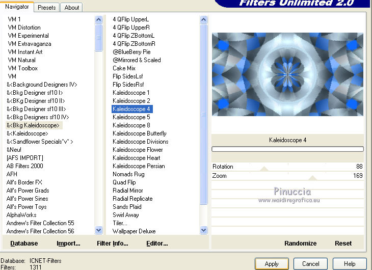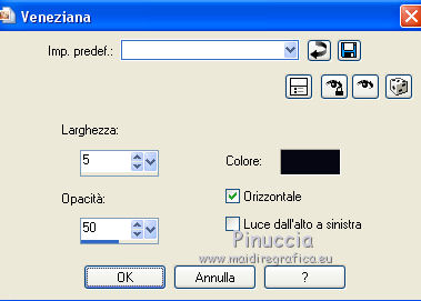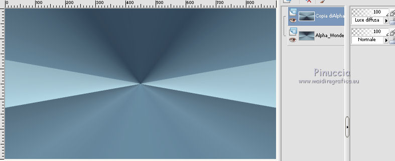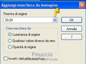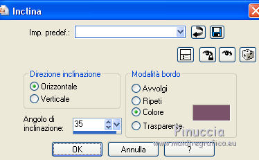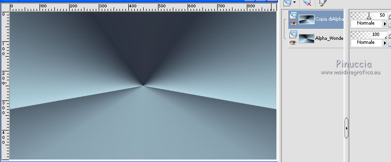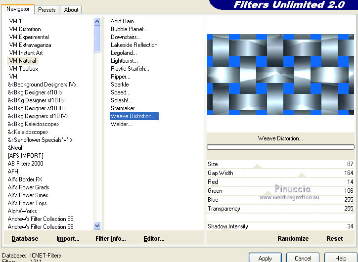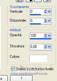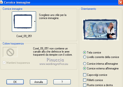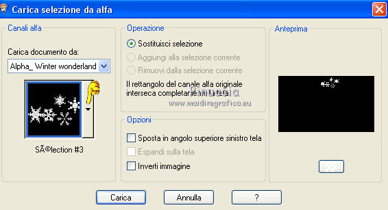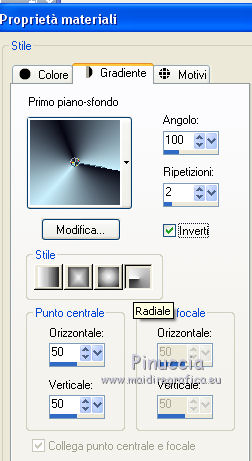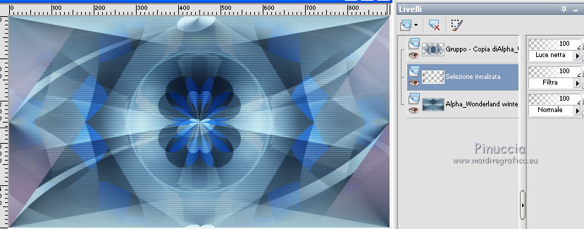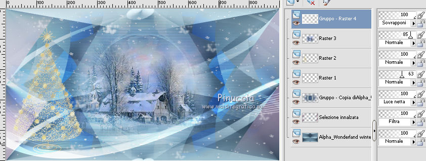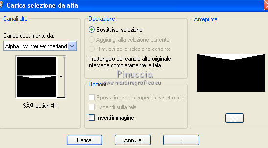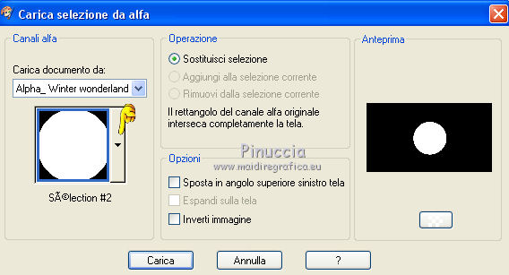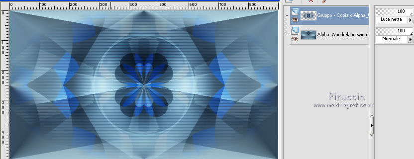 qui puoi trovare qualche risposta ai tuoi dubbi. Se l'argomento che ti interessa non è presente, ti prego di segnalarmelo. Questo tutorial è stato creato con CorelX9, ma può essere realizzato anche con le altre versioni di PSP. Dalla versione X4, il comando Immagine>Rifletti è stato sostituito con Immagine>Capovolgi in orizzontale, e il comando Immagine>Capovolgi con Immagine>Capovolgi in verticale. Nelle versioni X5 e X6, le funzioni sono state migliorate rendendo disponibile il menu Oggetti. Con la nuova versione X7 sono tornati i comandi Rifletti e Capovolgi, ma con nuove differenze. Vedi la scheda sull'argomento qui Per tradurre questo tutorial ho usato PSP X. Occorrente: Materiale qui Il wordart è di Kahlan. Il resto del materiale è di Lily. Filtri: se hai problemi con i filtri, consulta la mia sezione filtri qui Filters Unlimited 2.0 qui VM Natural - Weave Distortion qui &<Bkg Kaleidoscope> - Kaleidoscope 4 (da importare in Unlimited) qui Alien Skin Eye Candy 5 Impact - Glass qui I filtri VM Natural si possono usare da soli o importati in Filters Unlimited. come fare vedi qui) Se un filtro fornito appare con questa icona ![]() Se stai usando altri colori, non esitare a sperimentare le modalità di miscelatura e le opacità dei livelli più adatte. Nelle ultime versioni di PSP non c'è il gradiente di primo piano/sfondo (Corel_06_029) Trovi i gradienti delle versioni precedenti qui Metti la cornice-immagine nella cartella Cornici-immagine. Apri le maschere in PSP e minimizzale con il resto del materiale. Colori utilizzati ![]() 1. Imposta il colore di primo piano con #caf0fe, e il colore di sfondo con #080814. ![]() Passa il colore di primo piano a Gradiente di primo piano/sfondo, stile Radiale. ![]() 2. Apri Alpha_winter_wonderland. Finestra>Duplica, o sulla tastiera maiuscola+D, per fare una copia. ![]() Chiudi l'originale. La copia, che sarà la base del tuo lavoro, non è vuota, ma contiene le selezioni salvate sul canale alfa. Riempi l'immagine trasparente con il gradiente.3. Livelli>Duplica. Immagine>Rifletti. 4. Abbassa l'opacità di questo livello al 50%. ![]() Livelli>Unisci>Unisci giù. 5. Livelli>Duplica. Immagine>Capovolgi. 6. Cambia la modalità di miscelatura di questo livello in Luce diffusa, opacità 100. ![]() Livelli>Unisci>Unisci giù. 7. Effetti>Effetti di immagine>Motivo unico, con i settaggi standard. ![]() 8. Livelli>Duplica. 9. Effetti>Plugins>Filters Unlimited 2.0 - VM Natural - Weave Distortion. ![]() se stai usando altri colori, adatta i settaggi Red Green e Blue in base ai tuoi colori 10. Effetti>Plugins>Filters Unlimited 2.0 - &<Bkg Kaleidoscope> - Kaleidoscope 4, con i settaggi standard. ![]() 11. Effetti>Effetti di trama>Veneziana, colore #080814. ![]() 12. Livelli>Nuovo livello maschera>Da immagine. Apri il menu sotto la finestra di origine e vedrai la lista dei files aperti. Seleziona la maschera 20-20 ![]() Livelli>Unisci>Unisci gruppo. 13. Cambia la modalità di miscelatura di questo livello in Luce netta, opacità 100. ![]() 14. Attiva il livello sottostante, Raster 1. Selezione>Carica/Salva selezione>Carica selezione da canale alfa. La selezione Sélection #1 è subito disponibile. Devi soltanto cliccare Carica. ![]() Selezione>Innalza selezione a livello. Selezione>Deseleziona. 15. Effetti>Effetti di distorsione>Coordinate polari. ![]() 16. Effetti>Effetti geometrici>Inclina, colore #7a526a. ![]() 17. Effetti>Effetti di immagine>Motivo unico. ![]() 18. Cambia la modalità di miscelatura di questo livello in Filtra, opacità 100. ![]() 19. Attiva nuovamente il livello superiore. Livelli>Nuovo livello raster - Raster 1. 20. Selezione>Seleziona tutto. Apri il tube Déco neige e vai a Modifica>Copia. Torna al tuo lavoro e vai a Modifica>Incolla nella selezione. Selezione>Deseleziona. 21. Regola>Messa a fuoco>Accentua messa a fuoco. Abbassa l'opacità di questo livello al 63%, modalità Normale. ![]() 22. Apri il tube clipart Sapin e vai a Modifica>Copia. Torna al tuo lavoro e vai a Modifica>Incolla come nuovo livello. 23. Immagine>Ridimensiona, al 48%, tutti i livelli non selezionato. Effetti>Effetti di immagine>Scostamento. ![]() Regola>Messa a fuoco>Metti a fuoco. 24. Apri il tube del paesaggio e vai a Modifica>Copia. (se usi il tube fornito non dimenticare di cancellare il watermark). Torna al tuo lavoro e vai a Modifica>Incolla come nuovo livello. 25. Immagine>Ridimensiona, al 70%, tutti i livelli non selezionato. Regola>Messa a fuoco>Metti a fuoco. Abbassa l'opacità di questo livello all'85%. 26. Livelli>Nuovo livello raster - Raster 4. Riempi con il colore bianco #ffffff.27. Livelli>Nuovo livello maschera>Da immagine. Apri il menu sotto la finestra di origine e seleziona la maschera Narah_mask_0296. ![]() Livelli>Unisci>Unisci gruppo. 28. Cambia la modalità di miscelatura di questo livello in Sovrapponi. ![]() 29. Attiva il terzo livello dal basso (il livello della prima maschera). 30. Selezione>Carica/Salva selezione>Carica selezione da canale alfa. Apri il menu delle selezioni e carica Sélection #2. ![]() 31. Selezione>Innalza selezione a livello. Livelli>Disponi>Porta in alto. Selezione>Deseleziona. 32. Immagine>Ridimensiona, al 20%, tutti i livelli non selezionato. 33. Effetti>Plugins>Alien Skin Eye Candy 5 Impact - Glass seleziona il preset Clear - Glass color #080814. ![]() 34. Effetti>Effetti di immagine>Scostamento. ![]() 35. Livelli>Duplica. Immagine>Ridimensiona, all'80%, tutti i livelli non selezionato. Posiziona ![]() 36. Livelli>Duplica. Immagine>Ridimensiona, all'80%, tutti i livelli non selezionato. Posiziona le immagini come nell'esempio![]() Assicurati di essere posizionato sul livello superiore. Livelli>Unisci>Unisci giù - 2 volte. 37. Regola>Messa a fuoco>Metti a fuoco. 38. Effetti>Effetti 3D>Sfalsa ombra, colore nero. ![]() 39. Apri il tube femme hiver by Lily, cancella la firma e vai a Modifica>Copia. Torna al tuo lavoro e vai a Modifica>Incolla come nuovo livello. Immagine>Ridimensiona, al 50%, tutti i livelli n