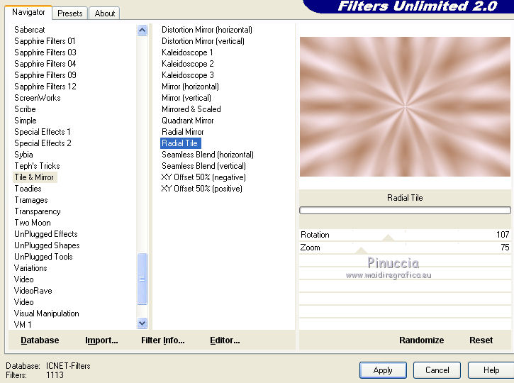 8. Effetti>Plugins>Filters Unlimited 2.0 - Tile & Mirror - Radial Tile.