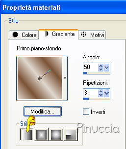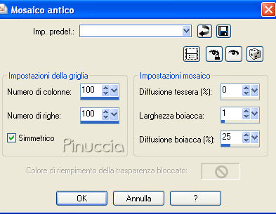 qui puoi trovare qualche risposta ai tuoi dubbi. Se l'argomento che ti interessa non è presente, ti prego di segnalarmelo. Questo tutorial è stato scritto in PSP XI, ma può essere eseguito anche con le altre versioni del programma. Per tradurlo, l'ho eseguito con PSP X. Occorrente: Materiale qui Apri tutto il materiale fornito e minimizzalo nella tua area di lavoro. Se vuoi usare uno dei tuoi tube, assicurati che sia un tube orizzontale, e, se non è sfumato, applica al tube la maschera 20-20. Scegli due colori dal tube. Io ho usato il colore chiaro #e0d7ce, e il colore scuro #7c5337. Passa il colore di primo piano a Gradiente di primo piano/sfondo, stile sprazzo di luce, con i seguenti settaggi: ![]() Apri una nuova immagine trasparente 600 x 450 pixels, e riempila con il colore scuro.ricorda che per riempire con il colore di sfondo devi cliccare con il tasto destro del mouse Livelli>Nuovo livello raster. Riempi il livello con il gradiente.Effetti>Effetti di bordo>Aumenta. Livelli>Duplica. Immagine>Rifletti. Abbassa l'opacità di questo livello al 50%. Attiva mistedL-bos01, e vai a Modifica>Copia. Torna al tuo lavoro e vai a Modifica>Incolla come nuovo livello. Sposta il tube a destra.Attiva il tube mistedL-46, e vai a Modifica>copia. Torna al tuo lavoro e vai a Modifica>Incolla come nuovo livello. Sposta il tube un po' più in alto, vedi il mio esempio.Attiva il tube misted-flowerL06, e vai a Modifica>Copia. Torna al tuo lavoro e vai a Modifica>Incolla come nuovo livello. Sposta il tube a sinistra, sotto la donna.![]() Livelli>Unisci>Unisci tutto. Cambia i settaggi del gradiente: ![]() Immagine>Aggiungi bordatura, 1 pixel, simmetriche, con il colore nero. Immagine>Aggiungi bordatura, 20 pixels, simmetriche, con il colore chiaro. Seleziona questo bordo con la bacchetta magica ![]() ![]() Riempi la selezione con il gradiente.Effetti>Effetti di trama>Mosaico antico: ![]() Selezione>Deseleziona. Immagine>Aggiungi bordatura, 1 pixel, simmetriche, con il colore nero. Attiva il tube con il testo e vai a Modifica>Copia. Torna al tuo lavoro e vai a Modifica>Incolla come nuovo livello. Se vuoi, puoi ruotare il testo. Oppure, puoi scegliere di aggiungere un testo a tua scelta. Aggiungi il tuo nome e/o il tuo watermark. Immagine>Ridimensiona, a 400 pixels di larghezza, se vuoi. ![]() Se hai problemi o dubbi, o trovi un link non funzionante, o anche soltanto per un saluto, scrivimi. 14 Novembre 2007 |