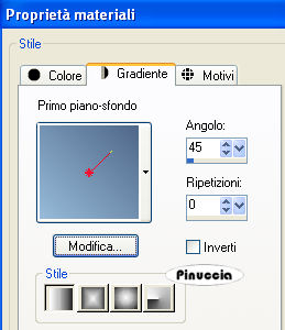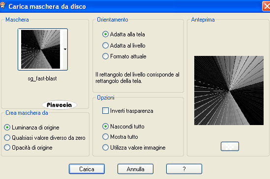 qui puoi trovare qualche risposta ai tuoi dubbi. Se l'argomento che ti interessa non è presente, ti prego di segnalarmelo. Questo tutorial è stato scritto in PSP XI, ma può essere eseguito anche con le altre versioni del programma. Per tradurlo, l'ho eseguito con PSP X. Occorrente: Materiale qui Metti la maschera nella cartella Maschere. Scegli due colori dai tuoi tubes o da quelli forniti. . Per il mio esempio ho impostato il colore di primo piano con il colore chiaro #97bbd9, e il colore di sfondo con il colore scuro #4f6789. Passa il colore di primo piano a Gradiente. ![]() Apri una nuova immagine trasparente 500 x 500 pixels, e riempila con il gradiente.Livelli>Nuovo livello raster. Riempi il livello con il colore scuro.Livelli>Carica/Salva maschera>Carica maschera da disco. Cerca e carica la maschera sg-fast-blast: ![]() Livelli>Unisci>Unisci gruppo. Livelli>Duplica. Livelli>Unisci>Unisci tutto. Attiva il livello di sfondo. Livelli>Duplica. Immagine>Ridimensiona, al 90%, tutti i livelli non selezionato. Non vedrai la differenza, ma non preoccuparti. Effetti>Effetti 3D>Ritaglio, con il colore nero: ![]() Apri il tube TubesL-40 e vai a Modifica>Copia. Torna al tuo lavoro e vai a Modifica>Incolla come nuovo livello. Sposta il tube a sinistra, come nel mio esempio.![]() Livelli>Duplica e attiva il livello sottostante (il tube originale). Effetti>Effetti di distorsione>Vento - da destra, intensità 100. ![]() Attiva il livello Copia di sfondo. Apri il tube cityL-01 e vai a Modifica>Copia. Torna al tuo lavoro e vai a Modifica>Incolla come nuovo livello. Apri il tube sailship5 e vai a Modifica>Copia. Torna al tuo lavoro e vai a Modifica>Incolla come nuovo livello. Immagine>Ridimensiona, all'80%,tutti i livelli non selezionato. Spostalo a destra.Cambia la modalità di miscelatura di questo livello in luminanza. Livelli>Unisci>Unisci tutto. Selezione>Seleziona tutto. Selezione>Modifica>Contrai - 2 pixels. Effetti>Effetti 3D>Scalpello, con il colore nero. ![]() Aggiungi un testo a tua scelta. Aggiungi il tuo nome e/o il tuo watermark e salva in formato jpg. ![]() Se hai problemi o dubbi, o trovi un link non funzionante, o anche soltanto per un saluto, scrivimi. 20 Novembre 2009 |