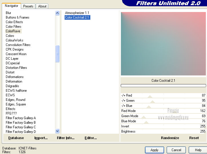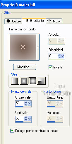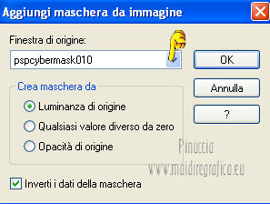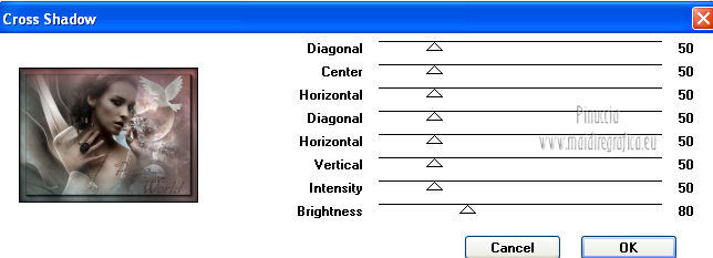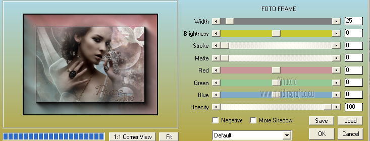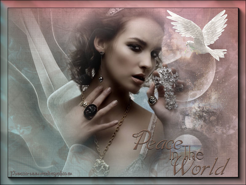 qui puoi trovare qualche risposta ai tuoi dubbi. Se l'argomento che ti interessa non è presente, ti prego di segnalarmelo. Questo tutorial è stato scritto in PSP X3, ma può essere eseguito anche con le altre versioni del programma. Per tradurlo, l'ho eseguito con PSP X. Occorrente: Materiale qui Il tube è di Lisa. Filtri: Filters Unlimited 2.0 qui Colorave qui Graphics Plus qui FM Tile Tools qui AAA Frames qui I filtri ColorRave e Graphics Plus si possono usare da soli o importati in Filters Unlimited ![]() Apri la maschera in PSP e minimizzala con il resto del materiale. Apri una nuova immagine trasparente 800 x 600 pixels. Imposta il colore di primo piano con #bfb5b1, e il colore di sfondo con #6f5548. Passa il colore di primo piano a Gradiente, stile Sprazzo di luce. ![]() Riempi l'immagine trasparente con il gradiente.Livelli>Nuovo livello raster. Selezione>Seleziona tutto. Apri "Paper 1a" e vai a Modifica>Copia. Torna al tuo lavoro e vai a Modifica>Incolla nella selezione. Cambia la modalità di miscelatura di questo livello in Luminanza (esistente). Selezione>Deseleziona. Livelli>Nuovo livello raster. Riempi con il colore scuro.Livelli>Nuovo livello maschera>Da immagine. Apri il menu sotto la finestra di origine e vedrai la lista dei files aperti. Seleziona la maschera pspcybermask010, con i seguenti settaggi: ![]() Livelli>Unisci>Unisci gruppo. Livelli>Duplica. Immagine>Rifletti. Livelli>Unisci>Unisci giù. Abbassa l'opacità di questo livello al 50%. Apri il tube "world" e vai a Modifica>Copia. Torna al tuo lavoro e vai a Modifica>Incolla come nuovo livello. Spostalo in alto a destra.Premi il tasto K per attivare lo strumento Puntatore ![]() se stai usando PSP 9 il tasto D (valido per tutte le versioni) per attivare lo strumento Deformazione ![]() In modalità Scala spingi il nodo centrale in basso per riempire l'altezza della tela. ![]() Abbassa l'opacità di questo livello al 50%. Apri il tube "kelk" e vai a Modifica>Copia. Torna al tuo lavoro e vai a Modifica>Incolla come nuovo livello. Spostalo a sinistra.Come hai fatto prima, allunga il tube fino al bordo inferiore. ![]() Abbassa l'opacità di questo livello al 50%. Apri il tube "misted-L130" e vai a Modifica>Copia. Torna al tuo lavoro e vai a Modifica>Incolla come nuovo livello. Lascialo come sta. Livelli>Duplica. Livelli>Unisci>Unisci giù. Apri il tube "GGdove1" e vai a Modifica>Copia. Torna al tuo lavoro e vai a Modifica>Incolla come nuovo livello. Spostalo in alto a destra, come nel mio esempio.Attiva il livello Raster 1. Effetti>Plugins>Filters Unlimited 2.0 - ColorRave - Color Cocktail 2.1. ![]() Apri il file di testo "peace" e vai a Modifica>Copia. Torna al tuo lavoro e vai a Modifica>Incolla come nuovo livello. Spostalo dove preferisci, o vedi il mio esempio.Effetti>Plugins>FM Tile Tools - Blend Emboss. ![]() Controlla che tutto sia correttamente posizionato. Tieni presente che più tardi con il filtro AAA Frames avrai un bordo di 25 pixels. Per questo non tenere tubes e testo troppo vicini ai bordi. Vedi l'esempio finale per orientarti. Livelli>Unisci>Unisci visibile. Effetti>Plugins>AAA Frames - Foto Frame. ![]() Effetti>Plugins>Graphics Plus - Cross Shadow. ![]() Aggiungi il tuo nome e/o il tuo watermark. Se vuoi, ridimensiona l'immagine (in questo caso non dimenticare di mettere a fuoco). Salva in formato jpg. ![]() Se hai problemi o dubbi, o trovi un link non funzionante, o anche soltanto per un saluto, scrivimi 18 Dicembre 2012 |