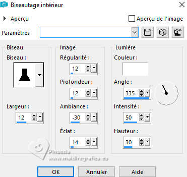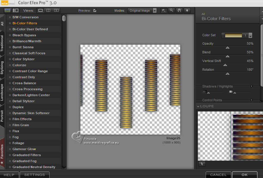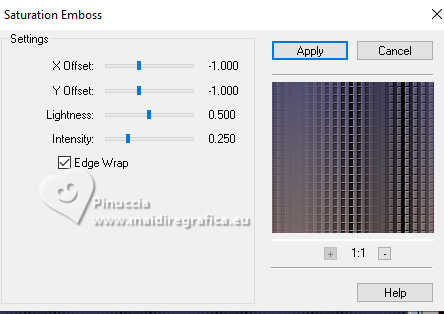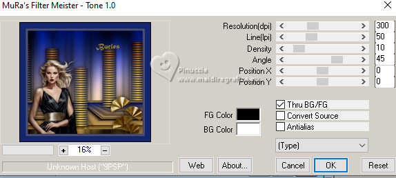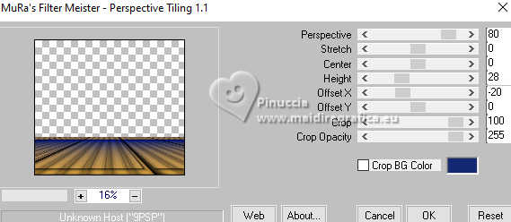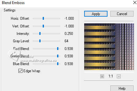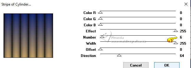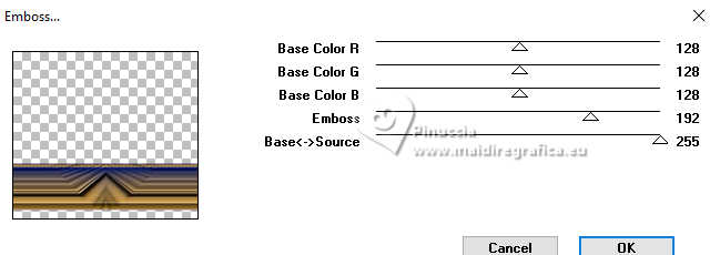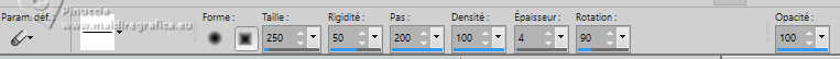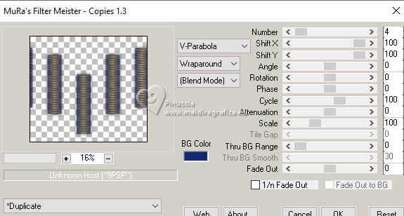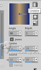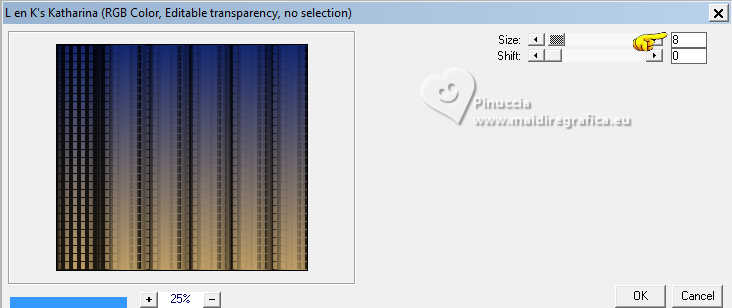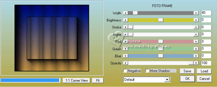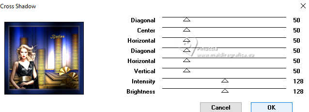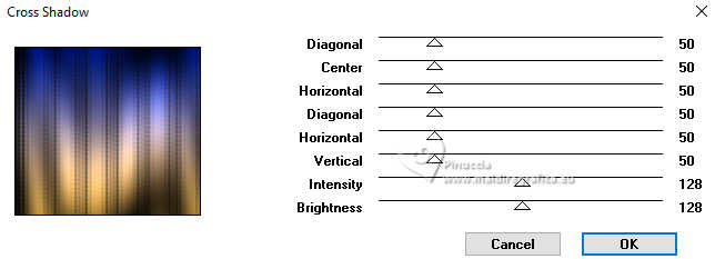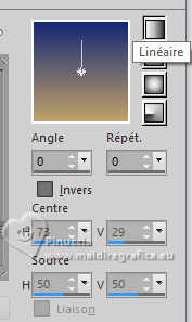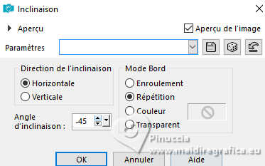 Le tutoriel a été créé avec PSP9 et traduit avec PSPX9 et PSP2020, mais il peut également être exécuté avec les autres versions. Suivant la version utilisée, vous pouvez obtenir des résultats différents. Depuis la version X4, la fonction Image>Miroir a été remplacée par Image>Renverser horizontalement, et Image>Renverser avec Image>Renverser verticalement. Dans les versions X5 et X6, les fonctions ont été améliorées par la mise à disposition du menu Objets. Avec la nouvelle version X7, nous avons à nouveau Miroir/Retourner, mais avec nouvelles différences. Consulter, si vouz voulez, mes notes ici Certaines dénominations ont changées entre les versions de PSP. Les plus frequentes dénominations utilisées: ![]() Traduction anglaise ici Vos versions ici![]() Nécessaire: ![]() (ici les liens vers les sites des créateurs de tubes) ![]() consulter, si nécessaire, ma section de filtre ici Filters Unlimited 2.0 ici Mura's Seamless - Stripe of Cylinder, Emboss ici Mura's Meister - Copies ici Mura's Meister - Tone ici Mura's Meister - Perspective Tiling ici FM Tile Tools - Saturation Emboss, Blend Emboss ici AAA Frames - Foto Frame ici L&K's - L&K's Katharina ici Graphics Plus - Cross Shadow ici Nik software - Color Efex Pro ici Filtres Mura's Seamless et Graphics Plus peuvent être utilisés seuls ou importés dans Filters Unlimited. voir comment le faire ici). Si un filtre est fourni avec cette icône, ![]() N'hésitez pas à changer le mode mélange des calques et leur opacité selon les couleurs utilisées. Dans les plus récentes versions de PSP, vous ne trouvez pas le dégradé d'avant plan/arrière plan ou Corel_06_029. Vous pouvez utiliser le dégradé des versions antérieures. Ici le dossier Dégradés de CorelX. ![]() 1. Ouvrir une nouvelle image transparente 1000 x 900 pixels. 2. Placer en avant plan la couleur claire #c1a168, et en arrière plan la couleur foncée #142874. ![]() Préparer en avant plan un dégradé de premier plan/arrière plan, style Linéaire. ![]() Remplir l'image transparent du dégradé.3. Effets>Modules Externes>Mura's Seamless - Stripe of Cylinder. ![]() 4. Effets>Modules Externes>L&K's - L&K's Katharina. ![]() 5. Effets>Modules Externes>FM Tile Tools - Saturation Emboss, par défaut. ![]() 6. Calques>Dupliquer. 7. Effets>Modules Externes>AAA Frames - Foto Frame. ![]() 8. Effets>Modules Externes>Mura's Meister - Perspective Tiling. ![]() 9. Effets>Effets de réflexion>Miroir rotatif. ![]() 10. Effets>Effets géométriques>Inclinaison. ![]() 11. Effets>Effets de réflexion>Miroir rotatif, comme précédemment. ![]() 12. Effets>Effets d'image>Décalage. ![]() 13. Effets>Modules Externes>Mura's Seamless - Emboss, par défaut. ![]() 14. Calques>Nouveau calque raster. 15. Activer l'outil Sélection ![]() (peu importe le type de sélection, parce que avec la sélection personnalisée vous obtenez toujours un rectangle), cliquer sur Sélection personnalisée ![]() et setter ces paramètres. ![]() 16. Changer les réglages du dégradé. ![]() Remplir la sélection du dégradé.17. Activer l'outil Gomme avec ces réglages![]() Et on passe l'outil de haut en bas d'une main ferme. ![]() ![]() Sélections>Désélectionner tout. 18. Effets>Effets 3D>Ombre portée, couleur noire. ![]() Répéter Effets>Effets 3D>Ombre portée, couleur noire. ![]() 19. Effets>Modules Externes>Mura's Meister - Copies. ![]() 20. Effets>Modules Externes>Nik Software - Color Efex Pro Bi-Color Filters - à droite Color Set 1 ![]() 21. Vous positionner sur le calque du bas de la pile, Raster 1. Effets>Modules Externes>Graphics Plus - Cross Shadow, par défaut. ![]() 22. Vous positionner sur le calque du haut de la pile. Ouvrir le tube 8823-LuzCristina ![]() Édition>Copier. Revenir sur votre travail et Édition>Coller comme nouveau calque. Déplacer le tube en bas à gauche.Effets>Effets 3D>Ombre portée, couleur noire. ![]() 23. Ouvrir le tube Deco 16-Luz Cristina ![]() Édition>Copier. Revenir sur votre travail et Édition>Coller comme nouveau calque. Déplacer le tube en bas à droite.Effets>Effets 3D>Ombre portée, comme précédemment. 24. Ouvrir le texte texto ![]() Édition>Copier. Revenir sur votre travail et Édition>Coller comme nouveau calque. Déplacer le tube à votre goût, ou voir mon exemple.25. Image>Ajouter des bordures, 4 pixels, symétrique, couleur foncée. Image>Ajouter des bordures, 2 pixels, symétrique, couleur claire. Image>Ajouter des bordures, 4 pixels, symétrique, couleur foncée. Image>Ajouter des bordures, 2 pixels, symétrique, couleur claire. Image>Ajouter des bordures, 4 pixels, symétrique, couleur foncée. Image>Ajouter des bordures, 2 pixels, symétrique, couleur claire. Image>Ajouter des bordures, 50 pixels, symétrique, couleur foncée. 26. Activer l'outil Baguette magique ![]() cliquer dans le dernier bord pour le sélectionner. 27. Effets>Modules Externes>Mura's Meister - Tone. ![]() 28. Effets>Modules Externes>FM Tile Tools - Blend Emboss, par défaut - 2 fois. ![]() 29. Effets>Modules Externes>Graphics Plus - Cross Shadow, par défaut - 2 fois. ![]() 30. Effets>Effets de réflexion>Miroir rotatif. ![]() 31. Effets>Effets 3D>Biseautage intérieur. ![]() 32. Image>Ajouter des bordures, 2 pixels, symétrique, couleur claire. 33. Image>Redimensionner, 84%, redimensionner tous les calques coché. 34. Signer votre travail et enregistrer en jpg. ![]() ![]() Si vous avez des problèmes, ou des doutes, ou vous trouvez un link modifié, ou seulement pour me dire que ce tutoriel vous a plu, vous pouvez m'écrire. |