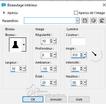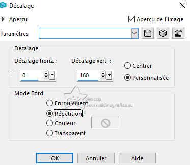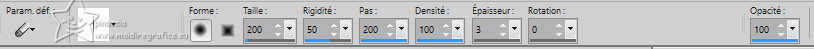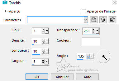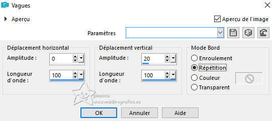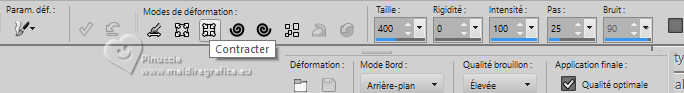 Le tutoriel a été créé avec PSP9 et traduit avec PSPX7, mais il peut également être exécuté avec les autres versions. Suivant la version utilisée, vous pouvez obtenir des résultats différents. Depuis la version X4, la fonction Image>Miroir a été remplacée par Image>Renverser horizontalement, et Image>Renverser avec Image>Renverser verticalement. Dans les versions X5 et X6, les fonctions ont été améliorées par la mise à disposition du menu Objets. Avec la nouvelle version X7, nous avons à nouveau Miroir/Retourner, mais avec nouvelles différences. Consulter, si vouz voulez, mes notes ici Certaines dénominations ont changées entre les versions de PSP. Les plus frequentes dénominations utilisées: ![]() traduction anglaise ici Vos versions ici![]() Nécessaire: ![]() Pour les tubes merci Luz Cristina. (ici les liens vers les sites des créateurs de tubes) ![]() consulter, si nécessaire, ma section de filtre ici Mura's Meister - Copies ici Flaming Pear - Flood ici ![]() N'hésitez pas à changer le mode mélange des calques et leur opacité selon les couleurs utilisées. Dans les plus récentes versions de PSP, vous ne trouvez pas le dégradé d'avant plan/arriére plan ou Corel_06_029. Vous pouvez utiliser le dégradé des versions antérieures. Ici le dossier Dégradés de CorelX. ![]() 1. Ouvrir une nouvelle image transparente 1000 x 100 pixels. 2. Placer en avant plan la couleur #000000, et en arrière plan la couleur #bbaa6d. ![]() Remplir l'image transparente avec la couleur d'avant plan.3. Calques>Nouveau calque raster. Remplir le calque avec la couleur d'arrière plan.4. Activer l'outil Gomme avec ces réglages.![]() Déplacer l'outil de gauche à droite comme ci-dessous. ![]() 5. Effets>Effets de textures>Torchis ![]() 6. Calques>Fusionner>Calques visibles. 7. Effets>Effets 3D>Biseautage intérieur. ![]() 8. Image>Taille du support. ![]() 9. Effets>Effets de distorsion>Vagues. ![]() 10. Effets>Effets d'image>Décalage. ![]() 11. Calques>Dupliquer. Image>Miroir>Miroir vertical (Image>Renverser). Effets>Effets d'image>Décalage, comme précédemment. 12. Calques>Fusionner>Calques visibles. Image>Miroir>Miroir horizontal (Image>Miroir). 13. Activer l'outil Pinceau déformant ![]() ![]() Si vous ne voyez pas les règles: Afficher>Règles, placez votre outil à 250 pixels de largeur x 300 pixels de hauteur ![]() Une fois que vous êtes en position, appuyez et maintenez la touche gauche de la souris, sans la déplacer, jusqu'à ce que l'outil s'arrête tout seul. ![]() 14. Effets>Modules Externes>Mura's Meister - Copies. ![]() 15. Effets>Effets 3D>Ombre portée, couleur noire. ![]() 16. Calques>Nouveau calque raster. Calques>Agencer>Déplacer vers le bas. Préparer en avant plan un dégradé de premier plan/arrière plan, style Linéaire. ![]() Remplir le calque du dégradé.17. Effets>Modules Externes>Flaming Pear - Flood - couleur claire #bbaa6d. ![]() 18. Ouvrir le misted 2136-luzcristinaG ![]() Édition>Copier. Revenir sur votre travail et Édition>Coller comme nouveau calque. Positionner bien le tube à droite.19. Vous positionner sur le calque du haut de la pile. Ouvrir le tube de la femme 6810-luzcristinaG ![]() Édition>Copier. Revenir sur votre travail et Édition>Coller comme nouveau calque. Positionner bien le tube au centre.Effets>Effets 3D>Ombre portée, comme précédemment. 20. Vous positionner sur le calque du misted, Raster 2. Calques>Dupliquer. Calques>Agencer>Déplacer vers le bas. Image>Miroir>Miroir horizontal (Image>Miroir). 21. Effets>Effets d'image>Décalage. ![]() 22. Réglage>Flou>Flou directionnel (ou Flou de Mouvement) ![]() 23. Imagine>Ajouter des bordures, 2 pixels, symétrique, couleur noire. Image>Ajouter des bordures, 1 pixel, symétrique, couleur claire. Imagine>Ajouter des bordures, 10 pixels, symétrique, couleur noire. Image>Ajouter des bordures, 1 pixel, symétrique, couleur claire. Imagine>Ajouter des bordures, 35 pixels, symétrique, couleur noire. Image>Ajouter des bordures, 1 pixel, symétrique, couleur claire. Imagine>Ajouter des bordures, 10 pixels, symétrique, couleur noire. Image>Ajouter des bordures, 1 pixel, symétrique, couleur claire. 24. Image>Redimensionner, 84% ou à votre convenance, redimensionner tous les calques coché. Signer votre travail et enregistrer en jpg. Pour le tube de cette version merci kTs; le misted est à moi. ![]() ![]() Si vous avez des problèmes, ou des doutes, ou vous trouvez un link modifié, ou seulement pour me dire que ce tutoriel vous a plu, vous pouvez m'écrire. |
