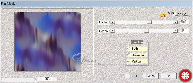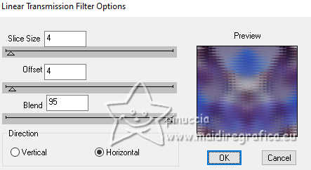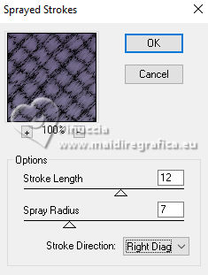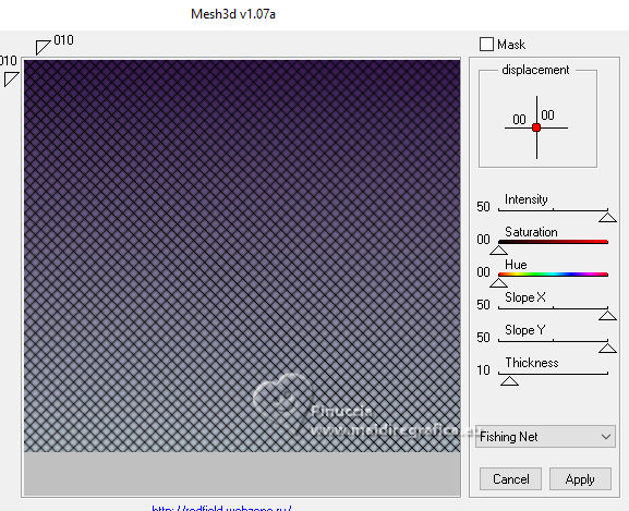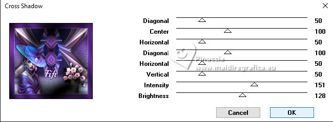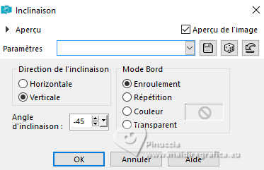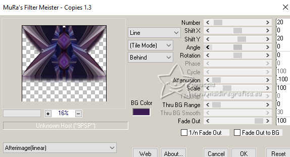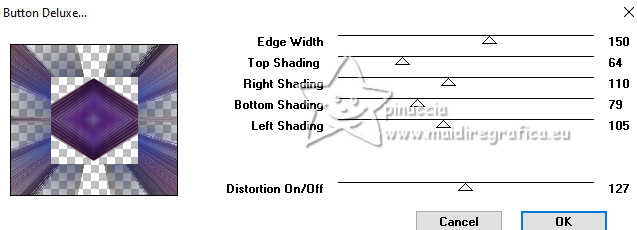 Le tutoriel a été créé avec PSP9 et traduit avec PSPX9 et PSP2020, mais il peut également être exécuté avec les autres versions. Suivant la version utilisée, vous pouvez obtenir des résultats différents. Depuis la version X4, la fonction Image>Miroir a été remplacée par Image>Renverser horizontalement, et Image>Renverser avec Image>Renverser verticalement. Dans les versions X5 et X6, les fonctions ont été améliorées par la mise à disposition du menu Objets. Avec la nouvelle version X7, nous avons à nouveau Miroir/Retourner, mais avec nouvelles différences. Consulter, si vouz voulez, mes notes ici Certaines dénominations ont changées entre les versions de PSP. Les plus frequentes dénominations utilisées: ![]() Traduction anglaise ici Vos versions ici![]() Nécessaire: ![]() (ici les liens vers les sites des créateurs de tubes) ![]() consulter, si nécessaire, ma section de filtre ici Filters Unlimited 2.0 ici Mehdi 2 - Flat Median ici Redfield - Mesh 3D ici DSB Flux - Linear Transmission ici Filter Factory Gallery B - Button Deluxe ici Mura's Meister - Copies ici Mura's Meister - Perspective Tiling ici Alien Skin Eye Candy 5 Impact - Extrude ici Simple - Top Left Mirror ici FM Tile Tools - Saturation Emboss, Blend Emboss ici Brush Strokes Sprayed Strokes ici Graphics Plus - Cross Shadow ici Filtres Factory Gallery, Simple et Graphics Plus peuvent être utilisés seuls ou importés dans Filters Unlimited. voir comment le faire ici). Si un filtre est fourni avec cette icône, ![]() N'hésitez pas à changer le mode mélange des calques et leur opacité selon les couleurs utilisées. Dans les plus récentes versions de PSP, vous ne trouvez pas le dégradé d'avant plan/arriére plan ou Corel_06_029. Vous pouvez utiliser le dégradé des versions antérieures. Ici le dossier Dégradés de CorelX. ![]() 1. Ouvrir une nouvelle image transparente 1000 x 900 pixels. 2. Placer en avant plan la couleur #b6c2cc, et en arrière plan la couleur #391c53. ![]() Préparer en avant plan un dégradé de premier plan/arrière plan, style Linéaire ![]() Remplir l'image transparente du dégradé.3. Sélections>Sélectionner tout. Ouvrir le tube 8589-LuzCristina ![]() Édition>Copier. Revenir sur votre travail et Édition>Coller dans la sélection. Sélections>Désélectionner tout. 4. Effets>Effets d'image>Mosaïque sans jointures, par défaut. ![]() 5. Effets>Modules Externes>Mehdi2 - Flat Median. ![]() 6. Effets>Effets de réflexion>Miroir rotatif. ![]() 7. Effets>Modules Externes>DSB Flux - Linear Transmission. ![]() 8. Effets>Modules Externes>FM Tile Tools - Blend Emboss, par défaut. ![]() 9. Effets>Effets géométriques>Perspective Horizontale. ![]() 10. Effets>Effets géométriques>Inclinaison. ![]() 11. Image>Miroir>Miroir horizontal. 12. Effets>Modules Externes>Simple - Top Left Mirror. ![]() 13. Effets>Modules Externes>FM Tile Tools - Saturation Emboss, par défaut. ![]() 14. Effets>Modules Externes>Filter Factory Gallery B - Button Deluxe. ![]() 15. Effets>Effets géométriques>Perspective Verticale. ![]() 16. Calques>Dupliquer. Image>Miroir>Miroir vertical. 17. Calques>Fusionner>Calques visibles. 18. Effets>Effets de distorsion>Cintrage. ![]() 19. Effets>Modules Externes>Alien Skin Eye Candy 5 Impact - Extrude. ![]() 20. Effets>Effets de réflexion>Miroir rotatif. ![]() 21. Activer l'outil Sélecteur ![]() en mode Échelle ![]() pousser le noeud central inférieur vers le haut, jusqu'à 600 pixels. ![]() 22. Effets>Modules Externes>Mura's Meister - Copies. ![]() 23. Effets>Effets 3D>Ombre portée, couleur noire. ![]() 24. Calques>Nouveau calque raster. Calques>Agencer>Déplacer vers le bas. 25. Remplir le calque du dégradé.26. Effets>Modules Externes>Redfield - Mesh 3D ![]() 27. Effets>Modules Externes>Brush Strokes - Sprayed Strokes. ![]() 28. Effets>Modules Externes>FM Tile Tools - Saturation Emboss, par défaut. ![]() 29. Calques>Dupliquer. 30. Effets>Modules Externes>Mura's Meister - Perspective Tiling. ![]() 31. Effets>Effets géométriques>Inclinaison. ![]() 32. Effets>Effets de réflexion>Miroir rotatif. ![]() 33. Vous positionner sur le calque du haut de la pile. Le tube de la femme 8589-LuzCristina est toujours en mémoire. Édition>Coller comme nouveau calque. Déplacer le tube à gauche.Effets>Effets 3D>Ombre portée, à choix. 34. Ouvrir le déco 6494-Luz Cristina ![]() Édition>Copier. Revenir sur votre travail et Édition>Coller comme nouveau calque. Déplacer le tube à droite.Effets>Effets 3D>Ombre portée, à choix. 35. Ouvrir le texte texto ![]() Édition>Copier. Revenir sur votre travail et Édition>Coller comme nouveau calque. Déplacer le texte à votre goût ou voir mon exemple.36. Image>Ajouter des bordures, 4 pixels, symétrique, couleur foncée. Image>Ajouter des bordures, 2 pixels, symétrique, couleur claire. Image>Ajouter des bordures, 60 pixels, symétrique, couleur foncée. 37. Activer l'outil Baguette magique , tolérance et progressivité 0,et cliquer dans le dernier bord pour le sélectionner. 38. Effets>Modules Externes>Graphics Plus - Cross Shadow. ![]() 39. Effets>Effets 3D>Biseautage intérieur. ![]() Sélections>Désélectionner tout. 40. Image>Redimensionner, 84%, redimensionner tous les calques coché. Signer votre travail et enregistrer en jpg. Pour les tubes de ces versions merci Luz Cristina et Nena Silva ![]() Luz Cristina ![]() ![]() Si vous avez des problèmes, ou des doutes, ou vous trouvez un link modifié, ou seulement pour me dire que ce tutoriel vous a plu, vous pouvez m'écrire. |