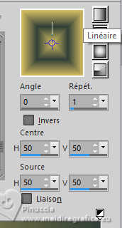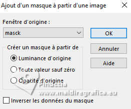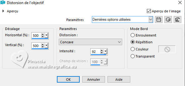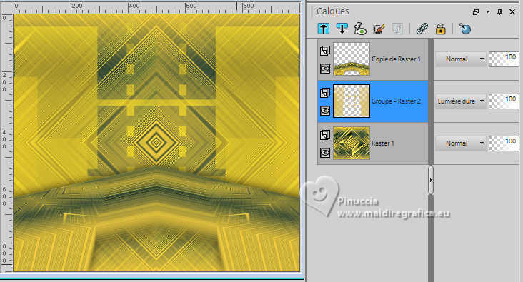 Le tutoriel a été créé avec PSP9 et traduit avec PSPX9 et PSP2020, mais il peut également être exécuté avec les autres versions. Suivant la version utilisée, vous pouvez obtenir des résultats différents. Depuis la version X4, la fonction Image>Miroir a été remplacée par Image>Renverser horizontalement, et Image>Renverser avec Image>Renverser verticalement. Dans les versions X5 et X6, les fonctions ont été améliorées par la mise à disposition du menu Objets. Avec la nouvelle version X7, nous avons à nouveau Miroir/Retourner, mais avec nouvelles différences. Consulter, si vouz voulez, mes notes ici Certaines dénominations ont changées entre les versions de PSP. Les plus frequentes dénominations utilisées: ![]() Traduction anglaise ici Vos versions ici![]() Nécessaire: ![]() (ici les liens vers les sites des créateurs de tubes) ![]() consulter, si nécessaire, ma section de filtre ici Filters Unlimited 2.0 ici &<Bkg Designer sf10II> - Daggers Done (à importer dans Unlimited) ici Simple - Top Left Mirror ici Simple - Left Right Wrap (bonus) ici Mura's Meister - Tone ici Mura's Meister - Copies ici Mura's Meister - Perspective Tiling ici Nik Software - Color Efex Pro ici Artistiques - Pastels ici FM Tile Tools - Saturation Emboss, Blend Emboss ici Filtres Simple peuvent être utilisés seuls ou importés dans Filters Unlimited. voir comment le faire ici). Si un filtre est fourni avec cette icône, ![]() N'hésitez pas à changer le mode mélange des calques et leur opacité selon les couleurs utilisées. Dans les plus récentes versions de PSP, vous ne trouvez pas le dégradé d'avant plan/arriére plan ou Corel_06_029. Vous pouvez utiliser le dégradé des versions antérieures. Ici le dossier Dégradés de CorelX. ![]() Ouvrir le masque dans PSP et le minimiser avec le reste du matériel. 1. Ouvrir une nouvelle image transparente 1000 x 900 pixels. 2. Placer en avant plan la couleur #d7be62, et en arrière plan la couleur #314038. ![]() Préparer en avant plan un dégradé de premier plan/arrière plan, style Rectangulaire ![]() Remplir l'image transparente du dégradé.3. Effets>Modules Externes>Filters Unlimited 2.0 - &<Bkg Designer sf10II> - Daggers Done ![]() 4. Effets>Effets de réflexion>Miroir rotatif. ![]() 5. Image>Miroir>Miroir vertical. 6. Effets>Modules Externes>Simple - Top Left Mirror. ![]() 7. Effets>Modules Externes>FM Tile Tools - Saturation Emboss. ![]() 8. Calques>Dupliquer. 9. Effets>Modules Externes>Mura's Meister - Perspective Tiling. ![]() 10. Effets>Effets de distorsion>Distorsion de l'objectif. ![]() 11. Effets>Effets de réflexion>Miroir rotatif. ![]() 12. Activer l'outil Baguette magique ![]() et cliquer dans les parties à droite et à gauche pour les sélectionner. ![]() Presser CANC sur le clavier ![]() ![]() Sélections>Désélectionner tout. 13. Effets>Modules Externes>Mura's Meister - Copies. ![]() 14. Effets>Effets 3D>Ombre portée, couleur noire. ![]() 15. Effets>Modules Externes>FM Tile Tools - Blend Emboss, par défaut. ![]() 16. Effets>Modules Externes>Simple - Left Right Wrap. Cet effet travaille sans fenêtre; résultat ![]() 17. Calques>Nouveau calque raster. Calques>Agencer>Déplacer vers le bas. 18. Placer en avant plan la Couleur. Remplir le calque avec la couleur claire d'avant plan.19. Calques>Nouveau calque de masque>A partir d'une image. Ouvrir le menu deroulant sous la fenêtre d'origine et vous verrez la liste des images ouvertes. Sélectionner le masque masck. ![]() Calques>Fusionner>Fusionner le groupe. 20. Image>Miroir>Miroir horizontal. 21. Effets>Effets de réflexion>Miroir rotatif. ![]() 22. Effets>Modules Externes>Simple - Left Right Wrap. Placer ce calque en mode Lumière dure. ![]() 23. Effets>Modules Externes>Nik Software - Color Efex Pro Bi-Color Filters - à droite Color Set Cool Warm 2 ![]() 24. Effets>Modules Externes>Artistiques - Pastels si vous utilisez la version anglaise (le résultat ne change pas) Effets>Modules Externes>Artistics - Rough Pastels. ![]() ![]() 25. Effets>Effets 3D>Ombre portée, comme précédemment. Vous positionner sur le calque du haut de la pile. 26. Ouvrir le tube 8757-LuzCristina ![]() Édition>Copier. Revenir sur votre travail et Édition>Coller comme nouveau calque. Déplacer le tube à gauche.Effets>Effets 3D>Ombre portée, comme précédemment. 27. Ouvrir le texte texto ![]() Édition>Copier. Revenir sur votre travail et Édition>coller comme nouveau calque. Déplacer le texte à droite, ou à votre goût.28. Image>Ajouter des bordures, 3 pixels, symétrique, couleur foncée. Image>Ajouter des bordures, 2 pixels, symétrique, couleur claire. Image>Ajouter des bordures, 60 pixels, symétrique, couleur foncée. 29. Activer l'outil Baguette magique ![]() et cliquer dans le dernier bord pour le sélectionner. 30. Effets>Modules Externes>Mura's Meister - Tone. ![]() 31. Effets>Modules Externes>Artistiques - Pastels, comme précédemment. ![]() ![]() 32. Effets>Effets 3D>Biseautage intérieur. ![]() Sélections>Désélectionner tout. 33. Image>Redimensionner, à 84%, redimensionner tous les calques coché. 34. Signer votre travail et enregistrer en jpg. ![]() ![]() Si vous avez des problèmes, ou des doutes, ou vous trouvez un link modifié, ou seulement pour me dire que ce tutoriel vous a plu, vous pouvez m'écrire. |