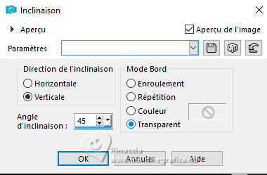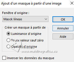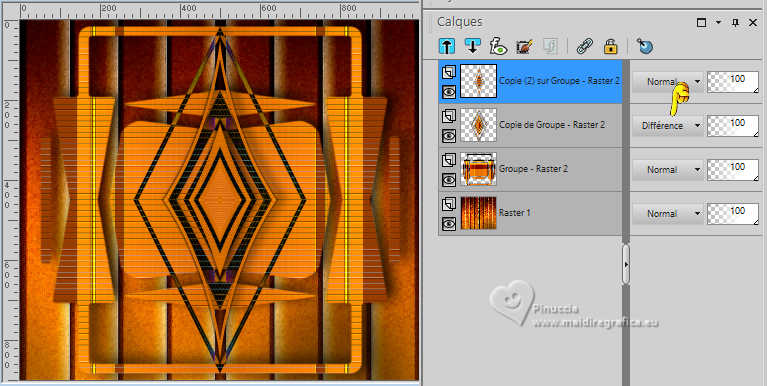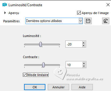 Le tutoriel a été créé avec PSP9 et traduit avec PSPX7, mais il peut également être exécuté avec les autres versions. Suivant la version utilisée, vous pouvez obtenir des résultats différents. Depuis la version X4, la fonction Image>Miroir a été remplacée par Image>Renverser horizontalement, et Image>Renverser avec Image>Renverser verticalement. Dans les versions X5 et X6, les fonctions ont été améliorées par la mise à disposition du menu Objets. Avec la nouvelle version X7, nous avons à nouveau Miroir/Retourner, mais avec nouvelles différences. Consulter, si vouz voulez, mes notes ici Certaines dénominations ont changées entre les versions de PSP. Les plus frequentes dénominations utilisées: ![]() Traduction anglaise ici Vos versions ici![]() Nécessaire: ![]() Pour les tubes merci Luz Cristina. (ici les liens vers les sites des créateurs de tubes) ![]() consulter, si nécessaire, ma section de filtre ici Filters Unlimited 2.0 ici Graphics Plus - Panel Stripes, Cross Shadow ici Artistiques - Barbouillage ici Mura's Seamless - Emboss ici L&K's - L&K's Paris ici L&K's - L&K's Pia ici L&K's - L&K's Mayra ici Simple - Top Left Mirror ici FM Tile Tools - Saturation Emboss ici Filtres Graphics Plus, Mura's Seamless et Simple peuvent être utilisés seuls ou importés dans Filters Unlimited. voir comment le faire ici). Si un filtre est fourni avec cette icône, ![]() N'hésitez pas à changer le mode mélange des calques et leur opacité selon les couleurs utilisées. Dans les plus récentes versions de PSP, vous ne trouvez pas le dégradé d'avant plan/arriére plan ou Corel_06_029. Vous pouvez utiliser le dégradé des versions antérieures. Ici le dossier Dégradés de CorelX. ![]() Ouvrir le masque dans PSP et le minimiser avec le reste du matériel. 1. Ouvrir une nouvelle image transparente 1000 x 900 pixels. 2. Placer en avant plan la couleur #f0a124, et en arrière plan la couleur #773f11. ![]() Préparer en avant plan un dégradé de première plan/arrière plan, style Linéaire. ![]() Remplir l'image transparente du dégradé.3. Effets>Modules Externes>Graphics Plus - Panel Stripes, par défaut. ![]() 4. Effets>Effets de réflexion>Miroir rotatif. ![]() 5. Réglage>Ajouter/Supprimer du bruit/Ajouter du bruit. ![]() 6. Effets>Modules Externes>Artistiques - Barbouillage. si vous utilisez la version anglais du filtre (le résultat ne change pas) Effets>Modules Externes>Artistics - Paint Daubs ![]() 7. Réglage>Luminosité et Contraste>Luminosité et contraste - 3 fois avec ces réglages. ![]() 8. Effets>Modules Externes>Graphics Plus - Cross Shadow. ![]() 9. Effets>Modules Externes>Mura's Seamless - Emboss, par défaut ![]() 10. Calques>Nouveau calque raster. Remplir le calque du dégradé.Image>Miroir>Miroir vertical (Image>Renverser). 11. Calques>Nouveau calque de masque>A partir d'une image. Ouvrir le menu deroulant sous la fenêtre d'origine et vous verrez la liste des images ouvertes. Sélectionner le masque Masck lineas. ![]() Calques>Fusionner>Fusionner le groupe. 12. Effets>Effets de réflexion>Miroir rotatif, comme précédemment ![]() 13. Effets>Modules Externes>Simple - Top Left Mirror. ![]() 14. Effets>Modules Externes>L&K's - Paris ![]() 15. Effets>Effets de réflexion>Miroir rotatif, comme précédemment ![]() 16. Effets>Modules Externes>L&K's - Mayra ![]() 17. Effets>Effets de réflexion>Miroir rotatif, comme précédemment ![]() 18. Effets>Effets 3D>Ombre portée. ![]() 19. Effets>Modules Externes>FM Tile Tools - Saturation Emboss. ![]() Calques>Dupliquer. 20. Effets>Effets géométriques>Inclinaison. ![]() Édition>Répéter Inclinaison. 21. Effets>Effets de réflexion>Miroir rotatif, comme précédemment ![]() 22. Effets>Modules Externes>Simple - Top Left Mirror. ![]() 23. Effets>Effets 3D>Ombre portée, comme précédemment. ![]() 24. Calques>Dupliquer. 25. Effets>Effets de distorsion>Cintrage. ![]() 26. Placer le calque Copie de Groupe Raster 2 en mode Différence (optional selon vos couleurs dans votre version libre). ![]() 27. Copier/Coller comme nouveau calque les tubes et les positionner à votre goût. Effets>Effets 3D>Ombre portée, à choix. 28. Image>Ajouter des bordures, 3 pixels, symétrique, couleur noire. Image>Ajouter des bordures, 2 pixels, symétrique, couleur #f0a124. Image>Ajouter des bordures, 60 pixels, symétrique, couleur noire. 29. Activer l'outil Baguette magique ![]() et cliquer dans le dernier bord pour le sélectionner. 30. Effets>Modules Externes>L&K's - L&K's Mayra, comme précédemment. 31. Effets>Effets de réflexion>Miroir rotatif, comme précédemment ![]() 32. Effets>Effets 3D>Biseautage intérieur. ![]() 33. Effets>Modules Externes>FM Tile Tools - Saturation Emboss, par défaut. Sélections>Désélectionner tout. 34. Image>Ajouter des bordures, 2 pixels, symétrique, couleur #f0a124. 35. Image>Redimensionner, 84%, redimensionner tous les calques coché. Signer votre travail et enregistrer en jpg. ![]() Si vous avez des problèmes, ou des doutes, ou vous trouvez un link modifié, ou seulement pour me dire que ce tutoriel vous a plu, vous pouvez m'écrire. |