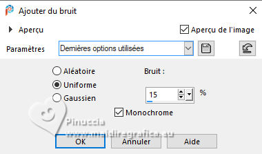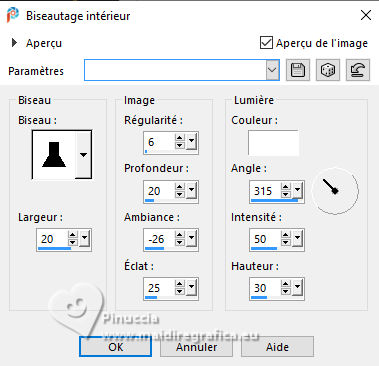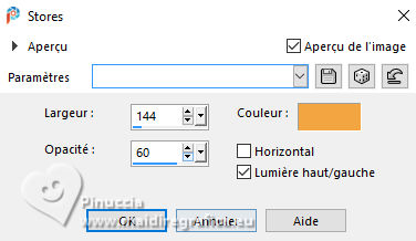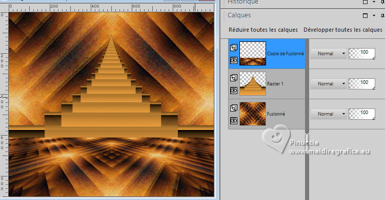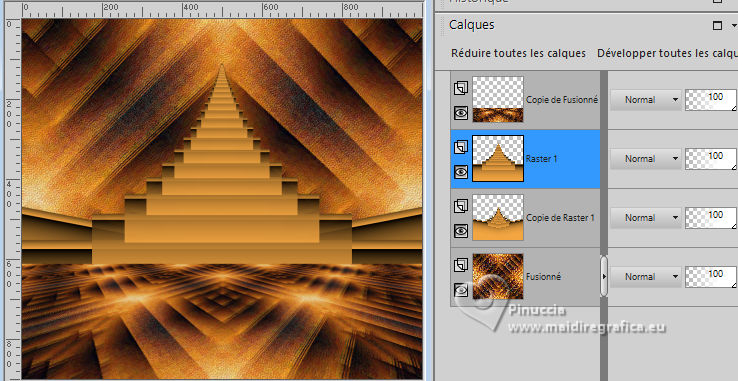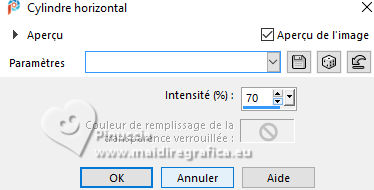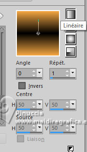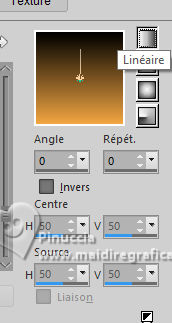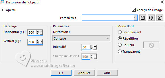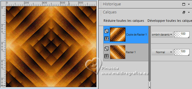 Le tutoriel a été créé avec PSP9 et traduit avec PSPX7, mais il peut également être exécuté avec les autres versions. Suivant la version utilisée, vous pouvez obtenir des résultats différents. Depuis la version X4, la fonction Image>Miroir a été remplacée par Image>Renverser horizontalement, et Image>Renverser avec Image>Renverser verticalement. Dans les versions X5 et X6, les fonctions ont été améliorées par la mise à disposition du menu Objets. Avec la nouvelle version X7, nous avons à nouveau Miroir/Retourner, mais avec nouvelles différences. Consulter, si vouz voulez, mes notes ici Certaines dénominations ont changées entre les versions de PSP. Les plus frequentes dénominations utilisées: ![]() Traduction anglaise ici Vos versions ici![]() Nécessaire: ![]() Le matériel est de Luz Cristina. (ici les liens vers les sites des créateurs de tubes) ![]() consulter, si nécessaire, ma section de filtre ici Filters Unlimited 2.0 ici Virtual Painter - Virtual Painter 4 ici FM Tile Tools - Blend Emboss ici Nik Software - Color Efex Pro ici Mura's Seamless - Emboss ici AAA Frames - Foto Frame ici Simple - Diamonds ici Mura's Meister - Perspective Tiling ici Filter Factory Gallery S - Itsa edge thing ici Filtres Factory Gallery, Mura's Seamless et Simple peuvent être utilisés seuls ou importés dans Filters Unlimited. voir comment le faire ici). Si un filtre est fourni avec cette icône, ![]() N'hésitez pas à changer le mode mélange des calques et leur opacité selon les couleurs utilisées. Dans les plus récentes versions de PSP, vous ne trouvez pas le dégradé d'avant plan/arriére plan ou Corel_06_029. Vous pouvez utiliser le dégradé des versions antérieures. Ici le dossier Dégradés de CorelX. ![]() 1. Ouvrir une nouvelle image transparente 1000 x 900 pixels. 2. Placer en avant plan la couleur #f2a542, et en arrière plan la couleur #000000. ![]() Préparer en avant plan un dégradé de premier plan/arrière plan, style Linéaire. ![]() Remplir l'image transparente du dégradé.3. Effets>Effets de textures>Stores, couleur d'avant plan. ![]() 4. Effets>Modules Externes>Virtual Painter - Virtual Painter 4. Filter: Oil Painting - Material: Canvas (Fine) ![]() 5. Effets>Modules Externes>Simple - Diamonds. Cet effet travaille sans fenêtre; résultat ![]() 6. Calques>Dupliquer. Image>Miroir>Miroir horizontal (Image>Miroir). Placer le calque en mode Assombrir davantage (ou à votre goût). ![]() 7. Calques>Fusionner>Calques visible. 8. Effets>Effets de réflexion>Miroir rotatif. ![]() 9. Effets>Modules Externes>Filter Factory Gallery S - Itsa edge thing, par défaut. ![]() 10. Calques>Dupliquer. 11. Effets>Modules Externes>Mura's Meister - Perspective Tiling. ![]() 12. Changer les réglages du dégradé Répéts.0 ![]() Calques>Nouveau calque raster. Remplir le calque du dégradé.13. Répéter Effets>Modules Externes>Mura's Meister - Perspective Tiling, comme précédemment. ![]() 14. Effets>Effets de réflexion>Résonance. ![]() 15. Effets>Effets di distorsion>Cintrage ![]() 16. Vous positionner sur le calque Copie de Fusionné. Calques>Agencer>Placer en haut de la pile. ![]() 17. Vous positionner sur le calque Raster 1. Calques>Dupliquer. 18. Effets>Effets de distorsion>Distorsion de l'objectif. ![]() 19. Effets>Effets de réflexion>Miroir rotatif. ![]() 20. Calques>Agencer>Déplacer vers le bas. 21. Vous positionner sur le calque Raster 1. ![]() Calques>Fusionner>Fusionner le calque de dessous. 22. Effets>Modules Externes>Mura's Seamless - Emboss, par défaut. ![]() 23. Effets>Effets 3D>Ombre portée. ![]() 24. Calques>Dupliquer. Image>Redimensionner, à 60%, redimensionner tous les calques décoché. 25. Effets>Effets de distorsion>Coordonnées polaires. ![]() 26. Image>Miroir>Miroir vertical (Image>Renverser). 27. Calques>Agencer>Déplacer vers le bas. Effets>Effets 3D>Ombre portée, comme précédemment. 28. Effets>Effets géométriques>Cylindre horizontal. ![]() 29. Réglage>Ajouter/Supprimer du bruit>Ajouter du bruit. ![]() 30. Effets>Modules Externes>FM Tile Tools - Blend Emboss, par défaut. ![]() 31. Effets>Modules Externes>Nik Software - Color Efex Pro Bicolor filters - à droite Color Set Brown 1 ![]() 32. Vous positionner sur le calque Copie de Raster 1. Répéter Effets>Modules Externes>Nik Software - Color Efex Pro Bicolor filters - à droite Color Set Cool/Warm 2 ![]() 33. Vous positionner sur le calque du haut de la pile. Ouvrir le tube lamparas ![]() Édition>Copier. Revenir sur votre travail et Édition>Coller comme nouveau calque. Déplacer le tube en haut à droite.Le tube a déjà son ombre portée. Calques>Dupliquer. Image>Miroir>Miroir vertical (Image>Renverser). 34. Ouvrir le texte texto ![]() Édition>Copier. Revenir sur votre travail et Édition>Coller comme nouveau calque. Déplacer le tube au centre.Le texte a déjà son ombre portée. 35. Ouvrir le tube de la femme 8225-LuzCristina ![]() Édition>Copier. Revenir sur votre travail et Édition>Coller comme nouveau calque. Déplacer le tube en en bas à gauche.Effets>Effets 3D>Ombre portée, à choix. 36. Calques>Fusionner>Tous. 37. Image>Ajouter des bordures, 3 pixels, symétrique, couleur foncée. Image>Ajouter des bordures, 2 pixels, symétrique, couleur claire. Image>Ajouter des bordures, 60 pixels, symétrique, couleur foncée. Activer l'outil Baguette magique ![]() et cliquer dans le dernier bord pour le sélectionner. 38. Effets>Modules Externes>Virtual Painter - Virtual Painter 4, comme précédemment. ![]() 39. Effets>Effets 3D>Biseautage intérieur. ![]() Édition>Répéter Biseautage intérieur. Sélections>Désélectionner tout. 40. Image>Ajouter des bordures, 2 pixels, symétrique, couleur claire. Image>Redimensionner, 84%, ou à votre goût, redimensionner tous les calques coché. Signer votre travail et enregistrer en jpg. ![]() ![]() ![]() Si vous avez des problèmes, ou des doutes, ou vous trouvez un link modifié, ou seulement pour me dire que ce tutoriel vous a 