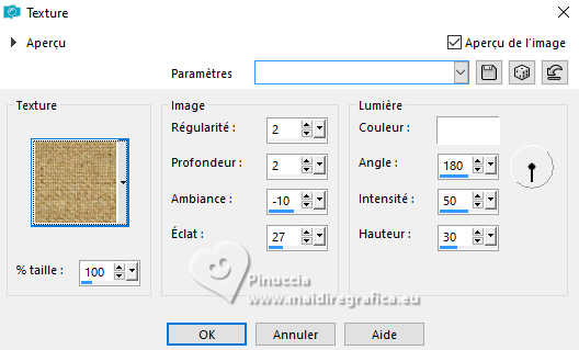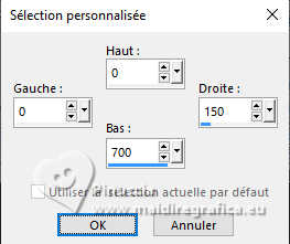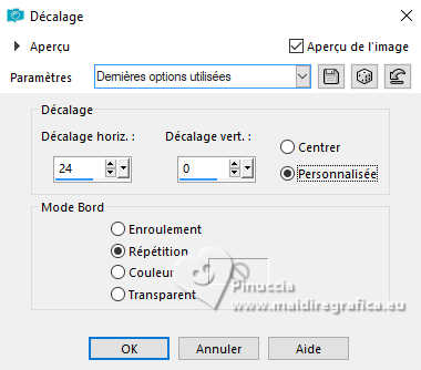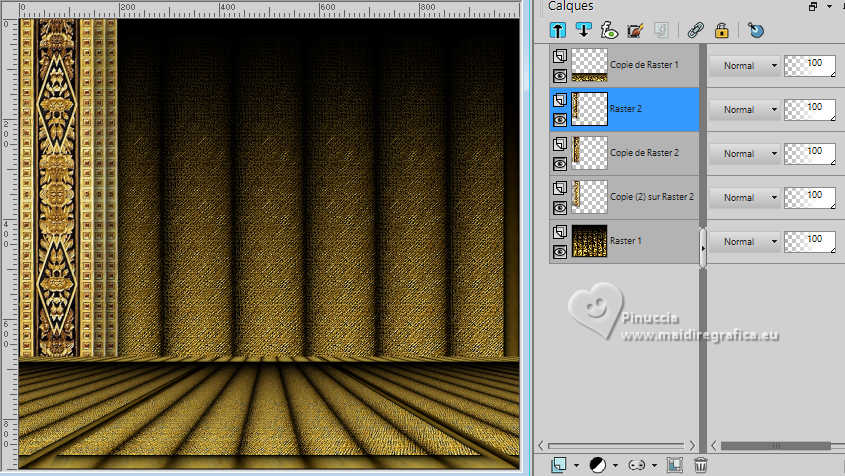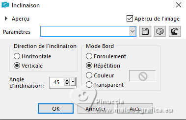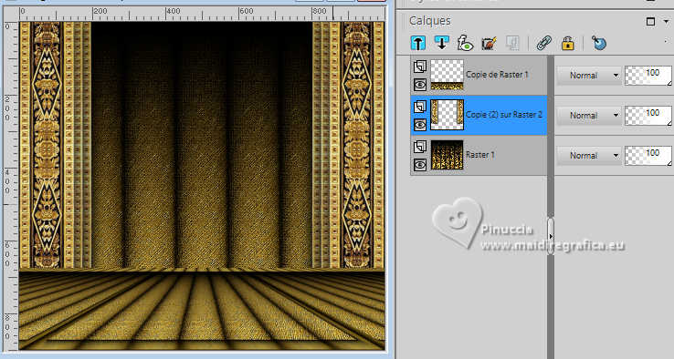 Le tutoriel a été créé avec PSP9 et traduit avec PSPX7, mais il peut également être exécuté avec les autres versions. Suivant la version utilisée, vous pouvez obtenir des résultats différents. Depuis la version X4, la fonction Image>Miroir a été remplacée par Image>Renverser horizontalement, et Image>Renverser avec Image>Renverser verticalement. Dans les versions X5 et X6, les fonctions ont été améliorées par la mise à disposition du menu Objets. Avec la nouvelle version X7, nous avons à nouveau Miroir/Retourner, mais avec nouvelles différences. Consulter, si vouz voulez, mes notes ici Certaines dénominations ont changées entre les versions de PSP. Les plus frequentes dénominations utilisées: ![]() traduction anglaise ici Vos versions ici![]() Nécessaire: ![]() Pour les tubes merci Luz Cristina et MtmBrigitte. (ici les liens vers les sites des créateurs de tubes) ![]() consulter, si nécessaire, ma section de filtre ici Filters Unlimited 2.0 ici Brush Strokes - Crosshatch ici Artistiques - Pastels ici Mura's Seamless - Stripe of Cylinder ici AAA Frames - Foto Frame ici Mura's Meister - Perspective Tiling ici Backgroundmaniac - Oriental Lines'n dots ici Simple - Top Left Mirror ici FM Tile Tools - Saturation Emboss ici Filtres Mura's Seamless et Simple peuvent être utilisés seuls ou importés dans Filters Unlimited. voir comment le faire ici). Si un filtre est fourni avec cette icône, ![]() N'hésitez pas à changer le mode mélange des calques et leur opacité selon les couleurs utilisées. Dans les plus récentes versions de PSP, vous ne trouvez pas le dégradé d'avant plan/arriére plan ou Corel_06_029. Vous pouvez utiliser le dégradé des versions antérieures. Ici le dossier Dégradés de CorelX. ![]() Placer la texture dans le dossier Textures 1. Ouvrir une nouvelle image transparente 1000 x 900 pixels. 2. Placer en avant plan la couleur #dcbc71, et en arrière plan la couleur #010101. ![]() Préparer en avant plan un dégradé de premier plan/arrière plan, style Linéaire. ![]() Remplir l'image transparente du dégradé.3. Effets>Modules Externes>Mura's Seamless - Stripe of cylinder. ![]() 4. Effets>Effets de textures>Texture - sélectionner la texture lino ![]() 5. Effets>Modules Externes>Brush Strokes - Crosshatch ![]() 6. Effets>Modules Externes>Artistiques - Pastels si vous utilisez la version anglais du filtre, le résultat ne change pas Effets>Modules Externes>Artistic - Rough Pastels ![]() 7. Effets>Modules Externes>FM Tile Tools - Saturation Emboss (optionnel) ![]() 8. Effets>Modules Externes>AAA Frames - Foto Frame. ![]() 9. Calques>Dupliquer. Effets>Modules Externes>Mura's Meister - Perspective Tiling. ![]() 10. Calques>Nouveau calque raster. Calques>Agencer>Déplacer vers le bas. 11. Activer l'outil Sélection ![]() (peu importe le type de sélection, parce que avec la sélection personnalisée vous obtenez toujours un rectangle), cliquer sur Sélection personnalisée ![]() et setter ces paramétres. ![]() 12. Ouvrir le tube cenefa ![]() Édition>Copier. Revenir sur votre travail et Édition>Coller dans la sélection. Sélections>Désélectionner tout. 13. Effets>Effets 3D>Ombre portée. ![]() 14. Calques>Dupliquer. Calques>Agencer>Déplacer vers le bas. 15. Effets>Effets d'image>Décalage. ![]() 16. Calques>Dupliquer. Calques>Agencer>Déplacer vers le bas. 17. Effets>Effets d'image>Décalage. ![]() 18. Vous positionner sur le calque Raster 2 ![]() Calques>Fusionner>Fusionner le calque de dessous - 2 fois. 19. Calques>Dupliquer. Image>Miroir. Calques>Fusionner>Fusionner le calque de dessous. 20. Nous avons ceci ![]() 21. Rester positionné sur ce calque. Calques>Dupliquer. 22. Effets>Effets de distorsion>Coordonnées polaires ![]() 23. Effets>Modules Externes>Simple - Top Left Mirror ![]() 24. Image>Redimensionner, à 85%, redimensionner tous les calques décoché. Effets>Effets d'image>mosaïque sans jointures. ![]() 25. Effets>Effets de distorsion>Cintrage ![]() 26. Effets>Effets géométriques>Inclinaison. ![]() 27. Effets>Effets de réflexion>Miroir rotatif. ![]() 28. Effets>Modules Externes>Simple - Top left Mirror ![]() 29. Effets>Effets 3D>Ombre portée, comme précédemment. ![]() 30. Vous positionner sur le calque du haut de la pile. Ouvrir le tubeTube-LuzCristinaG ![]() Édition>Copier. Revenir sur votre travail et Édition>Coller comme nouveau calque. Déplacer le tube en bas à gauche.Effets>Effets 3D>Ombre portée, à choix. 31. Ouvrir le tubeMtm_Bloemen 179-21 Nove 2006 ![]() Édition>Copier. Revenir sur votre travail et Édition>Coller comme nouveau calque. Déplacer le tube à droite.Effets>Effets 3D>Ombre portée, à choix. 32. Ouvrir le texte texto ![]() Édition>Copier. Revenir sur votre travail et Édition>Coller comme nouveau calque. Déplacer le tube à droite.Effets>Effets 3D>Ombre portée, à choix. ![]() 33. Image>Ajouter des bordures, 2 pixels, symétrique, couleur noire. Image>Ajouter des bordures, 2 pixels, symétrique, couleur claire. Image>Ajouter des bordures, 55 pixels, symétrique, couleur noire. 34. Activer l'outil Baguette magique ![]() et cliquer dans le dernier bord pour le sélectionner. 35. Effets>Modules Externes>Backgroundmaniac - Oriental Lines'n Dots. ![]() 36. Effets>Modules Externes>Simple - Top Left Mirror. ![]() Effets>Effets 3D>Biseautage intérieur ![]() 37. Effets>Modules Externes>FM Tile Tools - Saturation Emboss. ![]() Sélections>Désélectionner tout. 38. Image>Ajouter des bordures, 2 pixels, symétrique, couleur claire. Image>Redimensionner, à 84%, redimensionner tous les calques coché. Dans votre version, vous pouvez coloriser les bords à votre goût. Signer votre travail et enregistrer en jpg. Pour les tubes de cette version merci Luz Cristina et Vera Mendes ![]() ![]() Si vous avez des problèmes, ou des doutes, ou vous trouvez un link modifié, ou seulement pour me dire que ce tutoriel vous a plu, vous pouvez m'écrire. |