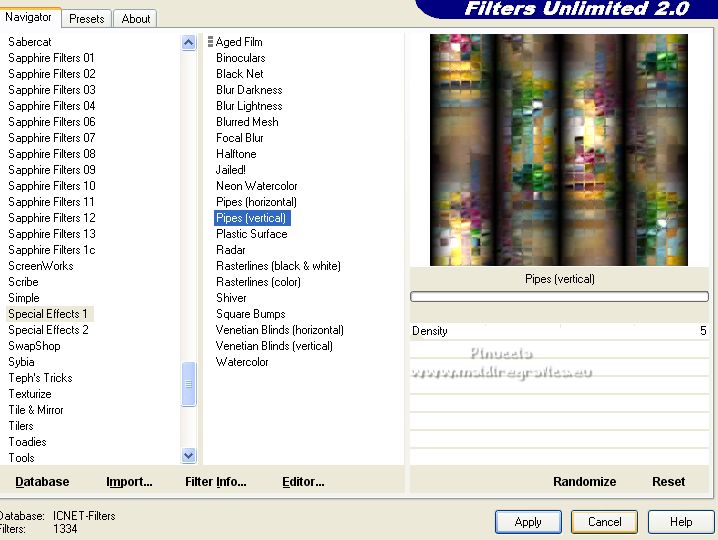 Effects>Plugins>Filters Unlimited 2.0 - Special Effects 1 - Pipes (vertical).
