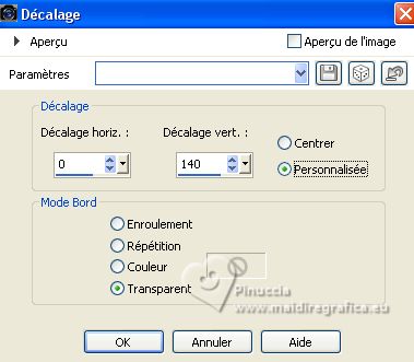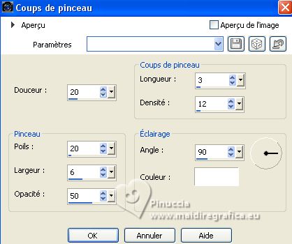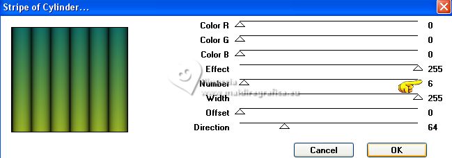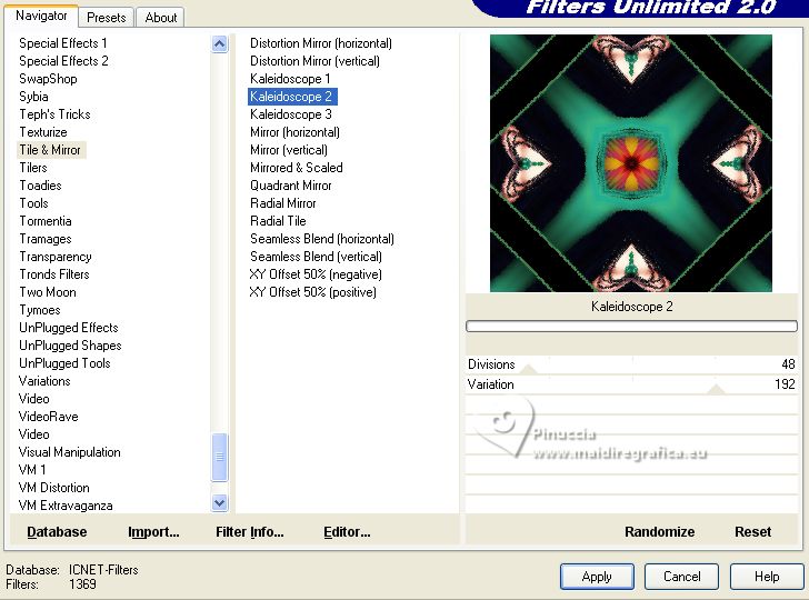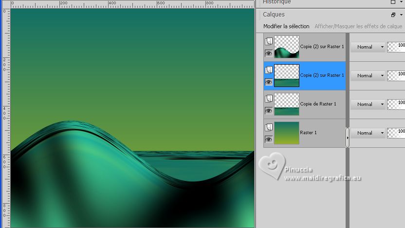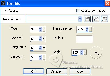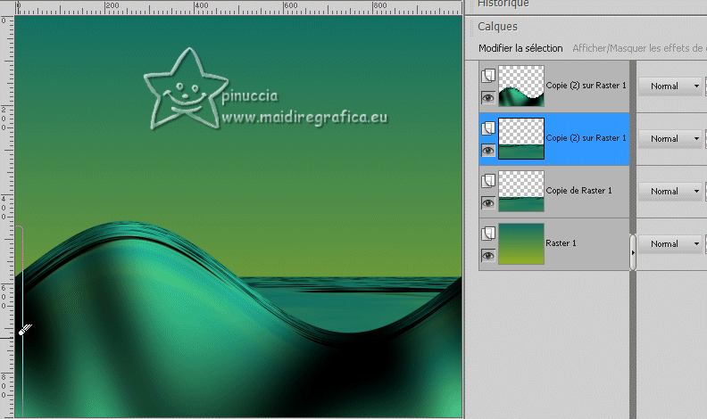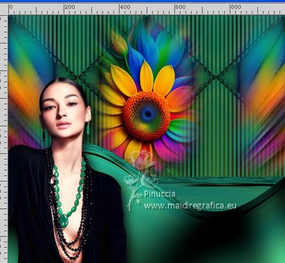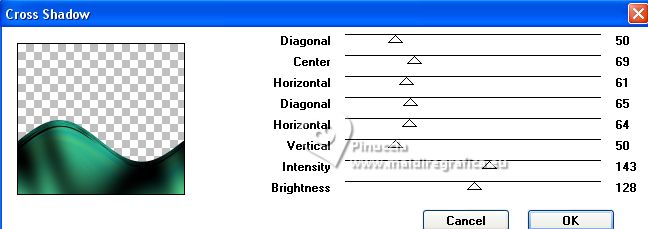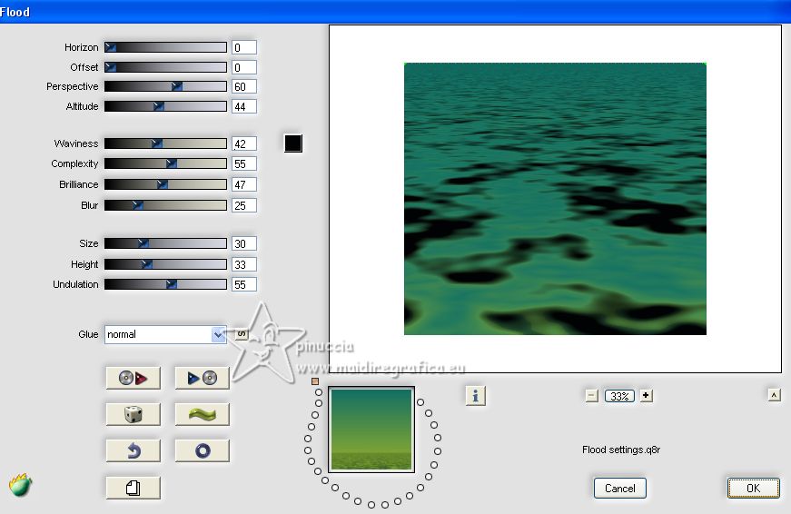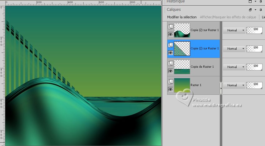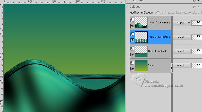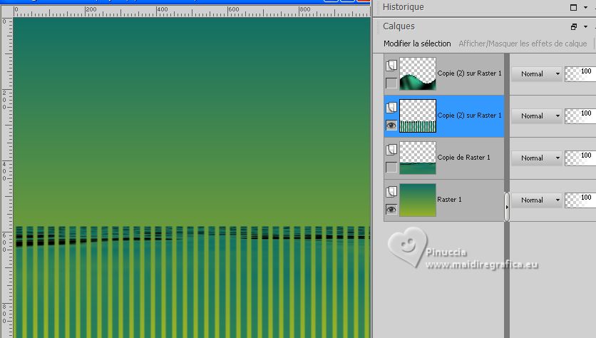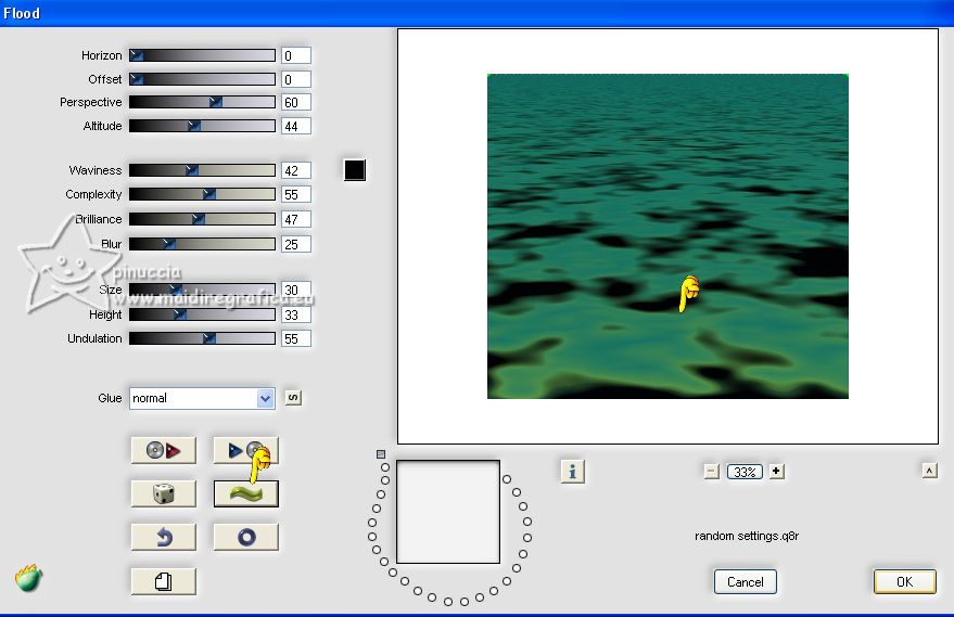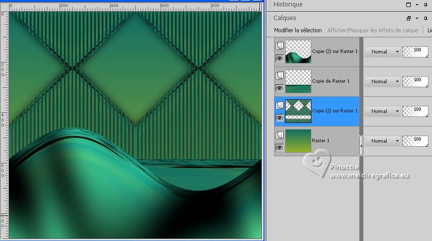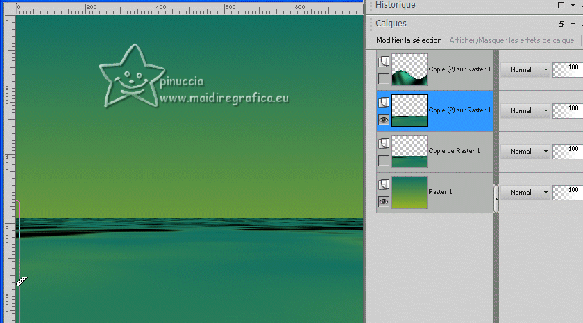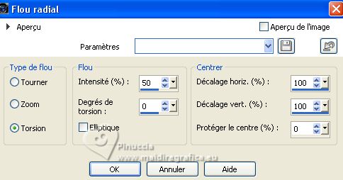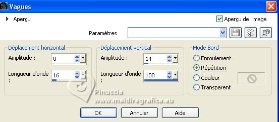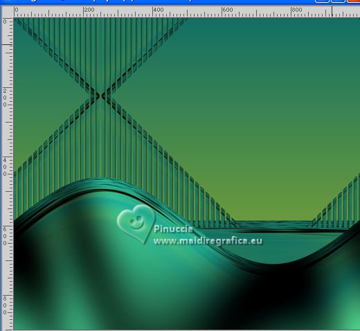 Le tutoriel a été créé avec PSP9 et traduit avec PSPX7, mais il peut également être exécuté avec les autres versions. Suivant la version utilisée, vous pouvez obtenir des résultats différents. Depuis la version X4, la fonction Image>Miroir a été remplacée par Image>Renverser horizontalement, et Image>Renverser avec Image>Renverser verticalement. Dans les versions X5 et X6, les fonctions ont été améliorées par la mise à disposition du menu Objets. Avec la nouvelle version X7, nous avons à nouveau Miroir/Retourner, mais avec nouvelles différences. Consulter, si vouz voulez, mes notes ici Certaines dénominations ont changées entre les versions de PSP. Les plus frequentes dénominations utilisées: ![]() traduction anglaise ici Vos versions ici![]() Nécessaire: 2 Tubes et un misted ![]() (ici les liens vers les sites des créateurs de tubes) ![]() consulter, si nécessaire, ma section de filtre ici Filters Unlimited 2.0 ici Flaming Pear - Flood ici Mura's Meister - Perspective Tiling ici Mura's Seamless - Stripe of Cylinder ici FM Tile Tools - Saturation Emboss ici Simple - Zoom out and flip ici Graphics Plus - Cross Shadow ici Filtres Mura's Seamless, Graphics Plus et Simple peuvent être utilisés seuls ou importés dans Filters Unlimited. voir comment le faire ici). Si un filtre est fourni avec cette icône, ![]() N'hésitez pas à changer le mode mélange des calques et leur opacité selon les couleurs utilisées. Dans les plus récentes versions de PSP, vous ne trouvez pas le dégradé d'avant plan/arriére plan ou Corel_06_029. Vous pouvez utiliser le dégradé des versions antérieures. Ici le dossier Dégradés de CorelX. ![]() 1. Ouvrir une nouvelle image transparente 1000 x 900 pixels. 2. Placer en avant plan la couleur #98b128, et en arrière plan la couleur #136f64. ![]() Préparer en avant plan un dégradé de premier plan/arrière plan, style Linéaire. ![]() Remplir l'image transparente du dégradé.3. Calques>Dupliquer. 4. Effets>Modules Externes>Flaming Pear - Flood. ![]() le flux des vagues est aléatoire; si vous voulez le changer, cliquer sur l'icône de la vague jusqu'à ce que vous soyez satisfait du résultat. Pour obtenir un meilleur résultat final, il est important de garder de nombreuses zones claires ![]() 5. Effets>Modules Externes>Mura's Meister - Perspective Tiling. ![]() 6. Calques>Dupliquer. 7. Effets>Effets de distorsion>Vagues. ![]() 8. Effets>Modules Externes>Graphics Plus - Cross Shadow. ![]() 9. Vous positionner sur le calque Copie de Raster 1. Calques>Dupliquer. ![]() 10. Activer l'outil Gomme avec ces réglages.![]() Tenir enfoncé la touche gauche de la souris et passer l'outil de gauche à droite ![]() Pour voir mieux, fermer les calques de dessous et de dessus ![]() ![]() Calques>Afficher>Tous Ne vous inquiètez pas si vous ne voyez toujours pas le résultat - c'est normal. ![]() 11. Effets>Effets géométriques>Inclinaison. ![]() Vous devriez avoir ceci ![]() 12. Effets>Effets 3D>Ombre portée. ![]() 13. Effets>Effets d'image>Décalage. ![]() 14. Effets>Modules Externes>Simple - Zoom out and flip Cet effet travaille sans fenêtre. Résultat ![]() 15. Effets>Effets de réflexion>Miroir rotatif. ![]() 16. Calques>Agencer>Déplacer vers le bas. 17. Effets>Effets 3D>Ombre portée. ![]() ![]() 18. Ouvrir le misted Misted-LuzCristina ![]() Édition>Copier. Revenir sur votre travail et Édition>Coller comme nouveau calque. 19. Effets>Effets d'image>Décalage, comme précédemment. ![]() 20. Calques>Dupliquer. Calques>Agencer>Déplacer vers le bas. 21. Réglage>Flou>Flou radial ![]() 22. Effets>Effets d'image>Mosaïque sans jointures. ![]() 23. Effets>Effets de réflexion>Miroir rotatif, comme précédemment ![]() 24. Effets>Effets de textures>Torchis ![]() 25. Vous positionner sur le calque Raster 1. ![]() Effets>Modules Externes>Mura's Seamless - Stripe of cylinder. ![]() 26. Effets>Modules Externes>FM Tile Tools - Saturation Emboss (optionnel) ![]() 27. Vous positionner sur le calque du haut de la pile. Ouvrir le tube de la femme ![]() Édition>Copier. Revenir sur votre travail et Édition>Coller comme nouveau calque. Déplacer le tube en bas à gaucheEffets>Effets 3D>Ombre portée, à choix. ![]() 28. Ouvrir le texte Texto ![]() Édition>Copier. Revenir sur votre travail et Édition>Coller comme nouveau calque. Déplacer le texte en bas à droite.Le texte a déjà son ombre portée. 29. Image>Ajouter des bordures, 3 pixels, symétrique, couleur foncée. Image>Ajouter des bordures, 2 pixels, symétrique, couleur claire. Image>Ajouter des bordures, 3 pixels, symétrique, couleur foncée. Image>Ajouter des bordures, 2 pixels, symétrique, couleur claire. Image>Ajouter des bordures, 60 pixels, symétrique, couleur noire. 30. Activer l'outil Baguette magique , tolérance et progressivité 0,et cliquer dans le dernier bord pour le sélectionner. Effets>Modules Externes>Filters Unlimited 2.0 - Tile & Mirror - Kaleidoscope 2, par défaut. ![]() 31. Effets>Effets de traits ou Effets Art Média>Coups de pinceau. ![]() 32. Effets>Effets 3D>Biseautage intérieur. ![]() Sélections>Désélectionner tout. 33. Image>Ajouter des bordures, 2 pixels, symétrique, couleur claire. 34. Image>Redimensionner, à 83%, redimensionner tous les calques coché. 35. Signer votre travail et enregistrer en jpg. ![]() ![]() ![]() Si vous avez des problèmes, ou des doutes, ou vous trouvez un link modifié, ou seulement pour me dire que ce tutoriel vous a plu, vous pouvez m'écrire. |