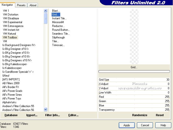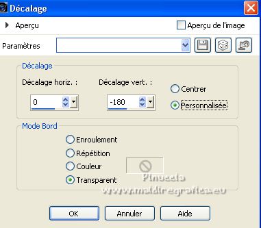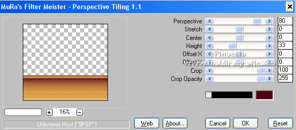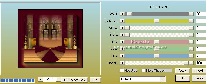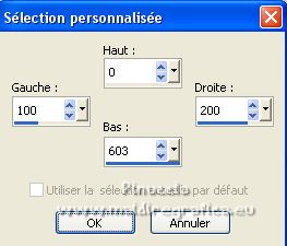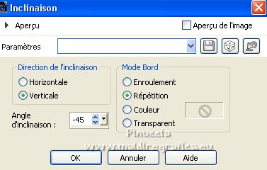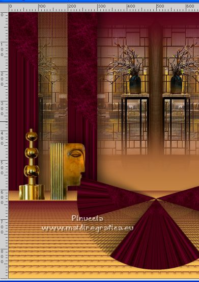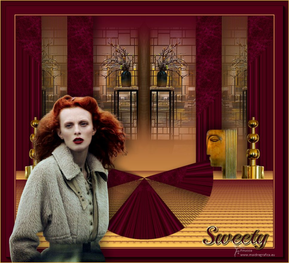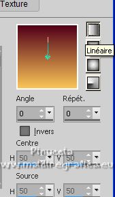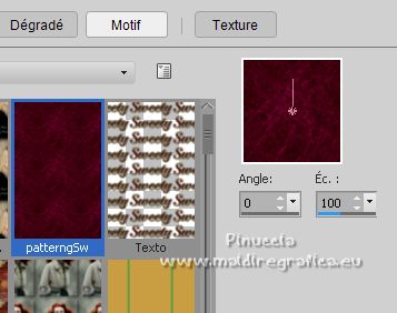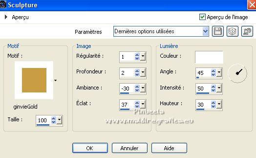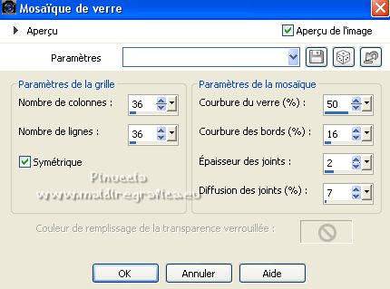 Le tutoriel a été créé avec PSP9 et traduit avec PSPX7, mais il peut également être exécuté avec les autres versions. Suivant la version utilisée, vous pouvez obtenir des résultats différents. Depuis la version X4, la fonction Image>Miroir a été remplacée par Image>Renverser horizontalement, et Image>Renverser avec Image>Renverser verticalement. Dans les versions X5 et X6, les fonctions ont été améliorées par la mise à disposition du menu Objets. Avec la nouvelle version X7, nous avons à nouveau Miroir/Retourner, mais avec nouvelles différences. Consulter, si vouz voulez, mes notes ici Certaines dénominations ont changées entre les versions de PSP. Les plus frequentes dénominations utilisées: ![]() traduction anglaise ici Vos versions ici![]() Nécessaire ![]() (ici les liens vers les sites des créateurs de tubes) ![]() consulter, si nécessaire, ma section de filtre ici Filters Unlimited ici VM Toolbox - Grid ici Mura's Meister - Perspective Tiling ici AAA Frames - Foto Frame ici Filtres VM Toolbox peuvent être utilisés seuls ou importés dans Filters Unlimited. voir comment le faire ici). Si un filtre est fourni avec cette icône, ![]() Si vous voulez utiliser vos propres couleurs, n'hésitez pas à changer le mode et l'opacité des calques Dans les plus récentes versions de PSP, vous ne trouvez pas le dégradé d'avant plan/arrière plan ou Corel_06_029. Vous pouvez utiliser le dégradés des versions antérieures. Ici le dossier Dégradés de CorelX. ![]() Placer le motif patterngGold dans le dossier Motifs. Ouvrir le motif gSwGold dans PSP et le minimiser avec le reste du matériel. 1. Ouvrir une nouvelle image transparente 300 x 603 pixels. ![]() 2. Placer en avant plan le Motif et sélectionner le motif patterngSw ![]() 3. Activer l'outil Sélection ![]() (peu importe le type de sélection, parce que avec la sélection personnalisée vous obtenez toujours un rectangle), cliquer sur Sélection personnalisée ![]() et setter ces paramétres. ![]() Remplir la sélection avec le motif d'avant plan.Sélections>Désélectionner tout. 4. Sélection personnalisée ![]() ![]() 5. Effets>Modules Externes>Filters Unlimited 2.0 - VM Toolbox - Grid, par défaut ![]() Résultat ![]() 6. Effets>Effets de textures>Sculpture - chercher et sélection le motif gSwGold ![]() Sélections>Désélectionner tout. 7. Sélection personnalisée ![]() ![]() Remplir avec la texture d'avant plan.Sélections>Désélectionner tout. 8. Image>Taille du support - 1000 x 630 pixels. ![]() 9. Effets>Effets géométriques>Inclinaison. ![]() 10. Calques>Dupliquer. Image>Miroir. Calques>Fusionner>Fusionner le calque de dessous. 11. Image>Taille du support - 1000 x 900 pixels. ![]() 12. Effets>Effets 3D>Ombre portée. ![]() 13. Placer en avant plan la couleur #fac457 et en arrière plan la couleur #520018. ![]() Préparer en avant plan un dégradé de premier plan/arrière plan, style Linéaire. ![]() 14. Calques>Nouveau calque raster. Calques>Agencer>Placer en bas de la pile. Remplir le calque du dégradé.15. Calques>Dupliquer. Effets>Effets de texture>Mosaïque de verre. ![]() 16. Effets>Modules Externes>Mura's Meister - Perspective Tiling. ![]() 17. Ouvrir le misted misted-luzcristina ![]() Édition>Copier. Revenir sur votre travail et Édition>Coller comme nouveau calque. 18. Effets>Effets d'image>Décalage (cette étape dépend de la dimension de votre tube; vous pouvez le sauter, ou déplacer le tube à votre goût). ![]() 19. Effets>Effets d'image>Mosaïque sans jointures ![]() 20. Vous positionner sur le calque du haut de la pile, Raster 1. Calques>Dupliquer. 21. Effets>Effets de distorsion>Coordonnées polaires. ![]() 22. Image>Miroir>Miroir vertical (Image>Renverser). Image>Redimensionner, à 80%, redimensionner tous les calques décoché. 23. Effets>Effets d'image>Décalage. ![]() 24. Ouvrir le deco Deco-Luz Cristina ![]() Édition>Copier. Revenir sur votre travail et Édition>Coller comme nouveau calque. Déplacer le tube à gauche, voir mon exemple.![]() Effets>Effets 3D>Ombre portée, comme précédemment. 25. Calques>Dupliquer. Image>Miroir. 26. Image>Ajouter des bordures, 3 pixels, symétrique, couleur foncée. Image>Ajouter des bordures, 2 pixels, symétrique, couleur claire. Image>Ajouter des bordures, 55 pixels, symétrique, couleur foncée. 27. Effets>Modules Externes>AAA Frames - Foto Frame. ![]() 28. Ouvrir le tube de la femme 7733-LuzCristina ![]() Édition>Copier. Revenir sur votre travail et Édition>Coller comme nouveau calque. Déplacer le tube à gauche.Effets>Effets 3D>Ombre portée, à choix. 29. Ouvrir le texte texto ![]() Édition>Copier. Revenir sur votre travail et Édition>Coller comme nouveau calque. Déplacer le tube en bas à droite.30. Image>Ajouter des bordures, 2 pixels, symétrique, couleur claire. 31. Image>Redimensionner, à 86%, redimensionner tous les calques coché. 32. Signer votre travail et enregistrer en jpg. ![]() ![]() ![]() Si vous avez des problèmes, ou des doutes, ou vous trouvez un link modifié, ou seulement pour me dire que ce tutoriel vous a plu, vous pouvez m'écrire. |