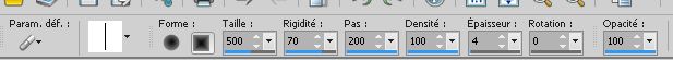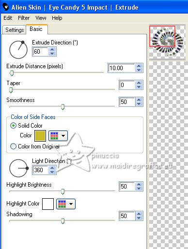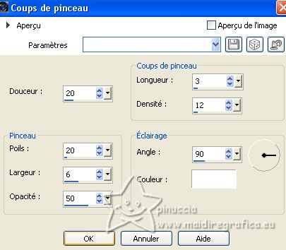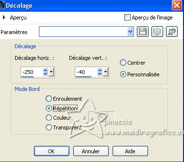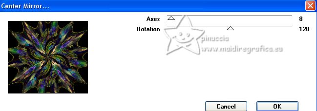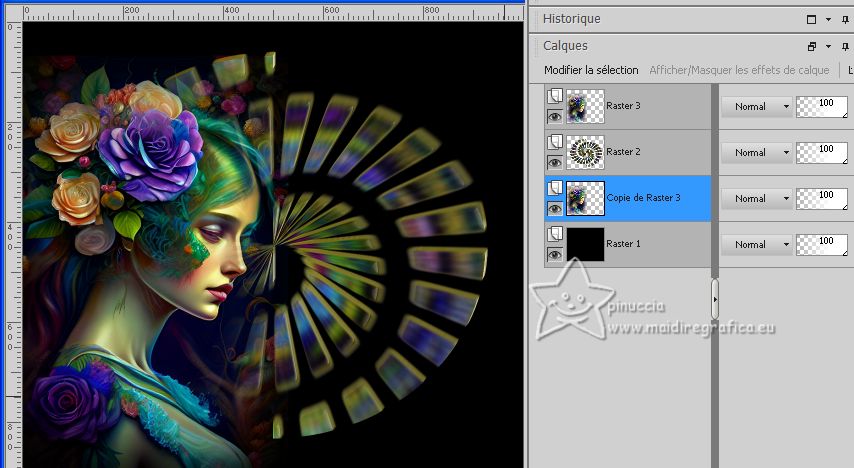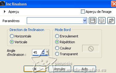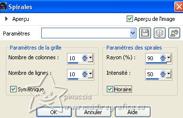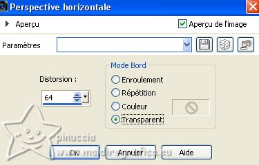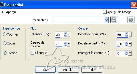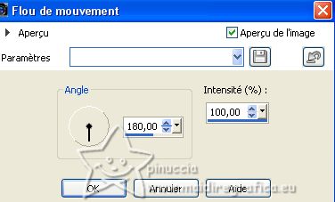 Le tutoriel a été créé avec PSP9 et traduit avec PSPX7, mais il peut également être exécuté avec les autres versions. Suivant la version utilisée, vous pouvez obtenir des résultats différents. Depuis la version X4, la fonction Image>Miroir a été remplacée par Image>Renverser horizontalement, et Image>Renverser avec Image>Renverser verticalement. Dans les versions X5 et X6, les fonctions ont été améliorées par la mise à disposition du menu Objets. Avec la nouvelle version X7, nous avons à nouveau Miroir/Retourner, mais avec nouvelles différences. Consulter, si vouz voulez, mes notes ici Certaines dénominations ont changées entre les versions de PSP. Les plus frequentes dénominations utilisées: ![]() traduction anglaise ici Vos versions ici![]() Nécessaire ![]() (ici les liens vers les sites des créateurs de tubes) ![]() consulter, si nécessaire, ma section de filtre ici Filters Unlimited 2.0 ici VM Distortion - Center Mirror ici Alien Skin Eye Candy 5 Impact - Extrude ici FM Tile Tools - Saturation Emboss ici Filtres VM Distortion peuvent être utilisés seuls ou importés dans Filters Unlimited. voir comment le faire ici). Si un filtre est fourni avec cette icône, ![]() N'hésitez pas à changer le mode mélange des calques et leur opacité selon les couleurs utilisées. ![]() 1. Ouvrir une nouvelle image transparente 1000 x 900 pixels. 2. Placer en avant plan la couleur #000000, et en arrière plan la couleur #ccbb28. ![]() Remplir l'image transparente avec la couleur noire #000000.3. Calques>Nouveau calque raster. Selections>Select All. Ouvrir le fractal ![]() Édition>Copier. Revenir sur votre travail et Édition>Coller dans la sélection. Sélections>Désélectionner tout. 4. Effets>Effets géométriques>Perspective horizontale. ![]() 5. Image>Miroir. Répéter Effets>Effets géométriques>Perspective horizontale, comme précédemment. ![]() 6. Activer l'outil Gomme , avec ces réglages.![]() 7. Passer la souris de gauche à droite, de côte à côte. ![]() ![]() 8. Réglage>Flou>Flou directionnel ou Flou de mouvement. ![]() Édition>Répéter Flou de mouvement. 9. Effets>Effets géométriques>Inclinaison. ![]() 10. Effets>Effets de distorsion>Coordonées polaires. ![]() 11. Calques>Dupliquer. Image>Miroir. Image>Renverser. 12. Calques>Fusionner>Fusionner le calque de dessous. 13. Image>Redimensionner, à 85%, redimensionner tous les calques décoché. 14. Effets>Modules Externes>Alien Skin Eye Candy 5 Impact - Extrude Solid Color: couleur claire d'arrière plan #ccbb28. ![]() 15. Effets>Modules Externes>FM Tile Tools - Saturation Emboss, par défaut. ![]() 16. Ouvrir le tube 7971 Luz Cristina ![]() Édition>Copier. Revenir sur votre travail et Édition>Coller comme nouveau calque. 17. Effets>Effets d'image>Décalage. ![]() 18. Calques>Dupliquer. Calques>Fusionner>Fusionner le calque de dessous (optionnel). 19. Calques>Dupliquer. Calques>Agencer>Déplacer vers le bas - 2 fois. ![]() 20. Réglage>Flou>Flou radial. ![]() 21. Effets>Effets d'image>Mosaïque sans jointures, par défaut. ![]() 22. Image>Miroir. 23. Effets>Effets de réflexion>Miroir rotatif. ![]() 24. Effets>Effets de traits ou Effets Art Média>Coups de pinceau ![]() 25. Effets>Effets de distorsion>Spirales. ![]() 26. Effets>Modules Externes>FM Tile Tools - Saturation Emboss, par défaut (optionnel). ![]() 27. Image>Ajouter des bordures, 3 pixels, symétrique, couleur #000000. Image>Ajouter des bordures, 3 pixels, symétrique, couleur claire d'arrière plan #ccbb28. Image>Ajouter des bordures, 3 pixels, symétrique, couleur #000000. Image>Ajouter des bordures, 3 pixels, symétrique, couleur claire d'arrière plan #ccbb28. Image>Ajouter des bordures, 55 pixels, symétrique, couleur #000000. Activer l'outil Baguette magique ![]() et cliquer dans le dernier bord pour le sélection. 28. Effets>Modules Externes>VM Distortion - Center Mirror ![]() 29. Effets>Modules Externes>FM Tile Tools - Saturation Emboss, par défaut. Sélections>Désélectionner tout. Image>Redimensionner, à 85%, redimensionner tous les calques coché. 30. Ouvrir le texte ![]() Édition>Copier. Revenir sur votre travail et Édition>Coller comme nouveau calque. Positionner bien le texte.31. Image>Ajouter des bordures, 2 pixels, symétrique, couleur claire d'arrière plan #ccbb28. 32. Signer votre travail et enregistrer en jpg. Pour les tubes de cette version merci Luz Cristina. ![]() ![]() Si vous avez des problèmes, ou des doutes, ou vous trouvez un link modifié, ou seulement pour me dire que ce tutoriel vous a plu, vous pouvez m'écrire. |