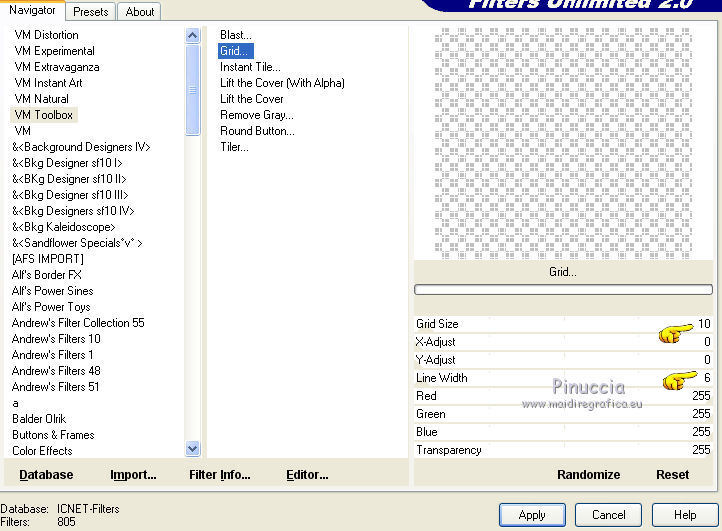 2. Effets>Modules Externes>Filters Unlimited 2.0 - VM Toolbox - Grid.