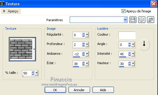 Effets>Effets de textures>Texture - Sélectionner le texture Bricks avec ces règlages.