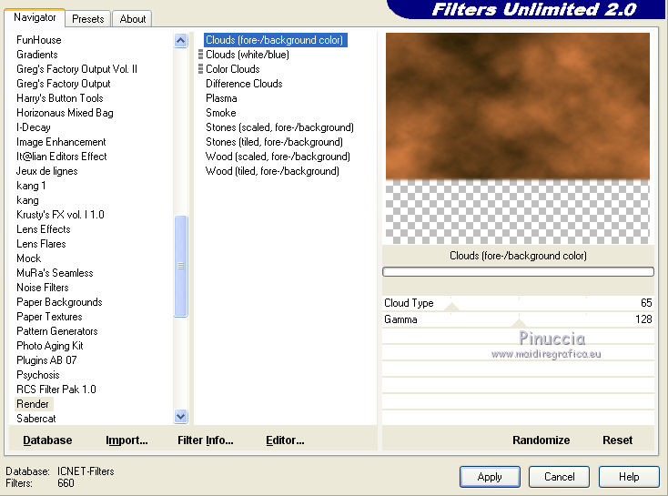 8. Effets>Modules Externes>Filters Unlimited 2.0 - Render - Clouds fore/background color, par défaut.