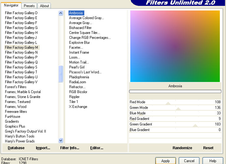 Effets>Modules Externes>Filters Unlimited 2.0 - Filter Factory Gallery M - Ambrosia, par défaut.