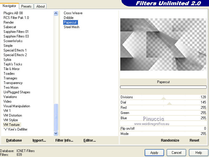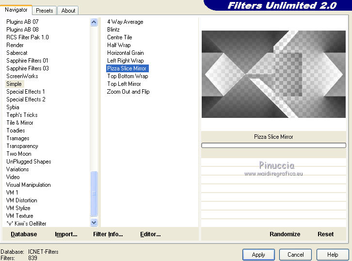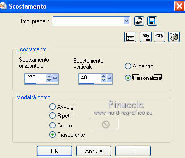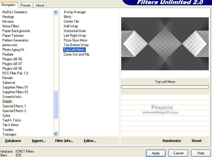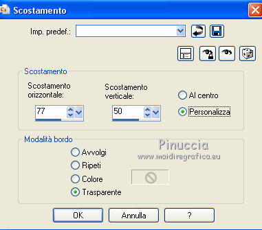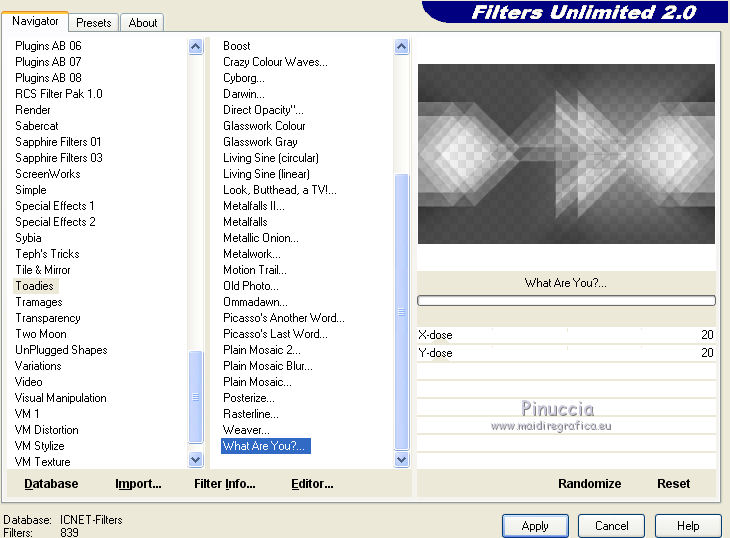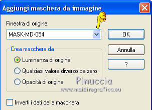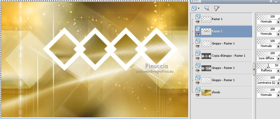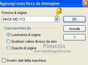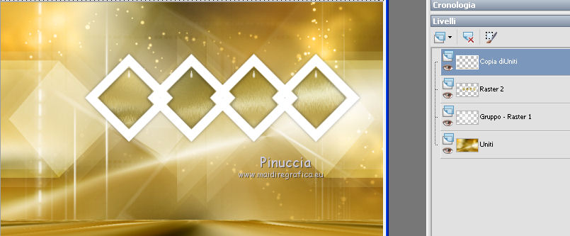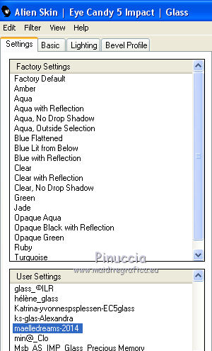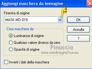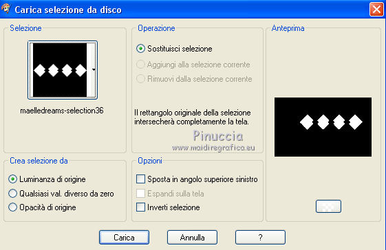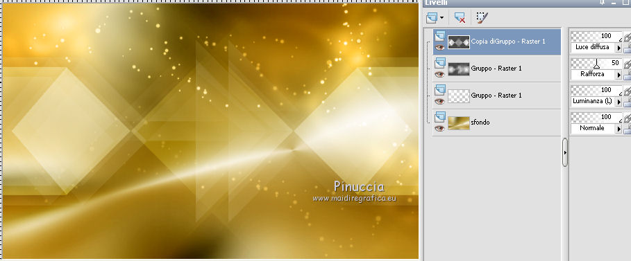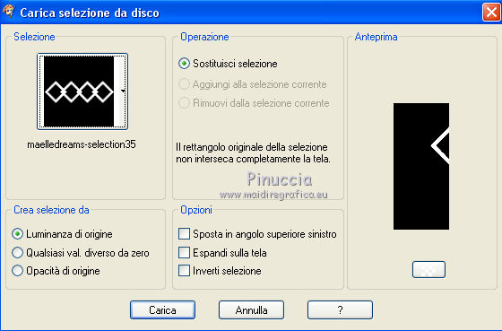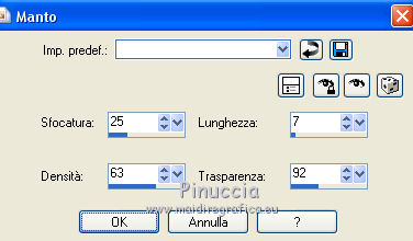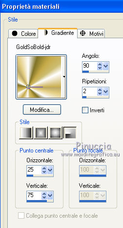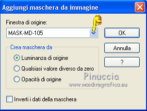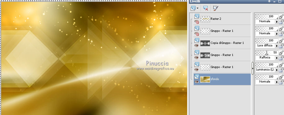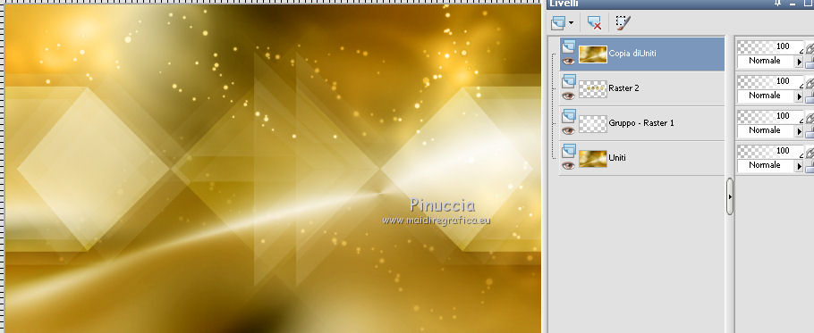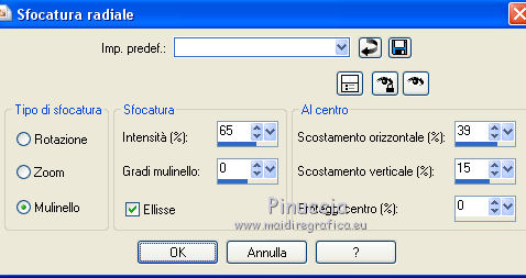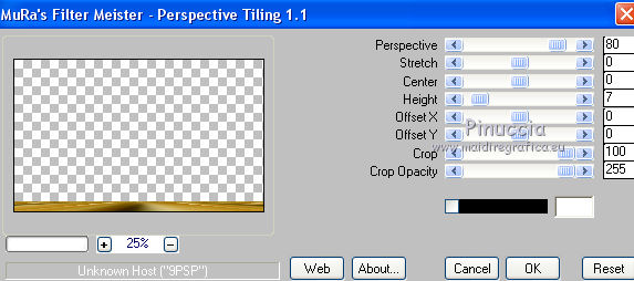 qui puoi trovare qualche risposta ai tuoi dubbi. Se l'argomento che ti interessa non è presente, ti prego di segnalarmelo. Questo tutorial è stato scritto con PSP X2, ma può essere eseguito anche con le altre versioni di PSP. Dalla versione X4, il comando Immagine>Rifletti è stato sostituito con Immagine>Capovolgi in orizzontale, e il comando Immagine>Capovolgi con Immagine>Capovolgi in verticale. Nelle versioni X5 e X6, le funzioni sono state migliorate rendendo disponibile il menu Oggetti. Vedi la scheda sull'argomento qui Per tradurre questo tutorial ho usato PSP X. Occorrente: Materiale qui Il materiale utilizzato è di Maelle. Filtri in caso di dubbi, ricorda di consultare la mia sezione filtri qui Filters Unlimited 2.0 qui Toadies - What are you qui Simple - Top Left Mirror, Pizza Slice Mirror qui VM Texture - Papercut qui Alien Skin Eye Candy 5 Impact - Glass qui Adjust - Variations qui Mura's Meister - Perspective Tiing qui I filtri Toadies, Simple, e VM Texture si possono usare da soli o importati in Filters Unlimited (come fare vedi qui) Se un effetto fornito appare con questa icona Metti il preset Cliccando sul file una o due volte (a seconda delle tue impostazioni), automaticamente il preset si installerà nella cartella corretta. perchè uno o due clic vedi qui Metti il gradiente nella cartella Gradienti. Metti le selezioni nella cartella Selezioni. Apri le maschere in PSP e minimizzale con il resto del materiale. 1. Passa il colore di primo piano a Gradiente, e seleziona il gradiente GoldSoBold-jdr, con i seguenti settaggi. ![]() 2. Apri una nuova immagine trasparente 900 x 550 pixels. ![]() Riempi l'immagine trasparente con il gradiente.3. Regola>Sfocatura>Sfocatura radiale. ![]() 4. Effetti>Plugins>Adjust - Variation un clic su Original, per annullare eventuali precedenti settaggi memorizzati dal filtro, due clic su Darker e ok. Rinomina questo livello "sfondo". 5. Imposta il colore di primo piano con il colore bianco #ffffff. Livelli>Nuovo livello raster. Riempi il livello con il colore bianco.Livelli>Nuovo livello maschera>Da immagine. Apri il menu sotto la finestra di origine e vedrai la lista dei files aperti. Seleziona la maschera MASK-MD-120, con i seguenti settaggi. ![]() Livelli>Unisci>Unisci gruppo. Cambia la modalità di miscelatura di questo livello in Luminanza (esistente). 6. Livelli>Nuovo livello raster. Riempi il livello con il colore bianco.Livelli>Nuovo livello maschera>Da immagine. Apri il menu sotto la finestra di origine e seleziona la maschera MASK-MD-113, con i seguenti settaggi. ![]() Livelli>Unisci>Unisci gruppo. Cambia la modalità di miscelatura di questo livello in Rafforza, e abbassa l'opacità al 50%. 7. Effetti>Plugins>Filters Unlimited 2.0 - VM Texture - Papercut. ![]() 8. Effetti>Plugins>Filters Unlimited 2.0 - Simple - Pizza Slice Mirror. ![]() Ripeti l'Effetto una seconda volta. 9. Livelli>Duplica, e attiva il livello sottostante dell'originale. 10. Effetti>Plugins>Filters Unlimited 2.0 - Toadies - What are you, con i settaggi standard. ![]() 11. Attiva il livello superiore. Effetti>Plugins>Filters Unlimited 2.0 - Simple - Top Left Mirror. ![]() Cambia la modalità di miscelatura di questo livello in Luce diffusa, e riporta l'opacità a 100. ![]() 12. Livelli>Nuovo livello raster. Riempi il livello con il colore bianco.Livelli>Nuovo livello maschera>Da immagine. Apri il menu sotto la finestra di origine e seleziona la maschera MASK-MD-054, con i seguenti settaggi. ![]() Livelli>Unisci>Unisci gruppo. Immagine>Rifletti. 13. Livelli>Nuovo livello raster. Selezione>Carica/Salva selezione>Carica selezione da disco. Cerca e carica la selezione maelledreams-selection35. ![]() Riempi la selezione con il colore bianco.Selezione>Deseleziona. 14. Attiva il livello di sfondo e vai a Modifica>Copia. Attiva nuovamente il livello superiore. Livelli>Nuovo livello raster. 15. Selezione>Carica/Salva selezione>Carica selezione da disco. Cerca e carica la selezione maelledreams-selection36. ![]() Selezione>Modifica>Espandi - 5 pixels. Modifica>Incolla nella selezione. 16. Effetti>Effetti di trama>Manto. ![]() 17. Regola>Messa a fuoco>Accentua messa a fuoco. Selezione>Deseleziona. Livelli>Disponi>Sposta giù. ![]() 18. Selezione>Carica/Salva selezione>Carica selezione da disco. Carica nuovamente la selezione maelledreams-selection36. ![]() 19. Effetti>Plugins>Alien Skin Eye Candy 5 Impact - Glass. Seleziona il preset maelledreams-2014 e ok. ![]() Questi i settaggi che, in caso di problemi con il preset, puoi impostare manualmente. ![]() Selezione>Deseleziona. 20. Attiva il livello superiore. Livelli>Unisci>Unisci giù. 21. Effetti>Effetti 3D>Sfalsa ombra. ![]() 22. Chiudi i due livelli superiori e attiva il livello di sfondo. ![]() 23. Livelli>Unisci>Unisci visibile. Livelli>Duplica. Livelli>Disponi>Porta in alto. 24. Riapri i livelli chiusi e rimani posizionato sul livello superiore. ![]() 25. Effetti>Plugins>Mura's Meister - Perspective Tiling. ![]() Dovresti avere questo. ![]() 26. Apri 2014.png, e vai a Modifica>Copia. Torna al tuo lavoro e vai a Modifica>Incolla come nuovo livello. Effetti>Effetti di immagine>Scostamento. ![]() 27. Apri decotext-2014.png, e vai a Modifica>Copia. Torna al tuo lavoro e vai a Modifica>Incolla come nuovo livello. Effetti>Effetti di immagine>Scostamento. ![]() 28. Apri maelledreams-exclusif2014.png, e vai a Modifica>Copia. Torna al tuo lavoro e vai a Modifica>Incolla come nuovo livello. Effetti>Effetti di immagine>Scostamento. ![]() 29. Livelli>Unisci>Unisci visibile. 30. Livelli>Nuovo livello raster. Riempi il livello con il colore #8f4d0e.Livelli>Nuovo livello maschera>Da immagine. Apri il menu sotto la finestra di origine e seleziona la maschera MASK-MD-105, con i seguenti settaggi. ![]() Livelli>Unisci>Unisci gruppo. Cambia la modalità di miscelatura di questo livello in Rafforza, e abbassa l'opacità al 53%. 31. Livelli>Nuovo livello raster. Riempi il livello con il colore bianco.Livelli>Nuovo livello maschera>Da im