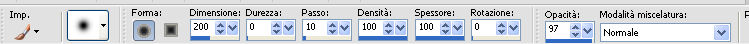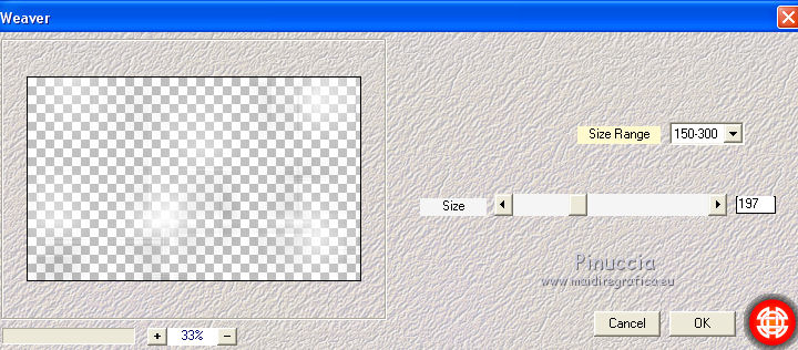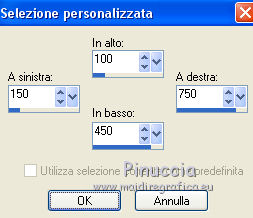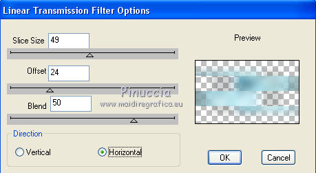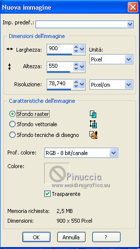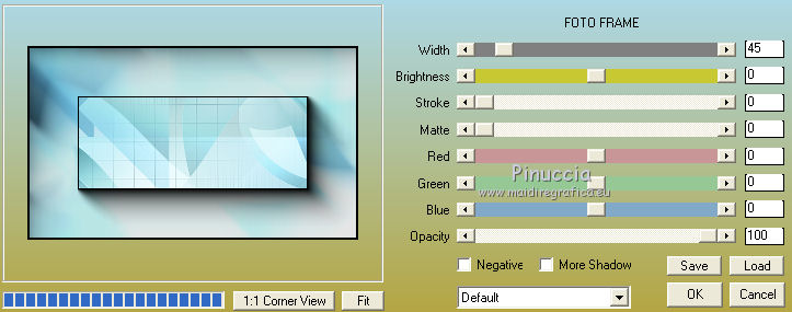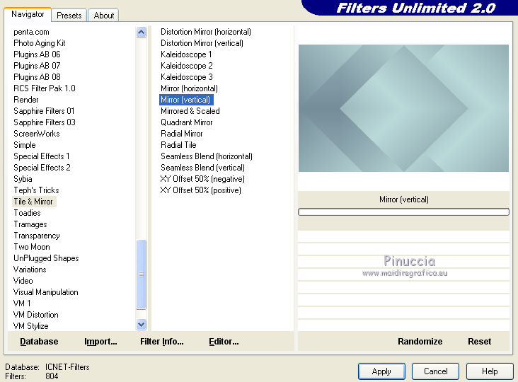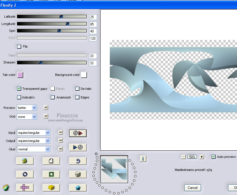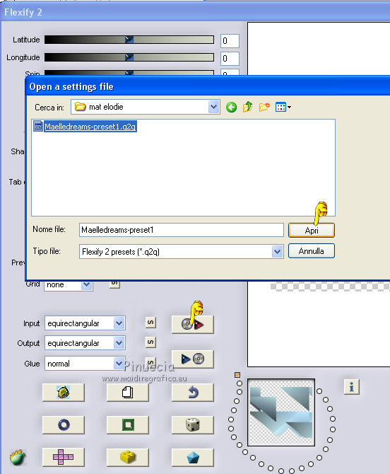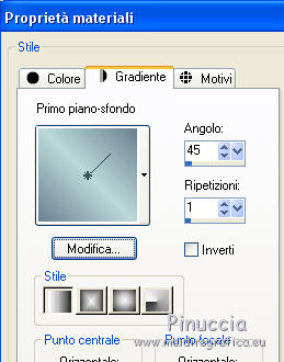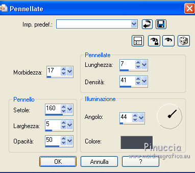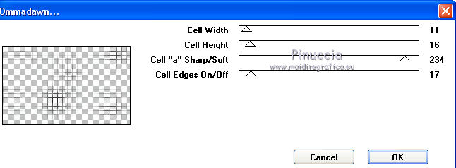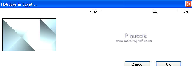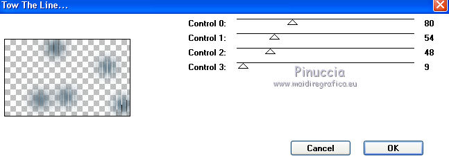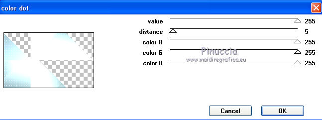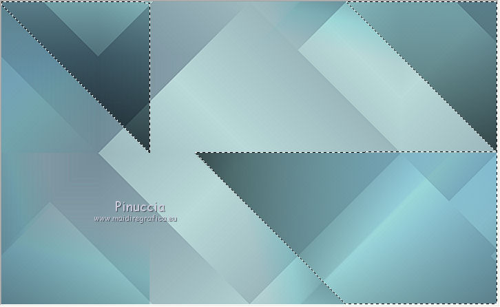 qui puoi trovare qualche risposta ai tuoi dubbi. Se l'argomento che ti interessa non è presente, ti prego di segnalarmelo. Questo tutorial è stato scritto con PSP X2, ma può essere eseguito anche con le altre versioni di PSP. Dalla versione X4, il comando Immagine>Rifletti è stato sostituito con Immagine>Capovolgi in orizzontale, e il comando Immagine>Capovolgi con Immagine>Capovolgi in verticale. Nelle versioni X5 e X6, le funzioni sono state migliorate rendendo disponibile il menu Oggetti. Vedi la scheda sull'argomento qui Per tradurre questo tutorial ho usato PSP X. Occorrente: Materiale qui Il materiale utilizzato è di Maelle. Filtri in caso di dubbi, ricorda di consultare la mia sezione filtri qui Simple - Blintz qui Simple - Top Bottom Wrap (bonus) qui Flaming Pear - Flexify 2 qui AAA Frames - Foto Frame qui Penta.com - Color Dot qui Tramages - Holiday in Egypt, Tow the line qui Mehdi - Weaver qui Toadies - Ommadawn qui Dsb Flux - Linear Transmission qui I filtri Toadies, Tramages, Penta.com e Simple si possono usare da soli o importati in Filters Unlimited (come fare vedi qui) Se un effetto fornito appare con questa icona Metti il preset Maelledreams-preset1 nella cartella del filtro Flexify. Se preferisci, puoi importarlo direttamente dalla cartella in cui hai salvato il materiale, quando ti servirà. 1. Apri una nuova immagine trasparente 900 x 550 pixels. ![]() 2. Imposta il colore di primo piano con #6a818f, e il colore di sfondo con #bad9d9. ![]() Passa il colore di primo piano a Gradiente di primo piano/sfondo, stile Lineare. ![]() 3. Effetti>Plugins>Simple - Blintz. Modifica>Ripeti Blintz. 4. Effetti>Plugins>Filters Unlimited 2.0 - Tile & Mirror - Mirror (vertical). ![]() 5. Effetti>Plugins>Simple - Blintz. Regola>Messa a fuoco>Accentua messa a fuoco. 6. Livelli>Nuovo livello raster. Riempi con il gradiente.7. Effetti>Plugins>Tramages - Holidays in Egypt. ![]() 8. Immagine>Rifletti. Immagine>Capovolgi. Cambia la modalità di miscelatura di questo livello in Moltiplica. 9. Effetti>Plugins>Simple - Top Bottom Wrap. 10. Attiva lo strumento Selezione a mano libera , da punto a punto.![]() Selezione i tre triangoli come mostrato nella schermata sotto. ![]() Premi sulla tastiera il tasto CANC ![]() 11. Selezione>Inverti. Effetti>Plugins>Penta.com - Color Dot. ![]() Selezione>Deseleziona. 12. Apri il tube "triangle" e vai a Modifica>Copia. Torna al tuo lavoro e vai a Modifica>Incolla come nuovo livello. Cambia la modalità di miscelatura di questo livello in Luce netta. 13. Livelli>Duplica. Effetti>Plugins>Flaming Pear - Flexify 2. Clicca sull'icona della freccia e cerca, nella cartella in cui lo hai salvato, il preset Maelledreams-preset1 e clicca Apri per applicarlo. ![]() Questi i settaggi che, in caso di problemi con il preset, puoi impostare manualmente. ![]() 14. Livelli>Unisci>Unisci visibile. Livelli>Duplica. Immagine>Ridimensiona, al 67%, tutti i livelli non selezionato. 15. Imposta il colore di primo piano con il colore bianco. Livelli>Nuovo livello raster. 16. Attiva lo strumento Pennello ![]() seleziona il pennello standard +arrotondata50, con i seguenti settaggi. ![]() Applica alcuni cerchi sull'immagine, come nell'esempio, cliccando con il tasto sinistro del mouse per usare il colore bianco di primo piano. ![]() 17. Effetti>Plugins>Mehdi - Weaver. ![]() 18. Effetti>Plugins>Toadies - Ommadawn. ![]() 19. Abbassa l'opacità di questo livello al 50%. Livelli>Disponi>Sposta giù. 20. Attiva il livello superiore. Regola>Sfocatura>Sfocatura gaussiana - raggio 30. ![]() 21. Effetti>Plugins>DSB Flux - Linear Transmission. ![]() 22. Effetti>Plugins>Mehdi - Weaver, con i settaggi precedenti. Cambia la modalità di miscelatura di questo livello in Luce diffusa. 23. Riporta il colore di primo piano al colore iniziale #6a818f. Attiva nuovamente lo strumento Pennello , con i settaggi precedenti,e applica alcuni cerchi, come nell'esempio sotto, cliccando con il tasto sinistro del mouse per usare il colore di primo piano. ![]() 24. Effetti>Plugins>Tramages - Tow the line, con i settaggi standard. ![]() 25. Cambia la modalità di miscelatura di questo livello al 42%. 26. Livelli>Unisci>Unisci visibile. 27. Livelli>Duplica. 28. Attiva lo strumento Selezione ![]() clicca sull'icona Selezione personalizzata ![]() e imposta i seguenti settaggi. ![]() 29. Selezione>Inverti. Premi sulla tastiera il tasto CANC. 30. Selezione>Inverti. Effetti>Plugins>AAA Frames - Foto Frame. ![]() Selezione>Deseleziona. 31. Apri il tube "oeil" e vai a Modifica>Copia. Torna al tuo lavoro e vai a Modifica>Incolla come nuovo livello. Lascialo come sta. 32. Effetti>Effetti tecniche di disegno>Pennellate. colore scuro di primo piano. ![]() Abbassa l'opacità di questo livello al 50%. 33. Livelli>Unisci>Unisci giù. 34. Apri il file "text" e vai a Modifica>Copia. Torna al tuo lavoro e vai a Modifica>Incolla come nuovo livello. Lascialo come sta. 35. Livelli>Unisci>Unisci tutto. 36. Immagine>Aggiungi bordatura, 2 pixels, simmetriche, con il colore nero. Immagine>Aggiungi bordatura, 50 pixels, simmetriche, con il colore bianco. Immagine>Aggiungi bordatura, 2 pixels, simmetriche, con il colore nero. 37. Apri il tube maelledreams-femme49, e vai a Modifica>Copia. Torna al tuo lavoro e vai a Modifica>Incolla come nuovo livello. Immagine>Ridimensiona, al 68%, tutti i livelli non selezionato. 38. Effetti>Effetti di immagine>Scostamento. ![]() 39. Attiva lo strumento Gomma ![]() e cancella l'immagine il watermark e la piccola immagine. 40. Effetti>Effetti 3D>Sfalsa ombra. ![]() Firma il tuo lavoro. Livelli>Unisci>Unisci tutto e salva in formato jpg. Per questo esempio ho usato un tube di TalaNat ![]() ![]() Se hai problemi o dubbi, o trovi un link non funzionante, o anche soltanto per un saluto, scrivimi. 4 Novembre 2013 |