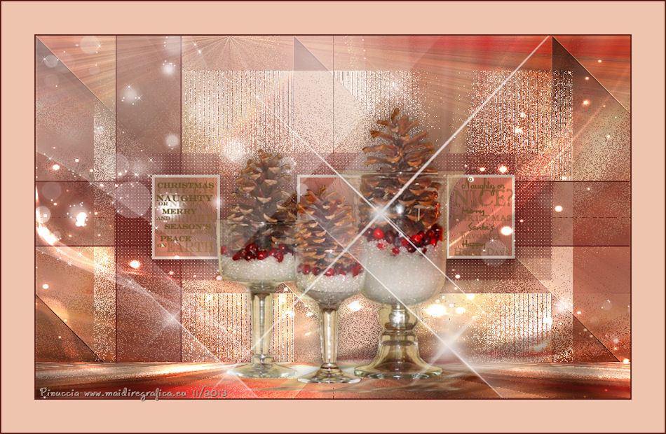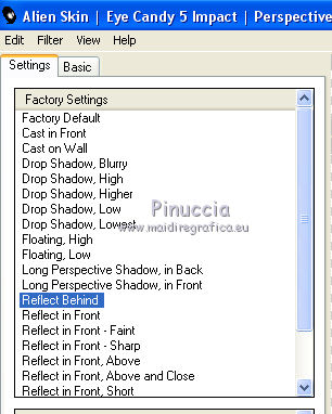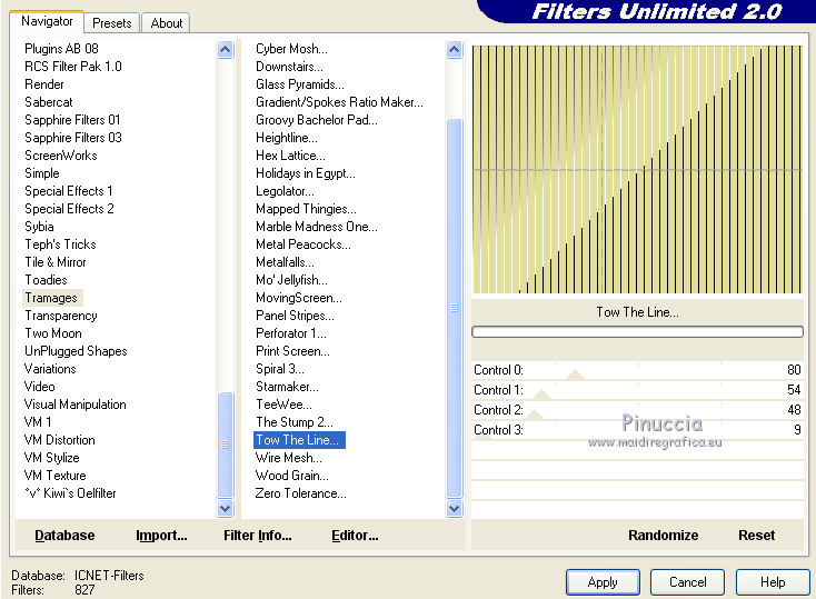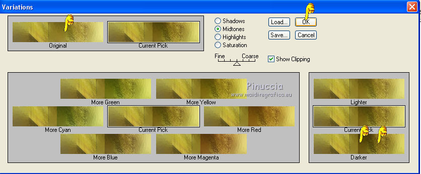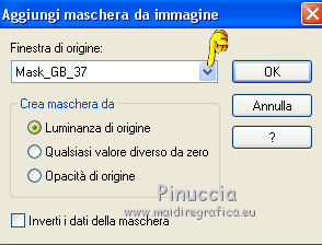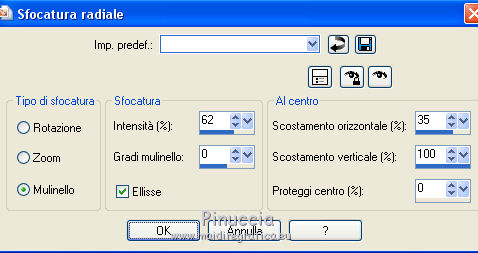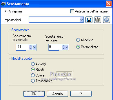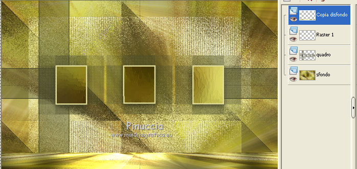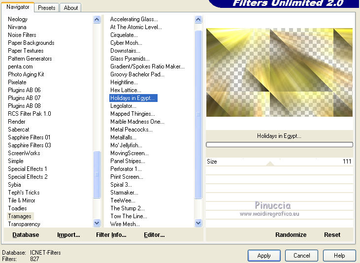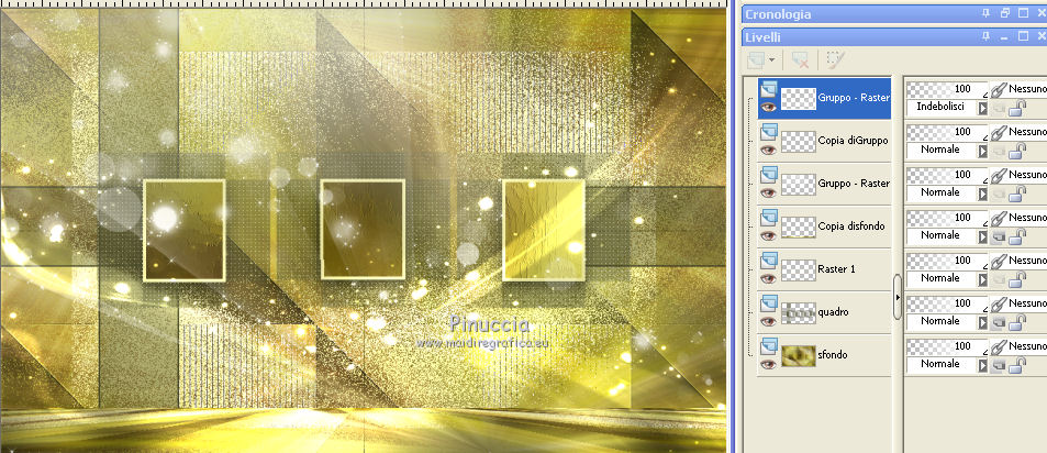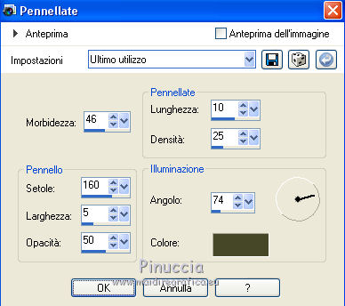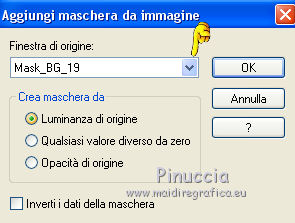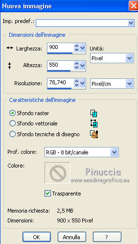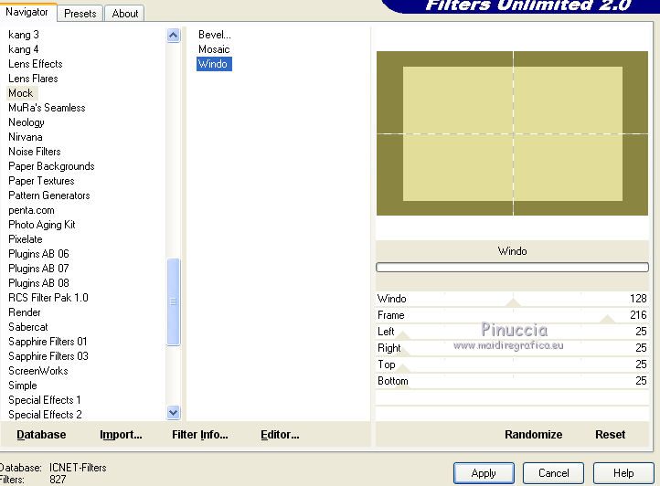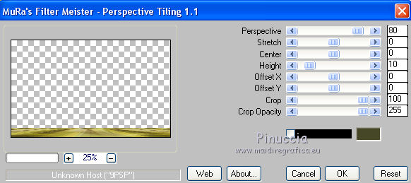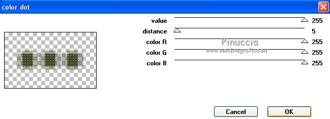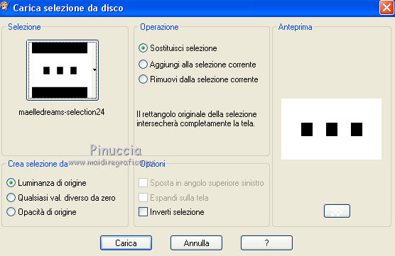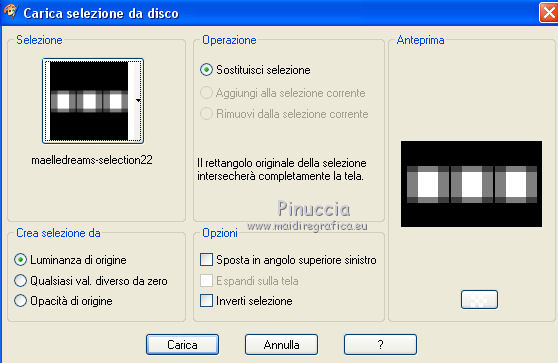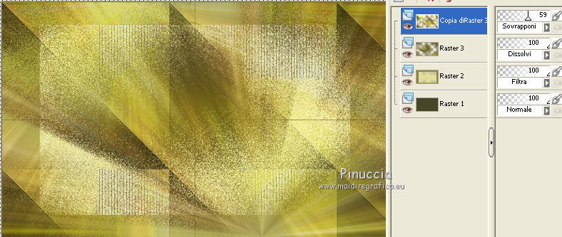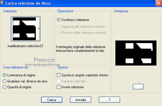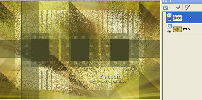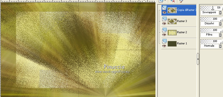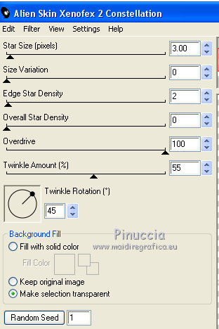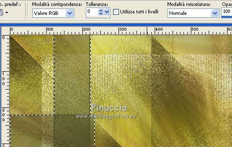 qui puoi trovare qualche risposta ai tuoi dubbi. Se l'argomento che ti interessa non è presente, ti prego di segnalarmelo. Questo tutorial è stato scritto con PSP X2, ma può essere eseguito anche con le altre versioni di PSP. Dalla versione X4, il comando Immagine>Rifletti è stato sostituito con Immagine>Capovolgi in orizzontale, e il comando Immagine>Capovolgi con Immagine>Capovolgi in verticale. Nelle versioni X5 e X6, le funzioni sono state migliorate rendendo disponibile il menu Oggetti. Vedi la scheda sull'argomento qui Per tradurre questo tutorial ho usato PSP X. Occorrente: Materiale qui Il materiale utilizzato è di Maelle. Le maschere sono di GraphicsBeatrice Filtri in caso di dubbi, ricorda di consultare la mia sezione filtri qui Filters Unlimited 2.0 qui Mocks - Windo qui Graphics Plus - Cross shadow qui Tramages - Tow the line - Holidays in Egypt qui Penta.com - Color dot qui Adjust - Variations qui Mura's Meister - Perspective Tiing qui Alien Skin Xenofex 2.0 - Constellation qui Alien Skin Eye Candy 5 Impact - Perspective Shadow qui I filtri Mocks, Penta, Tramages e Graphics Plus si possono usare da soli o importati in Filters Unlimited (come fare vedi qui) Se un effetto fornito appare con questa icona Metti le selezioni nella cartella Selezioni. Apri le maschere in PSP e minimizzale con il resto del materiale. 1. Imposta il colore di primo piano con #e2de99, e il colore di sfondo con il colore #464727. 2. Apri una nuova immagine trasparente 900 x 550 pixels. ![]() Riempi l'immagine trasparente con il colore di sfondo.3. Livelli>Nuovo livello raster. Riempi con il colore di primo piano #e2de99.4. Effetti>Plugins>Filters Unlimited 2.0 - Mock - Windo. ![]() Cambia la modalità di miscelatura di questo livello in Filtra. 5. Selezione>Carica/Salva selezione>Carica selezione da disco. Cerca e carica la selezione maelledreams-selection23. ![]() 6. Effetti>Plugins>Filters Unlimited 2.0 - Tramages - Tow the line. ![]() Effetti>Effetti di bordo>Aumenta di più. Selezione>Deseleziona. 7. Livelli>Nuovo livello raster. Selezione>Seleziona tutto. 8. Apri maelledreams-occasion6, mantieni la selezione esistente e vai a Modifica>Copia. non chiuderlo perchè ti servirà ancora Torna al tuo lavoro e vai a Modifica>Incolla nella selezione. Selezione>Deseleziona. Effetti>Effetti di immagine>Motivo unico, con i settaggi standard. ![]() Dovresti avere questo. ![]() 9. Regola>Sfocatura>Sfocatura radiale. ![]() Cambia la modalità di miscelatura di questo livello in Dissolvi. ![]() 10. Livelli>Duplica. Immagine>Rifletti. Immagine>Capovolgi. Cambia la modalità di miscelatura di questo livello in Sovrapponi, e abbassa l'opacità al 59%. ![]() 11. Effetti>Plugins>Filters Unlimited 2.0 - Tramages - Holidays in egypt. ![]() Effetti>Effetti di bordo>Aumenta di più. Dovresti avere questo. ![]() 12. Livelli>Unisci>Unisci visibile. Rinomina questo livello "sfondo". 13. Livelli>Nuovo livello raster. Selezione>Carica/Salva selezione>Carica selezione da disco. Cerca e carica la selezione maelledreams-selection20. ![]() Riempi la selezione con il colore di sfondo #464727.Attenzione, è importante impostare la modalità di corrispondenza del Riempimento in Valore RGB, altrimenti il colore sarà "sbiadito". Dovrai cliccare due volte per riempire le due selezioni. ![]() Selezione>Deseleziona. 14. Livelli>Nuovo livello raster. Selezione>Carica/Salva selezione>Carica selezione da disco. Cerca e carica la selezione maelledreams-selection22. ![]() Riempi la selezione con il colore di sfondo #464727.Anche se dovrai cliccare tre volte per riempire le selezioni, mantieni la modalità di corrispondenza in Valore RGB, per il motivo spiegato al punto precedente. 15. Immagine>Ridimensiona, all'80%, tutti i livelli non selezionato. 16. Selezione>Carica/Salva selezione>Carica selezione da disco. Cerca e carica la selezione maelledreams-selection24. (la nuova selezione sostituirà la precedente) ![]() 17. Effetti>Plugins>Penta.com - Color Dot. ![]() 18. Selezione>Deseleziona. Livelli>Unisci>Unisci giù. Rinomina questo livello "quadro". ![]() 19. Livelli>Nuovo livello raster. Selezione>Carica/Salva selezione>Carica selezione da disco. Cerca e carica la selezione maelledreams-selection25. ![]() Riempi la selezione con il colore di primo piano #e2de99.20. Selezione>Modifica>Contrai - 4 pixels. Premi sulla tastiera il tasto CANC ![]() 21. Attiva il livello "quadro", premi sulla tastiera il tasto CANC. 22. Attiva il livello "sfondo". Regola>Sfocatura>Sfocatura gaussiana - raggio 15. ![]() 23. Effetti>Effetti tecniche di disegno>Pennellate, colore di sfondo. ![]() Regola>Messa a fuoco>Accentua messa a fuoco. 24. Effetti>Plugins>Adjust - Variations. Un clic su Original per annullare eventuali precedenti settaggi memorizzati dal filtro, due clic su Darker e ok. ![]() 25. Selezione>Modifica>Espandi - 4 pixels. 26. Effetti>Effetti 3D>Sfalsa ombra. ![]() Modifica>Ripeti Sfalsa ombra. Selezione>Deseleziona. 27. Livelli>Duplica. Effetti>Plugins>Mura's Meister - Perspective Tiling. ![]() 28. Effetti>Plugins>Graphics Plus - Cross Shadow, con i settaggi standard. ![]() 29. Livelli>Disponi>Porta in alto. ![]() 30. Livelli>Nuovo livello raster. Imposta il colore di primo piano con il colore bianco. ![]() Riempi con il colore bianco.31. Livelli>Nuovo livello maschera>Da immagine. Apri il menu sotto la finestra di origine e vedrai la lista dei files aperti. Seleziona la maschera MAsk_BG_19, con i seguenti settaggi. ![]() Livelli>Unisci>Unisci gruppo. 32. Livelli>Duplica. Effetti>Plugins>Alien skin Xenofex 2 - Constellation. ![]() 33. Livelli>Nuovo livello raster. Riempi il livello con il colore bianco.34. Livelli>Nuovo livello maschera>Da immagine. Apri il menu sotto la finestra di origine e seleziona la maschera Mask_BG_37, con i seguenti settaggi. ![]() Livelli>Unisci>Unisci gruppo. 35. Immagine>Rifletti. Cambia la modalità di miscelatura di questo livello in Indebolisci. ![]() 36. Attiva nuovamente maelledreams-occasion6, e vai a Modifi