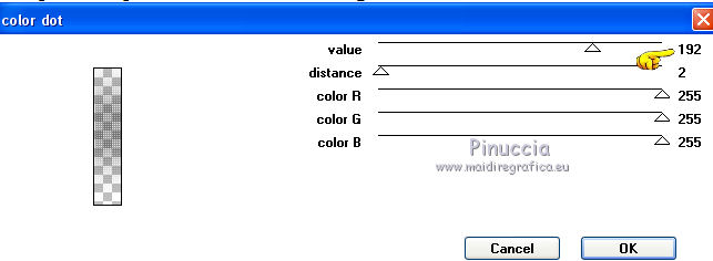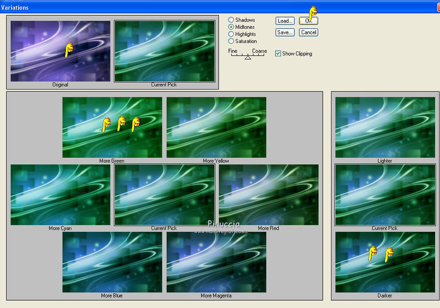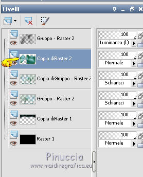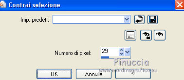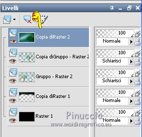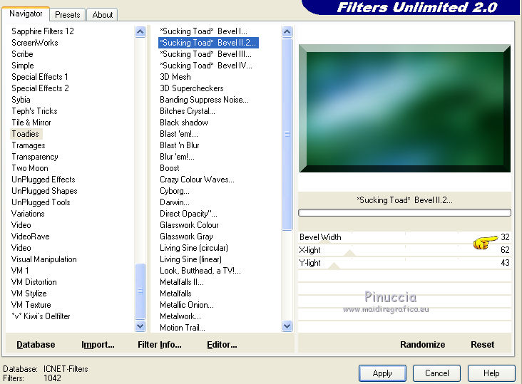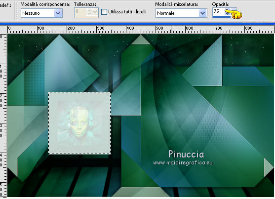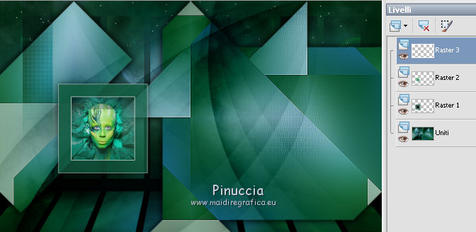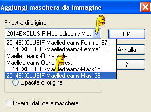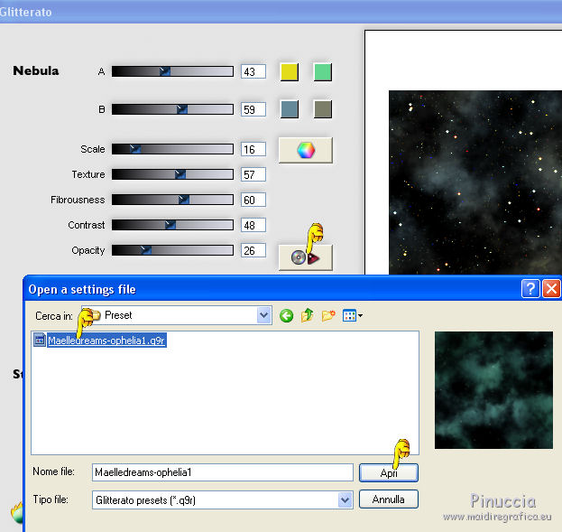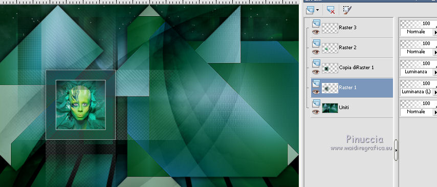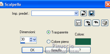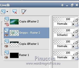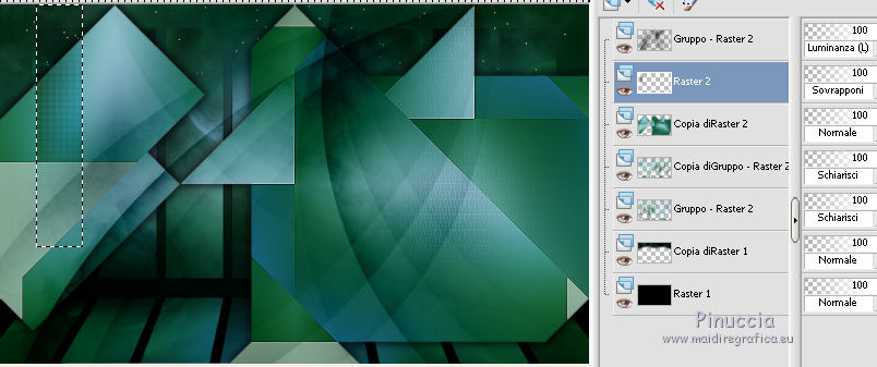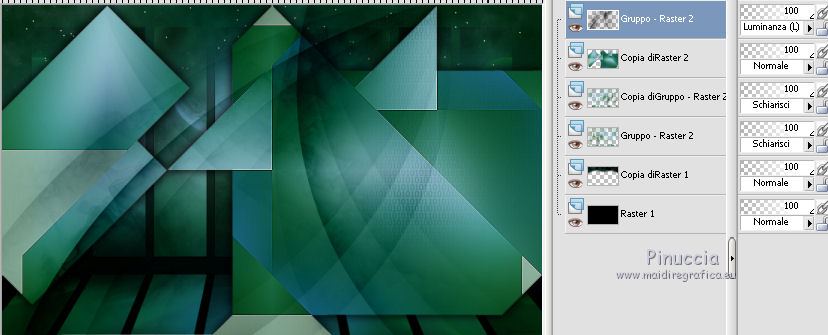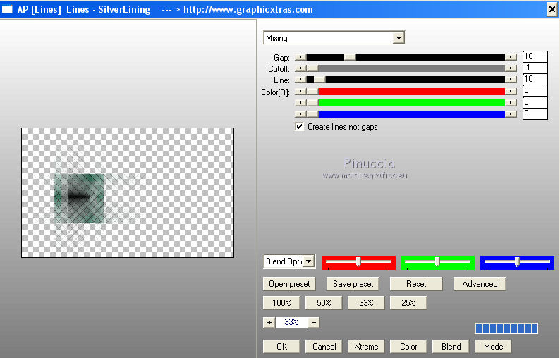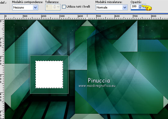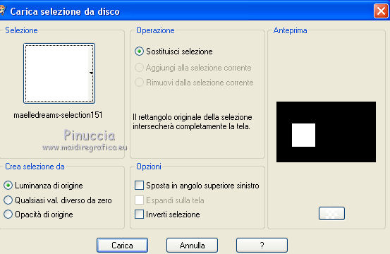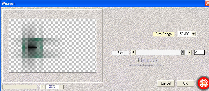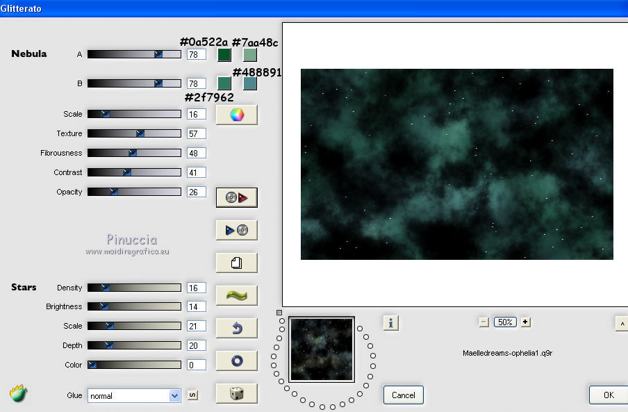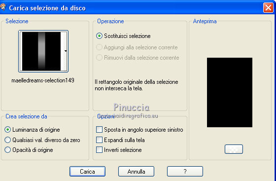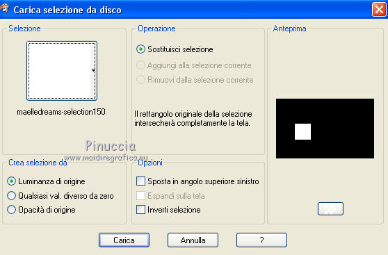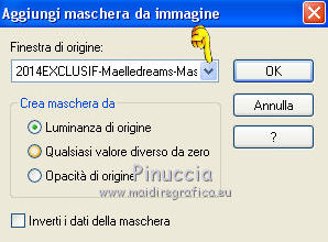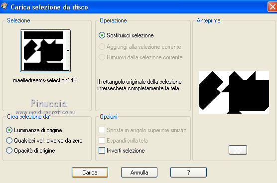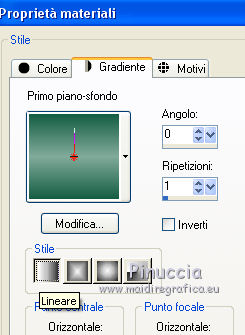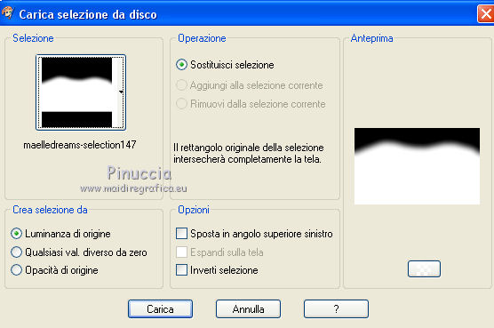 qui puoi trovare qualche risposta ai tuoi dubbi. Se l'argomento che ti interessa non è presente, ti prego di segnalarmelo. Per tradurre questo tutorial ho usato PSP X, ma può essere eseguito anche con le altre versioni di PSP. Dalla versione X4, il comando Immagine>Rifletti è stato sostituito con Immagine>Capovolgi in orizzontale, e il comando Immagine>Capovolgi con Immagine>Capovolgi in verticale. Nelle versioni X5 e X6, le funzioni sono state migliorate rendendo disponibile il menu Oggetti. Vedi la scheda sull'argomento qui Occorrente: Materiale qui Il materiale utilizzato appartiene a Maelle ed è vietato condividere i tubes forniti. Filtri in caso di dubbi, ricorda di consultare la mia sezione filtri qui Filters Unlimited 2.0 qui Simple - Blintz, Pizza Slice Mirror qui Adjust - Variations qui Toadies - Sucking toad Bevel II2 qui Alien Skin Eye Candy 5 Impact - Perspective Shadow qui Flaming Pear - Glitterato qui Penta.com - Color Dot qui Ap Lines - Lines SilverLining qui Mehdi - Weaver qui I filtri Toadies, Simple e Penta.com si possono usare da soli o importati in Filters Unlimited (come fare vedi qui) Se un effetto fornito appare con questa icona ![]() Maelle mi ha mandato questa traduzione in aprile, con l'avviso che sarebbe stato pubblicato il 15 maggio. Ma dopo averglielo mandato, non ho più avuto notizie di lei. La sua ultima mail è del 30 aprile. Dopo non ho mai risposto alle mie mail e non ha più aggiornato il suo sito. La settimana scorsa la mail è tornata indietro. A questo punto, ho deciso di pubblicare la traduzione, augurandomi che per lei tutto vada bene ![]() Se utilizzi altri colori, sperimenta le modalità di miscelatura e opacità per armonizzarle con i tuoi colori. Per ottenere gli stessi effetti, ti consiglio di seguire la posizione dei filtri come mostrato nel tutorial. Metti il preset MaelleDreams-ophelia1, nella cartella del filtro Glitterato. Se preferisci, puoi importare il preset, quando ti servirà, direttamente dalla cartella in cui hai salvato il materiale. Metti le selezioni nella cartella Selezioni. Apri le maschere in PSP e minimizzale con il resto del materiale. 1. Apri una nuova immagine trasparente 900 x 550 pixels. ![]() 2. Imposta il colore di primo piano con #000000, e il colore di sfondo con #ffffff. ![]() 3. Riempi l'immagine trasparente con il colore nero di primo piano #000000.4. Livelli>Duplica. 5. Effetti>Plugins>Flaming Pear - Glitterato. Clicca sull'icona della freccia rossa e cerca, nella cartella in cui l'hai salvato, il preset Maelledreams-ophelia1.q9r; clicca Apri per applicare. ![]() In caso di problemi con il preset, puoi copiare i settaggi che vedi nella schermata. ![]() 6. Selezione>Carica/Salva selezione>Carica selezione da disco. Cerca e carica la selezione maelledreams-selection147. ![]() Premi sulla tastiera il tasto CANC ![]() Selezione>Deseleziona. 7. Apri Fond-ophelia e vai a Modifica>Copia. Torna al tuo lavoro e vai a Modifica>Incolla come nuovo livello. 8. Effetti>Plugins>Adjust - Variations. Un clic su Original per annullare eventuali precedenti settaggi memorizzati dal filtro, tre clic su More Green e due clic su Darker. ![]() 9. Regola>Sfocatura>Sfocatura gaussiana - raggio 40. ![]() 10. Livelli>Duplica. Chiudi questo livello e attiva il livello sottostante dell'originale. ![]() 11. Immagine>Rifletti. Livelli>Nuovo livello maschera>Da immagine. Apri il menu sotto la finestra di origine e vedrai la lista dei files aperti. Seleziona la maschera 2014EXCLUSIF-Maelledreams-Mask36, con i seguenti settaggi. ![]() Livelli>Unisci>Unisci gruppo. 12. Cambia la modalità di miscelatura di queto livello in Schiarisci. ![]() 13. Livelli>Duplica. Immagine>Rifletti. 14. Riapri e attiva il livello superiore. ![]() 15. Effetti>Plugins>Filters Unlimited 2.0 - Toadies - Sucking Toad Bevel II.2. ![]() 16. Effetti>Plugins>Simple - Pizza Slice Mirror. 17. Effetti>Plugins>Simple - Blintz. questi filtri lavorano senza schermate. Dopo l'applicazione dei due effetti dovresti avere questo. ![]() Effetti>Effetti di bordo>Aumenta. 18. Selezione>Carica/Salva selezione>Carica selezione da disco. Cerca e carica la selezione maelledreams-selection148. ![]() Premi sulla tastiera il tasto CANC ![]() Selezione>Deseleziona. 19. Effetti>Effetti 3D>Sfalsa ombra, colore nero. ![]() Modifica>Ripeti Sfalsa ombra. 20. Livelli>Nuovo livello raster. Riempi con il colore nero di primo piano #000000.21. Livelli>Nuovo livello maschera>Da immagine. Apri il menu sotto la finestra di origine e seleziona la maschera 2014EXCLUSIF-Maelledreams-Mask15, con i seguenti settaggi. ![]() Livelli>Unisci>Unisci gruppo. 22. Cambia la modalità di miscelatura di queto livello in Luminanza (Esistente). ![]() 23. Attiva il livello sottostante. ![]() 24. Livelli>Nuovo livello raster. Selezione>Carica/Salva selezione>Carica selezione da disco. Cerca e carica la selezione maelledreams-selection149. ![]() Riempi il livello con il colore di primo piano #000000.non preoccuparti se il colore ti sembra sfocato. Va bene così 25. Effetti>Plugins>Penta.com - Color Dot. ![]() Cambia la modalità di miscelatura di queto livello in Sovrapponi. ![]() Selezione>Deseleziona. 26. Livelli>Unisci>Unisci visibile. 27. Livelli>Nuovo livello raster. Imposta il colore di primo piano con #155d43, e il colore di sfondo con #81ab9a. ![]() Passa il colore di primo piano a Gradiente di primo piano/sfondo, stile Lineare. ![]() 28. Selezione>Carica/Salva selezione>Carica selezione da disco. Cerca e carica la selezione maelledreams-selection150. ![]() Riempi la selezione con il gradiente.Selezione>Deseleziona. 29. Effetti>Effetti 3D>Scalpello, colore di primo piano #155d43. ![]() 30. Selezione>Seleziona tutto. Selezione>Mobile. Selezione>Modifica>Contrai - 30 pixels. ![]() Premi sulla tastiera il tasto CANC ![]() Imposta nuovamente il colore nero come colore di primo piano, e bianco come colore di sfondo. ![]() Riempi la selezione con il colore nero #000000.31. Apri il tube 2014EXCLUSIF-Maelledreams-Femme187