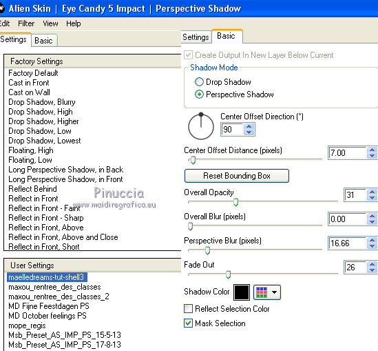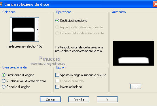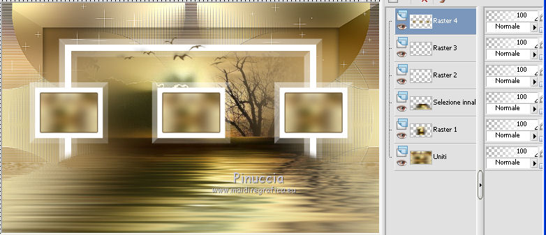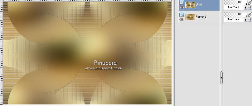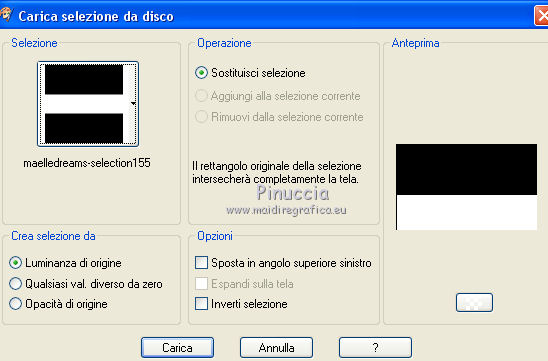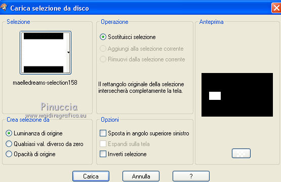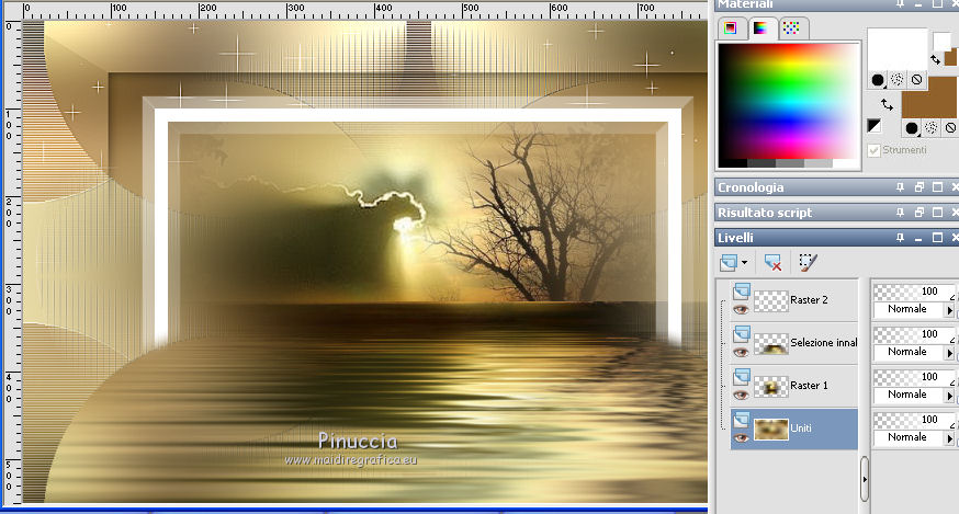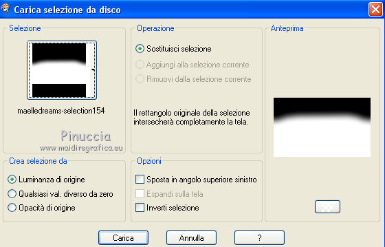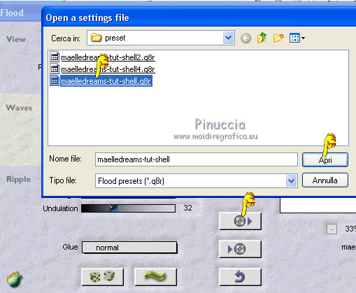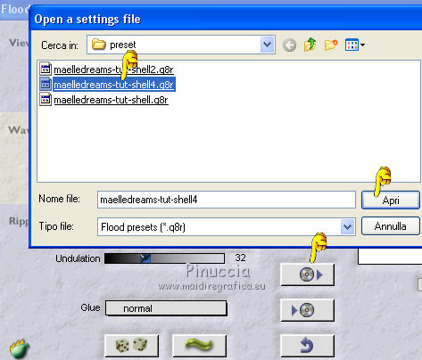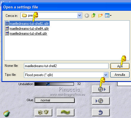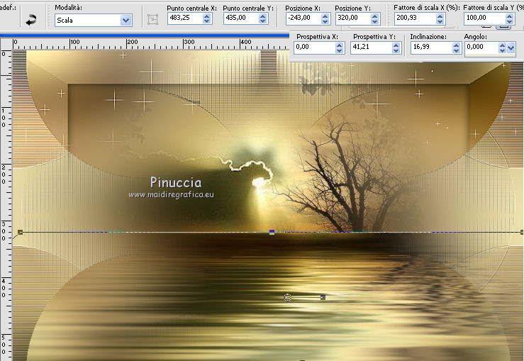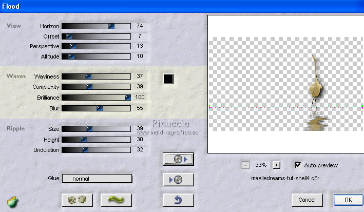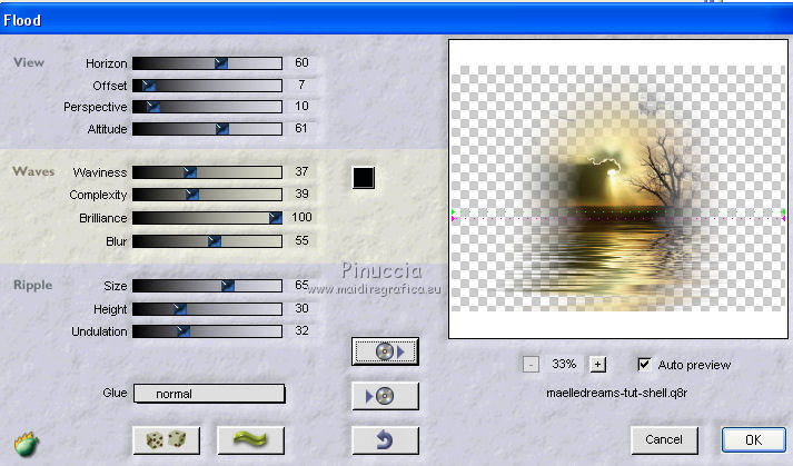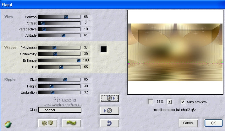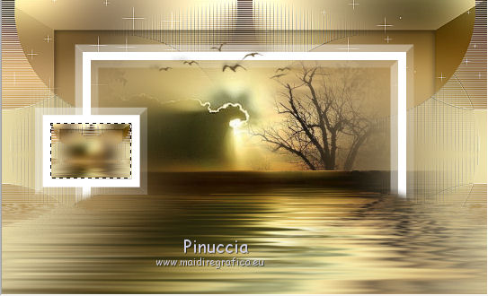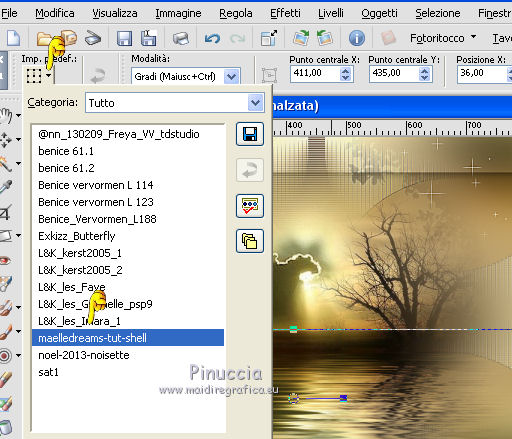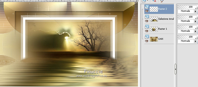 qui puoi trovare qualche risposta ai tuoi dubbi. Se l'argomento che ti interessa non è presente, ti prego di segnalarmelo. Per tradurre questo tutorial ho usato PSP X, ma può essere eseguito anche con le altre versioni di PSP. Dalla versione X4, il comando Immagine>Rifletti è stato sostituito con Immagine>Capovolgi in orizzontale, e il comando Immagine>Capovolgi con Immagine>Capovolgi in verticale. Nelle versioni X5 e X6, le funzioni sono state migliorate rendendo disponibile il menu Oggetti. Vedi la scheda sull'argomento qui Occorrente: Materiale qui Il materiale utilizzato appartiene a Maelle ed è vietato condividere i tubes forniti. Filtri in caso di dubbi, ricorda di consultare la mia sezione filtri qui Filters Unlimited 2.0 qui Tramages - Tow the line qui VM Natural - Sparkle qui Toadies - Sucking toad Bevel I qui Alien Skin Eye Candy 5 Impact - Perspective Shadow qui Flaming Pear - Flood qui Alien Skin Xenofex 2.0 - Constellation qui I filtri Tramages, VM Natural e Toadies si possono usare da soli o importati in Filters Unlimited (come fare vedi qui) Se un effetto fornito appare con questa icona ![]() Se utilizzi altri colori, sperimenta le modalità di miscelatura e opacità per armonizzarle con i tuoi colori. Per ottenere gli stessi effetti, ti consiglio di seguire la posizione dei filtri come mostrato nel tutorial. Metti i preset Cliccando sul file una o due volte (a seconda delle tue impostazioni), automaticamente il preset si installerà nella cartella corretta. perchè uno o due clic vedi qui Metti i preset MaelleDreams-tutshell, MaelleDreams-tutshell3.qrq e MaelleDreams-tutshell5 nella cartella del filtro Flood. Se preferisci, puoi importare i preset, quando ti serviranno, direttamente dalla cartella in cui hai salvato il materiale. Metti il preset RasterDeform maelledreams nella cartella Impostazioni predefinite. Metti le selezioni nella cartella Selezioni. 1. Apri una nuova immagine trasparente 900 x 550 pixels. ![]() 2. Imposta il colore di primo piano con #f8f0bb, e il colore di sfondo con #90612c. ![]() Passa il colore di primo piano a Gradiente di primo piano/sfondo, stile Sprazzo di luce. ![]() 3. Riempi l'immagine trasparente con il gradiente.4. Selezione>Seleziona tutto. Apri il tube Maelledreams-paysage, e vai a Modifica>Copia. non chiuderlo perchè ti servirà ancora. Torna al tuo lavoro e vai a Modifica>Incolla nella selezione. Selezione>Deseleziona. 5. Regola>Sfocatura>Sfocatura gaussiana - raggio 40. ![]() 6. Livelli>Duplica. Effetti>Plugins>Filters Unlimited 2.0 - Special Effect 1 - Binoculars. ![]() 7. Livelli>Duplica. Attiva il livello sottostante - Copia di Raster 1. ![]() 8. Effetti>Effetti di immagine>Motivo unico. ![]() 9. Effetti>Effetti di trama>Veneziana, colore bianco. ![]() Effetti>Effetti di bordo>Aumenta. 10 Attiva il livello superiore - copia 2 di Raster 1. ![]() 11. Effetti>Effetti di immagine>Motivo unico. ![]() 12. Livelli>Duplica. Attiva il livello sottostante - copia 2 di Raster 1. ![]() 13. Effetti>Plugins>Filters Unlimited 2.0 - Tramages - Tow the line ![]() Effetti>Effetti di bordo>Aumenta di più. 14. Rimani posizionato su questo livello e chiudi il livello inferiore Raster 1. ![]() quando la paletta dei livelli appare come nell'esempio, per aprire o chiudere o cambiare le proprietà di un livello, non occorre attivarlo. Come far apparire il menu a destra dei livelli vedi qui Livelli>Unisci>Unisci visibile. 15. Riapri il livello inferiore e rimani posizionato sul livello superiore (Uniti). ![]() 16. Selezione>Carica/Salva selezione>Carica selezione da disco. Cerca e carica la selezione maelledreams-selection152. ![]() Selezione>Innalza selezione a livello. Selezione>Deseleziona. 17. Effetti>Plugins>Filters Unlimited 2.0 - VM Natural - Sparkle. ![]() 18. Effetti>Plugins>Filters Unlimited 2.0 - Toadies - Sucking Toad Bevel I. ![]() Regola>Messa a fuoco>Accentua messa a fuoco. 19. Selezione>Carica/Salva selezione>Carica selezione da disco. Cerca e carica la selezione maelledreams-selection153. ![]() 20. Effetti>Effetti 3D>Sfalsa ombra, colore nero. ![]() Selezione>Deseleziona. 21. Selezione>Carica/Salva selezione>Carica selezione da disco. Cerca e carica la selezione maelledreams-selection154. ![]() Premi sulla tastiera il tasto CANC ![]() Selezione>Deseleziona. 22. Livelli>Unisci>Unisci visibile. 23. Attiva nuovamente il tube Maelledreams-paysage, e vai a Modifica>Copia. Torna al tuo lavoro e vai a Modifica>Incolla come nuovo livello. 24. Effetti>Plugins>Flaming Pear - Flood clicca sull'icona della prima freccia (in altre versioni di Flood è di colore rosso) cerca e seleziona, nella cartella in cui hai salvato il materiale, il preset maelledreams-tut-shell, e clicca Apri per caricare. ![]() Clicca ok per applicare. in caso di problemi con il preset, puoi copiare i settaggi che vedi nella schermata. ![]() 25. Selezione>Carica/Salva selezione>Carica selezione da disco. Cerca e carica la selezione maelledreams-selection155. ![]() Selezione>Innalza selezione a livello. Selezione>Deseleziona. 26. Premi il tasto D per attivare lo strumento Deformazione ![]() apri il menu delle impostazioni e seleziona il preset maelledreams-tut-shell ![]() Questi i settaggi che puoi copiare in caso di problemi con il preset. ![]() 27. Attiva il livello sottostante - Raster 1. ![]() 28. Attiva lo strumento Selezione ![]() (il tipo di selezione non è importante, perchè la selezione personalizzata crea sempre un rettangolo) clicca sull'icona Selezione personalizzata ![]() e imposta i seguenti settaggi. ![]() 29. Selezione>Inverti. Premi sulla tastiera il tasto CANC ![]() 30. Selezione>Inverti. Livelli>Nuovo livello raster. 31. Imposta il colore di primo piano con il colore bianco #ffffff. ![]() Riempi il livello con il colore bianco.32. Selezione>Modifica>Contrai - 15 pixels. ![]() Premi sulla tastiera il tasto CANC. Selezione>Deseleziona. 33. Effetti>Effetti 3D>Scalpello. ![]() 34. Selezione>Carica/Salva selezione>Carica selezione da disco. Cerca e carica l