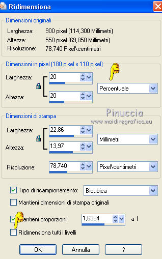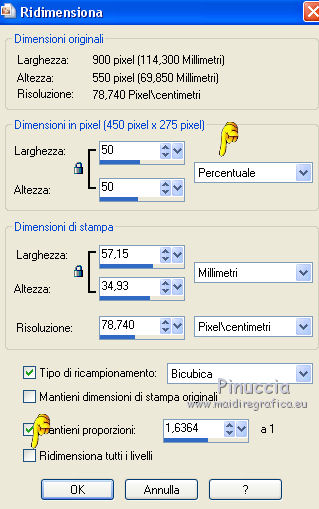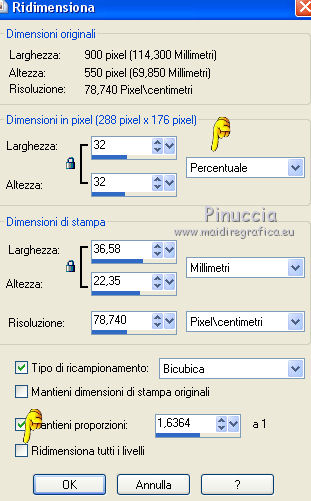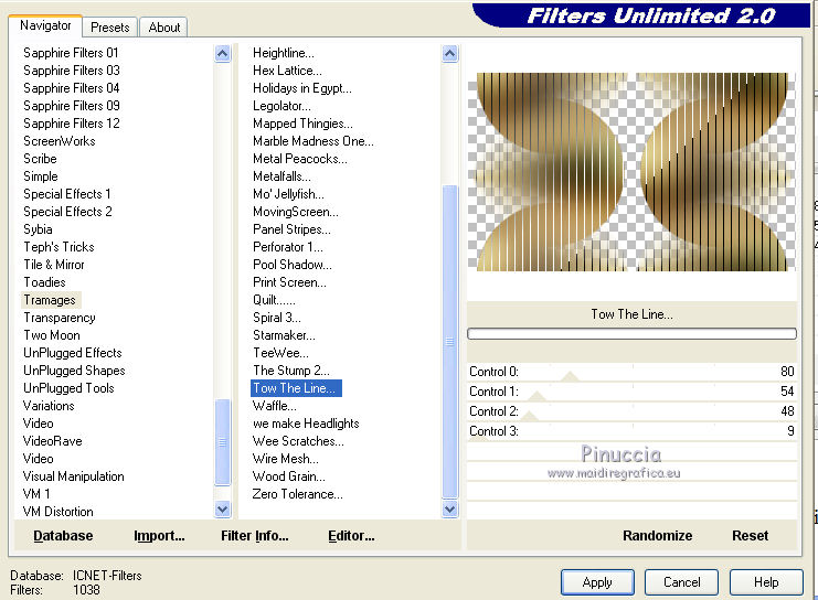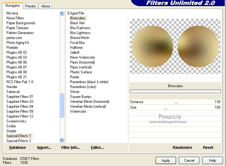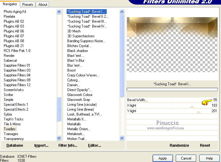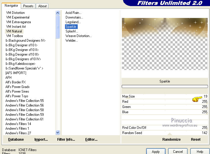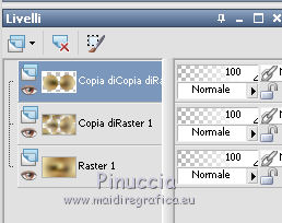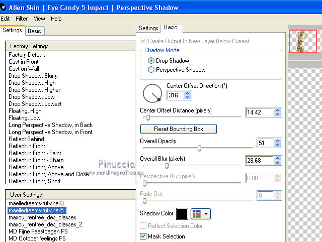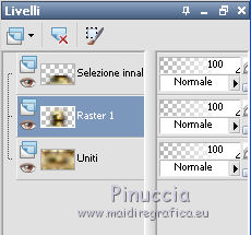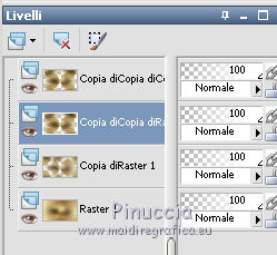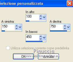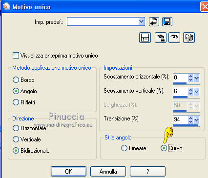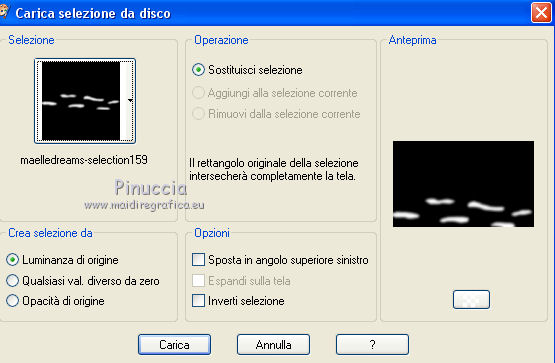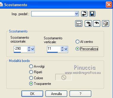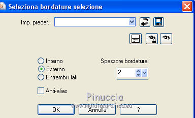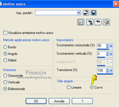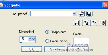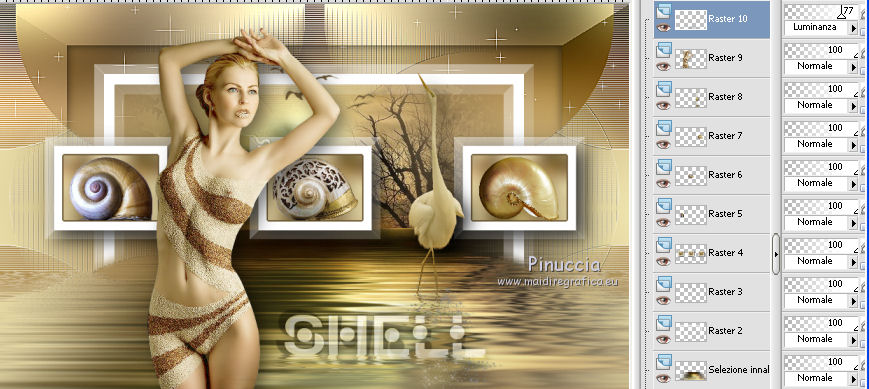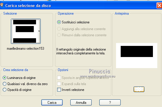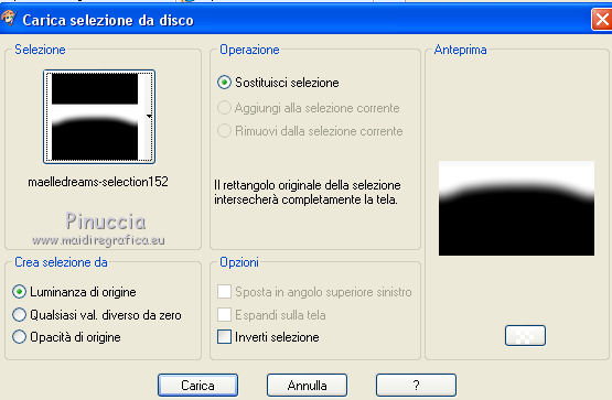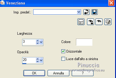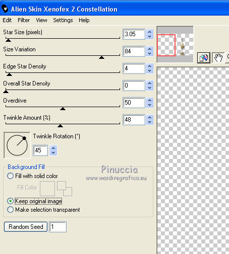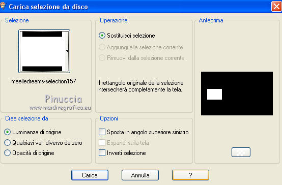 qui puoi trovare qualche risposta ai tuoi dubbi. Se l'argomento che ti interessa non è presente, ti prego di segnalarmelo. Per tradurre questo tutorial ho usato PSP X, ma può essere eseguito anche con le altre versioni di PSP. Dalla versione X4, il comando Immagine>Rifletti è stato sostituito con Immagine>Capovolgi in orizzontale, e il comando Immagine>Capovolgi con Immagine>Capovolgi in verticale. Nelle versioni X5 e X6, le funzioni sono state migliorate rendendo disponibile il menu Oggetti. Vedi la scheda sull'argomento qui Occorrente: Materiale qui Il materiale utilizzato appartiene a Maelle ed è vietato condividere i tubes forniti. Filtri in caso di dubbi, ricorda di consultare la mia sezione filtri qui Filters Unlimited 2.0 qui Tramages - Tow the line qui VM Natural - Sparkle qui Toadies - Sucking toad Bevel I qui Alien Skin Eye Candy 5 Impact - Perspective Shadow qui Flaming Pear - Flood qui Alien Skin Xenofex 2.0 - Constellation qui I filtri Tramages, VM Natural e Toadies si possono usare da soli o importati in Filters Unlimited (come fare vedi qui) Se un effetto fornito appare con questa icona ![]() Se utilizzi altri colori, sperimenta le modalità di miscelatura e opacità per armonizzarle con i tuoi colori. Per ottenere gli stessi effetti, ti consiglio di seguire la posizione dei filtri come mostrato nel tutorial. Metti i preset Cliccando sul file una o due volte (a seconda delle tue impostazioni), automaticamente il preset si installerà nella cartella corretta. perchè uno o due clic vedi qui Metti i preset MaelleDreams-tutshell, MaelleDreams-tutshell3.qrq e MaelleDreams-tutshell5 nella cartella del filtro Flood. Se preferisci, puoi importare i preset, quando ti serviranno, direttamente dalla cartella in cui hai salvato il materiale. Metti il preset RasterDeform maelledreams nella cartella Impostazioni predefinite. Metti le selezioni nella cartella Selezioni. 1. Apri una nuova immagine trasparente 900 x 550 pixels. ![]() 2. Imposta il colore di primo piano con #f8f0bb, e il colore di sfondo con #90612c. ![]() Passa il colore di primo piano a Gradiente di primo piano/sfondo, stile Sprazzo di luce. ![]() 3. Riempi l'immagine trasparente con il gradiente.4. Selezione>Seleziona tutto. Apri il tube Maelledreams-paysage, e vai a Modifica>Copia. non chiuderlo perchè ti servirà ancora. Torna al tuo lavoro e vai a Modifica>Incolla nella selezione. Selezione>Deseleziona. 5. Regola>Sfocatura>Sfocatura gaussiana - raggio 40. ![]() 6. Livelli>Duplica. Effetti>Plugins>Filters Unlimited 2.0 - Special Effect 1 - Binoculars. ![]() 7. Livelli>Duplica. Attiva il livello sottostante - Copia di Raster 1. ![]() 8. Effetti>Effetti di immagine>Motivo unico. ![]() 9. Effetti>Effetti di trama>Veneziana, colore bianco. ![]() Effetti>Effetti di bordo>Aumenta. 10 Attiva il livello superiore - copia 2 di Raster 1. ![]() 11. Effetti>Effetti di immagine>Motivo unico. ![]() 12. Livelli>Duplica. Attiva il livello sottostante - copia 2 di Raster 1. ![]() 13. Effetti>Plugins>Filters Unlimited 2.0 - Tramages - Tow the line ![]() Effetti>Effetti di bordo>Aumenta di più. 14. Rimani posizionato su questo livello e chiudi il livello inferiore Raster 1. ![]() quando la paletta dei livelli appare come nell'esempio, per aprire o chiudere o cambiare le proprietà di un livello, non occorre attivarlo. Come far apparire il menu a destra dei livelli vedi qui Livelli>Unisci>Unisci visibile. 15. Riapri il livello inferiore e rimani posizionato sul livello superiore (Uniti). ![]() 16. Selezione>Carica/Salva selezione>Carica selezione da disco. Cerca e carica la selezione maelledreams-selection152. ![]() Selezione>Innalza selezione a livello. Selezione>Deseleziona. 17. Effetti>Plugins>Filters Unlimited 2.0 - VM Natural - Sparkle. ![]() 18. Effetti>Plugins>Filters Unlimited 2.0 - Toadies - Sucking Toad Bevel I. ![]() Regola>Messa a fuoco>Accentua messa a fuoco. 19. Selezione>Carica/Salva selezione>Carica selezione da disco. Cerca e carica la selezione maelledreams-selection153. ![]() 20. Effetti>Effetti 3D>Sfalsa ombra, colore nero. ![]() Selezione>Deseleziona. 21. Selezione>Carica/Salva selezione>Carica selezione da disco. Cerca e carica la selezione maelledreams-selection154. ![]() Premi sulla tastiera il tasto CANC ![]() Selezione>Deseleziona. 22. Livelli>Unisci>Unisci visibile. 23. Attiva nuovamente il tube Maelledreams-paysage, e vai a Modifica>Copia. Torna al tuo lavoro e vai a Modifica>Incolla come nuovo livello. 24. Effetti>Plugins>Flaming Pear - Flood clicca sull'icona della prima freccia (in altre versioni di Flood è di colore rosso) cerca e seleziona, nella cartella in cui hai salvato il materiale, il preset maelledreams-tut-shell, e clicca Apri per caricare. ![]() Clicca ok per applicare. in caso di problemi con il preset, puoi copiare i settaggi che vedi nella schermata. ![]() 25. Selezione>Carica/Salva selezione>Carica selezione da disco. Cerca e carica la selezione maelledreams-selection155. ![]() Selezione>Innalza selezione a livello. Selezione>Deseleziona. 26. Premi il tasto D per attivare lo strumento Deformazione ![]() apri il menu delle impostazioni e seleziona il preset maelledreams-tut-shell ![]() Questi i settaggi che puoi copiare in caso di problemi con il preset. ![]() 27. Attiva il livello sottostante - Raster 1. ![]() 28. Attiva lo strumento Selezione ![]() (il tipo di selezione non è importante, perchè la selezione personalizzata crea sempre un rettangolo) clicca sull'icona Selezione personalizzata ![]() e imposta i seguenti settaggi. ![]() 29. Selezione>Inverti. Premi sulla tastiera il tasto CANC ![]() 30. Selezione>Inverti. Livelli>Nuovo livello raster. 31. Imposta il colore di primo piano con il colore bianco #ffffff. ![]() Riempi il livello con il colore bianco.32. Selezione>Modifica>Contrai - 15 pixels. ![]() Premi sulla tastiera il tasto CANC. Selezione>Deseleziona. 33. Effetti>Effetti 3D>Scalpello. ![]() 34. Selezione>Carica/Salva selezione>Carica selezione da disco. Cerca e carica l