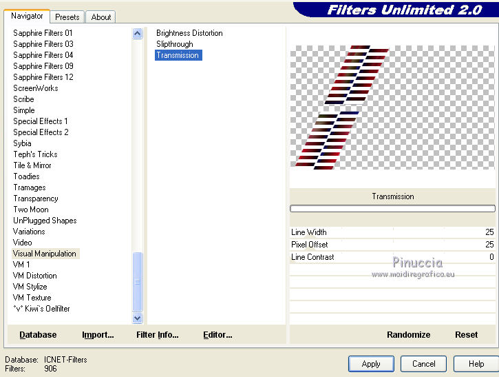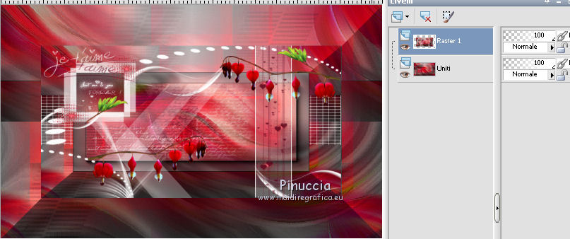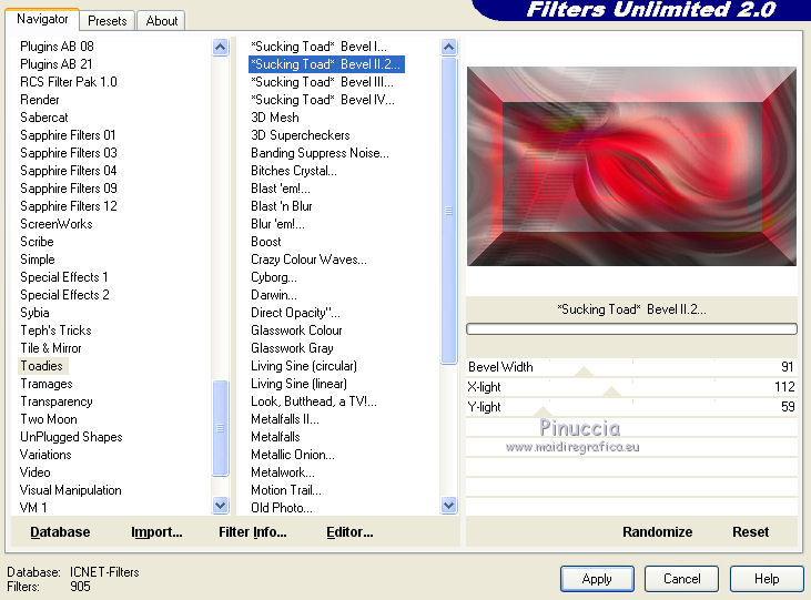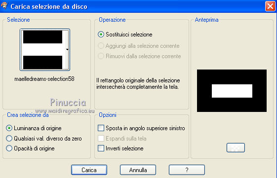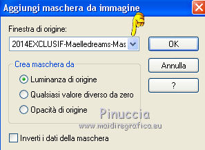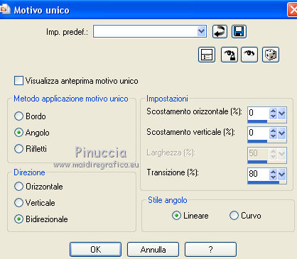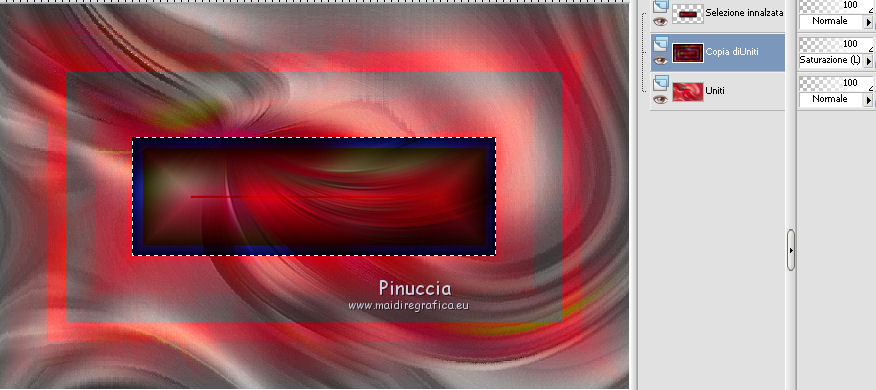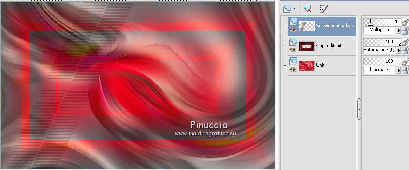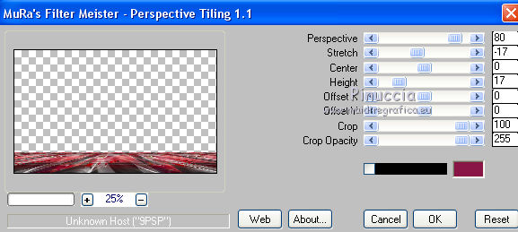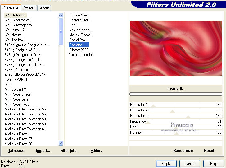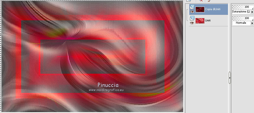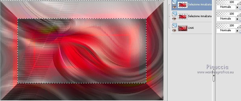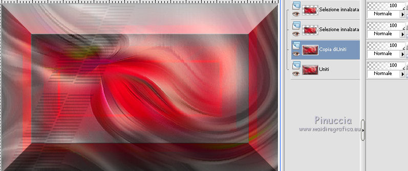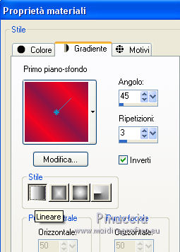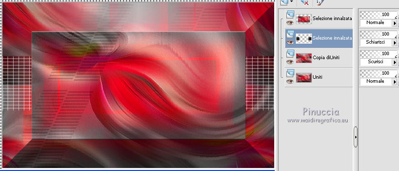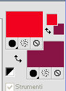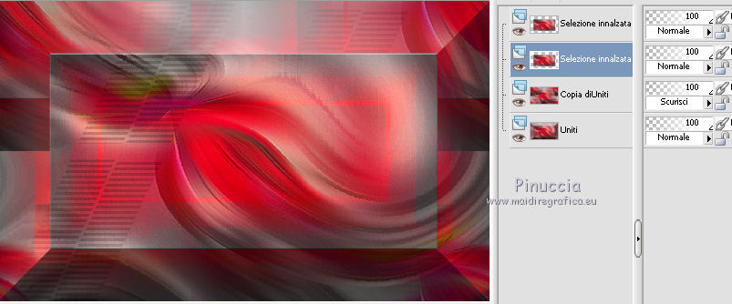 qui puoi trovare qualche risposta ai tuoi dubbi. Se l'argomento che ti interessa non è presente, ti prego di segnalarmelo. Questo tutorial è stato scritto con PSP X2, ma può essere eseguito anche con le altre versioni di PSP. Dalla versione X4, il comando Immagine>Rifletti è stato sostituito con Immagine>Capovolgi in orizzontale, e il comando Immagine>Capovolgi con Immagine>Capovolgi in verticale. Nelle versioni X5 e X6, le funzioni sono state migliorate rendendo disponibile il menu Oggetti. Vedi la scheda sull'argomento qui Per tradurre questo tutorial ho usato PSP X. Occorrente: Materiale qui Il materiale utilizzato è di Maelle. Filtri in caso di dubbi, ricorda di consultare la mia sezione filtri qui Filters Unlimited 2.0 qui &<Bkg Designer sf10I> - Blur'em (da importare in Unlimited) qui Toadies - Sucking toad Bevel II.2 qui VM Distortion - Radiator II qui VM Natural - Downstairs qui Visual Manipulation - Transmission qui Simple - Quick Tile qui AAA Frames - Foto Frame qui Adjust - Variations qui Richard Rosenman - Grid Generator qui Mura's Meister - Perspective Tiling qui I filtri della serie VM (Distortion, Natural) Toadies, Visual Manipulation e Simple si possono usare da soli o importati in Filters Unlimited (come fare vedi qui) Se un effetto fornito appare con questa icona Se utilizzi altri colori, sperimenta le modalità di miscelatura e opacità per armonizzarle con i tuoi colori. E' anche essenziale utilizzare i tubes originali del tutorial per i primi effetti, che potrai colorizzare in seguito al fine di ottenere lo stesso risultato Metti le selezioni nella cartella Selezioni. Apri le maschere in PSP e minimizzale con il resto del materiale. 1. Imposta il colore di primo piano con #f10420, e il colore di sfondo con #881546. ![]() Passa il colore di primo piano a Gradiente di primo piano/sfondo, stile Lineare. ![]() 2. Apri una nuova immagine trasparente 900 x 550 pixels. ![]() Riempi l'immagine trasparente con il gradiente.3. Livelli>Nuovo livello raster. Selezione>Seleziona tutto. 4. Apri il tube 2014EXCLUSIF-Maelledreams-femme19, e vai a Modifica>Copia. non chiudere il tube, perchè ti servirà ancora Torna al tuo lavoro e vai a Modifica>Incolla nella selezione. Selezione>Deseleziona. 5. Effetti>Effetti di immagine>Motivo unico. ![]() 6. Livelli>Nuovo livello raster. Selezione>Seleziona tutto. 7. Apri il tube 2014EXCLUSIF-Maelledreams-Fleur2, e vai a Modifica>Copia. Torna al tuo lavoro e vai a Modifica>Incolla nella selezione. Selezione>Deseleziona. 8. Effetti>Effetti di immagine>Motivo unico, con i settaggi precedenti. ![]() Livelli>Unisci>Unisci giù. 9. Regola>Sfocatura>Sfocatura radiale. ![]() 10. Livelli>Unisci>Unisci visibile. Effetti>Effetti di bordo>Aumenta di più. 11. Livelli>Duplica. Attiva il livello sottostante dell'originale. 12. Effetti>Plugins>Filters Unlimited 2.0 - VM Distortion - Radiator II ![]() Regola>Messa a fuoco>Metti a fuoco. 13. Attiva il livello superiore. 14. Effetti>Plugins>Filters Unlimited 2.0 - VM Natural - Downstairs. ![]() Cambia la modalità di miscelatura di questo livello in Saturazione (esistente). ![]() 15. Selezione>Carica/Salva selezione>Carica selezione da disco. Cerca e carica la selezione maelledreams-selection58. ![]() Selezione>Innalza selezione a livello. 16. Attiva il livello sottostante. ![]() Premi sulla tastiera il tasto CANC ![]() Selezione>Deseleziona. 17. Attiva nuovamente il livello superiore. Immagine>Ruota per gradi - 90 gradi a destra. ![]() 18. Effetti>Effetti di immagine>Scostamento. ![]() Avrai questo ![]() 19. Effetti>Effetti geometrici>Inclina. ![]() 20. Effetti>Plugins>Filters Unlimited 2.0 - Visual Manipulation - Transmission. ![]() attenzione, il risultato di questo effetto può cambiare a seconda della versione di PSP, o della versione di Unlimited che si sta usando. Se il tuo risultato appare così: ![]() prima di applicare il filtro, imposta il colore di sfondo con il colore bianco Effetti>Effetti di bordo>Aumenta di più. Cambia la modalità di miscelatura di questo livello in Moltiplica, e abbassa l'opacità al 20%. ![]() 21. Livelli>Unisci>Unisci visibile. 22. Effetti>Plugins>Filters Unlimited 2.0 - Toadies - Sucking Toad Bevel II.2. ![]() 23. Selezione>Carica/Salva selezione>Carica selezione da disco. Cerca e carica la selezione maelledreams-selection60. ![]() Selezione>Innalza selezione a livello - 2 volte, per avere due livelli della selezione. ![]() Selezione>Deseleziona. 24. Attiva il livello inferiore - Uniti. ![]() 25. Livelli>Duplica. ![]() 26. Effetti>Plugins>Simple - Quick Tile. ![]() Cambia la modalità di miscelatura di questo livello in Scurisci. 27. Attiva il livello soprastante. ![]() 28. Immagine>Ridimensiona, al 50%, tutti i livelli non selezionato. ![]() 29. Effetti>Effetti di immagine>Scostamento. ![]() 30. Effetti>Plugins>Rosenman - Grid Generator. ![]() Cambia la modalità di miscelatura di questo livello in Schiarisci. ![]() Attiva il livello superiore. 31. Selezione>Carica/Salva selezione>Carica selezione da disco. Carica nuovamente la selezione maelledreams-selection60. ![]() 32. Effetti>Plugins>AAA Frames - Foto frame. ![]() Selezione>Deseleziona. 33. Selezione>Carica/Salva selezione>Carica selezione da disco. Cerca e carica la selezione maelledreams-selection61. ![]() 34. Regola>Sfocatura>Sfocatura gaussiana - raggio 5. ![]() 35. Effetti>Plugins>Filters Unlimited 2.0 - &<Bkg Designer sf10I> - Blur'em! ![]() Selezione>Deseleziona. 36. Livelli>Nuovo livello raster. Imposta il colore di primo piano con il colore bianco #ffffff. e riempi il livello con questo colore.37. Livelli>Nuovo livello maschera>Da immagine. Apri il menu sotto la finestra di origine e vedrai la lista dei files aperti. Seleziona la maschera 2014EXCLUSIF-MaelleDreams-Masque1, con i seguenti settaggi. ![]() Livelli>Unisci>Unisci gruppo. 38. Livelli>Nuovo livello raster. Selezione>Carica/Salva selezione>Carica selezione da disco. Cerca e carica la selezione maelledreams-selection59. ![]() Riempi la selezione