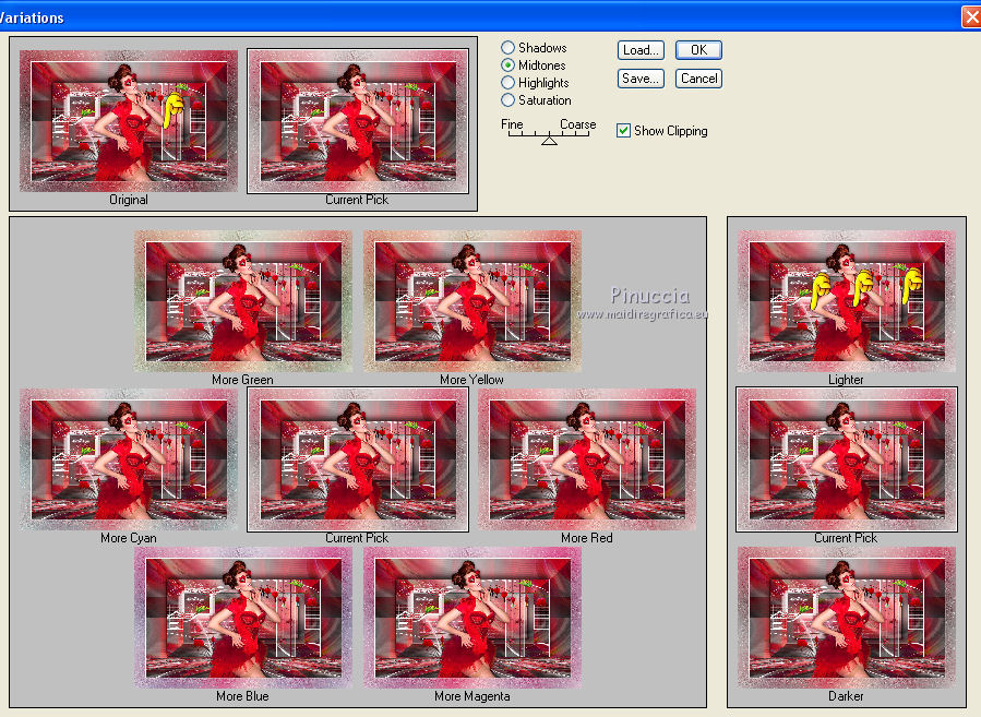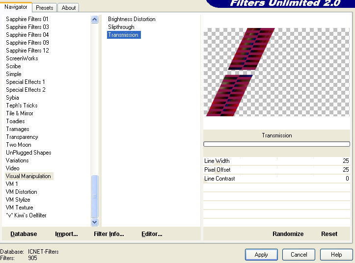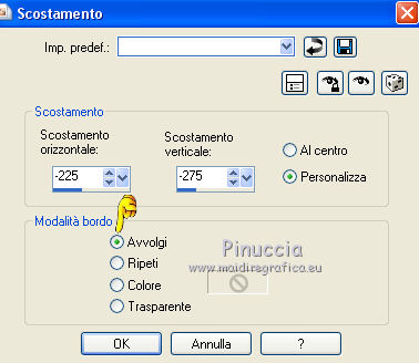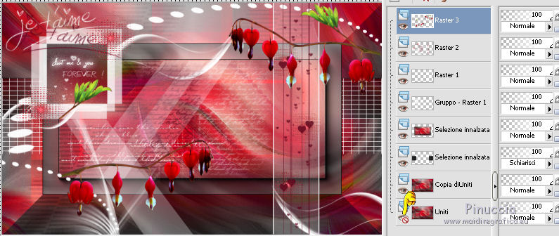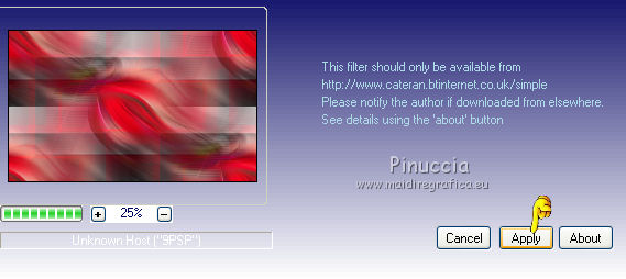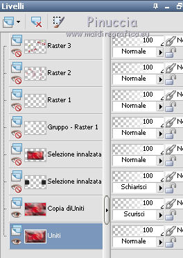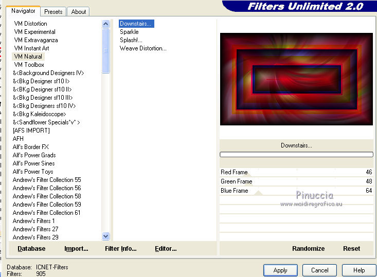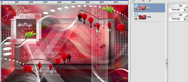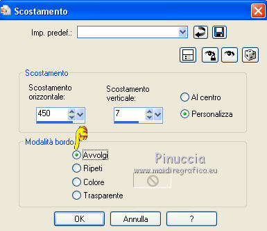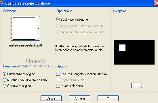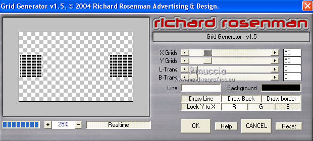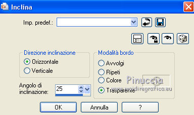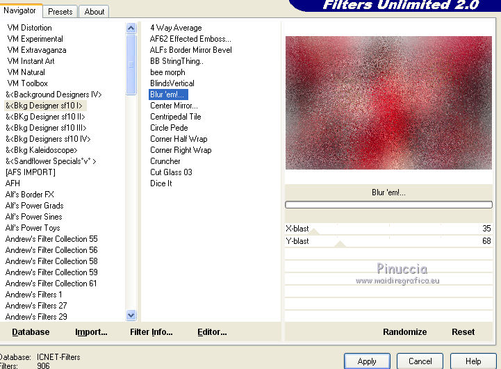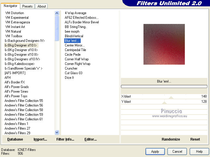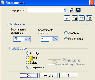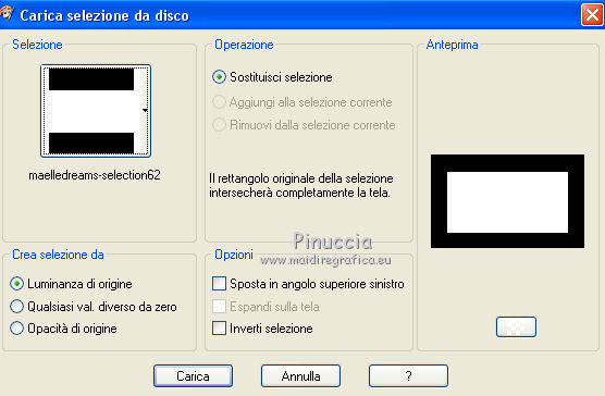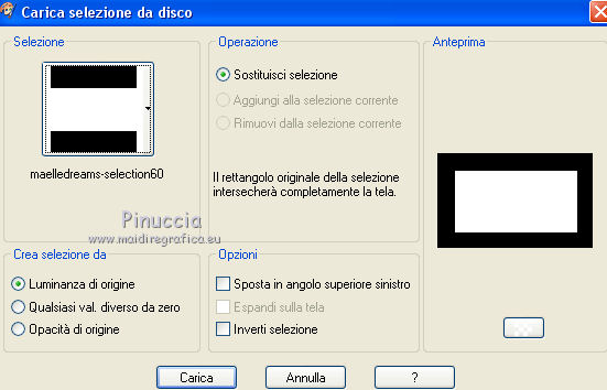 qui puoi trovare qualche risposta ai tuoi dubbi. Se l'argomento che ti interessa non è presente, ti prego di segnalarmelo. Questo tutorial è stato scritto con PSP X2, ma può essere eseguito anche con le altre versioni di PSP. Dalla versione X4, il comando Immagine>Rifletti è stato sostituito con Immagine>Capovolgi in orizzontale, e il comando Immagine>Capovolgi con Immagine>Capovolgi in verticale. Nelle versioni X5 e X6, le funzioni sono state migliorate rendendo disponibile il menu Oggetti. Vedi la scheda sull'argomento qui Per tradurre questo tutorial ho usato PSP X. Occorrente: Materiale qui Il materiale utilizzato è di Maelle. Filtri in caso di dubbi, ricorda di consultare la mia sezione filtri qui Filters Unlimited 2.0 qui &<Bkg Designer sf10I> - Blur'em (da importare in Unlimited) qui Toadies - Sucking toad Bevel II.2 qui VM Distortion - Radiator II qui VM Natural - Downstairs qui Visual Manipulation - Transmission qui Simple - Quick Tile qui AAA Frames - Foto Frame qui Adjust - Variations qui Richard Rosenman - Grid Generator qui Mura's Meister - Perspective Tiling qui I filtri della serie VM (Distortion, Natural) Toadies, Visual Manipulation e Simple si possono usare da soli o importati in Filters Unlimited (come fare vedi qui) Se un effetto fornito appare con questa icona Se utilizzi altri colori, sperimenta le modalità di miscelatura e opacità per armonizzarle con i tuoi colori. E' anche essenziale utilizzare i tubes originali del tutorial per i primi effetti, che potrai colorizzare in seguito al fine di ottenere lo stesso risultato Metti le selezioni nella cartella Selezioni. Apri le maschere in PSP e minimizzale con il resto del materiale. 1. Imposta il colore di primo piano con #f10420, e il colore di sfondo con #881546. ![]() Passa il colore di primo piano a Gradiente di primo piano/sfondo, stile Lineare. ![]() 2. Apri una nuova immagine trasparente 900 x 550 pixels. ![]() Riempi l'immagine trasparente con il gradiente.3. Livelli>Nuovo livello raster. Selezione>Seleziona tutto. 4. Apri il tube 2014EXCLUSIF-Maelledreams-femme19, e vai a Modifica>Copia. non chiudere il tube, perchè ti servirà ancora Torna al tuo lavoro e vai a Modifica>Incolla nella selezione. Selezione>Deseleziona. 5. Effetti>Effetti di immagine>Motivo unico. ![]() 6. Livelli>Nuovo livello raster. Selezione>Seleziona tutto. 7. Apri il tube 2014EXCLUSIF-Maelledreams-Fleur2, e vai a Modifica>Copia. Torna al tuo lavoro e vai a Modifica>Incolla nella selezione. Selezione>Deseleziona. 8. Effetti>Effetti di immagine>Motivo unico, con i settaggi precedenti. ![]() Livelli>Unisci>Unisci giù. 9. Regola>Sfocatura>Sfocatura radiale. ![]() 10. Livelli>Unisci>Unisci visibile. Effetti>Effetti di bordo>Aumenta di più. 11. Livelli>Duplica. Attiva il livello sottostante dell'originale. 12. Effetti>Plugins>Filters Unlimited 2.0 - VM Distortion - Radiator II ![]() Regola>Messa a fuoco>Metti a fuoco. 13. Attiva il livello superiore. 14. Effetti>Plugins>Filters Unlimited 2.0 - VM Natural - Downstairs. ![]() Cambia la modalità di miscelatura di questo livello in Saturazione (esistente). ![]() 15. Selezione>Carica/Salva selezione>Carica selezione da disco. Cerca e carica la selezione maelledreams-selection58. ![]() Selezione>Innalza selezione a livello. 16. Attiva il livello sottostante. ![]() Premi sulla tastiera il tasto CANC ![]() Selezione>Deseleziona. 17. Attiva nuovamente il livello superiore. Immagine>Ruota per gradi - 90 gradi a destra. ![]() 18. Effetti>Effetti di immagine>Scostamento. ![]() Avrai questo ![]() 19. Effetti>Effetti geometrici>Inclina. ![]() 20. Effetti>Plugins>Filters Unlimited 2.0 - Visual Manipulation - Transmission. ![]() attenzione, il risultato di questo effetto può cambiare a seconda della versione di PSP, o della versione di Unlimited che si sta usando. Se il tuo risultato appare così: ![]() prima di applicare il filtro, imposta il colore di sfondo con il colore bianco Effetti>Effetti di bordo>Aumenta di più. Cambia la modalità di miscelatura di questo livello in Moltiplica, e abbassa l'opacità al 20%. ![]() 21. Livelli>Unisci>Unisci visibile. 22. Effetti>Plugins>Filters Unlimited 2.0 - Toadies - Sucking Toad Bevel II.2. ![]() 23. Selezione>Carica/Salva selezione>Carica selezione da disco. Cerca e carica la selezione maelledreams-selection60. ![]() Selezione>Innalza selezione a livello - 2 volte, per avere due livelli della selezione. ![]() Selezione>Deseleziona. 24. Attiva il livello inferiore - Uniti. ![]() 25. Livelli>Duplica. ![]() 26. Effetti>Plugins>Simple - Quick Tile. ![]() Cambia la modalità di miscelatura di questo livello in Scurisci. 27. Attiva il livello soprastante. ![]() 28. Immagine>Ridimensiona, al 50%, tutti i livelli non selezionato. ![]() 29. Effetti>Effetti di immagine>Scostamento. ![]() 30. Effetti>Plugins>Rosenman - Grid Generator. ![]() Cambia la modalità di miscelatura di questo livello in Schiarisci. ![]() Attiva il livello superiore. 31. Selezione>Carica/Salva selezione>Carica selezione da disco. Carica nuovamente la selezione maelledreams-selection60. ![]() 32. Effetti>Plugins>AAA Frames - Foto frame. ![]() Selezione>Deseleziona. 33. Selezione>Carica/Salva selezione>Carica selezione da disco. Cerca e carica la selezione maelledreams-selection61. ![]() 34. Regola>Sfocatura>Sfocatura gaussiana - raggio 5. ![]() 35. Effetti>Plugins>Filters Unlimited 2.0 - &<Bkg Designer sf10I> - Blur'em! ![]() Selezione>Deseleziona. 36. Livelli>Nuovo livello raster. Imposta il colore di primo piano con il colore bianco #ffffff. e riempi il livello con questo colore.37. Livelli>Nuovo livello maschera>Da immagine. Apri il menu sotto la finestra di origine e vedrai la lista dei files aperti. Seleziona la maschera 2014EXCLUSIF-MaelleDreams-Masque1, con i seguenti settaggi. ![]() Livelli>Unisci>Unisci gruppo. 38. Livelli>Nuovo livello raster. Selezione>Carica/Salva selezione>Carica selezione da disco. Cerca e carica la selezione maelledreams-selection59. ![]() Riempi la selezione