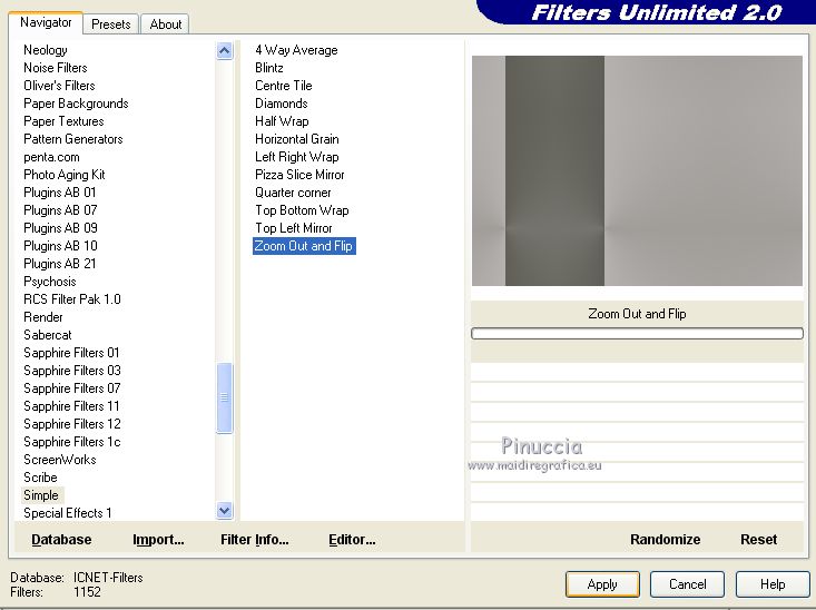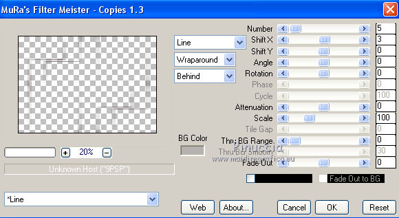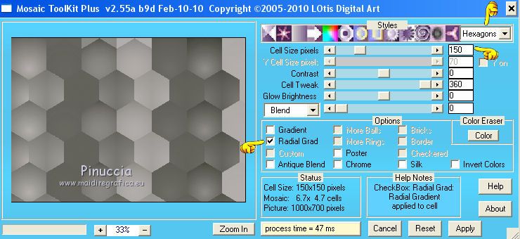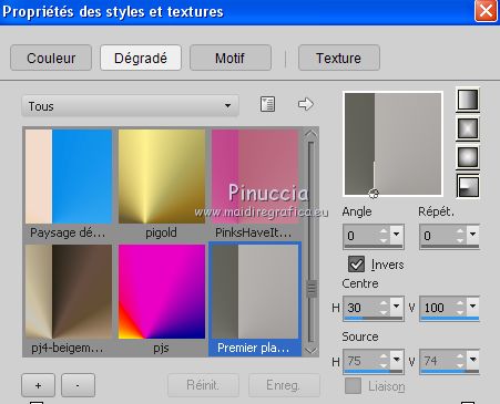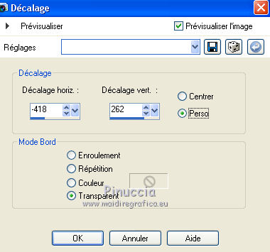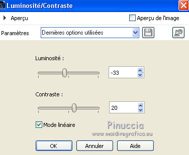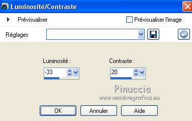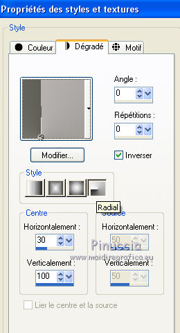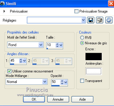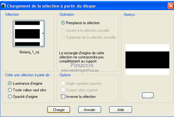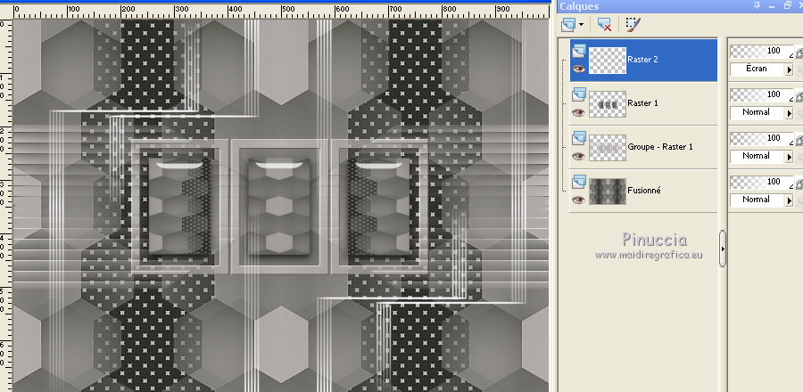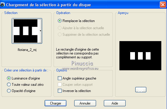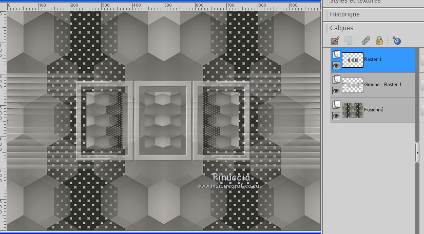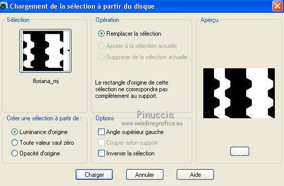Pour traduire ce tutoriel j'ai utilisé CorelX12, mais il peut également être exécuté avec les autres versions. Suivant la version utilisée, vous pouvez obtenir des résultats différents. Depuis la version X4, la fonction Image>Miroir a été remplacée par Image>Renverser horizontalement, et Image>Renverser avec Image>Renverser verticalement . Dans les versions X5 et X6, les fonctions ont été améliorées par la mise à disposition du menu Objets. Avec la nouvelle version X7, nous avons encore Image>Miroir et Image>Renverser/Retourner, mais avec nouvelles différences. Voir les détails à ce sujet ici Certaines dénominations ont changées entre les versions de PSP. Les plus frequentes dénominations utilisées: ![]() Vos versions iciNécessaire pour réaliser ce tutoriel: Matériel ici Pour le tube merci Mary. Le reste du matériel est de Maria José. Modules Externes: consulter, si nécessaire, ma section des filtres ici Alien Skin Eye Candy 5 Impact - Glass ici Mura's Meister - Copies ici Mura's Seamless - Emboss at Alpha ici Filters Unlimited 2.0 ici Simple - Zoom out and flip ici Graphics Plus Vertical Mirror ici LOtis Filters - Mosaic Toolkit ici Filtres Simple, Graphics Plus et Mura's Seamless peuvent être utilisés seuls ou importés dans Filters Unlimited. voir comment le faire ici). Si un filtre est fourni avec cette icône, ![]() en fonction des couleurs utilisées, vous pouvez changer le mode mélange et l'opacité des calques. Dans les plus récentes versions de PSP, vous ne trouvez pas le dégradé d'avant plan/arrière plan ou Corel_06_029. Vous pouvez utiliser le dégradé des versions antérieures. Ici le dossier Dégradés de CorelX. Placer le preset En cliquant sur le preset une ou deux fois (selon vos réglages) automatiquement il se placera directement dans le dossier Settings de Alien Skin Eye Candy. pourquoi un ou deux clic voir ici Placer les sélections dans le dossier Sélections Ouvrir le masque dans PSP et le minimiser avec le reste du matériel. 1. Placer en avant plan la couleur foncée #5f5f57, et en arrière plan la couleur claire #b6b2b0. ![]() Préparer un dégradé de premier plan/arrière plan, style Radial. ![]() 1. Ouvrir une nouvelle image transparente 1000 x 700 pixels Remplir l'image transparente du dégradé.2. Effets>Modules Externes>Filters Unlimited 2.0 - Simple - Zoom Out and Flip. ![]() 3. Effets>Effets de réflexion>Miroir rotatif. ![]() 4. Effets>Modules Externes>Graphics Plus - Vertical Mirror, par défaut. ![]() 5. Effets>Modules Externes>LOtis Filters - Mosaic Toolkit ![]() 6. Sélections>Charger/Enregistrer une sélection>Charger à partir du disque. Chercher et charger la sélection floriana_mj. ![]() Presser CANC sur le clavier ![]() Sélections>Désélectionner tout. 7. Effets>Effets de réflexion>Miroir rotatif, comme précédemment ![]() 8. Effets>Effets d'image>Mosaïque sans jointures. ![]() 9. Réglage>Netteté>Davantage de netteté. 10. Calques>Nouveau calque raster. Calques>Agencer>Déplacer vers le bas. Placer en avant plan la Couleur. Remplir le calque avec la couleur foncée.11. Effets>Effets artistiques>Simili. ![]() 12. Réglage>Netteté>Davantage de netteté. Calques>Fusionner>Calques visibles. 13. Calques>Nouveau calque raster. Remplir avec la couleur claire d'arrière plan.14. Calques>Nouveau calque de masque>A partir d'une image. Ouvrir le menu deroulant sous la fenêtre d'origine et vous verrez la liste des images ouvertes. Sélectionner le masque mask_degraus_mj. ![]() Calques>Fusionner>Fusionner le groupe. 15. Effets>Effets d'image>Mosaïque sans jointures. ![]() 16. Effets>Modules Externes>Graphics Plus - Vertical Mirror, par défaut. ![]() 17. Sélections>Charger/Enregistrer une sélection>Charger à partir du disque. Chercher et charger la sélection floriana_1_mj. ![]() Presser CANC sur le clavier. Sélections>Désélectionner tout. 18. Effets>Modules Externes>Mura's Seamless - Emboss at Alpha, par défaut. ![]() 19. Vous positionner sur le calque Fusionné. Édition>Copier. 20. Sélections>Charger/Enregistrer une sélection>Charger à partir du disque. Chercher et charger la sélection floriana_2_mj. ![]() Calques>Nouveau calque raster. Calques>Agencer>Placer en haut de la pile. 21. Édition>Coller dans la sélection (l'imagé copiée à l'étape 19). ![]() 22. Effets>Modules Externes>Alien Skin Eye Candy 5 Impact - Glass. Sélectionner le preset glass_floriana_mj et ok. ![]() Calques>Fusionner>Fusionner le calque de dessous. Sélections>Désélectionner tout. 23. Ouvrir le tube deco_quadro - Édition>Copier. Revenir sur votre travail et Édition>Coller comme nouveau calque. 24. Effets>Effets de réflexion>Kaléïdoscope. ![]() 25. Effets>Effets d'image>Mosaïque sans jointures, comme précédemment. ![]() 26. Effets>Modules Externes>Mura's Meister - Copies. ![]() 27. Réglage>Netteté>Davantage de netteté. Placer le calque en mode Écran ou autre ![]() si vous utilisez des autres couleurs, vous pouvez adapter mode mélange et opacité à votre convenance. 28. Calques>Fusionner>Calques visibles. Édition>Copier. Nous allons réaliser un cadre déco 29. Ouvrir une nouvelle image transparente 300 x 300 pixels. Sélections>Sélectionner tout. 30. Édition>Coller dans la sélection (l'image copiée à l'étape 28). 31. Effets>Modules Externes>Alien Skin Eye Candy 5 Impact - Glass. Preset glass_floriana_mj e ok. ![]() Sélections>Désélectionner tout. 32. Image>Ajouter des bordures, 20 pixels, symétrique, couleur claire. 33. Image>Redimensionner, 1 fois à 35% et 1 fois à 50%, redimensionner tous les calques coché. Édition>Copier. 34. Revenir sur votre travail principal - Édition>Coller comme nouveau calque. 35. Effets>Effets d'image>Décalage. ![]() 36. Effets>Effets 3D>Ombre portée, couleur noire. ![]() 37. Effets>Modules Externes>Mura's Meister - Copies. ![]() 38. Calques>Dupliquer. Image>Miroir. Image>Renverser. Calques>Fusionner>Calques visibles. 39. Réglage>Luminosité et Contraste>Lumino