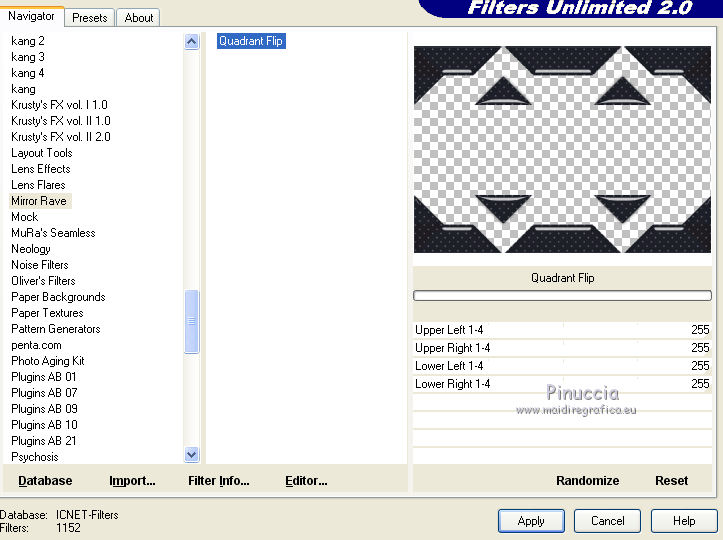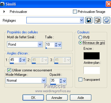 Pour traduire ce tutoriel j'ai utilisé CorelX12, mais il peut également être exécuté avec les autres versions. Suivant la version utilisée, vous pouvez obtenir des résultats différents. Depuis la version X4, la fonction Image>Miroir a été remplacée par Image>Renverser horizontalement, et Image>Renverser avec Image>Renverser verticalement . Dans les versions X5 et X6, les fonctions ont été améliorées par la mise à disposition du menu Objets. Avec la nouvelle version X7, nous avons encore Image>Miroir et Image>Renverser/Retourner, mais avec nouvelles différences. Voir les détails à ce sujet ici Certaines dénominations ont changées entre les versions de PSP. Les plus frequentes dénominations utilisées: ![]() Vos versions ici Nécessaire pour réaliser ce tutoriel: Matériel ici Merci pour les tubes Cassia et Jeanne et pour le masque Valy Le reste du matériel est de Maria José. Modules Externes: consulter, si nécessaire, ma section des filtres ici Alien Skin Eye Candy 5 Impact - Glass ici Neu! - Neuschnee - dans le matériel Mura's Seamless - Emboss at Alpha ici Filters Unlimited 2.0 ici Mehdi - Sorting Tiles ici Simple - Pizza Slice Mirror ici Graphics Plus - Vertical Mirror ici Mirror Rave - Quadrant Flip ici Carolaine and Sensibility - CS-LDots ici AAA Filters - AAA Framer qui AAA Filters - Custom qui Filtres Neu, Simple, Graphics Plus, Mura's Seamless et Mirror Rave peuvent être utilisés seuls ou importés dans Filters Unlimited. voir comment le faire ici). Si un filtre est fourni avec cette icône, ![]() en fonction des couleurs utilisées, vous pouvez changer le mode mélange et l'opacité des calques. Dans les plus récentes versions de PSP, vous ne trouvez pas le dégradé d'avant plan/arrière plan ou Corel_06_029. Vous pouvez utiliser le dégradé des versions antérieures. Ici le dossier Dégradés de CorelX. Placer le preset En cliquant sur le preset une ou deux fois (selon vos réglages) automatiquement il se placera directement dans le dossier Settings de Alien Skin Eye Candy. pourquoi un ou deux clic voir ici Placer la sélections dans le dossier Sélections Ouvrir le masque dans PSP et le minimiser avec le reste du matériel. 1. Placer en avant plan la couleur #646a7c, et en arrière plan la couleur #212b39. ![]() Préparer un dégradé de premier plan/arrière plan, style Linéaire. ![]() 1. Ouvrir une nouvelle image transparente 1000 x 700 pixels Remplir l'image transparente du dégradé.Calques>Nouveau calque raster. 2. Effets>Modules Externes>Neu! - Neuschnee ![]() attention, ne cherchez pas le filtre sous la lettre N. Il se positionne en haut de la liste des filtres. ![]() Dans Unlimited, il se positionne avant la lettre A ![]() Placer le calque en mode Recouvrement. Calques>Fusionner>Fusionner le calque de dessous. 3. Calques>Dupliquer. Effets>Effets de distorsion>Pixellisation. ![]() 4. Effets>Modules Externes>Mehdi - Sorting Tiles. ![]() 5. Effets>Modules Externes>Graphics Plus - Vertical Mirror, par défaut. ![]() 6. Effets>Effets de réflexion>Miroir rotatif. ![]() 7. Sélections>Charger/Enregistrer une sélection>Charger à partir du disque. Chercher et charger la sélection janine_mj ![]() Presser CANC sur le clavier ![]() Sélections>Inverser. 8. Effets>Effets artistiques>Simili. ![]() 9. Effets>Modules Externes>Alien Skin Eye Candy 5 Impact - Glass. Sélectionner le preset glass_majo et ok. ![]() Ci-dessous les réglages, en cas de problèmes avec le preset. ![]() Sélections>Désélectionner tout. 10. Effets>Modules Externes>Filters Unlimited 2.0 - Mirror Rave - Quadrant Flip. ![]() Placer le calque en mode Luminance (héritée). Fermer le calque Copie de Raster 1 et vous positionner sur le calque Raster 1. ![]() 11. Effets>Modules Externes>Graphics Plus - Vertical Mirror, par défaut. ![]() 12. Réglage>Flou>Flou gaussien - rayon 15. ![]() 13. Effets>Modules Externes>Simple - Pizza Slice Mirror 14. Effets>Effets de réflexion>Miroir rotatif, comme précédemment. ![]() 15. Effets>Effets d'image>Mosaïque sans jointures. ![]() 16. Effets>Effets de distorsion>Vagues. ![]() 17. Effets>Modules Externes>Carolaine and Sensibility - CS-LDots ![]() 18. Effets>Effets de distorsion>Vent - vers la droite, intensité 75. ![]() 19. Re-ouvrir et vous positionner sur le calque Copie de Raster 1. Effets>Effets 3D>Ombre portée, couleur noire. ![]() 20. Ouvrir le misted du paysage - Édition>Copier. Revenir sur votre travail et Édition>Coller comme nouveau calque. Positionner bien le tube.Calques>Agencer>Déplacer vers le bas. 21. Calques>Nouveau calque raster. Placer en avant plan la Couleur. Remplir le calque avec la couleur claire d'avant plan.Calques>Agencer>Placer en haut de la pile. 22. Calques>Nouveau calque de masque>A partir d'une image. Ouvrir le menu deroulant sous la fenêtre d'origine et vous verrez la liste des images ouvertes. Sélectionner le masque VSP240 ![]() Calques>Fusionner>Fusionner le groupe. 23. Effets>Modules Externes>Mura's Seamless - Emboss at alpha, par défaut. ![]() Placer le calque en mode Écran. ![]() si vous utilisez des autres couleurs, vous pouvez adapter mode mélange et opacité à votre convenance. 24. Effets>Modules Externes>AAA Filters - AAA Framer ![]() 25. Sélections>Sélectionner tout. Édition>Copier. Édition>Coller comme nouvelle image, et minimiser. 26. Revenir sur votre travail. Image>Ajouter des bordures, 15 pixels, symétrique, couleur blanche. Sélections>Inverser. Édition>Coller dans la sélection (l'image minimisée). 28. Réglage>Flou>Flou gaussien - rayon 5. ![]() 29. Effets>Effets artistiques>Simili. ![]() Réglage>Netteté>Davantage de netteté. Sélections>Sélectionner tout. 30. Image>Ajouter des bordures, 20 pixels, symétrique, couleur blanche. Sélections>Inverser. Édition>Coller dans la sélection (l'image minimisée est toujours en mémoire). Sélections>Désélectionner tout. 31. Optionnel: Effets>Modules Externes>AAA Filters - Custom - Landscape ![]() 32. Ouvrir le tube de la fe