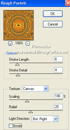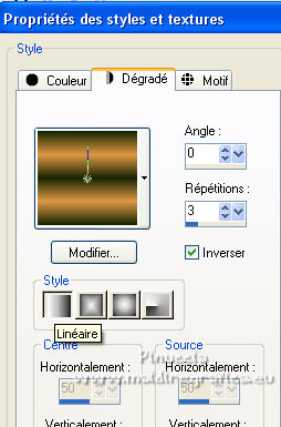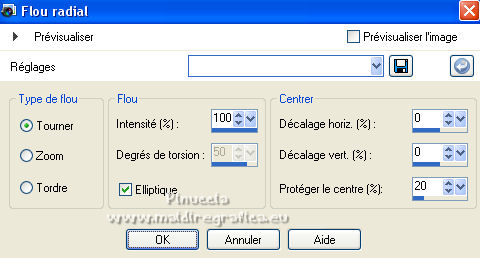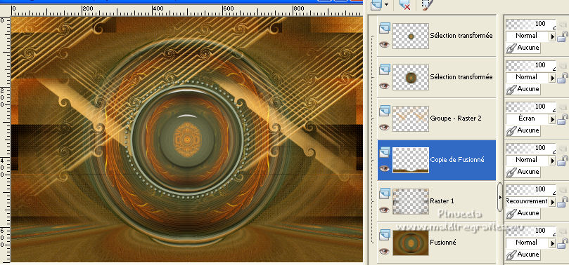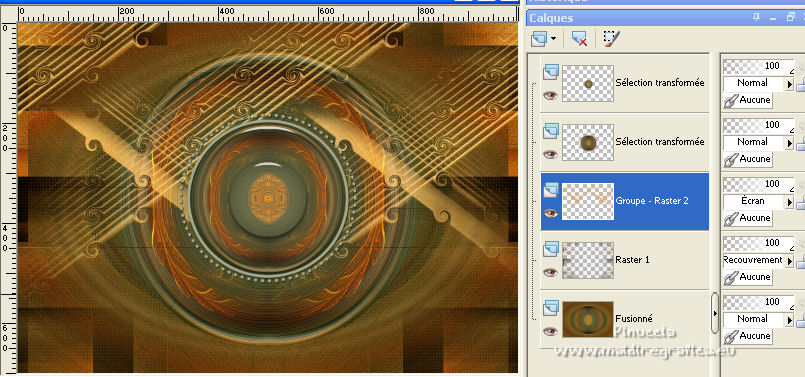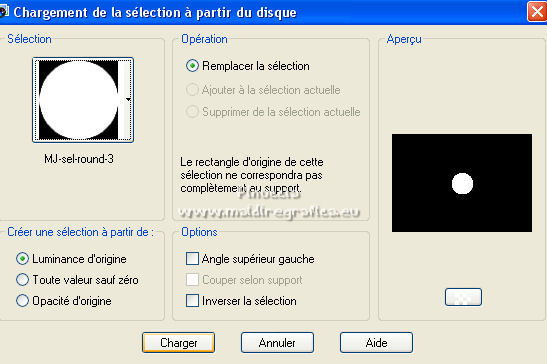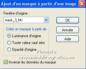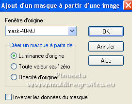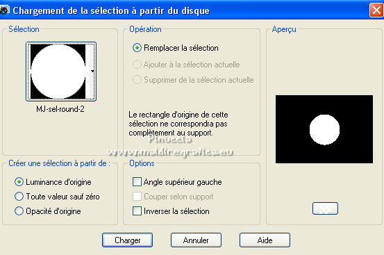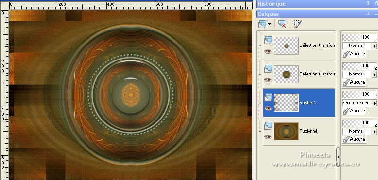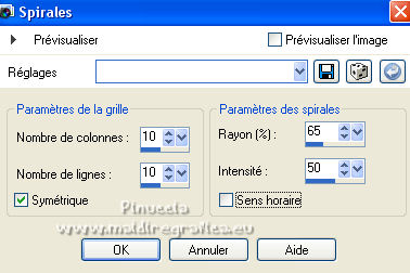 Pour traduire ce tutoriel j'ai utilisé PSPX7, PSPX2 et PSPX3, mais il peut également être exécuté avec les autres versions. Suivant la version utilisée, vous pouvez obtenir des résultats différents. Depuis la version X4, la fonction Image>Miroir a été remplacée par Image>Renverser horizontalement, et Image>Renverser avec Image>Renverser verticalement . Dans les versions X5 et X6, les fonctions ont été améliorées par la mise à disposition du menu Objets. Avec la nouvelle version X7, nous avons encore Image>Miroir et Image>Renverser/Retourner, mais avec nouvelles différences. Voir les détails à ce sujet ici Certaines dénominations ont changées entre les versions de PSP. Les plus frequentes dénominations utilisées: ![]() English translation here Vos versions ici![]() Nécessaire pour réaliser ce tutoriel: ![]() Le matériel est de Maria José. (ici les liens vers les sites des créateurs du matériel) ![]() consulter, si nécessaire, ma section des filtres ici Filters Unlimited 2.0 ici Almathera - A Warper ici Carolaine and Sensibility - CS_Halloween 2 ici Artistiques - Pastels ici Mura's Meister - Perspective Tiling ici Alien Skin Eye Candy 5 Impact - Perspective Shadow, Glass ici Mura's Seamless - Emboss at Alpha ici Filtres Mura's Seamless peuvent être utilisés seuls ou importés dans Filters Unlimited. voir comment le faire ici). Si un filtre est fourni avec cette icône, ![]() en fonction des couleurs utilisées, vous pouvez changer le mode mélange et l'opacité des calques. Dans les plus récentes versions de PSP, vous ne trouvez pas le dégradé d'avant plan/arriére plan ou Corel_06_029. Vous pouvez utiliser le dégradé des versions antérieures. Ici le dossier Dégradés de CorelX. Placer le preset En cliquant sur le preset une ou deux fois (selon vos réglages) automatiquement il se placera directement dans le dossier Settings de Alien Skin Eye Candy. pourquoi un ou deux clic voir ici ![]() Placer le preset Emboss 3 dans le dossier Paramètres par défaut. Placer les sélections dans le dossier Sélections. Ouvrir les masques dans PSP et les minimiser avec le reste du matériel. Placer en avant plan la couleur #de9744, et en arrière plan la couleur #172501. ![]() Préparer en avant plan un dégradé de premier plan/arrière plan, style Linéaire. ![]() 1. Ouvrir une nouvelle image transparente 1000 x 700 pixels. Remplir l'image transparente du dégradé.2. Sélections>Sélectionner tout. Ouvrir le tube mariajoseMJ-307 ![]() Effacer le watermark et Édition>Copier. Minimiser le tube. Revenir sur votre travail et Édition>Coller dans la sélection. Sélections>Désélectionner tout. 3. Effets>Effets d'image>Mosaïque sans jointures. ![]() 4. Effets>Modules Externes>Almathera - A Warper. ![]() 5. Effets>Modules Externes>Carolaine and Sensibility - CS_Halloween 2, par défaut. ![]() 7. Calques>Nouveau calque raster. Placer en avant plan la Couler. Remplir le calque avec la couleur claire d'avant plan.8. Calques>Nouveau calque de masque>A partir d'une image. Ouvrir le menu deroulant sous la fenêtre d'origine et vous verrez la liste des images ouvertes. Sélectionner le masque mask_3_MJ. ![]() Calques>Fusionner>Fusionner le groupe. 9. Effets>Filtre personnalisé - sélectionner le preset Emboss 3 et ok. ![]() 10. Effets>Effets d'image>Mosaïque sans jointures. ![]() 11. Placer le calque en mode Lumière dure. Calques>Fusionner>Calques visibles. 12. Effets>Modules Externes>Filters Unlimited 2.0 - Tile & Mirror - Distortion Mirror. ![]() 13. Effets>Effets de réflexion>Miroir rotatif, par défaut. ![]() 14. Sélections>Charger/Enregistrer une sélection>Charger à partir du disque. Chercher et charger la sélection MJ-sel-round-1 ![]() 15. Sélections>Inverser. Réglage>Flou>Flou radial. ![]() 16. Réglage>Ajouter/Supprimer du bruit>Ajouter du bruit. ![]() 17. Effets>Modules Externes>Artistiques - Pastels si vous utilisez la version anglais de ce filtre (le résultat ne change pas): Effets>Modules Externes>Artistic - Rough Pastels. ![]() 18. Effets>Effets de réflexion>Miroir rotatif, par défaut. ![]() 19. À nouveau Sélections>Inverser. Sélections>Transformer la sélection en calque. Sélections>Désélectionner tout. 20. Image>Redimensionner, 50%, redimensionner tous les calques décoché. 21. Effets>Modules Externes>Alien Skin Eye Candy 5 Impact - Glass. Sélectionner le preset marijo-glass et ok. ![]() 22. Ouvrir decoabayomi-MJ ![]() Édition>Copier. Revenir sur votre travail et Édition>Coller comme nouveau calque. Calques>Fusionner>Fusionner le calque de dessous. 23. Sélections>Charger/Enregistrer une sélection>Charger à partir du disque. Chercher et charger la sélection MJ-sel-round-3 ![]() Sélections>Transformer la sélection en calque. 24. Effets>Modules Externes>Alien Skin Eye Candy 5 Impact - Glass - preset marijo-glass. Sélections>Désélectionner tout. 25. Ouvrir deco1-MJ ![]() Édition>Copier. Revenir sur votre travail et Édition>Coller comme nouveau calque. Calques>Agencer>Déplacer vers le bas - 2 fois. Placer le calque en mode Recouvrement, ou autre. ![]() 26. Calques>Nouveau calque raster. Remplir le calque avec la couleur claire d'avant plan.27. Calques>Nouveau calque de masque>A partir d'une image. Ouvrir le menu deroulant sous la fenêtre d'origine et sélectionner le masque mask_40_MJ. ![]() Calques>Fusionner>Fusionner le groupe. 28. Effets>Modules Externes>Mura's Seamless - Emboss at Alpha, par défaut. ![]() 29. Effets>Effets d'image>Mosaïque sans jointures. ![]() 30. Effets>Effets de distorsion>Spirales. ![]() 31. Calques>Dupliquer. Calques>Fusionner>Fusionner le calque de dessous. 32. Sélections>Charger/Enregistrer une sélection>Charger à partir du disque. Chercher et charger la sélection MJ-sel-round-2 ![]() Presser CANC sur le clavier ![]() Sélections>Désélectionner tout. Placer le calque en mode Écran ou autre. ![]() 33. Vous positionner sur le calque Fusionné. Calques>Dupliquer. Effets>Modules Externes>Mura's 