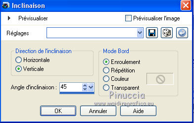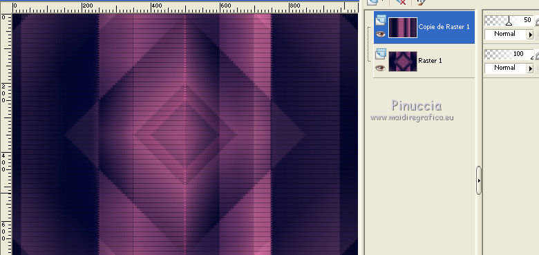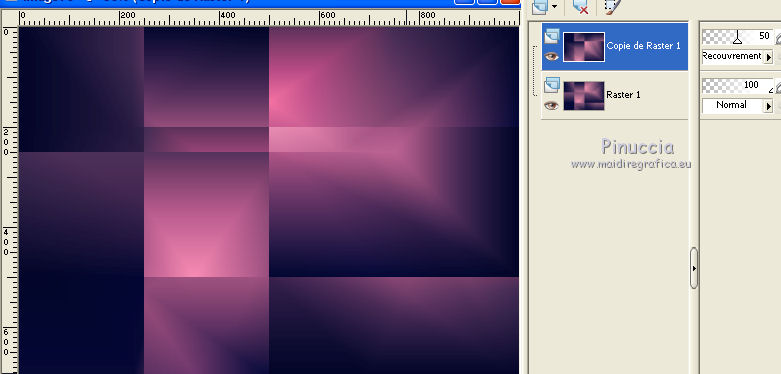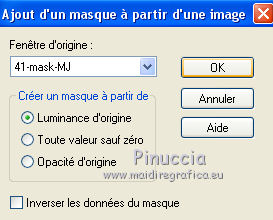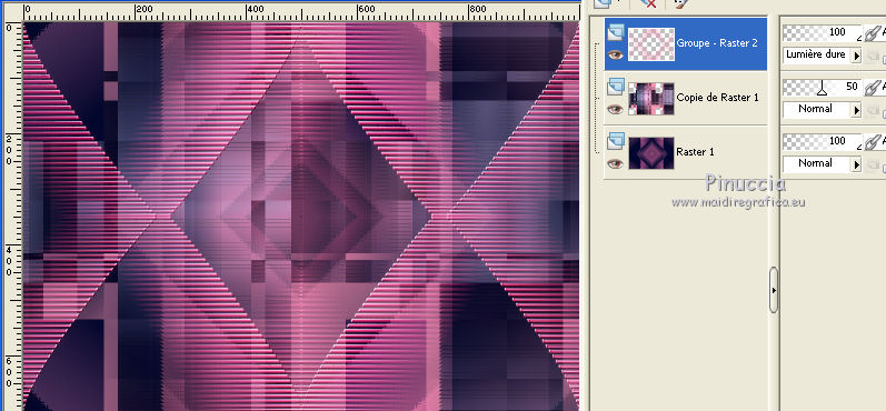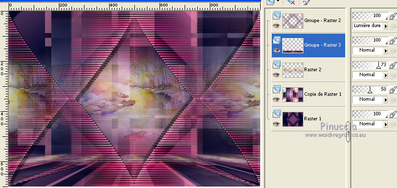 Pour traduire ce tutoriel j'ai utilisé PSPX7, PSPX2 et PSPX3, mais il peut également être exécuté avec les autres versions. Suivant la version utilisée, vous pouvez obtenir des résultats différents. Depuis la version X4, la fonction Image>Miroir a été remplacée par Image>Renverser horizontalement, et Image>Renverser avec Image>Renverser verticalement . Dans les versions X5 et X6, les fonctions ont été améliorées par la mise à disposition du menu Objets. Avec la nouvelle version X7, nous avons encore Image>Miroir et Image>Renverser/Retourner, mais avec nouvelles différences. Voir les détails à ce sujet ici Certaines dénominations ont changées entre les versions de PSP. Les plus frequentes dénominations utilisées: ![]() English translation here Vos versions ici![]() Nécessaire pour réaliser ce tutoriel: Matériel ici Merci pour le paysage Jewel et pour un masque Ket. Le reste du matériel est de Maria José. (ici les liens vers les sites des créateurs du matériel) Modules Externes: consulter, si nécessaire, ma section des filtres ici Filters Unlimited 2.0 ici Kiwi - Zig-zack ici Mehdi - Sorting Tiles ici Mura's Meister - Perspective Tiling ici L&K's - L&k's - Mayra ici Simple - Top Left Mirror ici Mura's Seamless - Emboss at Alpha ici VM Natural - Weave Distortion ici Toadies - Bitches Crystal ici AAA Filters - Foto Frame (ancienne version du filtre; vous la trouvez dans le matériel) Filtres Simple, Kiwi, Mura's Seamless, Toadies et VM Natural peuvent être utilisés seuls ou importés dans Filters Unlimited. voir comment le faire ici). Si un filtre est fourni avec cette icône, ![]() en fonction des couleurs utilisées, vous pouvez changer le mode mélange et l'opacité des calques. Dans les plus récentes versions de PSP, vous ne trouvez pas le dégradé d'avant plan/arrière plan ou Corel_06_029. Vous pouvez utiliser le dégradé des versions antérieures. Ici le dossier Dégradés de CorelX. Placer le masque !!!!mask.ket-fadesuave dans le dossier Masques. Ouvrir l'autre masque dans PSP et le minimiser avec le reste du matériel. Placer en avant plan la couleur #060c38, et en arrière plan la couleur #f696b1. ![]() Préparer en avant plan un dégradé de premier plan/arrière plan, style Rectangulaire. ![]() 1. Ouvrir une nouvelle image transparente 1000 x 700 pixels. Remplir l'image transparente du dégradé.2. Effets>Modules Externes>Mehdi - Sorting Tiles. ![]() 3. Calques>Dupliquer. Répéter Effets>Modules Externes>Mehdi - Sorting Tiles, comme précédemment, mais Mosaic coché. ![]() Placer le calque en mode Recouvrement et réduire l'opacité à 50%. Image>Renverser. ![]() Calques>Fusionner>Fusionner le calque de dessous. 4. Effets>Effets géométriques>Inclinaison. ![]() 5. Effets>Modules Externes>Kiwi - Zig-Zack, par défaut. ![]() 6. Effets>Modules Externes>Simple - Top Left Mirror. ![]() Réglage>Netteté>Netteté. 7. Calques>Dupliquer. Effets>Modules Externes>L&K's - L&K's Mayra. ![]() Réduire l'opacité de ce calque à 50%. ![]() 8. Effets>Modules Externes>VM Natural - Weave Distortion. ![]() 9. Effets>Modules Externes>Toadies - Bitches Crystal, par défaut. ![]() 10. Calques>Nouveau calque raster. Remplir le calque avec la couleur claire d'arrière plan.Calques>Nouveau calque de masque>A partir d'une image. Ouvrir le menu deroulant sous la fenêtre d'origine et vous verrez la liste des images ouvertes. Sélectionner le masque 41-mask_MJ. ![]() Calques>Fusionner>Fusionner le groupe. 11. Effets>Modules Externes>Mura's Meister - Emboss at Alpha, par défaut. ![]() Placer le calque en mode Lumière dure. ![]() 12. Effets>Effets 3D>Ombre portée, par défaut. ![]() Répéter Ombre portée, vertical et horizontal -10. 13. Ouvrir le misted et Édition>Copier. Revenir sur votre travail et Édition>Coller comme nouveau calque. Réduire l'opacité de ce calque à 73%. Calques>Agencer>Déplacer vers le bas. 14. Effets>Effets d'image>Mosaïque sans jointures. ![]() 15. Vous positionner sur le calque du haut de la pile, Groupe-Raster 2. Édition>Copie Spéciale>Copier avec fusion. 16. Édition>Coller comme nouveau calque. 17. Effets>Modules Externes>Mura's Meister - Perspective Tiling. ![]() 18. Calques>Charger/Enregistrer un masque>Charger à partir du disque. Chercher et charger le masque !!!!mask.ket-fadesuave 1. ![]() Calques>Fusionner>Fusionner le groupe. Calques>Agencer>Déplacer vers le bas. La tag et les calques - régler Modes mélange et opacitées selon vos couleurs. ![]() 19. Vous positionner sur le calque du haut de la pile. Ouvrir le tube de la femme et Édition>Copier. Revenir sur votre travail et Édition>Coller comme nouveau calque. Déplacer le tube à gauche.Effets>Effets 3D>Ombre portée, à choix. 20. Ouvrir le déco et Édition>Copier. Revenir sur votre travail et Édition>Coller comme nouveau calque. Déplacer le tube en bas à droite.Effets>Effets 3D>Ombre portée, à choix. 21. Vous positionner sur le calque Raster 1. Édition>Copier Pour précaution Édition>Coller comme nouvelle image et minimizer cette image. 22. Revenir sur votre travail. Image>Ajouter des bordures, 1 pixel, symétrique, couleur claire. Image>Ajouter des bordures, 2 pixels, symétrique, couleur foncée. Image>Ajouter des bordures, 1 pixel, symétrique, couleur claire. 23. Sélections>Sélectionner tout. Image>Ajouter des bordures, 50 pixels, symétrique, couleur blanche. 24. Sélections>Inverser. Édition>Coller dans la sélection. 25. Effets>Effets 3D>Ombre portée, couleur blanche. ![]() 26. Sélections>Inverser. Répéter Effets>Effets 3D>Ombre portée, couleur noire. ![]() Sélections>Désélectionner tout. 27. Effets>Modules Externes>AAA Filters - Foto Frame. Pour avoir le même effet, il faut utiliser l'ancienne version de ce filtre, où l'Effet Foto Frame était dans la liste AAA Filters J'ai ajouté l'effet dans le matériel Lors que vous ajoutez le filtre dans les Emplacements des fichiers, ne pas oublier de supprimer la précédente version du filtre !