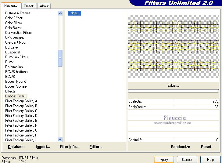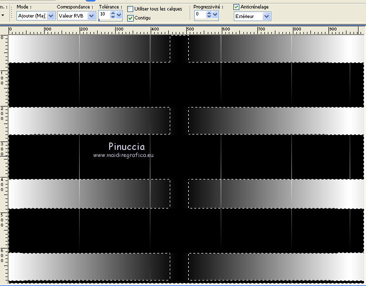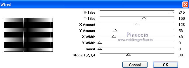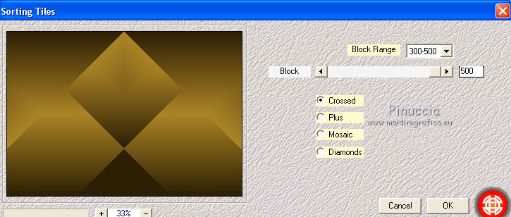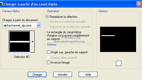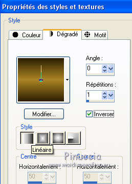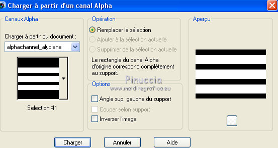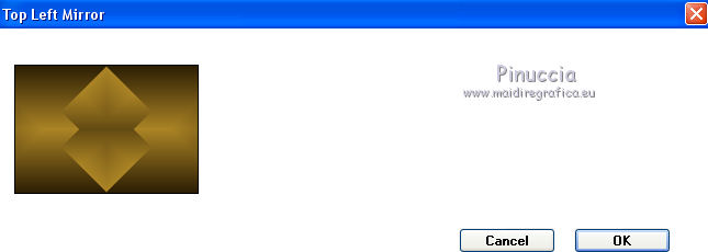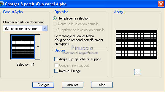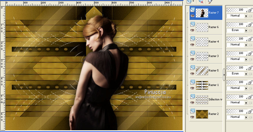 Pour traduire ce tutoriel j'ai utilisé CorelX17, mais il peut également être exécuté avec les autres versions. Suivant la version utilisée, vous pouvez obtenir des résultats différents. Depuis la version X4, la fonction Image>Miroir a été remplacée par Image>Renverser horizontalement, et Image>Renverser avec Image>Renverser verticalement . Dans les versions X5 et X6, les fonctions ont été améliorées par la mise à disposition du menu Objets. Avec la nouvelle version X7, nous avons encore Image>Miroir et Image>Renverser/Retourner, mais avec nouvelles différences. Voir les détails à ce sujet ici Certaines dénominations ont changées entre les versions de PSP. Les plus frequentes dénominations utilisées: ![]() Vos versions ici Nécessaire pour réaliser ce tutoriel: Matériel ici Pour le tube merci Nena Silva. (ici les liens vers les sites des créateurs de tubes) Modules Externes: consulter, si nécessaire, ma section des filtres ici Filters Unlimited 2.0 ici Emboss Filters - Edger - dans le matériel. VM Instant Art - Wired ici Graphics Plus - Vertical Mirror ici Mehdi - Sorting Tiles ici Simple - Top Left Mirror ici Toadies - What are you ici Filtres VM Instant Art, Graphics Plus, Simple et Toadies peuvent être utilisés seuls ou importés dans Filters Unlimited. voir comment le faire ici). Si un filtre est fourni avec cette icône, ![]() en fonction des couleurs utilisées, vous pouvez changer le mode mélange et l'opacité des calques. Dans les plus récentes versions de PSP, vous ne trouvez pas le dégradé d'avant plan/arrière plan ou Corel_06_029. Vous pouvez utiliser le dégradé des versions antérieures. Ici le dossier Dégradés de CorelX. 1. Placer en avant plan la couleur #ab8425, et en arrière plan la couleur #2d1f04. ![]() Préparer en avant plan un dégradé de premier plan/arrière plan, style Linéaire. ![]() 2. Ouvrir alphachannel_alyciane. Fenêtre>Dupliquer ou sur le clavier shift+D pour faire une copie. ![]() Fermer l'original. La copie, qui sera la base de votre travail, n'est pas vide, mais contient les sélections enregistrées sur le canal alpha. Remplir l'image transparente du dégradé.2. Effets>Modules Externes>VM Instant Art - Wired. ![]() 3. Activer l'outil Baguette magique , tolérance 10,et cliquer sur la partie noire pour la sélectionner (cliquer plusieures fois pour bien sélectionner) ![]() Presser quelques fois CANC sur le clavier ![]() ![]() Sélections>Désélectionner tout. 4. Effets>Modules Externes>Graphics Plus - Vertical Mirror, par défaut. ![]() 5. Effets>Effets de réflexion>Miroir rotatif ![]() 6. Effets>Effets 3D>Ombre portée, couleur noire. ![]() Répéter Ombre portée, vertical et horizontal -1. 7. Placer en avant plan la couleur. Activer l'outil Changeur de couleur ![]() ![]() Cliquer sur l'image avec la touche gauche de la souris, pour changer votre image avec la couleur d'avant plan #ab8425. ![]() 8. Réglage>Ajouter/Supprimer du bruit>Ajouter du bruit. ![]() Réglage>Netteté>Netteté. 9. Placer à nouveau le dégradé en avant plan. Calques>Nouveau calque raster. Remplir le calque du dégradé.Calques>Agencer>Déplacer vers le bas. 10. Effets>Modules Externes>Mehdi - Sorting Tiles. ![]() 11. Effets>Modules Externes>Simple - Top Left Mirror. ![]() 12. Effets>Effets d'image>Mosaïque sans jointures. ![]() 13. Effets>Effets de bords>Accentuer davantage. 14. Sur ce calque: Sélections>Charger/Enregistrer une sélection>Charger à partir d'un canal alpha. La sélection #1 est déjà disponible. On doit seulement cliquer sur Charger. ![]() Sélections>Transformer la sélection en calque. 15. Effets>Effets de textures>Textile couleur du tissage: noir couleur des interstices: blanc. ![]() Sélections>Désélectionner tout. 16. Sélections>Charger/Enregistrer une sélection>Charger à partir d'un canal alpha. Ouvrir le menu des sélections et charger la sélection #4. ![]() Presser CANC sur le clavier. Sélections>Désélectionner tout. 17. Effets>Modules Externes>Filters Unlimited 2.0 - Emboss filters - Edger, par défaut. ![]() 18. Effets>Effets de distorsion>Vent - vers la gauche, intensité 100. ![]() Répéter l'Effet Vent vers la droite. ![]() 19. Effets>Modules Externes>Graphics Plus - Vertical Mirror, par défaut. ![]() 20. Vous positionner sur le calque Raster 1. Sélections>Charger/Enregistrer une sélection>Charger à partir d'un canal alpha. Ouvrir le menu des sélections et charger la sélection #2. ![]() Calques>Nouveau calque raster. 21. Effets>Effets 3D>Découpe, couleur noire. ![]() Sélections>Désélectionner tout. Calques>Dupliquer. Image>Miroir. Calques>Fusionner>Fusionner le calque de dessous. Calques>Dupliquer. Image>Renverser. Calques>Fusionner>Fusionner le calque de dessous. 22. Ouvrir le tube deco_alyciane_mj - Édition>Copier. Revenir sur votre travail et Édition>Coller comme nouveau calque. 23. Sélections>Charger/Enregistrer une sélection>Charger à partir d'un canal alpha. Ouvrir le menu des sélections et charger la sélection #3. ![]() 24. Calques>Nouveau calque raster. Placer en avant plan le dégradé et placer Angle à 90 ![]() Remplir le calque du dégradé.Sélections>Désélectionner tout. 25. Effets>Effets de bords>Enhance More. 26. Effets>Modules Externes>Toadies - What are you. ![]() 27. Effets>Effets géométriques>Inclinaison. ![]() 28. Effets>Effets d'image>Mosaïque sans jointures. ![]() 29. Calques>Agencer>Déplacer vers le bas - 2 fois. Placer le calque en mode Écran. 30. Ouvrir le tube deco_alyciane_1_mj - Édition>Copier. Revenir sur votre travail et Édition>Coller comme nouveau calque. Calques>Agencer>Placer en haut de la pile. Placer le calque en mode Écran. 31. Ouvrir le tube de la femme - Édition>Copier. Revenir sur votre travail et Édition>Coller comme nouveau calque. Image>Miroir. Image>Redimensionner, à 70%, redimensionner tous les calques décoché. Positionner bien le tube.Effets>Effets 3D>Ombre portée, à choix. La tag et les calques ![]() Calques>Fu