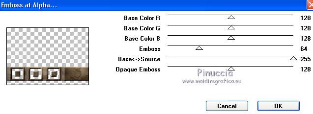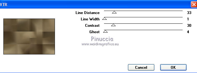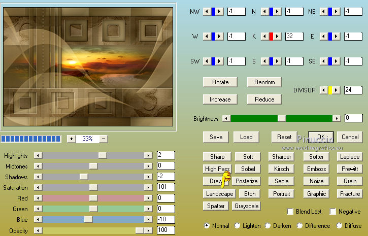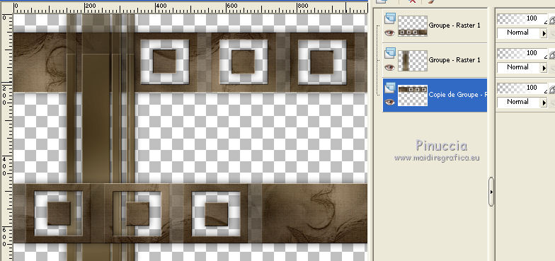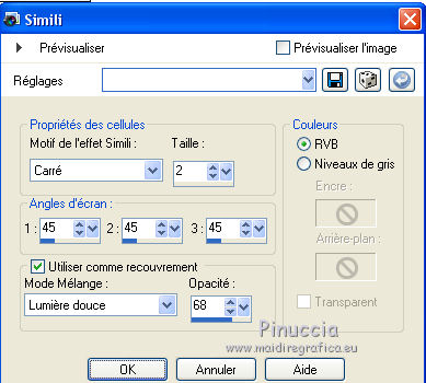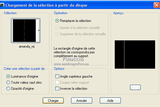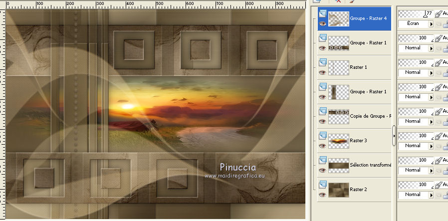 Pour traduire ce tutoriel j'ai utilisé CorelX17, mais il peut également être exécuté avec les autres versions. Suivant la version utilisée, vous pouvez obtenir des résultats différents. Depuis la version X4, la fonction Image>Miroir a été remplacée par Image>Renverser horizontalement, et Image>Renverser avec Image>Renverser verticalement . Dans les versions X5 et X6, les fonctions ont été améliorées par la mise à disposition du menu Objets. Avec la nouvelle version X7, nous avons encore Image>Miroir et Image>Renverser/Retourner, mais avec nouvelles différences. Voir les détails à ce sujet ici Certaines dénominations ont changées entre les versions de PSP. Les plus frequentes dénominations utilisées: ![]() Vos versions ici Nécessaire pour réaliser ce tutoriel: Matériel ici Merci: pour les tubes merci Nena Silva, Edwige, Betje et Renée; pour les masques Cameron et Magnolia. Pour l'image d'arrière plan merci JHanna. (ici les liens vers les sites des créateurs de tubes) Modules Externes: consulter, si nécessaire, ma section des filtres ici Filters Unlimited 2.0 ici Mehdi - Sorting Tiles ici Penta.com - VTR ici Mura's Seamless - Emboss at Alpha ici Alien Skin Eye Candy 5 Impact - Glass ici AAA Filters - Custom ici Filtres Penta.com et Mura's Seamless peuvent être utilisés seuls ou importés dans Filters Unlimited. voir comment le faire ici). Si un filtre est fourni avec cette icône, ![]() en fonction des couleurs utilisées, vous pouvez changer le mode mélange et l'opacité des calques. Placer le preset En cliquant sur le preset une ou deux fois (selon vos réglages) automatiquement il se placera directement dans le dossier Settings de Alien Skin Eye Candy. pourquoi un ou deux clic voir ici Placer les sélections dans le dossier Sélections. Ouvrir les masques dans PSP et les minimiser avec le reste du matériel. 1. Placer en avant plan la couleur #927956, et en arrière plan la couleur #3d2f15. ![]() 2. Ouvrir une nouvelle image transparente 1000 x 700 pixels. Sélections>Sélectionner tout. 3. Ouvrir l'image d'arrière plan JHanna_377 - Édition>Copier. Revenir sur votre travail et Édition>Coller dans la sélection. Sélections>Désélectionner tout. 4. Effets>Effets d'image>Mosaïque sans jointures. ![]() 5. Réglage>Flou>Flou gaussien - rayon 50. ![]() 6. Calques>Nouveau calque de masque>A partir d'une image. Ouvrir le menu deroulant sous la fenêtre d'origine et vous verrez la liste des images ouvertes. Sélectionner le masque cameron2. ![]() Calques>Fusionner>Fusionner le groupe. 7. Effets>Modules Externes>Mura's Seamless - Emboss at Alpha, par défaut ![]() 8. Effets>Effets 3D>Ombre portée, couleur noire. ![]() 9. Calques>Nouveau calque raster. Sélections>Sélectionner tout. 10. Édition>Coller dans la sélection (l'image de JHanna est toujours en mémoire). Sélections>Désélectionner tout. 11. Effets>Effets d'image>Mosaïque sans jointures. ![]() 12. Calques>Nouveau calque de masque>A partir d'une image. Ouvrir le menu deroulant sous la fenêtre d'origine et sélectionner le masque cameron1. ![]() Calques>Fusionner>Fusionner le groupe. 13. Effets>Modules Externes>Mura's Seamless - Emboss at Alpha, par défaut ![]() 14. Effets>Effets 3D>Ombre portée, couleur noire. ![]() 15. Calques>Dupliquer. Image>Miroir. Image>Renverser. 16. Calques>Agencer>Déplacer vers le bas 2 fois ![]() 17. Calques>Nouveau calque raster. Calques>Agencer>Déplacer vers le haut Remplir le calque avec la couleur claire #927956.18. Sélections>Charger/Enregistrer une sélection>Charger à partir du disque. Chercher et charger la sélection amanda_mj. ![]() 19. Sélections>Inverser. Presser CANC sur le clavier ![]() Sélections>Inverser. 20. Effets>Modules Externes>Alien Skin Eye Candy 5 Impact - Glass sélectionner le preset glass_amanda_mj et ok. ![]() Sélections>Désélectionner tout. 21. Calques>Nouveau calque raster. Calques>Agencer>Placer en bas de la pile. Sélections>Sélectionner tout. 22. Édition>Coller dans la sélection (l'image d'arrière plan est toujours en mémoire). Sélections>Désélectionner tout. 23. Effets>Effets d'image>Mosaïque sans jointures. ![]() 24. Réglage>Flou>Flou gaussien - rayon 50 ![]() 25. Effets>Modules Externes>Mehdi - Sorting Tiles. ![]() 26. Effets>Effets de bords>Accentuer davantage. 27. Effets>Modules Externes>Penta.com - VTR, par défaut. ![]() 28. Sur ce calque: Sélections>Charger/Enregistrer une sélection>Charger à partir du disque. Chercher et charger la sélectiona amanda_j_mj. ![]() Sélections>Transformer la sélection en calque. Réglage>Flou>Flou gaussien - rayon 50. 29. Calques>Nouveau calque raster. Ouvrir le misted du paysage et Édition>Copier. Revenir sur votre travail et Édition>Coller dans la sélection. Sélections>Désélectionner tout. 30. Calques>Nouveau calque raster. Calques>Agencer>Placer en haut de la pile. Remplir le calque avec la couleur claire.31. Calques>Nouveau calque de masque>A partir d'une image. Ouvrir le menu deroulant sous la fenêtre d'origine et sélectionner le masque mask_magnolia. ![]() Calques>Fusionner>Fusionner le groupe. 32. Effets>Modules Externes>Mura's Seamless - Emboss at Alpha, par défaut. ![]() 33. Effets>Effets artistiques>Simili. ![]() Placer le calque en mode Écran et réduire l'opacité +/-77% (si nécessaire). ![]() Calques>Fusionner>Calques visibles. 34. Effets>Modules Externes>AAA Filters - Custom - cliquer sur Landscape et ok. ![]() 35. Ouvrir le déco - Édition>Copier. Revenir sur votre travail et Édition>Coller comme nouveau calque. Image>Redimensionner, à 75%, redimensionner tous les calques décoché. Déplacer le tube en bas à gauche.Effets>Effets 3D>Ombre portée, à choix. 36. Ouvrir le tube de la femme - Édition>Copier. Revenir sur votre travail et Édition>Coller comme nouveau calque. Image>Redimensionner, à 95%, redimensionner tous les calques décoché. Déplacer le tube à droite.Effets>Effets 3D>Ombre portée, à choix. Calques>Fusionner>Calques visi