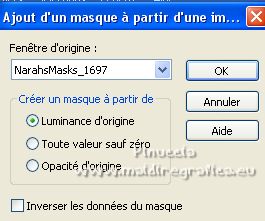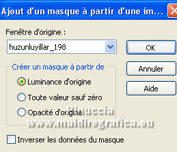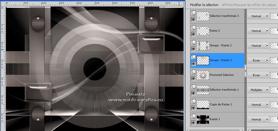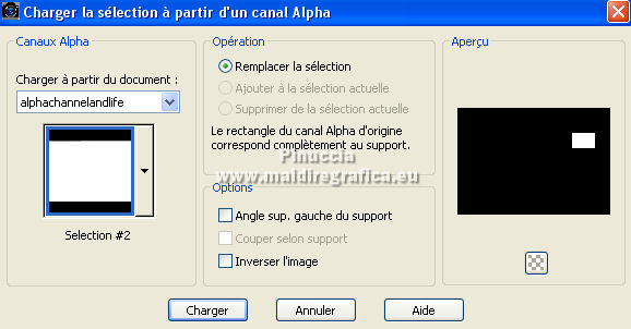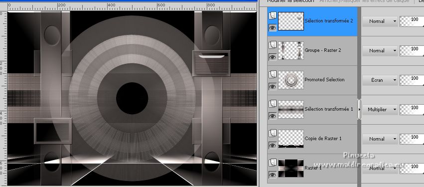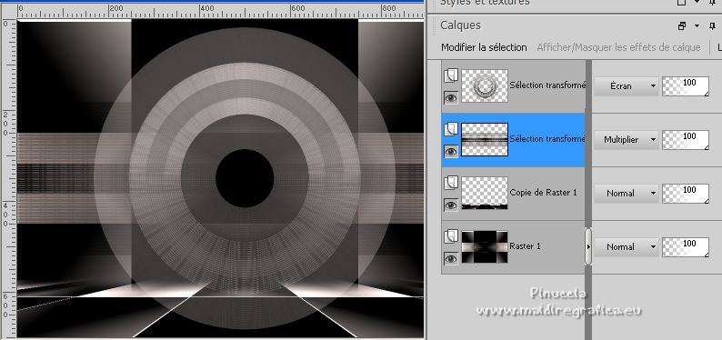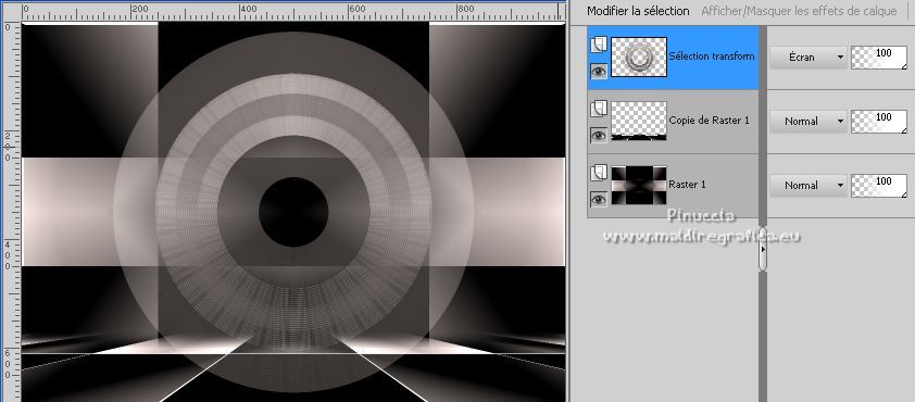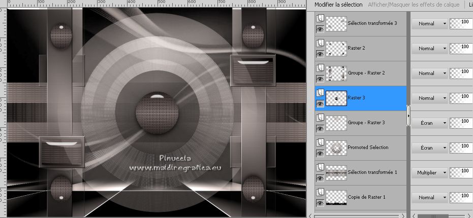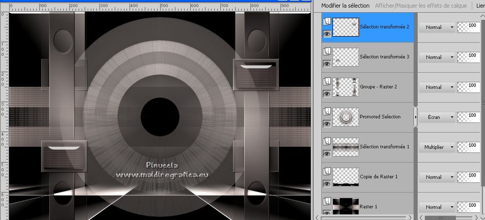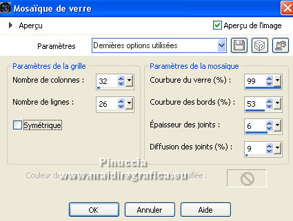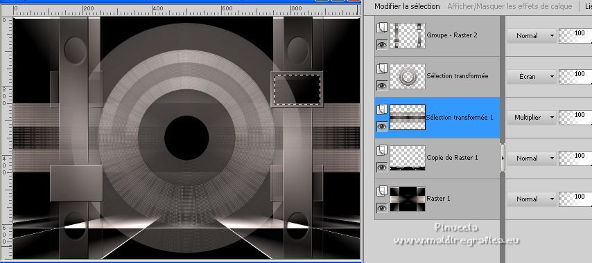 Pour traduire ce tutoriel j'ai utilisé PSPX7, PSPX2 et PSPX3, mais il peut également être exécuté avec les autres versions. Suivant la version utilisée, vous pouvez obtenir des résultats différents. Depuis la version X4, la fonction Image>Miroir a été remplacée par Image>Renverser horizontalement, et Image>Renverser avec Image>Renverser verticalement . Dans les versions X5 et X6, les fonctions ont été améliorées par la mise à disposition du menu Objets. Avec la nouvelle version X7, nous avons encore Image>Miroir et Image>Renverser/Retourner, mais avec nouvelles différences. Voir les détails à ce sujet ici Certaines dénominations ont changées entre les versions de PSP. Les plus frequentes dénominations utilisées: ![]() English translation here Vos versions ici![]() Nécessaire pour réaliser ce tutoriel: Matériel ici Merci pour les tubes Beatriz et pour les masques Narah et Hüzünlüyillar Le reste du matériel est de Maria José. (ici les liens vers les sites des créateurs du matériel) Modules Externes: consulter, si nécessaire, ma section des filtres ici Filters Unlimited 2.0 ici Kiwi Oelfilter - Setzboard ici Mura's Meister - Perspective Tiling ici Mura's Meister - Pole Transform ici Mehdi - Sorting Tiles ici Simple - Top Left Mirror ici Toadies - What are you ici Mura's Seamless - Emboss at Alpha ici Graphics Plus - Cross Shadow ici Alien Skin Eye Candy 5 Impact - Glass ici Cybia - Screenworks ici AAA Frames ici Filtres Simple, Toadies, Mura's Seamless, Graphics Plus et Cybia peuvent être utilisés seuls ou importés dans Filters Unlimited. voir comment le faire ici). Si un filtre est fourni avec cette icône, ![]() en fonction des couleurs utilisées, vous pouvez changer le mode mélange et l'opacité des calques. Dans les plus récentes versions de PSP, vous ne trouvez pas le dégradé d'avant plan/arrière plan ou Corel_06_029. Vous pouvez utiliser le dégradé des versions antérieures. Ici le dossier Dégradés de CorelX. Placer le preset En cliquant sur le preset une ou deux fois (selon vos réglages) automatiquement il se placera directement dans le dossier Settings de Alien Skin Eye Candy. pourquoi un ou deux clic voir ici Ouvrir les masques dans PSP et les minimiser avec le reste du matériel. 1. Placer en avant plan la couleur #2d2827, et en arrière plan la couleur #a59995. ![]() Préparer en avant plan un dégradé de premier plan/arrière plan, style Linéaire. ![]() Ouvrir alphachannelandlife. Fenêtre>Dupliquer ou sur le clavier shift+D pour faire une copie. ![]() Fermer l'original. La copie, qui sera la base de votre travail, n'est pas vide, mais contient les sélections enregistrées sur le canal alpha. Remplir l'image transparente avec la couleur claire d'arrière plan #a59995.2. Effets>Modules Externes>Kiwi - Setzboard. ![]() 3. Calques>Dupliquer. Effets>Effets de réflexion>Miroir rotatif, par défaut. ![]() 4. Effets>Modules Externes>Mura's Meister - Perspective Tiling. ![]() 5. Activer l'outil Baguette magique , tolérance et progressivité 0,et cliquer dans la partie transparente pour la sélectionner. Sélections>Modifier>Progressivité intérieur/extérieur. ![]() Presser +/-10 fois CANC sur le clavier ![]() Sélections>Désélectionner tout. 6. Vous positionner sur le calque Raster 1. Effets>Modules Externes>Mehdi - Sorting Tiles. ![]() 7. Effets>Modules Externes>Simple - Top Left Mirror. ![]() 8. Effets>Effets de réflexion>Miroir rotatif. ![]() Répéter Effets>Effets de réflexion>Miroir rotatif, horizontal 0 ![]() 9. Sélections>Charger/Enregistrer une sélection>Charger à partir d'un canal alpha. La sélection #1 est déjà disponible. On doit seulement cliquer sur Charger. ![]() Sélections>Transformer la sélection en calque. 10. Effets>Effets de textures>Mosaïque de verre. ![]() Sélections>Désélectionner tout. 11. Effets>Modules Externes>Toadies - What are you. ![]() Répéter l'Effet What are you, comme précédemment. ![]() 12. Effets>Modules Externes>Mura's Meister - Pole Transform. ![]() Calques>Agencer>Déplacer vers le haut. Placer le calque en mode Écran. ![]() 13. Vous positionner à nouveau sur le calque Raster 1. Sélections>Charger/Enregistrer une sélection>Charger à partir d'un canal alpha. Charger à nouveau la sélection #1. ![]() Sélections>Transformer la sélection en calque. 14. Effets>Effets de textures>Mosaïque de verre, comme précédemment. ![]() Sélections>Désélectionner tout. 15. Effets>Modules Externes>Toadies - What are you, comme précédemment. ![]() 16. Effets>Effets d'image>Mosaïque sans jointures. ![]() Placer le calque en mode Multiplier. Calques>Agencer>Déplacer vers le haut. ![]() 17. Calques>Nouveau calque raster. Calques>Agencer>Placer en haut de la pile. Remplir le calque du dégradé.Calques>Nouveau calque de masque>A partir d'une image. Ouvrir le menu deroulant sous la fenêtre d'origine et vous verrez la liste des images ouvertes. Sélectionner le masque hüzünlüyillar_198. ![]() Calques>Fusionner>Fusionner le groupe. 18. Effets>Modules Externes>Mura's Seamless - Emboss at Alpha, par défaut. ![]() 19. Effets>Modules Externes>Graphics Plus - Cross Shadow. ![]() 20. Sélections>Charger/Enregistrer une sélection>Charger à partir d'un canal alpha. Ouvrir le menu des sélections et charger la sélection #2 ![]() 21. Sélections>Modifier>Contracter - 10 pixels. Presser CANC sur le clavier. 22. Vous positionner sur le calque Sélection transformée 1. ![]() Sélections>Transformer la sélection en calque. Calques>Agencer>Placer en haut de la pile. 23. Effets>Modules Externes>Alien Skin Eye Candy 5 Impact - Glass sélectionner le preset glass_majo et ok. ![]() Si vous utilisez des autres couleurs, changer Glass Color avec votre couleur d'avant plan. Sélections>Désélectionner tout. ![]() 24. Vous positionner sur le calque de dessous Groupe-Raster 2. Sélections>Charger/Enregistrer une sélection>Charger à partir d'un canal alpha. Ouvrir le menu des sélections et charge