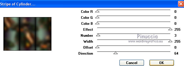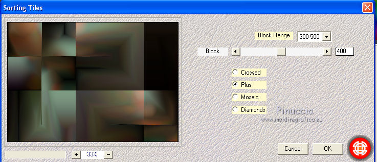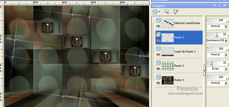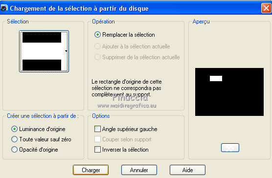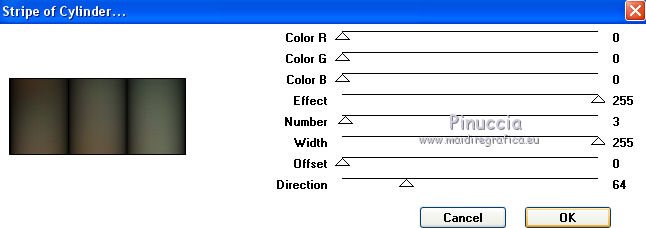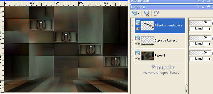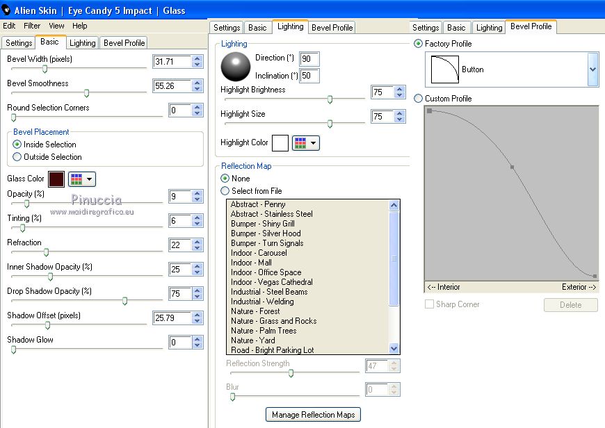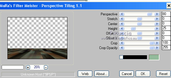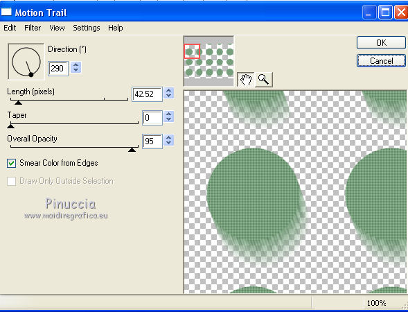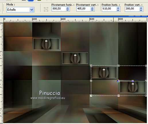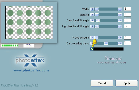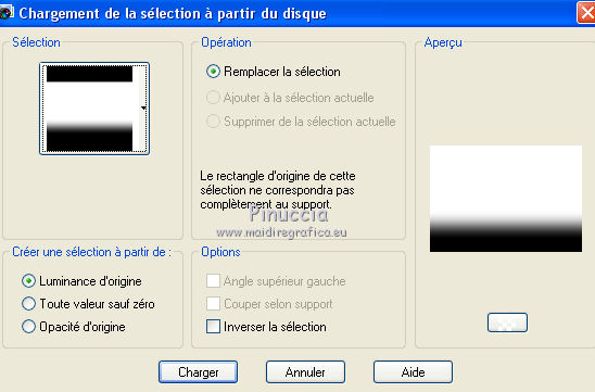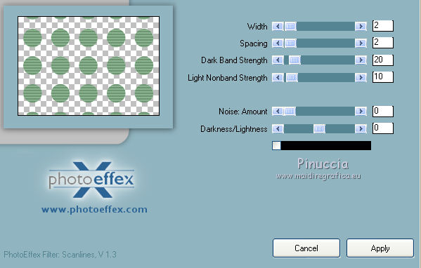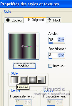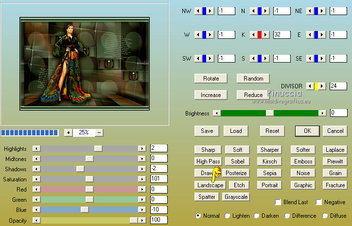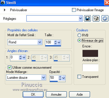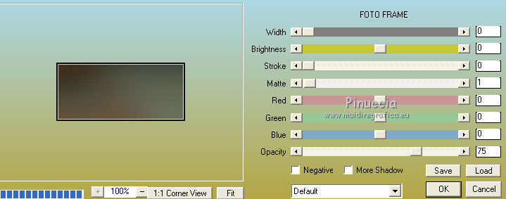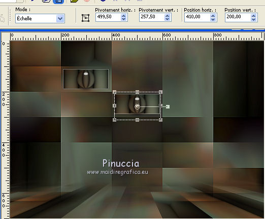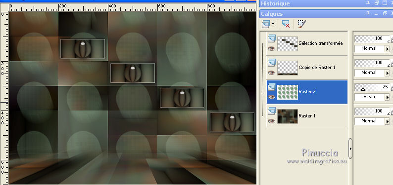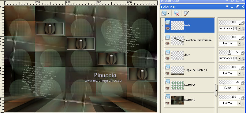 Pour traduire ce tutoriel j'ai utilisé CorelX12, mais il peut également être exécuté avec les autres versions. Suivant la version utilisée, vous pouvez obtenir des résultats différents. Depuis la version X4, la fonction Image>Miroir a été remplacée par Image>Renverser horizontalement, et Image>Renverser avec Image>Renverser verticalement . Dans les versions X5 et X6, les fonctions ont été améliorées par la mise à disposition du menu Objets. Avec la nouvelle version X7, nous avons encore Image>Miroir et Image>Renverser/Retourner, mais avec nouvelles différences. Voir les détails à ce sujet ici Certaines dénominations ont changées entre les versions de PSP. Les plus frequentes dénominations utilisées: ![]() Vos versions iciNécessaire pour réaliser ce tutoriel: Matériel ici Le matériel est de Maria José (ici les liens vers les sites des créateurs de tubes) Modules Externes: consulter, si nécessaire, ma section des filtres ici Filters Unlimited 2.0 ici Mehdi - Sorting Tiles ici Photoeffex - Scanlines ici Eye Candy 4000 - Motion Trail ici Mura's Meister - Perspective Tiling ici Alien Skin Eye Candy 5 Impact - Glass ici Mura's Seamless - Stripe of Cylinder ici AAA Frames - Foto Frame /AAA Filters - Custom ici Filtres Mura's Seamless peuvent être utilisés seuls ou importés dans Filters Unlimited. voir comment le faire ici). Si un filtre est fourni avec cette icône, ![]() en fonction des couleurs utilisées, vous pouvez changer le mode mélange et l'opacité des calques. Placer le preset En cliquant sur le preset une ou deux fois (selon vos réglages) automatiquement il se placera directement dans le dossier Settings de Alien Skin Eye Candy. pourquoi un ou deux clic voir ici Placer les sélections dans le dossier Sélections. 1. Ouvrir une nouvelle image transparente 1000 x 700 pixels. Placer en avant plan la couleur #240a1e, et en arrière plan la couleur #93ba9b. ![]() Préparer en avant plan un dégradé de premier plan/arrière plan, style Linéaire. ![]() Remplir l'image transparente avec la couleur foncée d'arrière plan.2. Sélections>Sélectionner tout. Ouvrir le tube de la femme, effacer le watermark et Édition>Copier. Minimiser le tube. Revenir sur votre travail et Édition>Coller dans la sélection. Sélections>Désélectionner tout. 3. Effets>Effets d'image>Mosaïque sans jointures, par défaut. ![]() 4. Réglage>Flou>Flou gaussien - rayon 25. ![]() 5. Effets>Modules Externes>Mura's Seamless - Stripe of Cylinder, par défaut. ![]() 6. Effets>Modules Externes>Mehdi - Sorting Tiles. ![]() 7. Calques>Dupliquer. Image>Renverser. Image>Miroir. Réduire l'opacité de ce calque à 50%. Calques>Fusionner>Fusionner le calque de dessous. 8. Effets>Effets de bords>Accentuer. 9. Calques>Dupliquer. Effets>Modules Externes>Mura's Meister - Perspective Tiling. ![]() 10. Sélections>Charger/Enregistrer une sélection>Charger à partir du disque. Chercher et charger la sélection angel_mj. ![]() Presser 10 fois CANC sur le clavier ![]() Sélections>Désélectionner tout. 11. Vous positionner sur le calque du bas de la pile, Raster 1. Sélections>Charger/Enregistrer une sélection>Charger à partir du disque. Chercher et charger la sélection angel_1_mj. ![]() Sélections>Transformer la sélection en calque. 12. Effets>Modules Externes>AAA Frames - Foto Frame. ![]() 13. Sélections>Modifier>Contracter - 3 pixels. 14. Effets>Modules Externes>Mura's Seamless - Stripe of Cylinder, par défaut. ![]() 15. Effets>Effets géométriques>Cercle ![]() 16. Effets>Modules Externes>Alien Skin Eye Candy 5 Impact - Glass. Sélectionner le preset glass_majo et ok ![]() Ci-dessous les réglages, en cas de problème avec le preset. ![]() Sélections>Désélectionner tout. 17. Calques>Dupliquer. Positionner l'image comme ci-dessous.![]() Calques>Fusionner>Fusionner le calque de dessous. 18. Calque>Dupliquer. Positionner l'image comme ci-dessous.![]() Calques>Fusionner>Fusionner le calque de dessous. Effets>Effets 3D>Ombre portée, couleur noire. ![]() Calques>Agencer>Placer en haut de la pile. ![]() 19. Calques>Nouveau calque raster. Remplir avec la couleur claire d'arrière plan #93ba9b.20. Effets>Effets artistiques>Simili. ![]() 21. Activer l'outil Baguette magique ![]() et cliquer sur la partie claire pour la sélectionner. ![]() Presser CANC sur le clavier. Sélections>Désélectionner tout. 22. Effets>Modules Externes>Photoeffex - Scanlines ![]() Répéter l'Effet Scanlines, cette fois vertical coché. ![]() 23. Effets>Modules Externes>Eye Candy 4000 - Motion Trail. ![]() Réduire l'opacité de ce calque à 25%. Calques>Agencer>Déplacer ver le bas - 2 fois. Placer le calque en mode Écran et réduire l'opacité à 25%. ![]() 24. Ouvrir le tube deco_angelica et Édition>Copier. Revenir sur votre travail et Édition>Coller comme nouveau calque. Placer le calque en mode Luminance (héritée) et réduire l'opacité à 50%. Réglage>Netteté>Davantage de netteté. Calques>Agencer>Déplacer vers le haut ![]() 25. Ouvrir texto_mj et Édition>Copier. Revenir sur votre travail et Édition>Coller comme nouveau calque. Calques>Agencer>Placer en haut de la pile. ![]() 26. Calques>Fusionner>Calques visibles. 27. Activer à nouveau le tube de la femme et Édition>Copier. Revenir sur votre travail et Édition>Coller comme nouveau calque. Image>Miroir. Image>Redimensionner, 95%, redimensionner tous les calques décoché. Déplacer le tube à gauche.28. Calques>Dupliquer. Réglage>Flou>Flou gaussien - rayon 20 ![]() Placer le calque en mode Multiplier. Calques>Agencer>Déplacer vers les bas. 29. Image>Ajouter des bordures, 10 pixels, symétrique, couleur claire d'arrière plan. Image>Ajouter des bordures, 10 pixels, symétrique, couleur foncée d'avant plan. Image>Ajouter des bordures, 10 pixels, symétrique, couleur claire d'arrière plan. 30. Sélections>Charger/Enregistrer une sélection>Charger à partir du disque. Chercher et charger la sélection angel_2_mj. ![]() 31. Réglage>Flou>Flou de