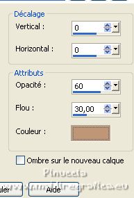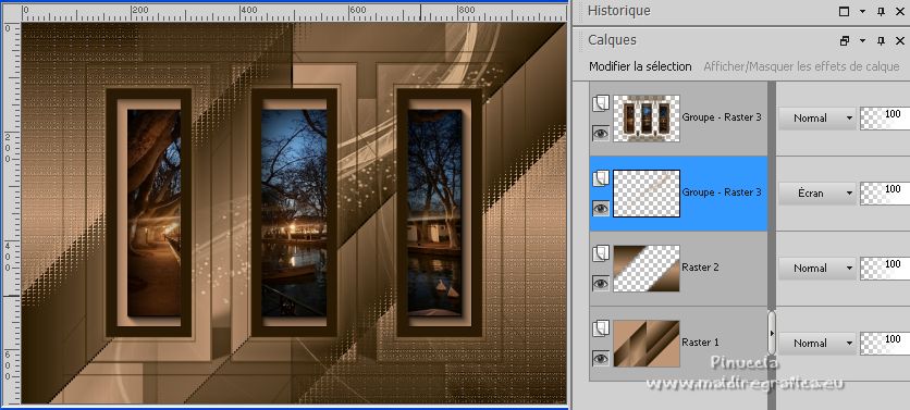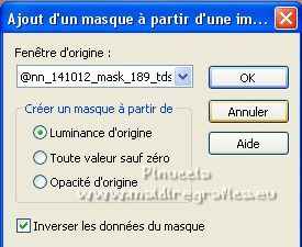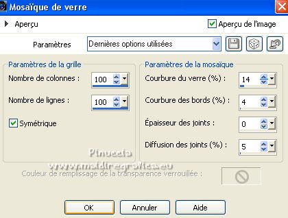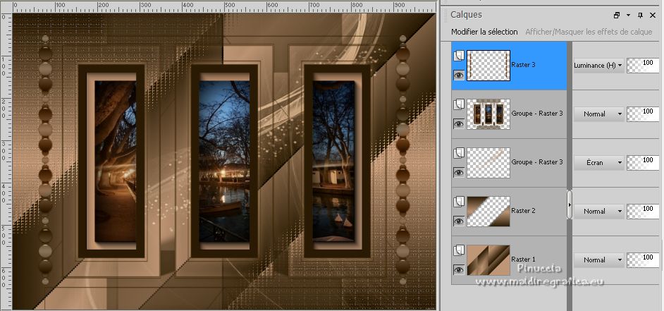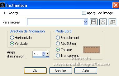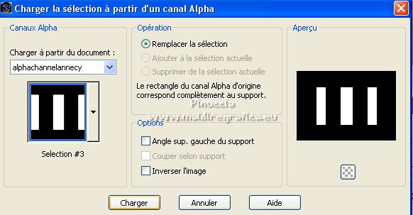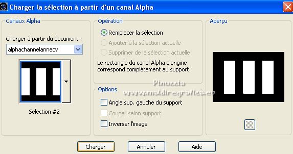 Pour traduire ce tutoriel j'ai utilisé PSPX7, PSPX2 et PSPX3, mais il peut également être exécuté avec les autres versions. Suivant la version utilisée, vous pouvez obtenir des résultats différents. Depuis la version X4, la fonction Image>Miroir a été remplacée par Image>Renverser horizontalement, et Image>Renverser avec Image>Renverser verticalement . Dans les versions X5 et X6, les fonctions ont été améliorées par la mise à disposition du menu Objets. Avec la nouvelle version X7, nous avons encore Image>Miroir et Image>Renverser/Retourner, mais avec nouvelles différences. Voir les détails à ce sujet ici Certaines dénominations ont changées entre les versions de PSP. Les plus frequentes dénominations utilisées: ![]() English translation here Vos versions ici![]() Nécessaire pour réaliser ce tutoriel: Matériel ici Merci pour le tube Suizabella et pour les masques @nn-tdstudio et Narah. Le reste du matériel est de Maria José. (ici les liens vers les sites des créateurs du matériel) Modules Externes: consulter, si nécessaire, ma section des filtres ici Filters Unlimited 2.0 ici Funhouse - Tremors ici Mehdi - Sorting Tiles ici Carolaine and Sensibiilty - CS-LDots ici Unplugged Tool - Renaissance ici AAA Frames - Foto Frame ici Filtres Funhouse et Unplugged peuvent être utilisés seuls ou importés dans Filters Unlimited. voir comment le faire ici). Si un filtre est fourni avec cette icône, ![]() en fonction des couleurs utilisées, vous pouvez changer le mode mélange et l'opacité des calques. Dans les plus récentes versions de PSP, vous ne trouvez pas le dégradé d'avant plan/arriére plan ou Corel_06_029. Vous pouvez utiliser le dégradé des versions antérieures. Ici le dossier Dégradés de CorelX. ![]() Ouvrir les masques dans PSP et les minimiser avec le reste du matériel. Placer en avant plan la couleur claire #c09776, et en arrière plan la couleur foncée #2b1c05. ![]() Préparer en avant plan un dégradé de premier plan/arrière plan, style Linéaire. ![]() 1. Ouvrir alphachannelannecy. Fenêtre>Dupliquer ou sur le clavier shift+D pour faire une copie. ![]() Fermer l'original. La copie, qui sera la base de votre travail, n'est pas vide, mais contient les sélections enregistrées sur le canal alpha. Remplir l'image transparente du dégradé.2. Effets>Modules Externes>Mehdi - Sorting Tiles. ![]() 3. Effets>Modules Externes>Funhouse - Tremors ![]() 4. Effets>Effets géométriques>Inclinaison - couleur d'avant plan #c09776. ![]() 5. Sélections>Charger/Enregistrer une sélection>Charger à partir d'un canal alpha. La sélection #1 est déjà disponible. On doit seulement cliquer sur Charger. ![]() 6. Calques>Nouveau calque raster. Remplir du dégradé.7. Effets>Modules Externes>Carolaine and Sensibility - CS-LDots. ![]() 8. Effets>Effets 3D>Ombre portée, couleur noire. ![]() Sélections>Inverser. Effets>Effets 3D>Ombre portée, comme précédemment. Sélections>Désélectionner tout. 9. Effets>Effets de textures>Mosaïque de verre. ![]() 10. Réglage>Netteté>Davantage de netteté. 11. Vous positionner sur le calque Raster 1. Effets>Modules Externes>Unplugged Tools - Renaissance. ou Effets>Modules Externes>VanDerLee - Unplugged-X - Renaissance. ![]() ![]() 12. Calques>Nouveau calque raster. Calques>Agencer>Placer en haut de la pile. Remplir avec la couleur foncée.13. Calques>Nouveau calque de masque>A partir d'une image. Ouvrir le menu deroulant sous la fenêtre d'origine et vous verrez la liste des images ouvertes. Sélectionner le masque m@nn_141012_mask_189.jpg. ![]() Calques>Fusionner>Fusionner le groupe. 14. Réglage>Netteté>Davantage de netteté. 15. Effets>Effets de réflexion>Miroir rotatif. ![]() 16. Sélections>Charger/Enregistrer une sélection>Charger à partir d'un canal alpha. Ouvrir le menu des sélections et charger la sélection #2. ![]() 17. Sélections>Modifier>Contracter - 20 pixels. Placer en avant plan la Couleur. Remplir avec la couleur claire d'avant plan.18. Effets>Modules Externes>AAA Frames - Foto Frame. ![]() Sélections>Désélectionner tout. 19. Sélections>Charger/Enregistrer une sélection>Charger à partir d'un canal alpha. Ouvrir le menu des sélections et charger la sélection #3. ![]() 20. Calques>Nouveau calque raster. Ouvrir le graphique et Édition>Copier. Revenir sur votre travail et Édition>Coller dans la sélection. 21. Calques>Nouveau calque raster. Effets>Effets 3D>Découpe. ![]() 22. Calques>Fusionner>Fusionner le calque de dessous - 2 fois. Sélections>Désélectionner tout. 23. Effets>Effets 3D>Ombre portée, couleur claire. ![]() 24. Réduire l'opacité de l'outil Pot de peinture à 80. Calques>Nouveau calque raster. Remplir le calque avec la couleur claire d'avant plan.ne pas oublier de placer à nouveau l'opacité à 100 25. Calques>Nouveau calque de masque>A partir d'une image. Ouvrir le menu deroulant sous la fenêtre d'origine et sélectionner le masque NarahsMasks_1683.jpg. ![]() Calques>Fusionner>Fusionner le groupe. 26 Réglage>Netteté>Davantage de Netteté. 27. Placer le calque en mode Écran. Calques>Agencer>Déplacer vers le bas. ![]() 28. Vous positionner sur le calque du haut de la pile. Ouvrir decoannecy_MJ et Édition>Copier. Revenir sur votre travail et Édition>Coller comme nouveau calque. Placer le calque en mode Luminance (héritée). La tag et les calques; adapter Mode mélange et opacité a votre goût. ![]() 29. Image>Ajouter des bordures, 1 pixel, symétrique, couleur foncée. 30. Sélections>Sélectionner tout. Édition>Copier Image>Ajouter des bordures, 50 pixels, symétrique, couleur blanche. 31. Sélections>Inverser. Édition>Coller dans la sélection (l'image copiée à l'étape 30). 32. Réglage>Flou>Flou gaussien - rayon 30. ![]() 33. Effets>Effets 3D>Ombre portée, couleur noire. ![]() Garder sélectionné. 34. Calques>Nouveau calque raster. Ouvrir frame1 et Édition>Copier. Revenir sur votre travail et Édition>Coller dans la sélection. Placer le calque en mode